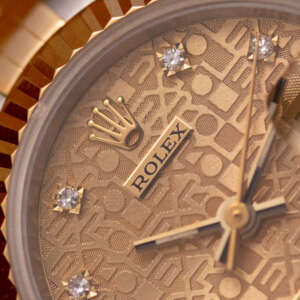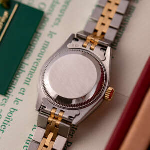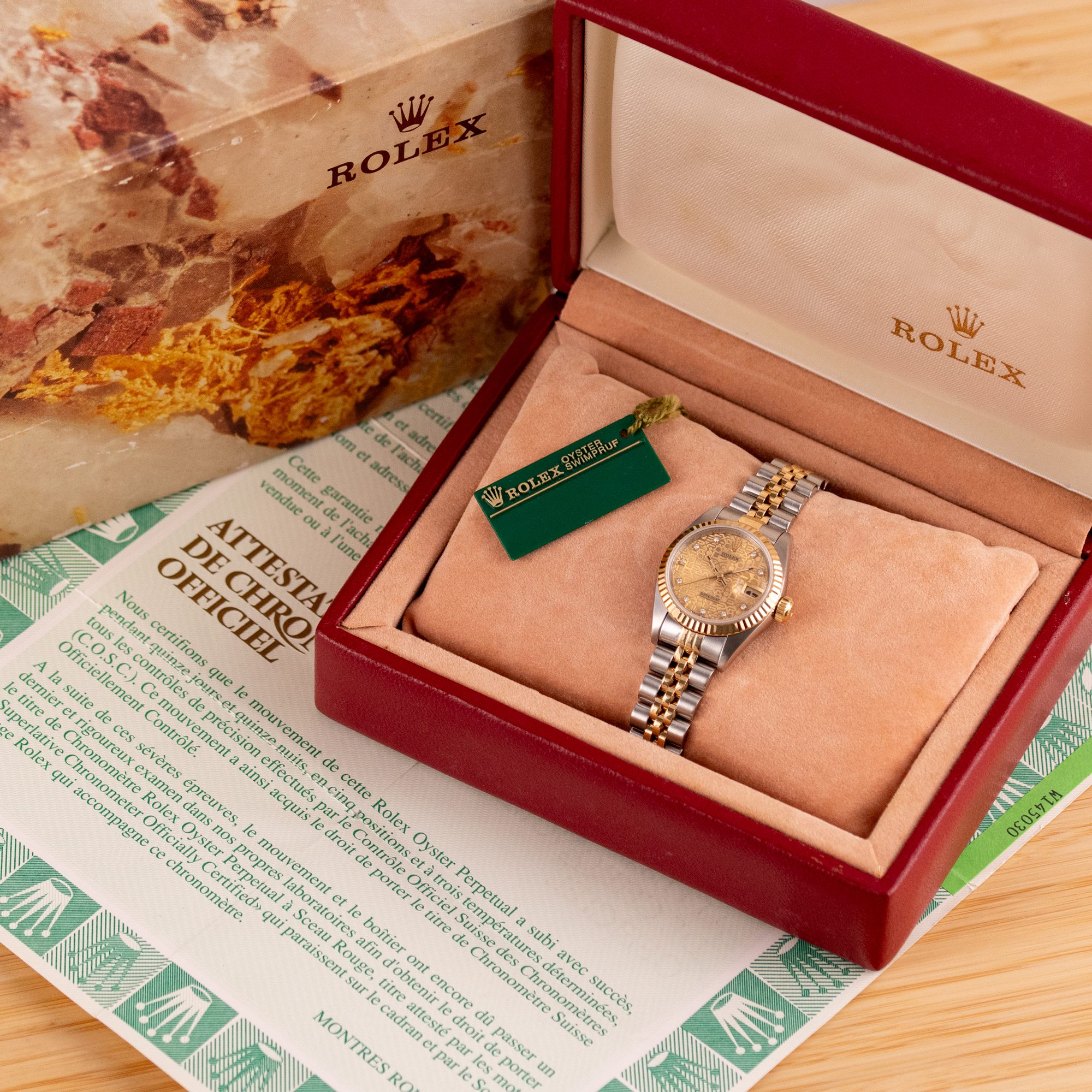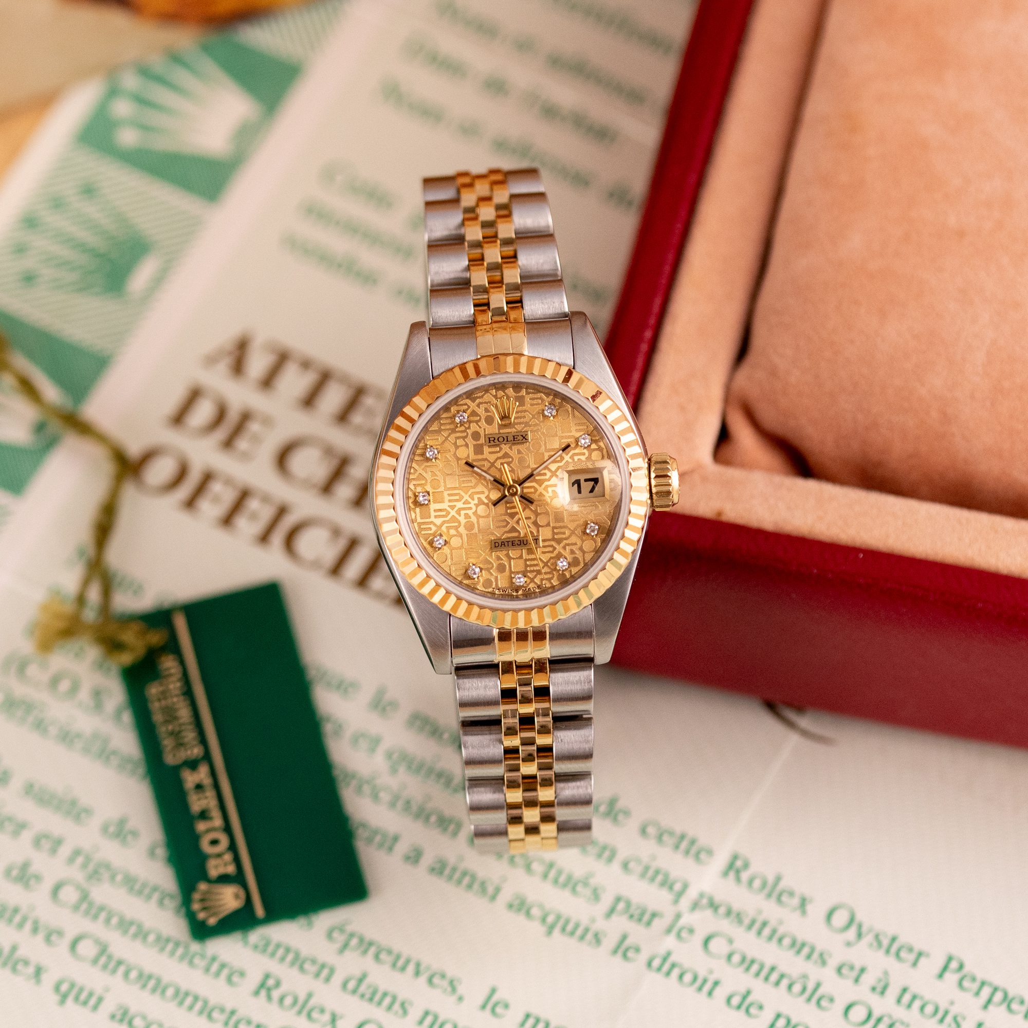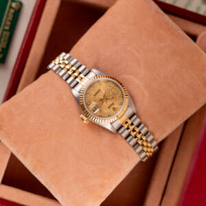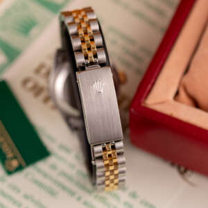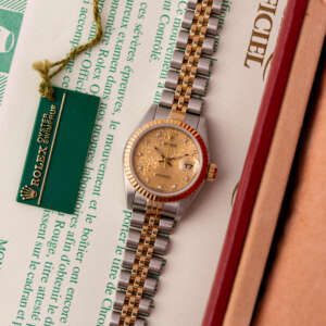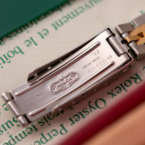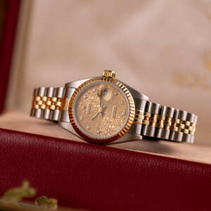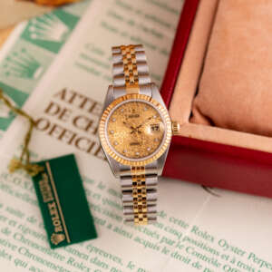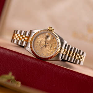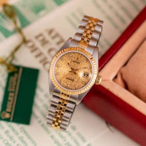 This particular piece, originally sold in 1995, features a stunning champagne Jubilee Diamond dial that enhances its sophisticated allure with a touch of sparkle. The watch is in very good condition, with a mechanically fully functional movement and a stretch-free bracelet sized for wrists up to 16 cm. Presented as a full set with the original Rolex box and papers, this Datejust is an ideal choice for collectors or those seeking a refined vintage timepiece for daily wear.
