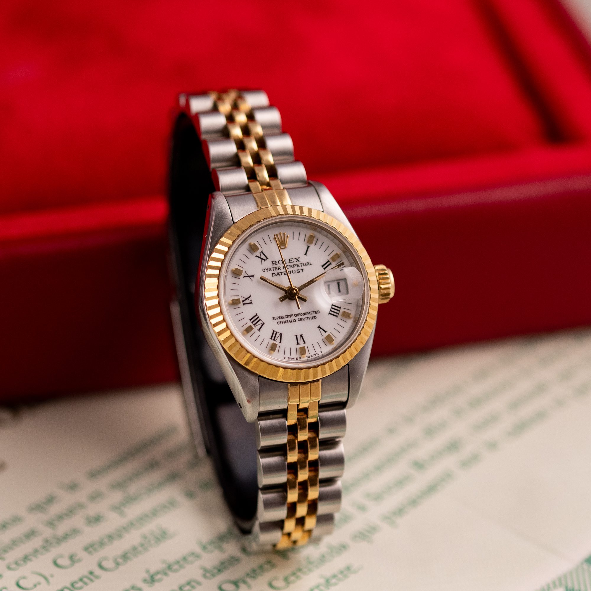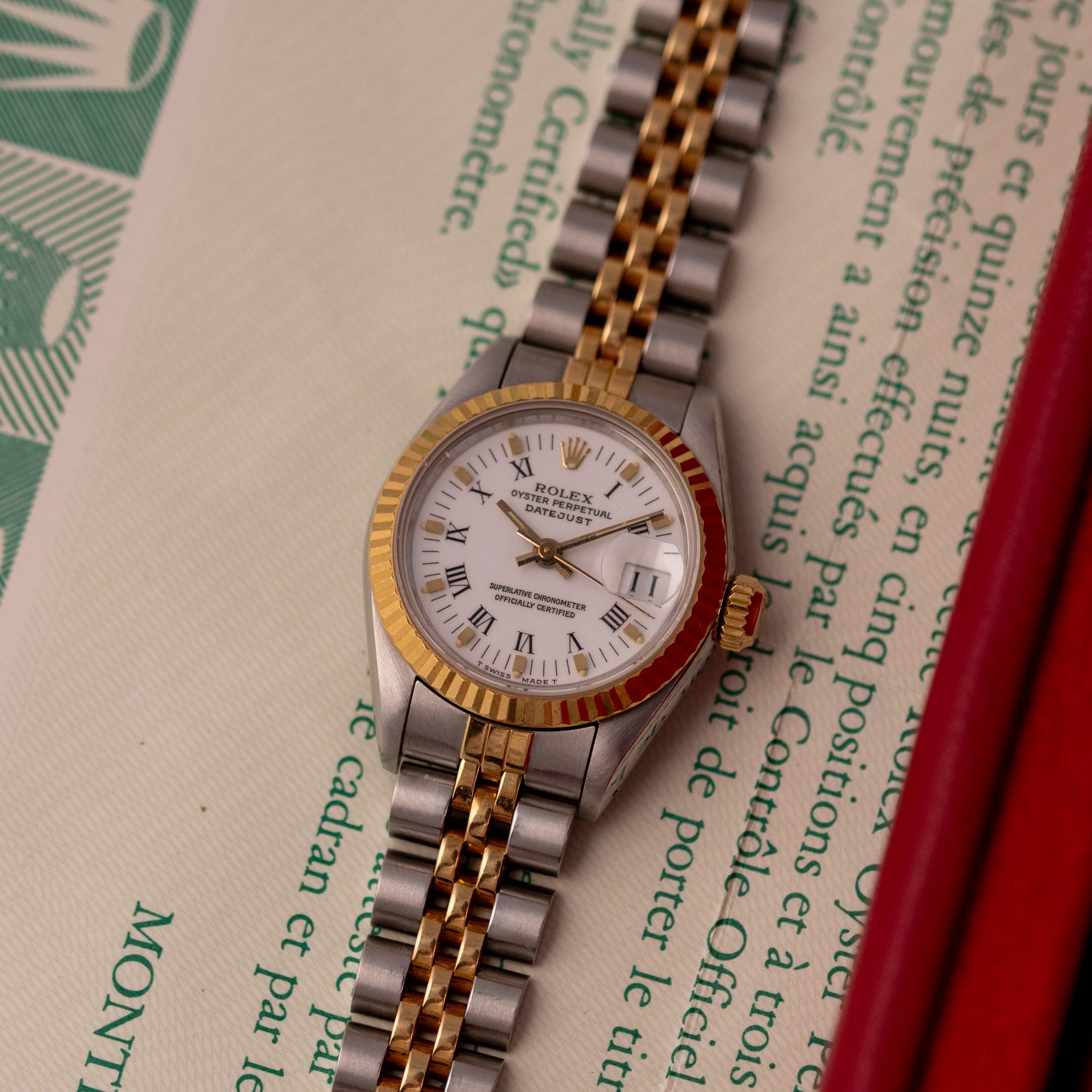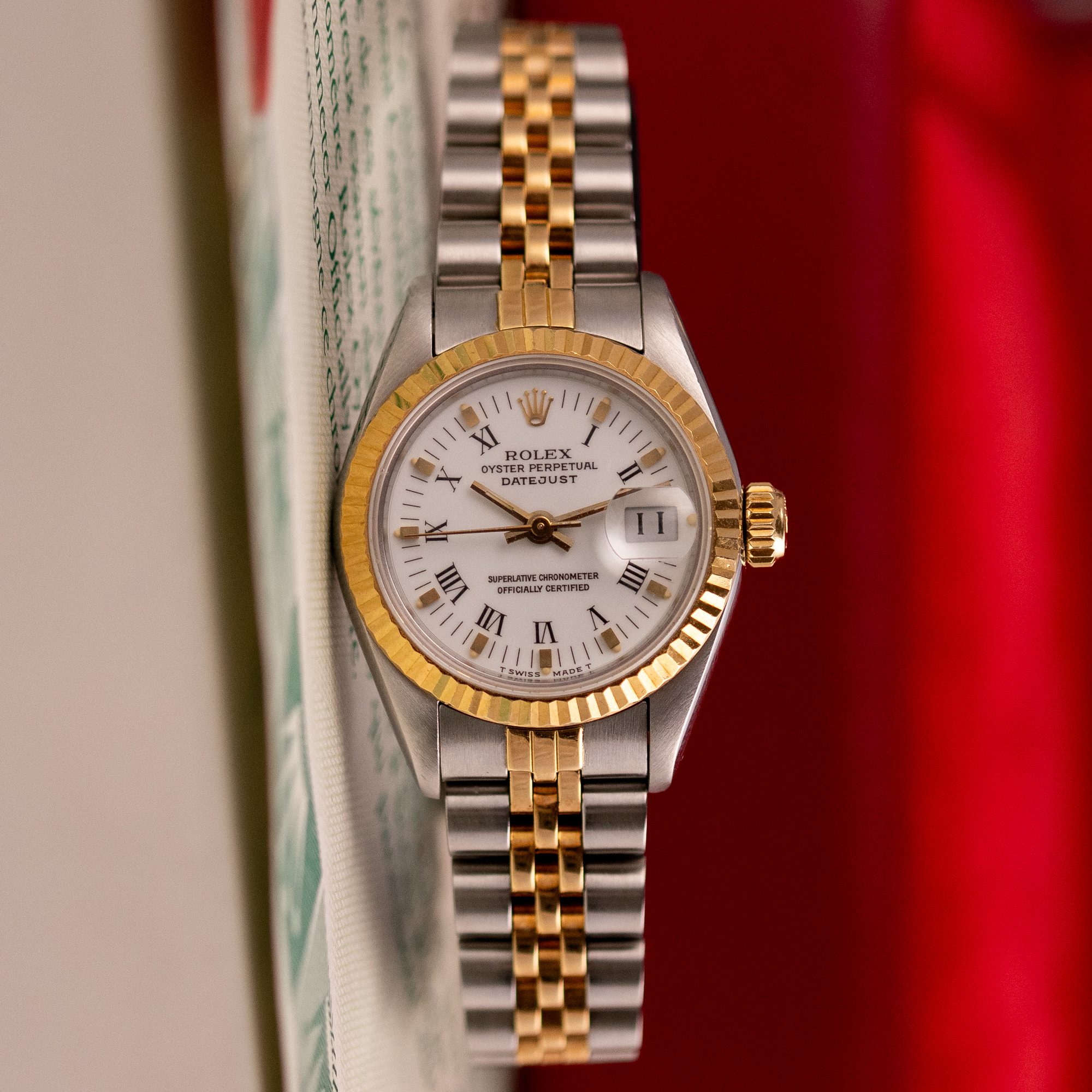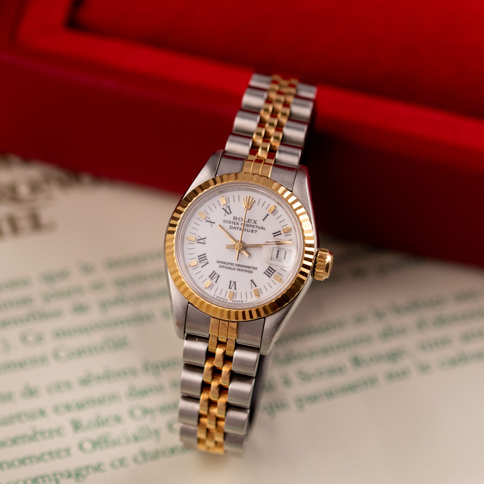 The Rolex Datejust 26, ref. 69173, crafted in stainless steel and yellow gold, features a 26mm case with a fluted bezel, offering a classic two-tone design that combines timeless sophistication with compact versatility, ideal for both formal occasions and everyday wear.
