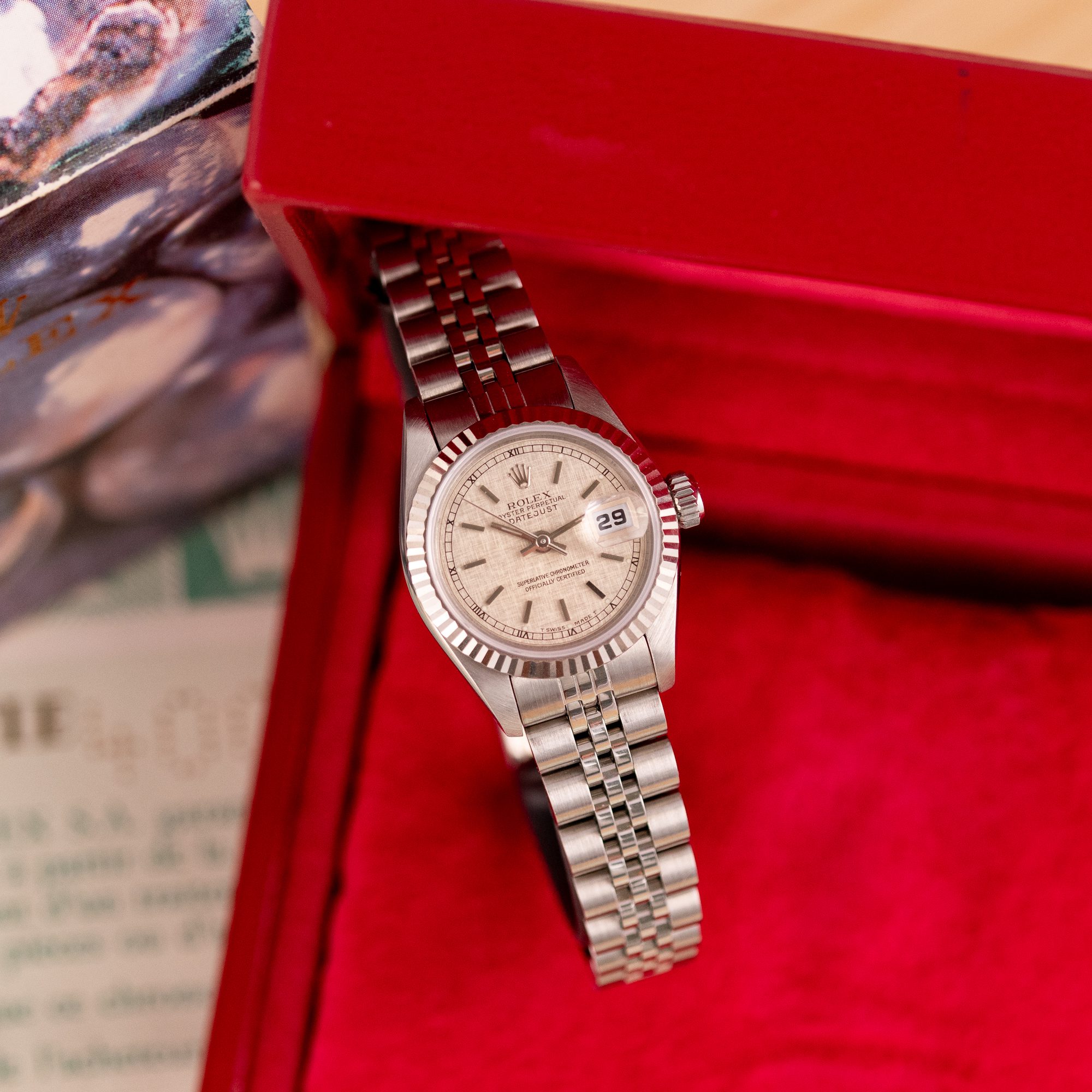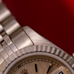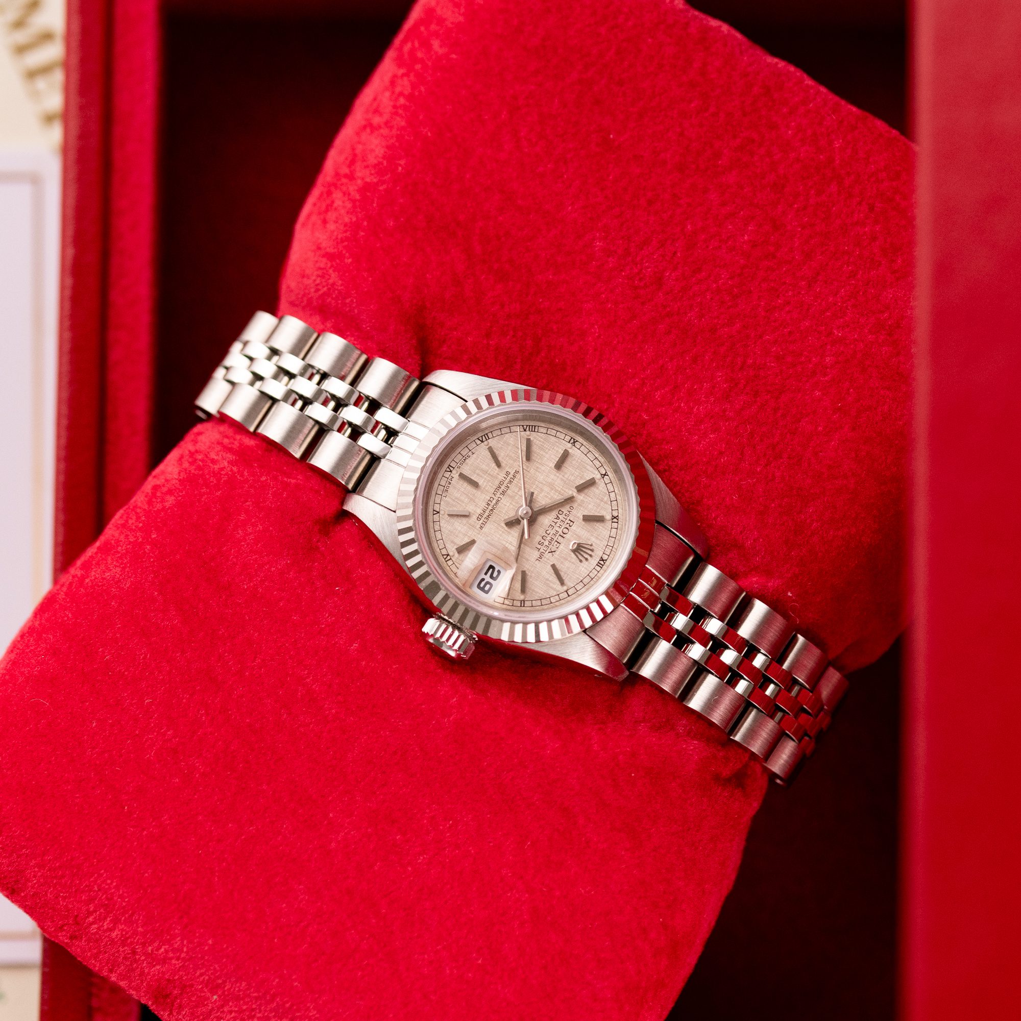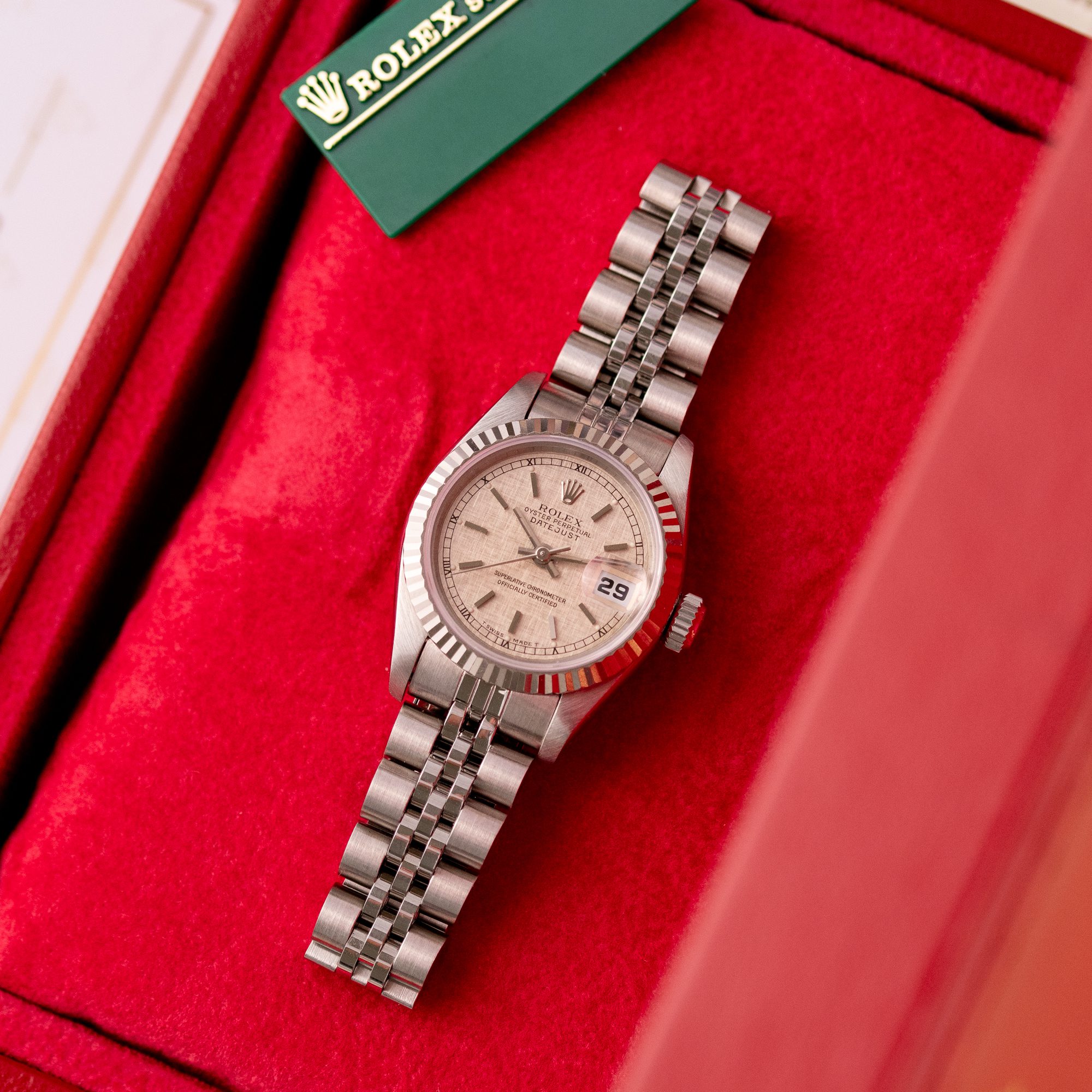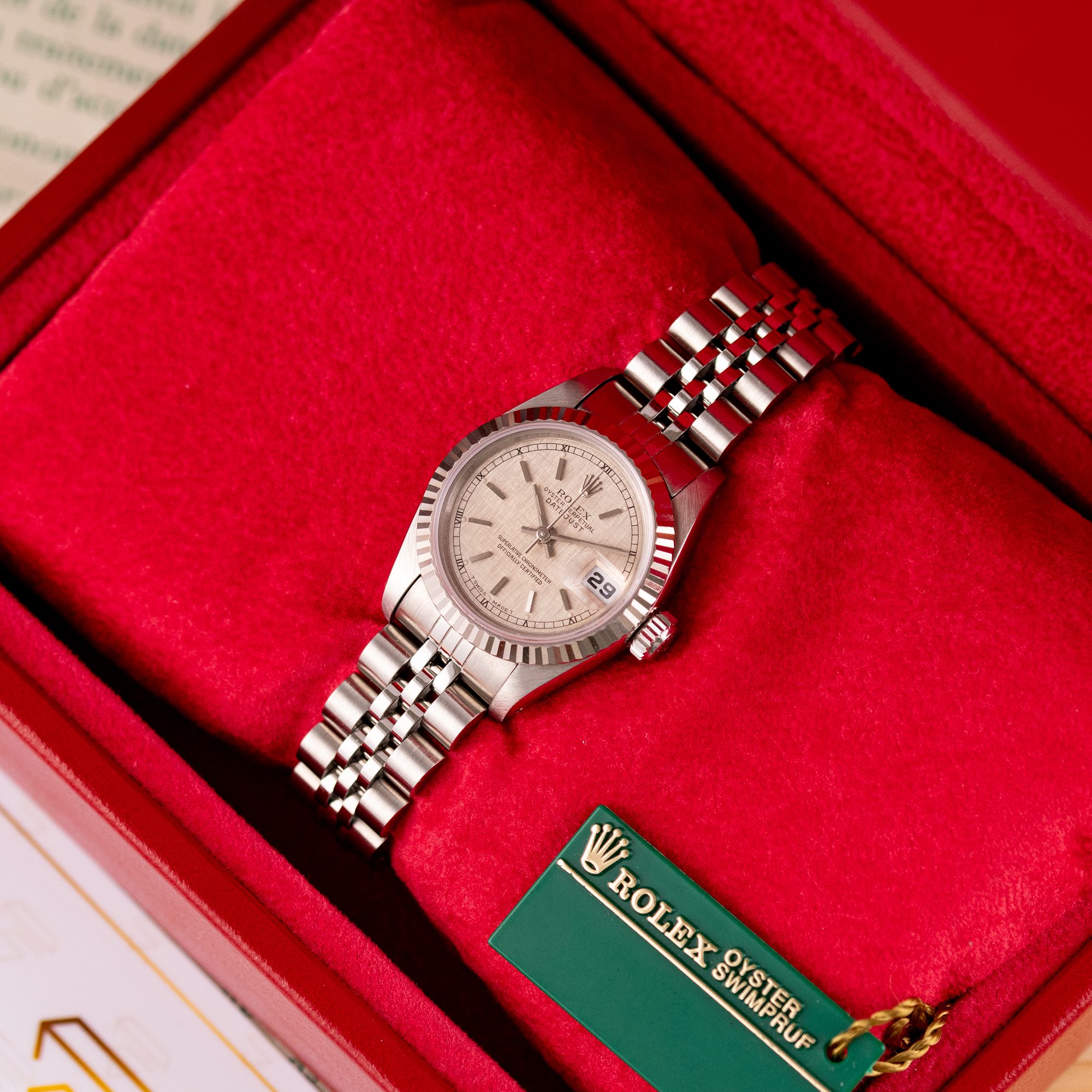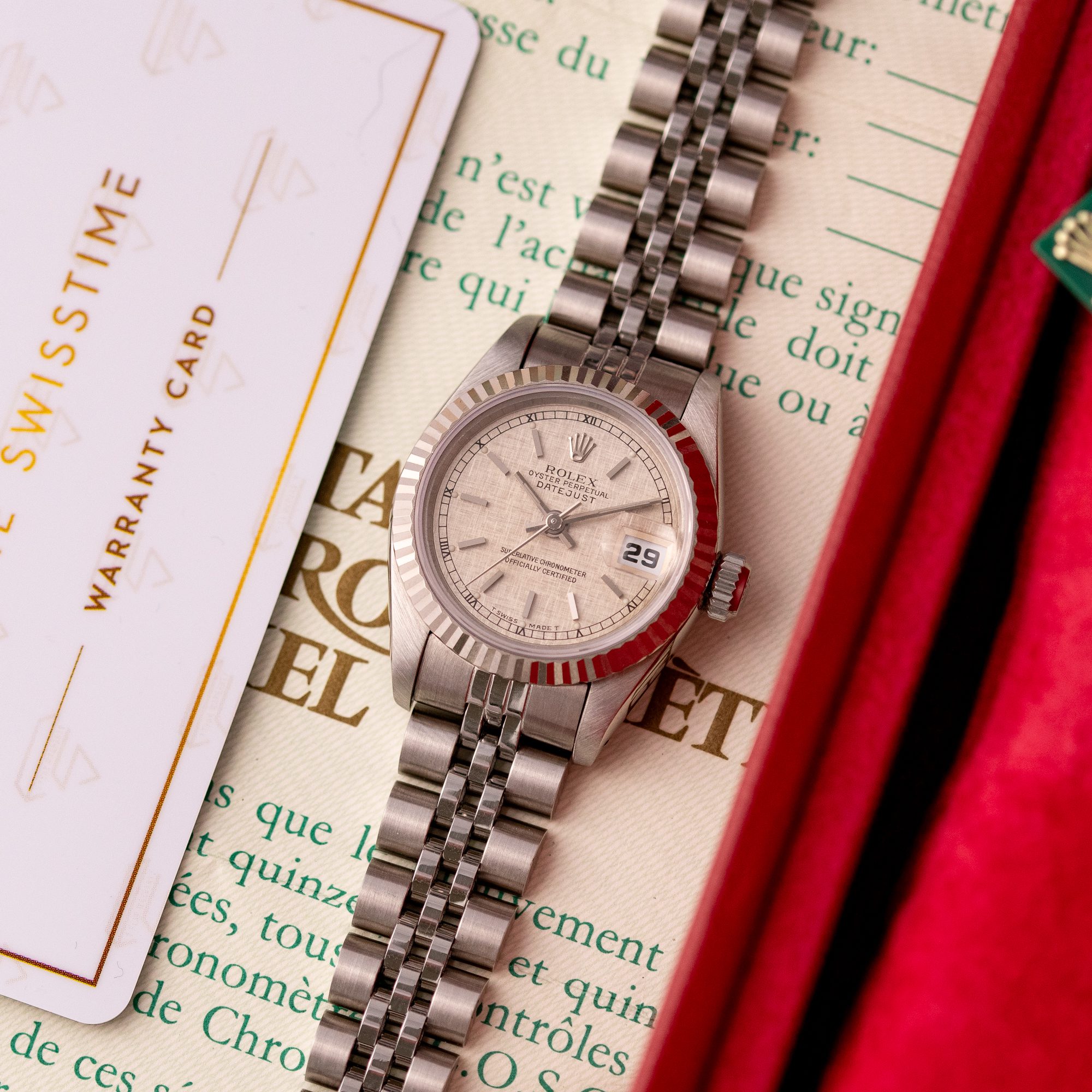 This particular piece, originally sold in 1995, features a beautiful Silver Linen dial that adds texture and unique charm to the design. The watch is in excellent condition, with a bracelet showing no stretch, and has been freshly serviced. It comes as a full set with the original box and papers, making it an outstanding choice for collectors or as a refined daily companion.