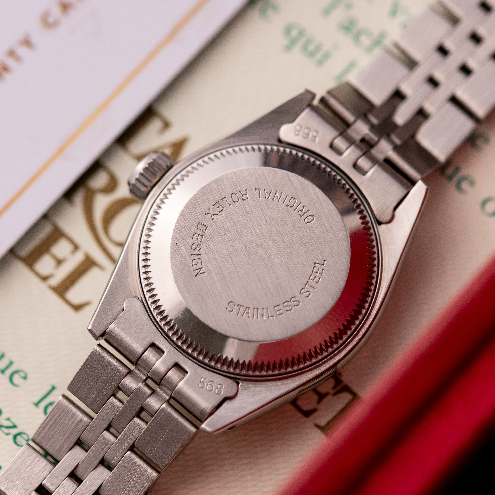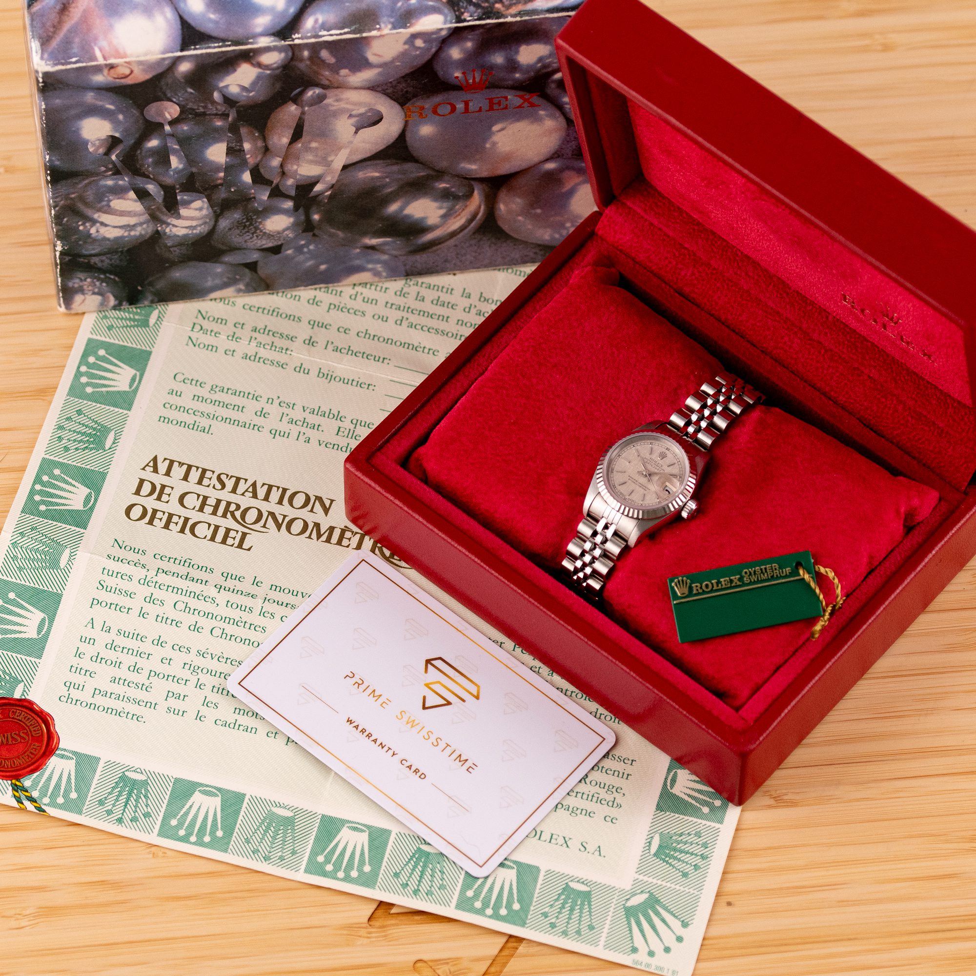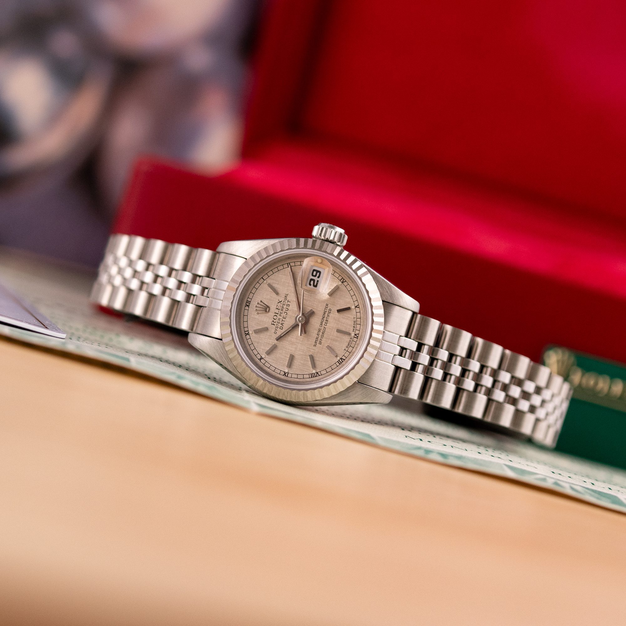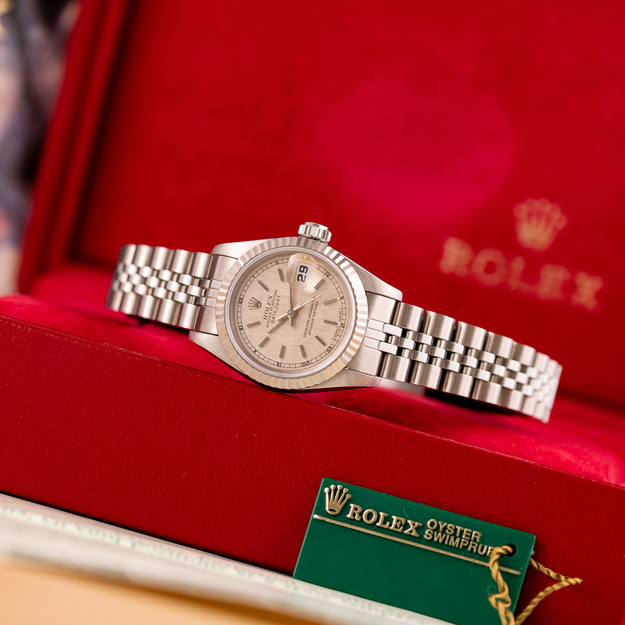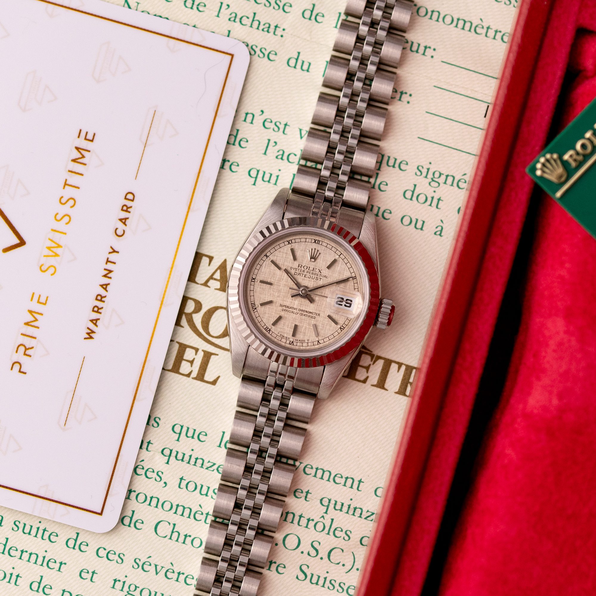 This particular piece, originally sold in 1995, features a beautiful Silver Linen dial that adds texture and unique charm to the design. The watch is in excellent condition, with a bracelet showing no stretch, and has been freshly serviced. It comes as a full set with the original box and papers, making it an outstanding choice for collectors or as a refined daily companion.