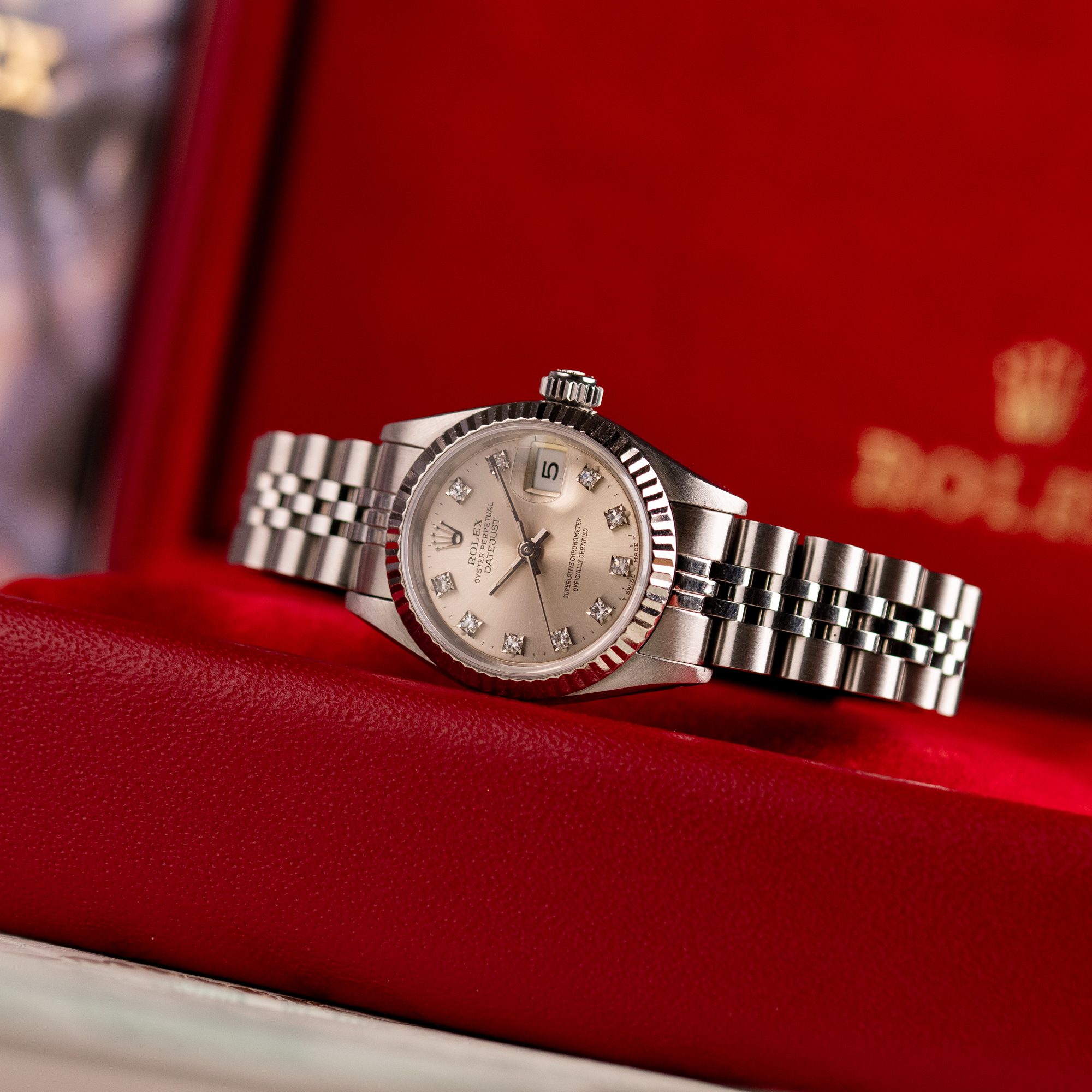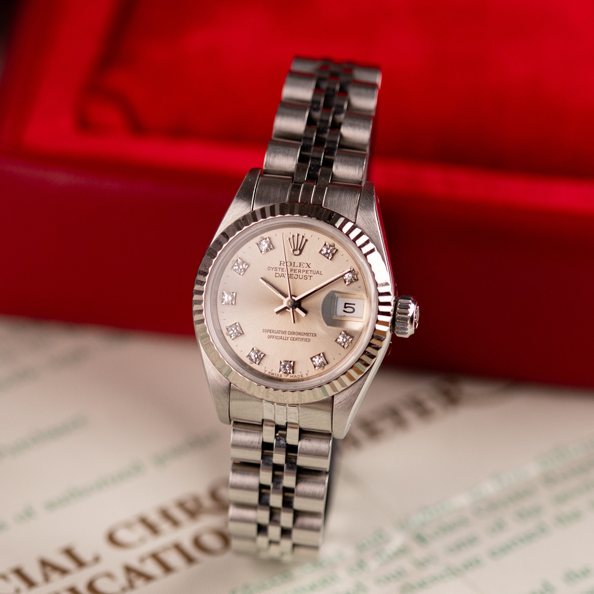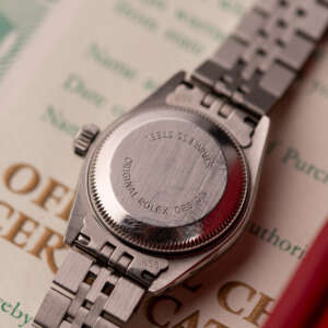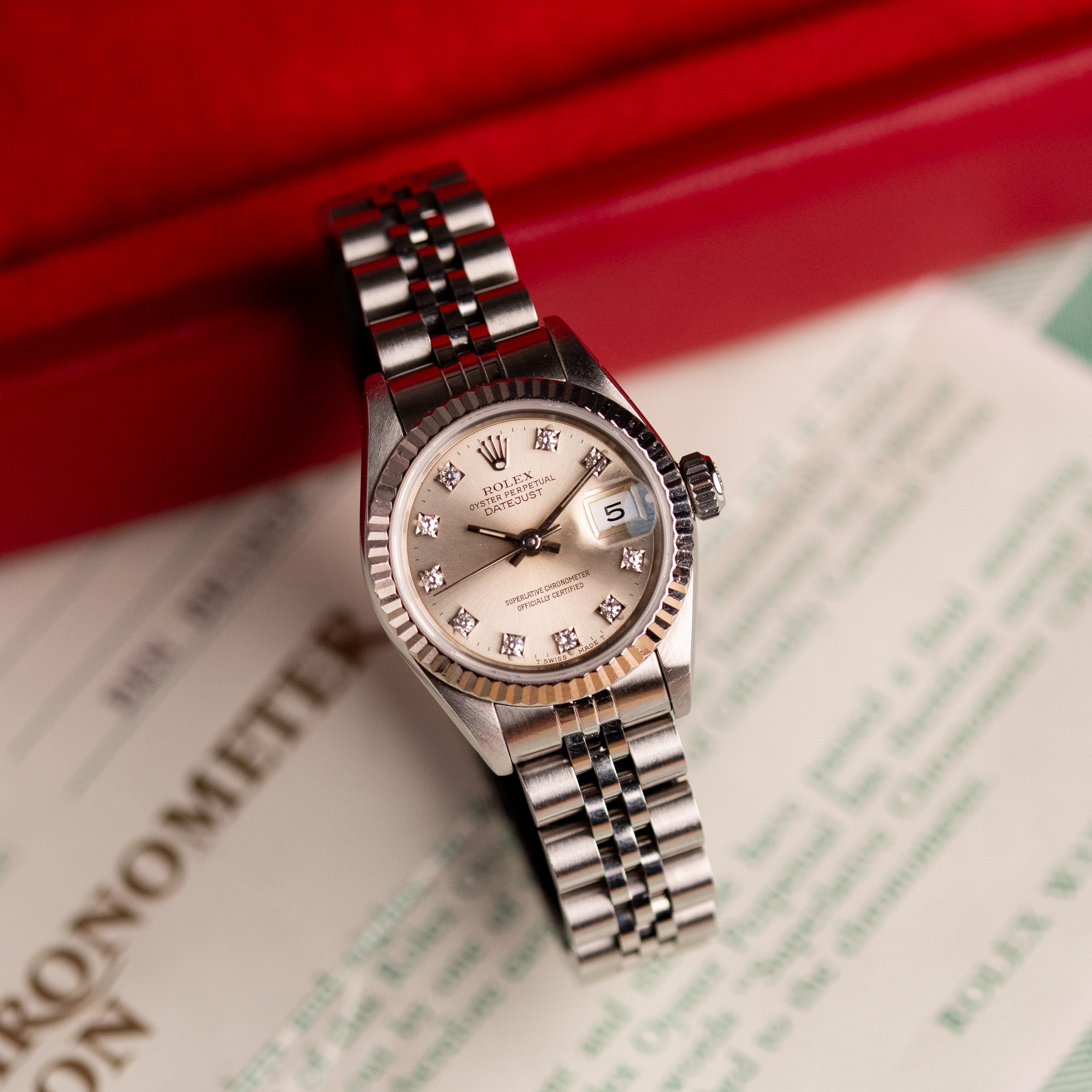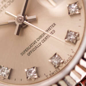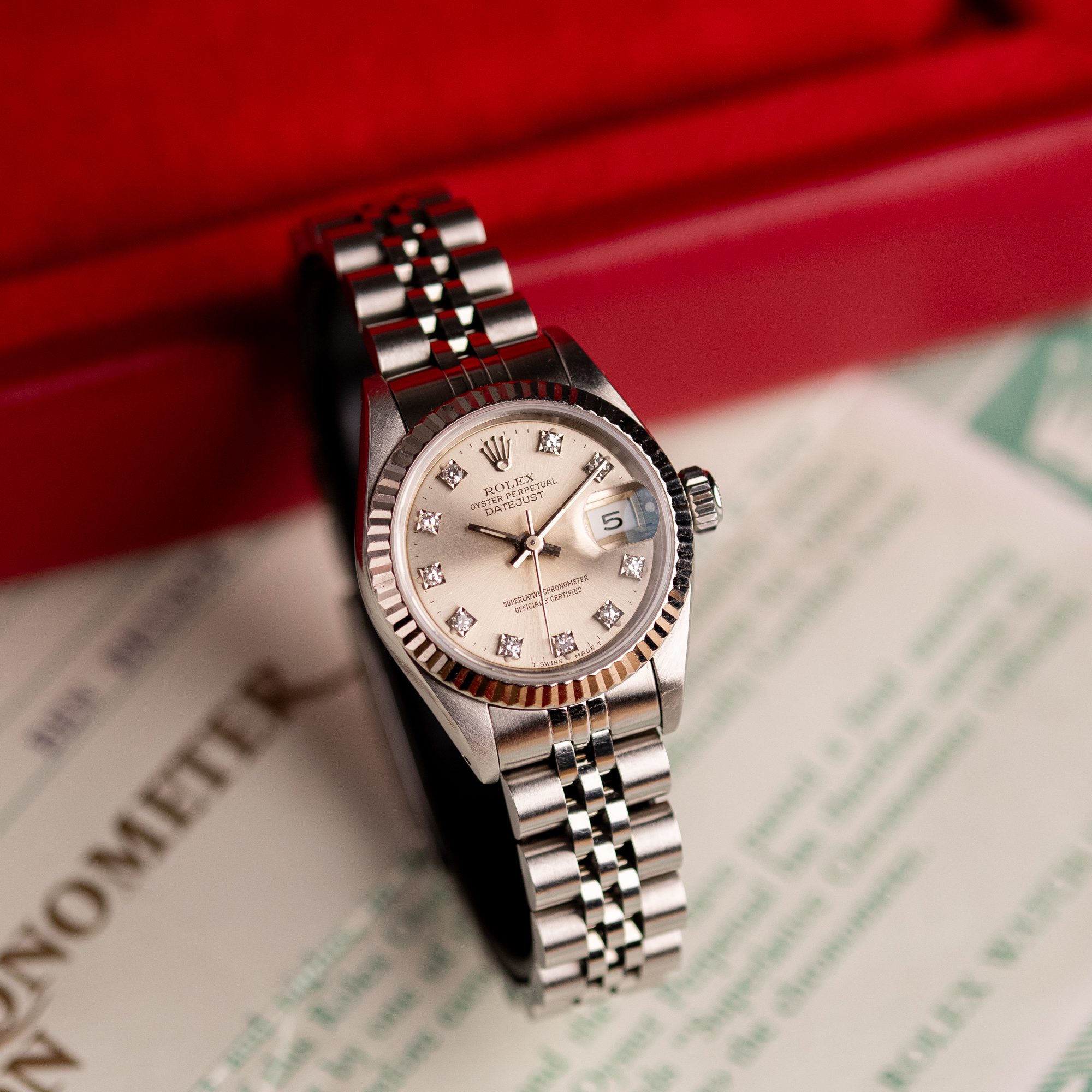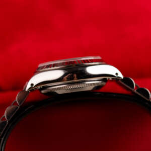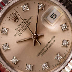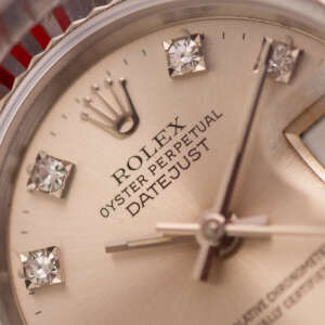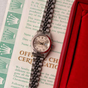 Originally sold in 1994, this example showcases a striking Silver Diamond dial, with sparkling diamond hour markers adding a touch of luxurious distinction. The watch is in very good condition, with a fully functional automatic movement ensuring precise timekeeping. The Jubilee bracelet, sized for wrists up to 16 cm, exhibits minimal stretch, maintaining its structural integrity. Presented as a full set with its original Rolex box and papers, this Datejust is an excellent choice for collectors or those seeking a well-preserved vintage timepiece.