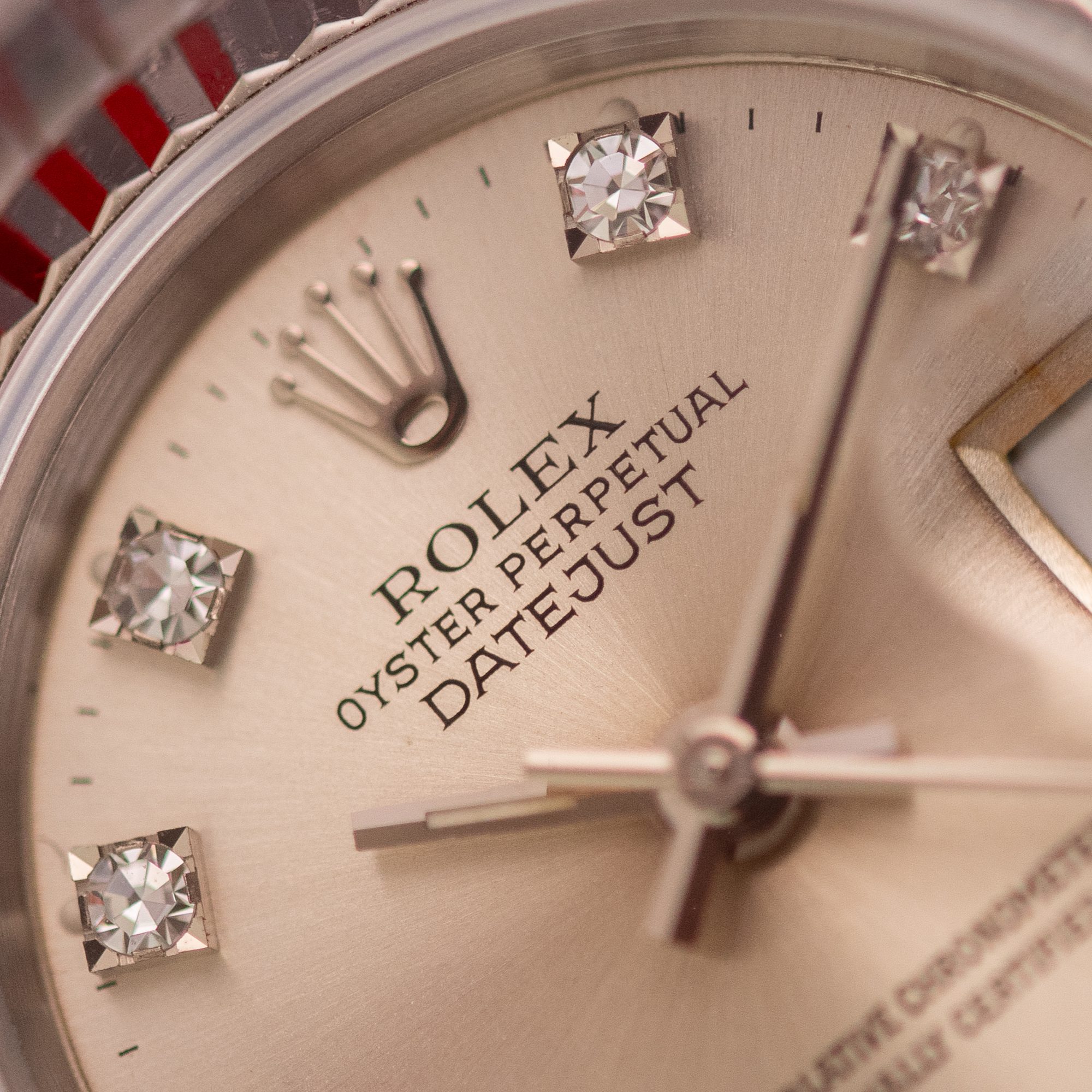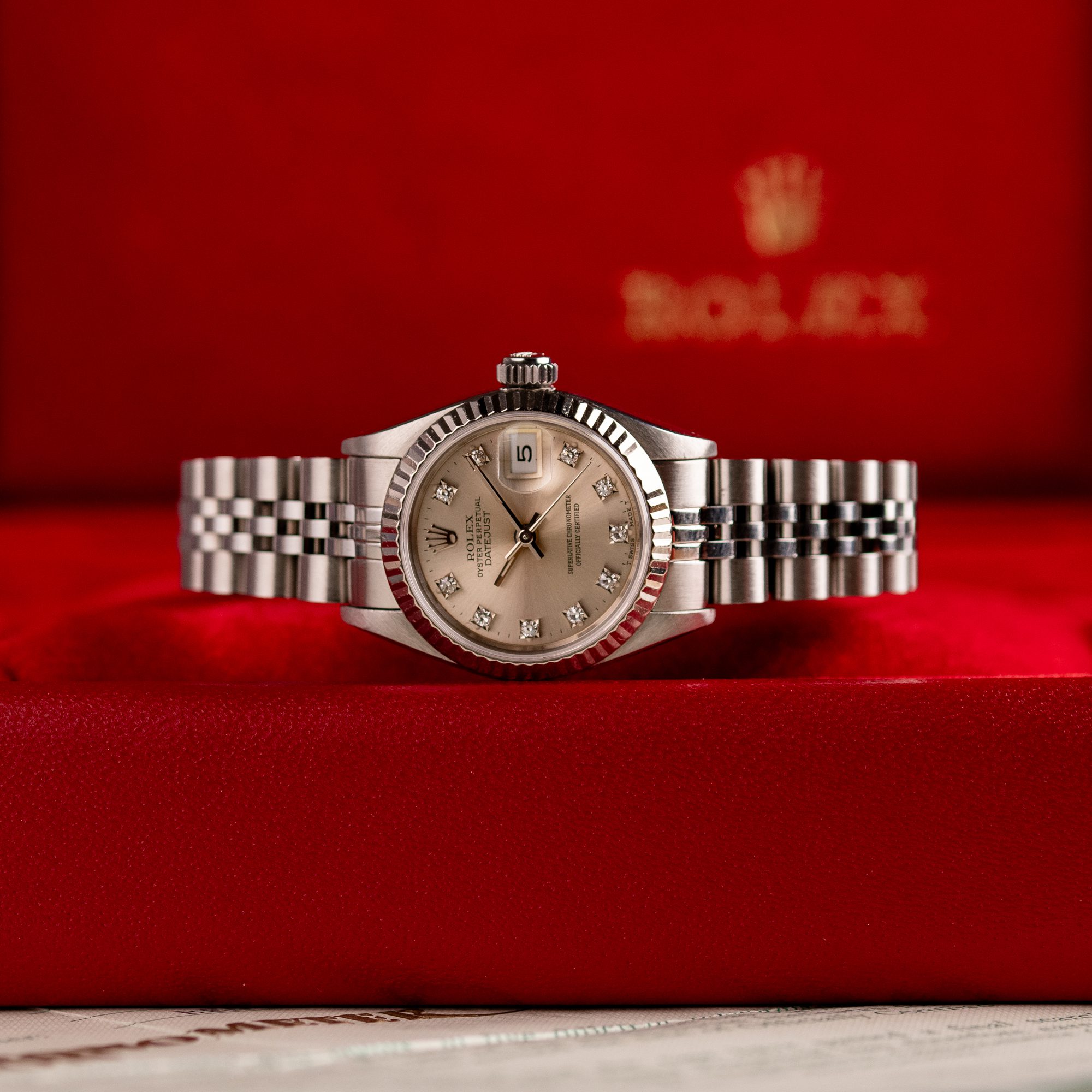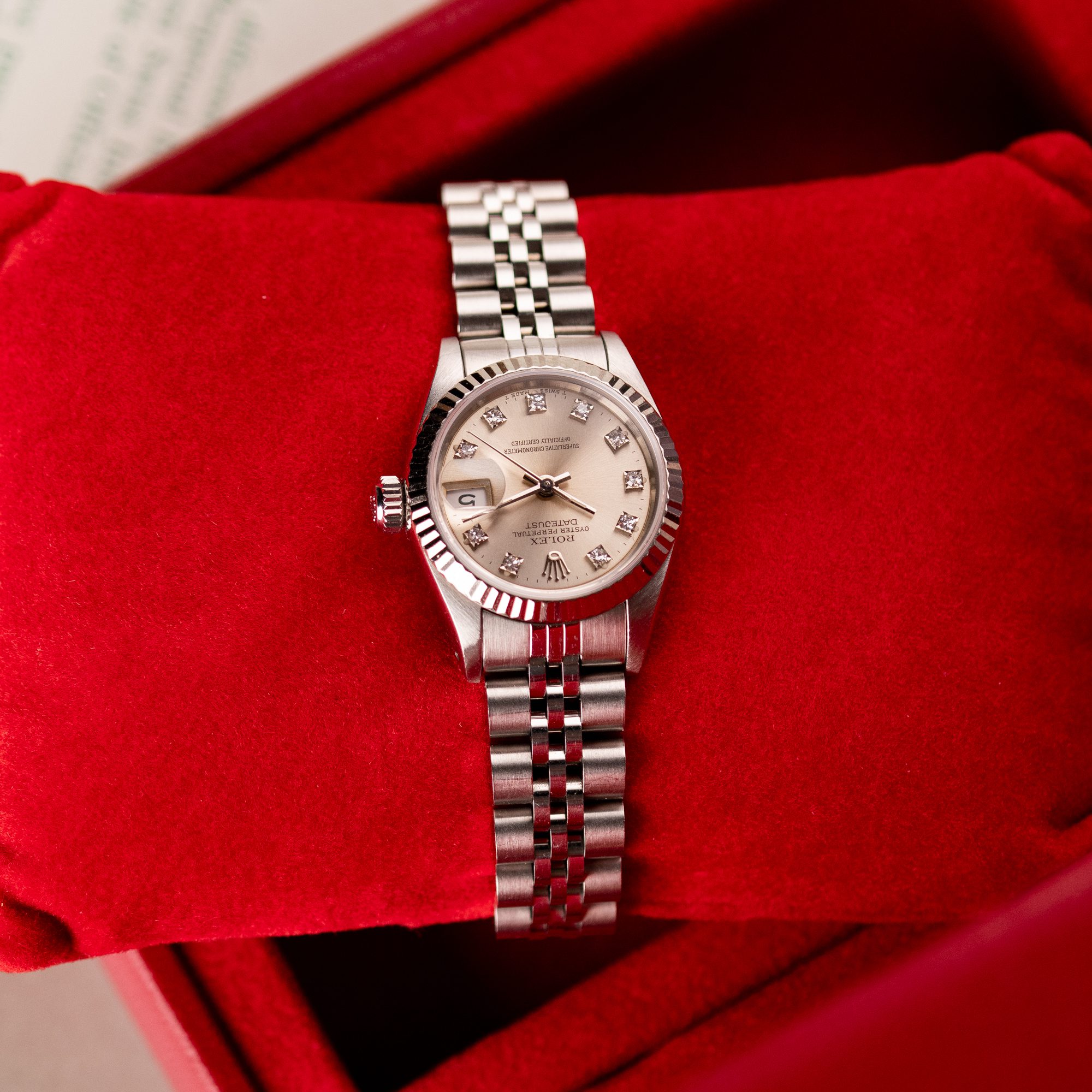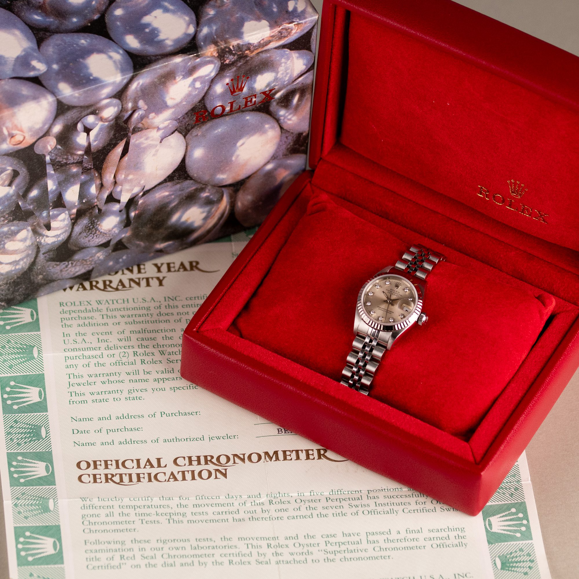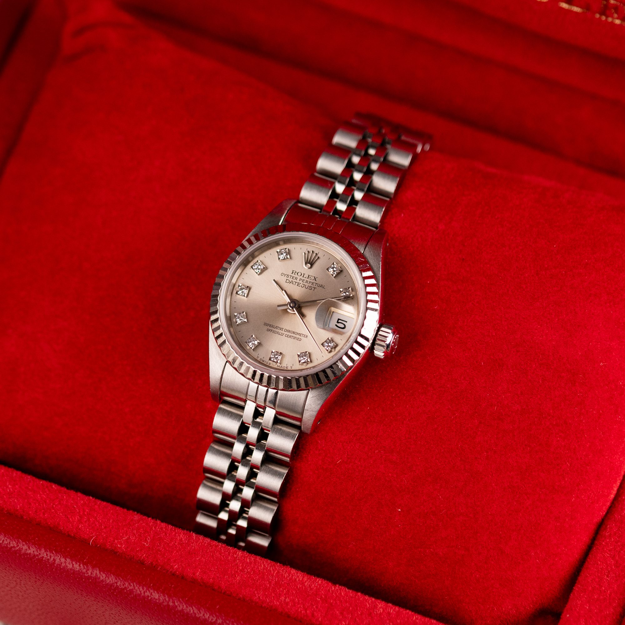 Originally sold in 1994, this example showcases a striking Silver Diamond dial, with sparkling diamond hour markers adding a touch of luxurious distinction. The watch is in very good condition, with a fully functional automatic movement ensuring precise timekeeping. The Jubilee bracelet, sized for wrists up to 16 cm, exhibits minimal stretch, maintaining its structural integrity. Presented as a full set with its original Rolex box and papers, this Datejust is an excellent choice for collectors or those seeking a well-preserved vintage timepiece.
