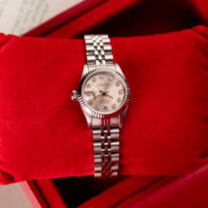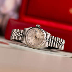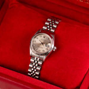 The Rolex Datejust 26, ref. 69174G, crafted in stainless steel with a white gold fluted bezel, features a 26mm case, offering a refined and compact design that combines timeless elegance with versatile wearability, ideal for both formal settings and everyday sophistication.