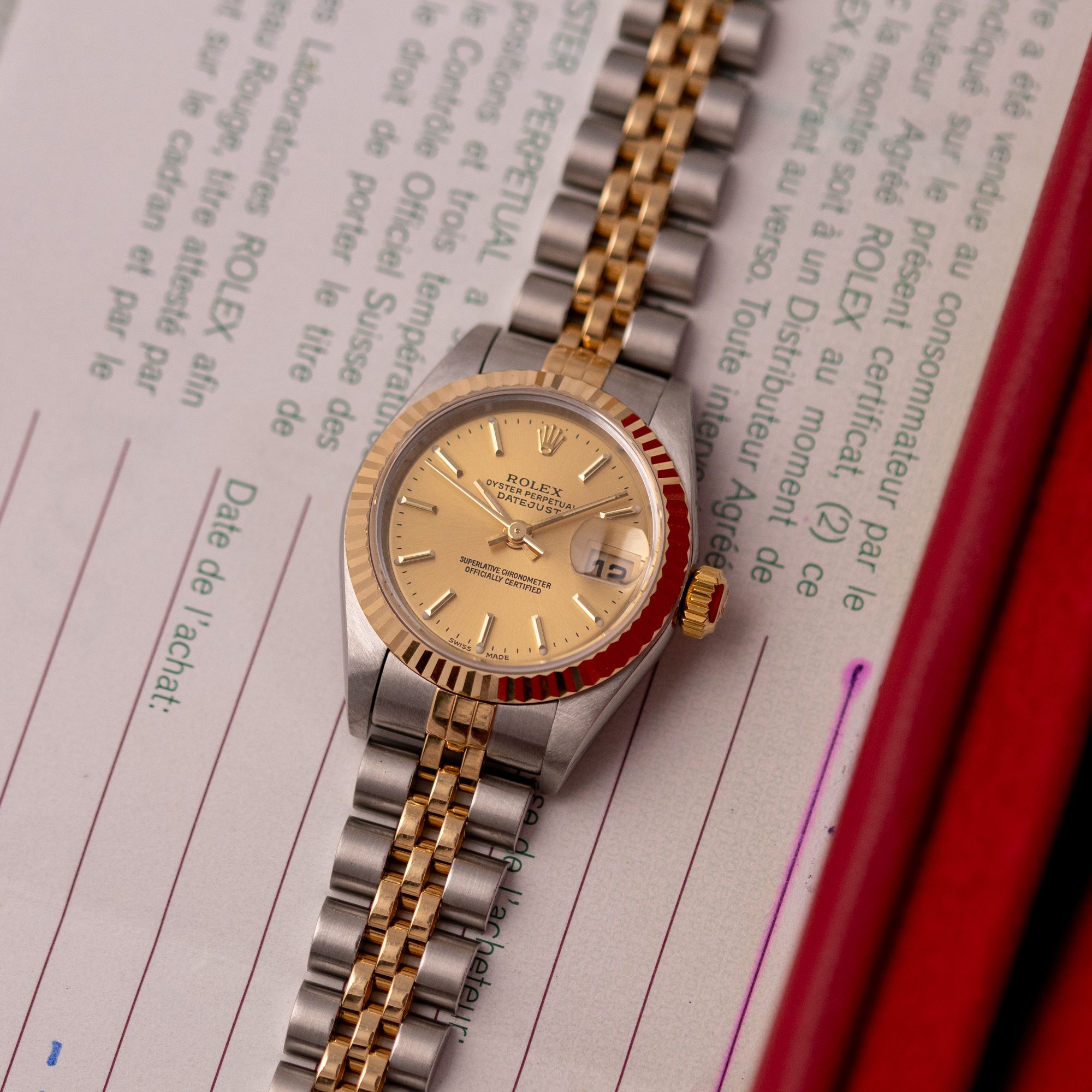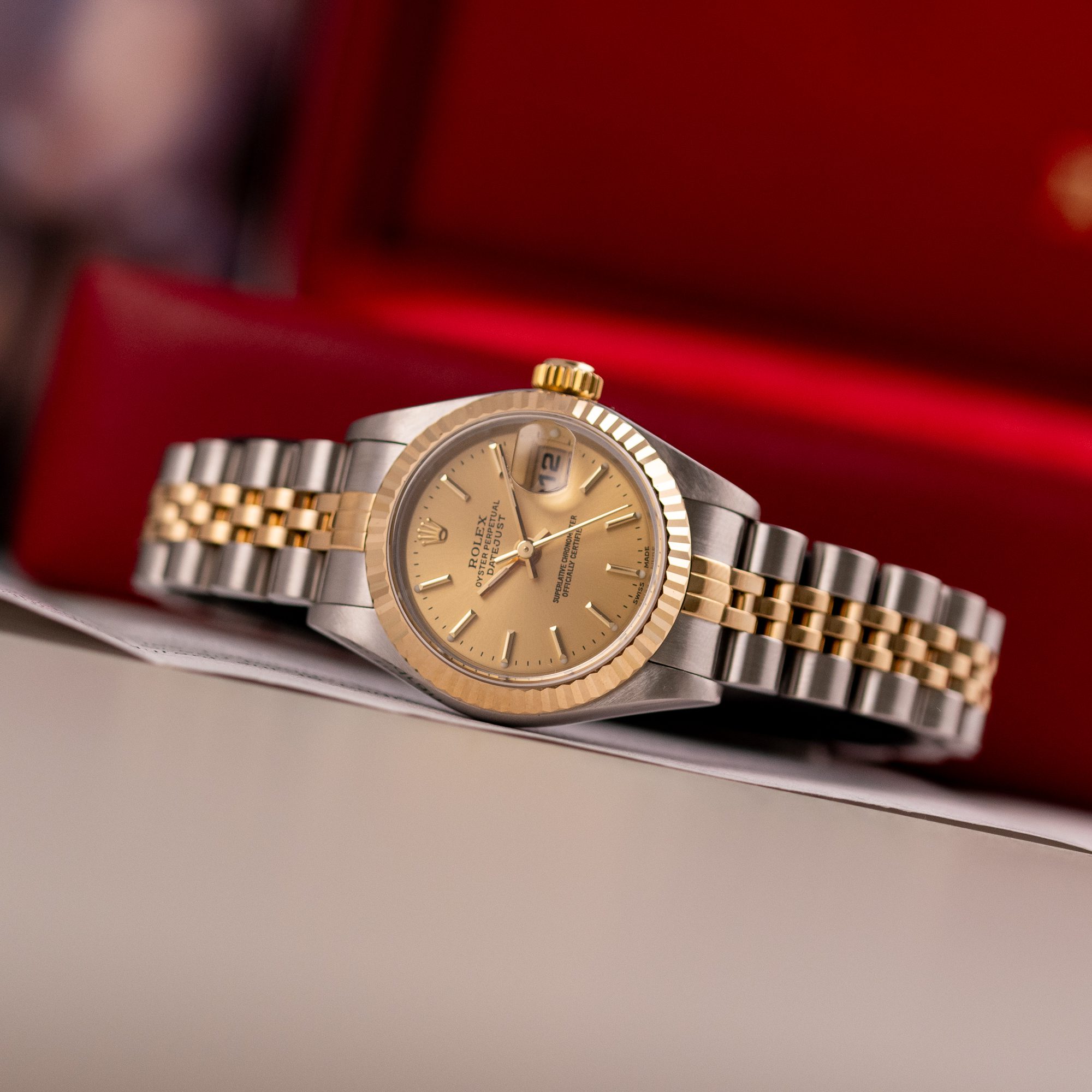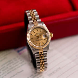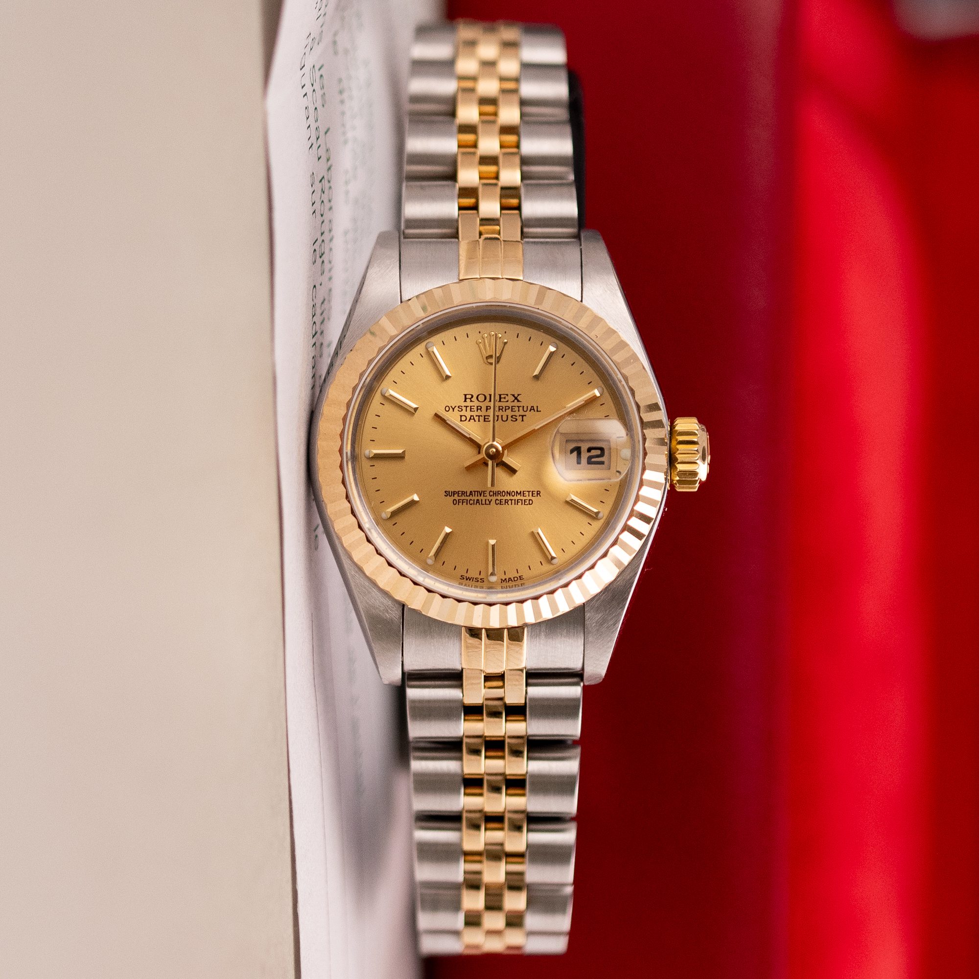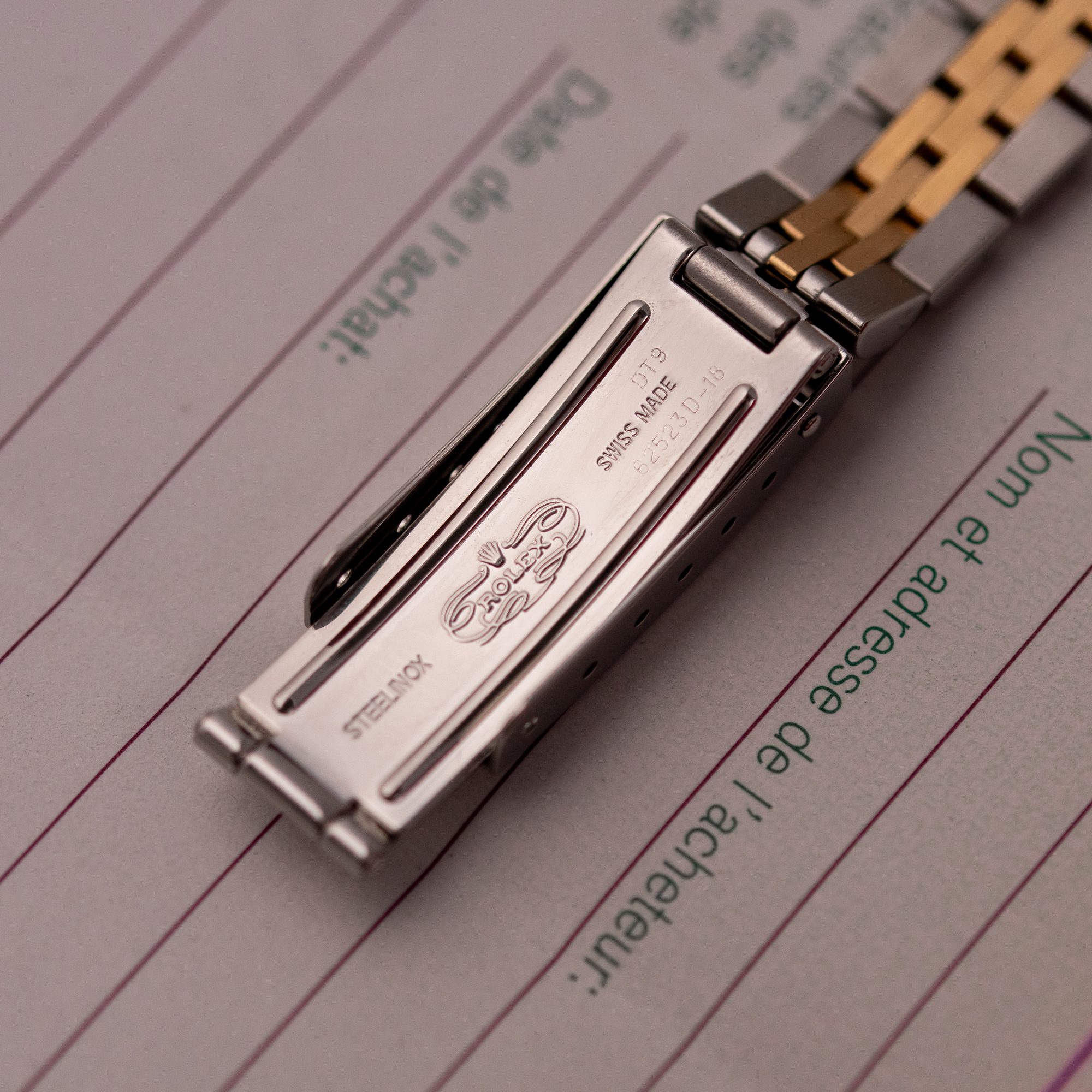 The Rolex Datejust 26, ref. 79173, crafted in stainless steel and yellow gold, features a 26mm case with a fluted bezel, delivering a classic two-tone design that balances refined elegance with compact versatility, suitable for both formal settings and daily wear.