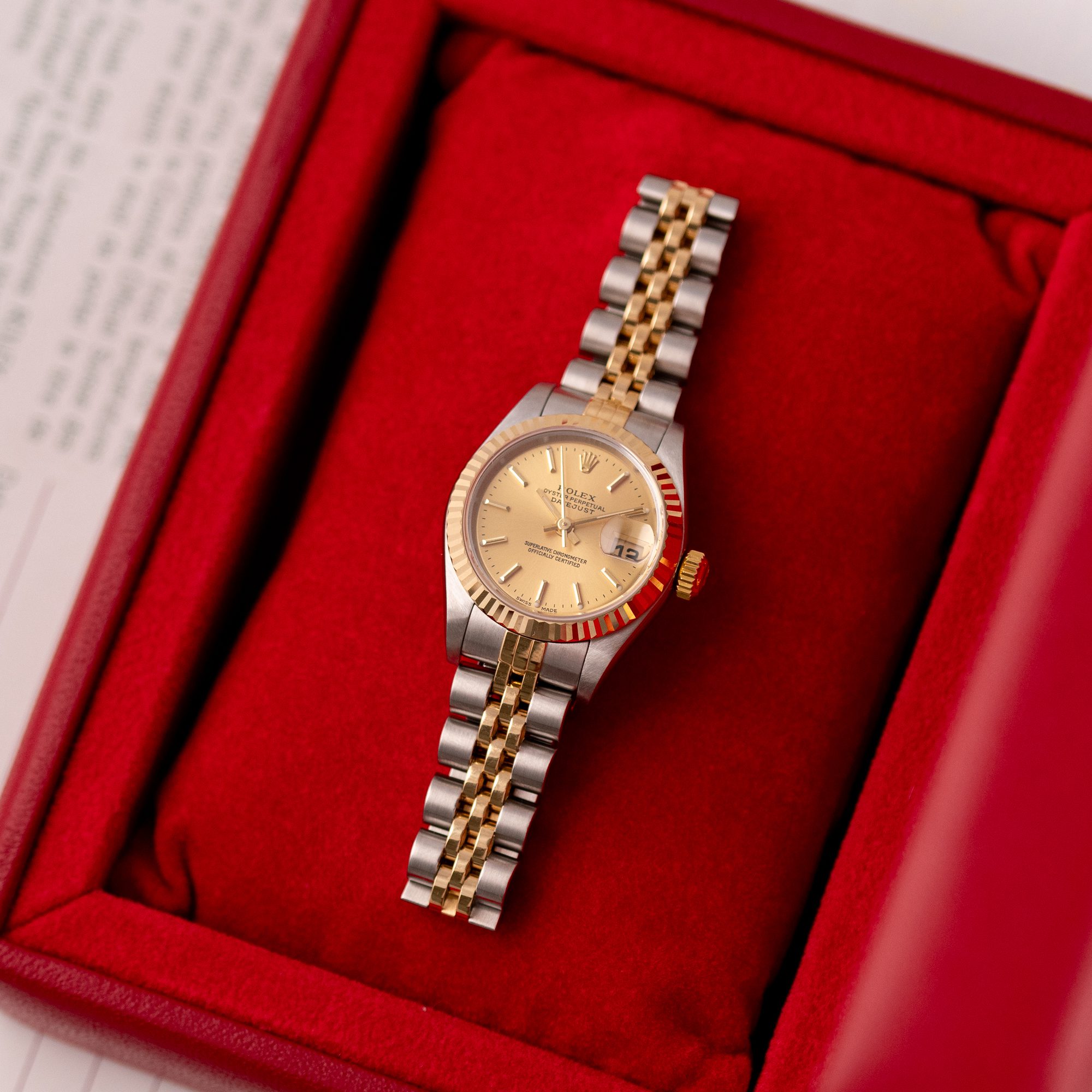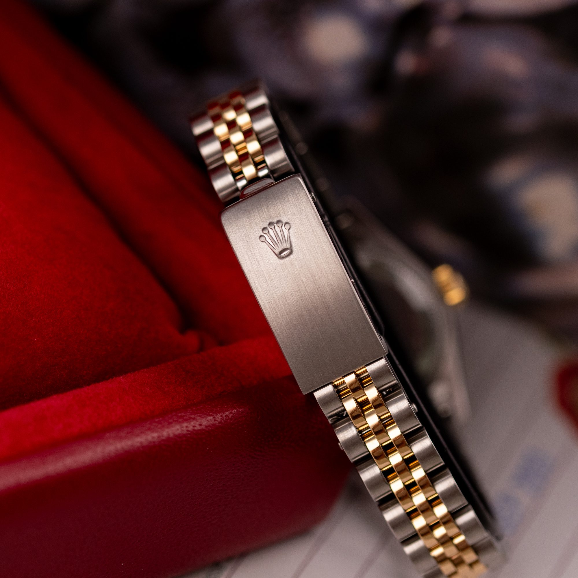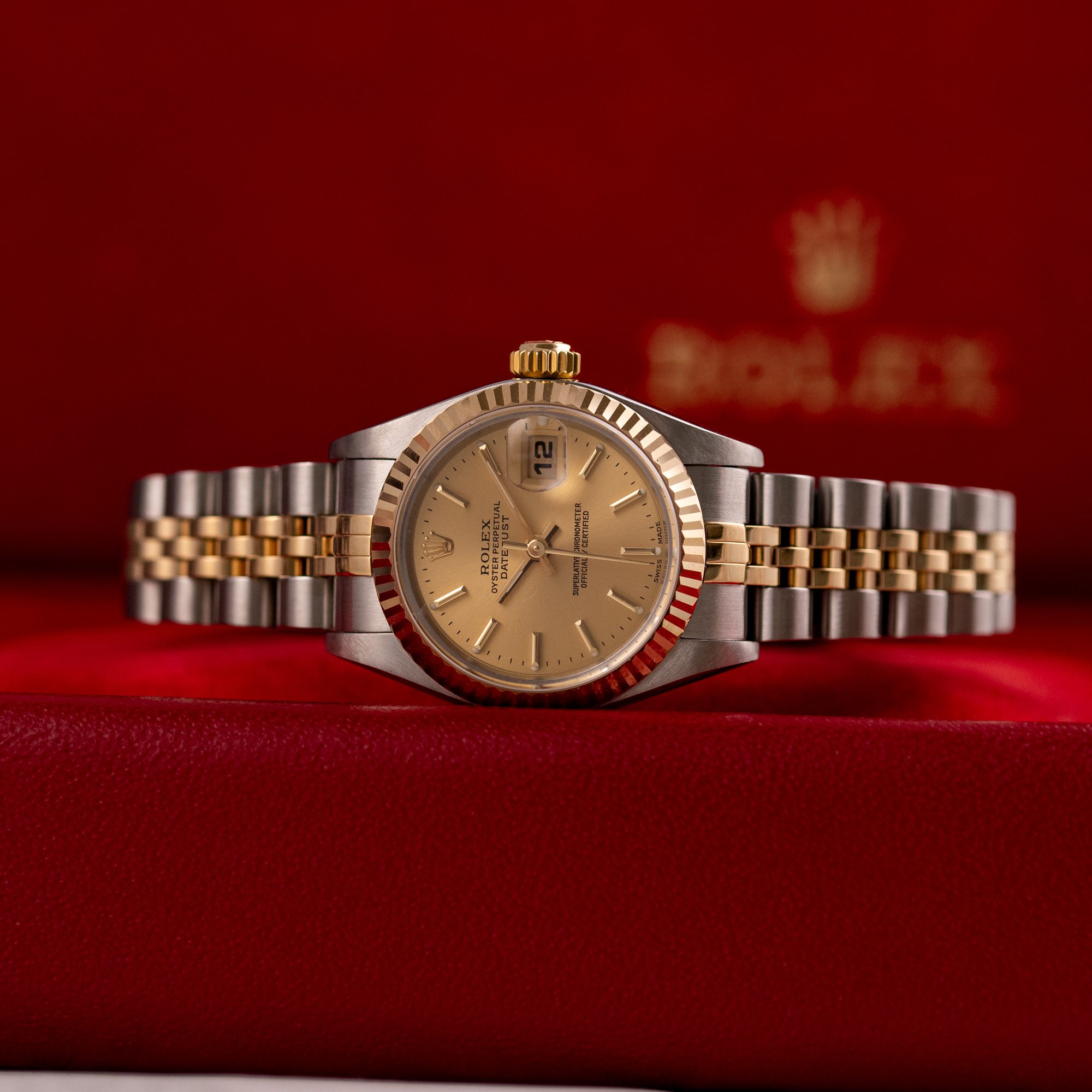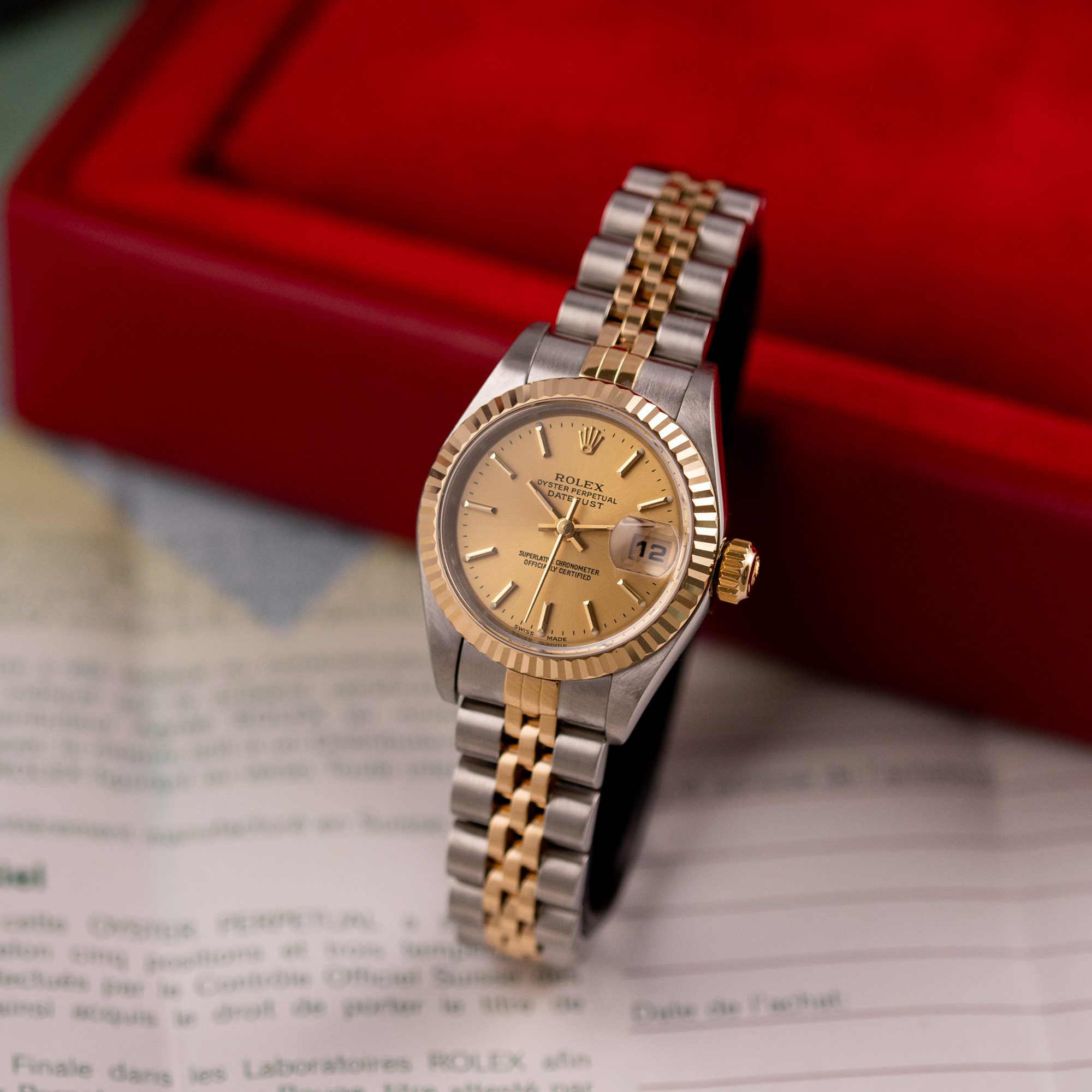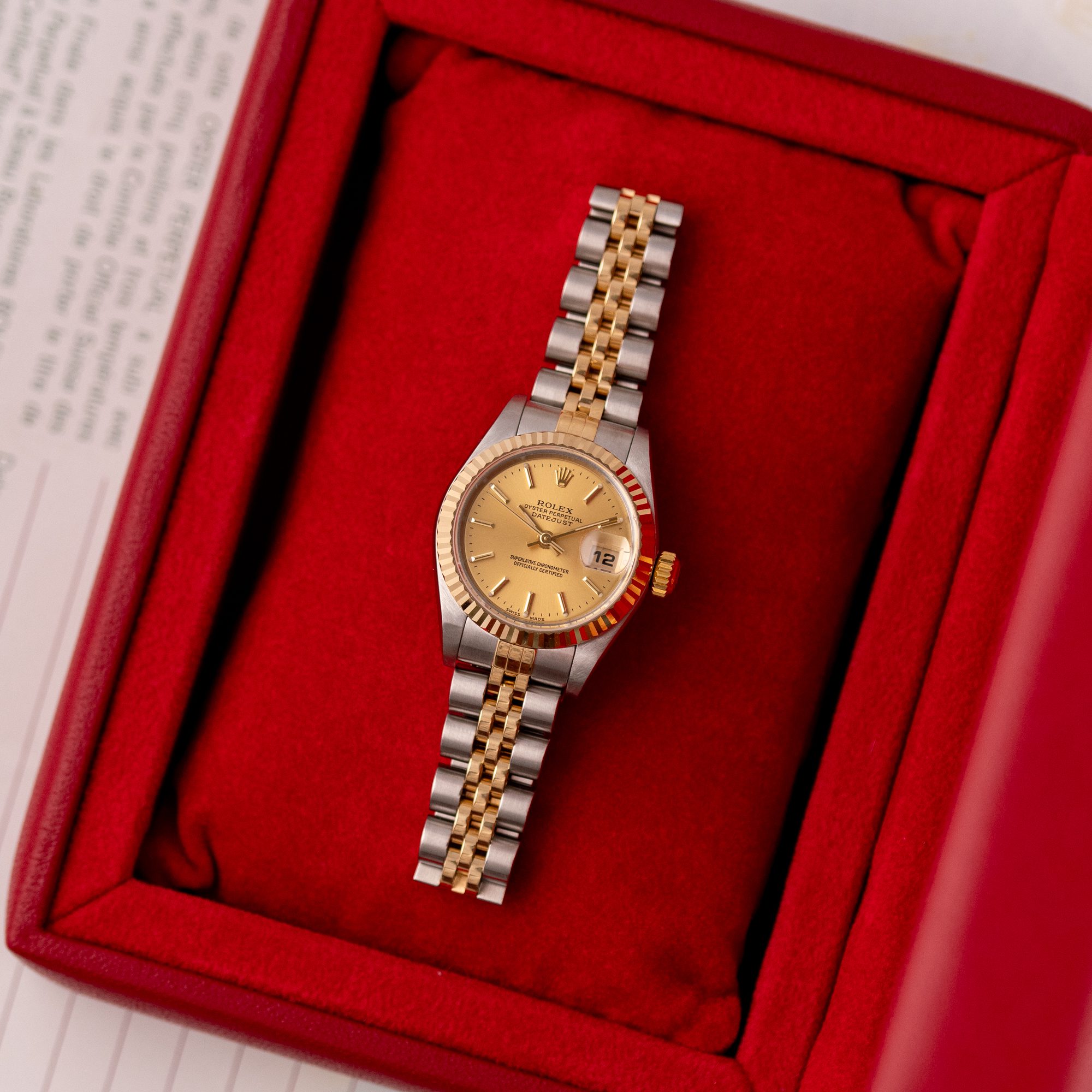 The Rolex Datejust 26, ref. 79173, crafted in stainless steel and yellow gold, features a 26mm case with a fluted bezel, delivering a classic two-tone design that balances refined elegance with compact versatility, suitable for both formal settings and daily wear.
