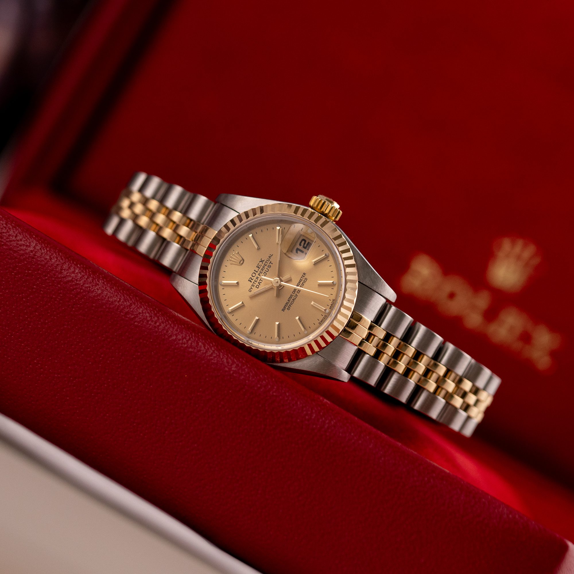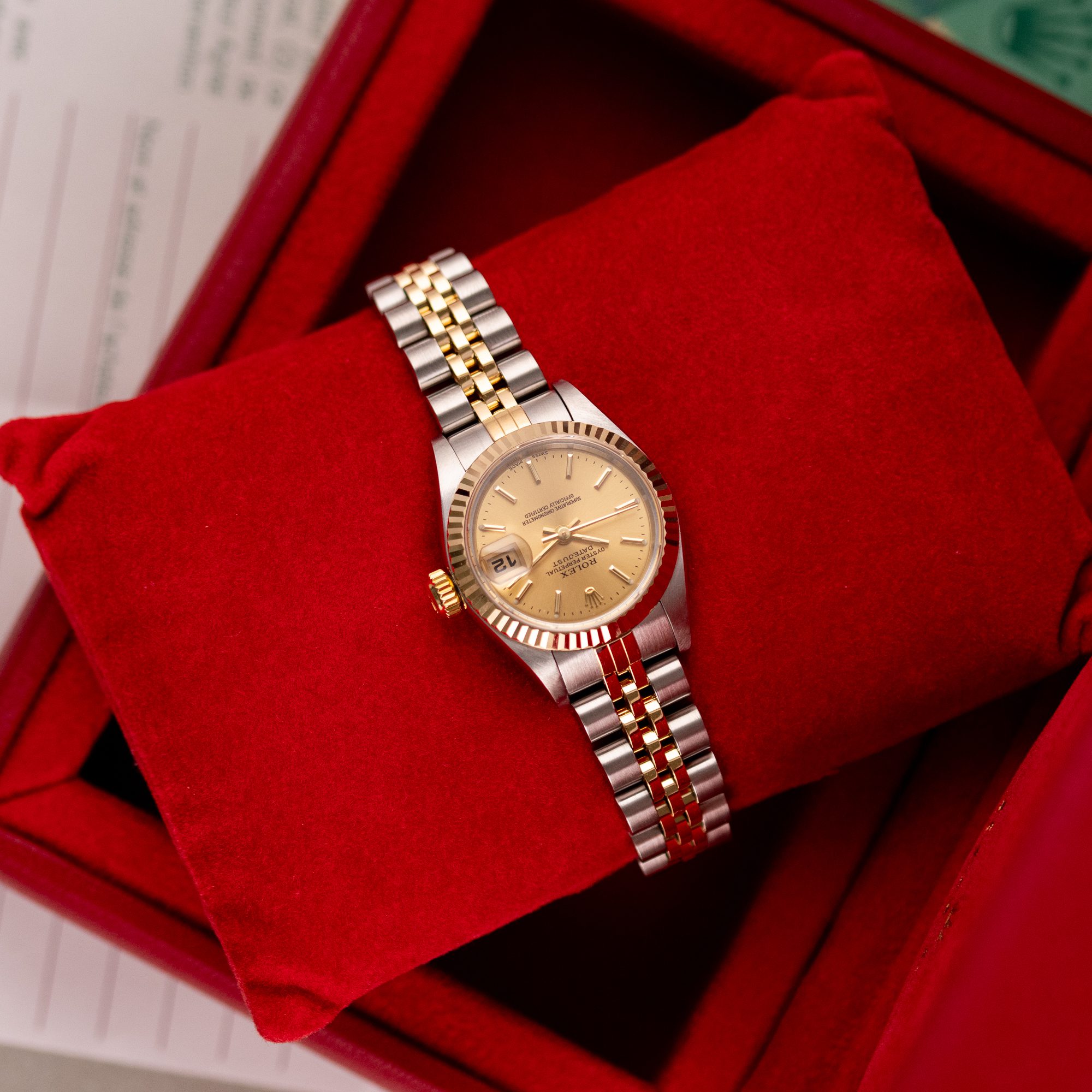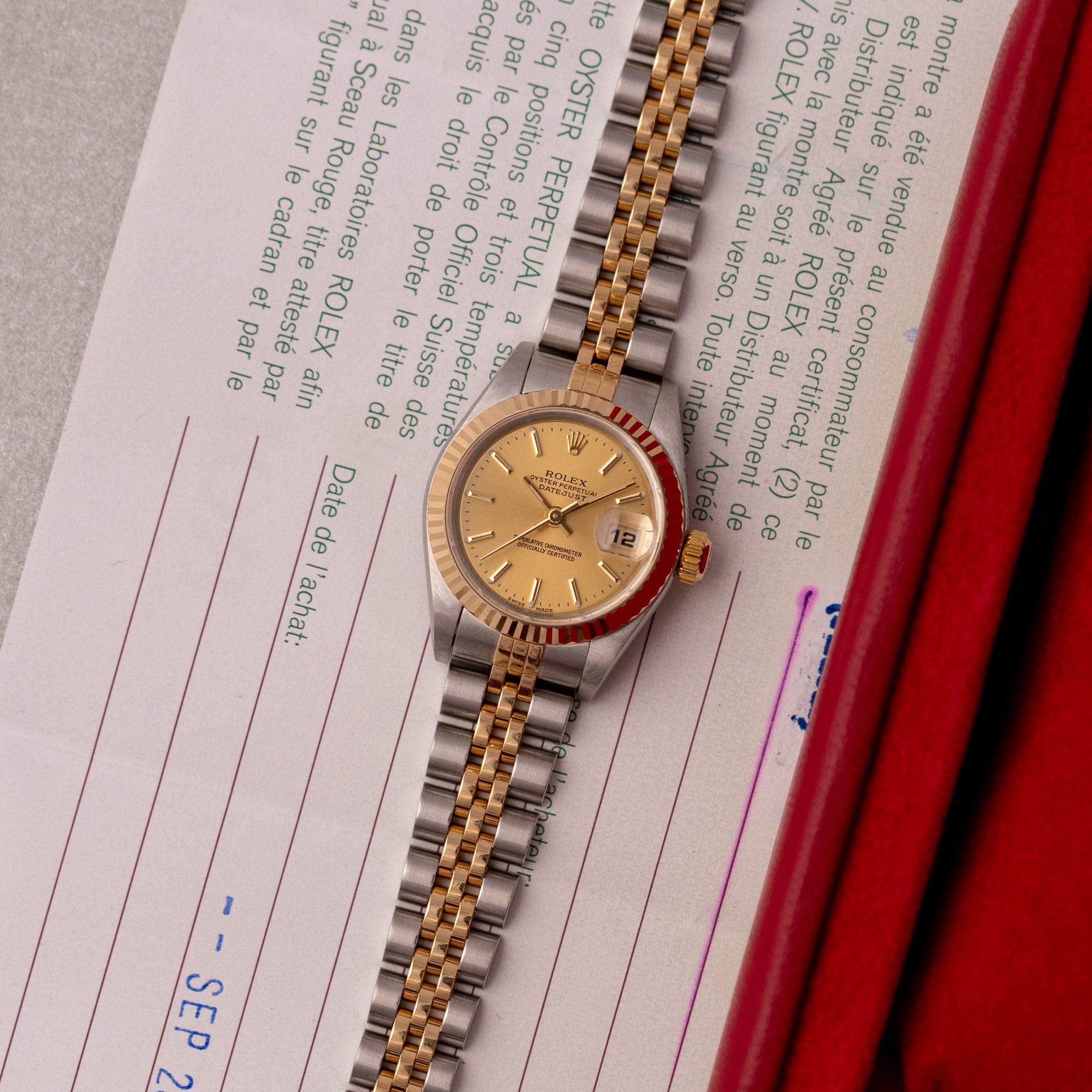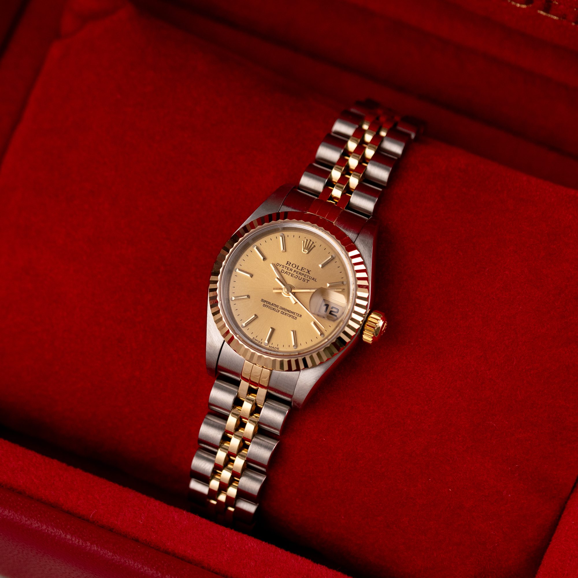 The Rolex Datejust 26, ref. 79173, crafted in stainless steel and yellow gold, features a 26mm case with a fluted bezel, delivering a classic two-tone design that balances refined elegance with compact versatility, suitable for both formal settings and daily wear.