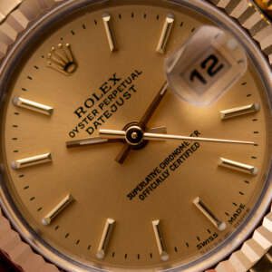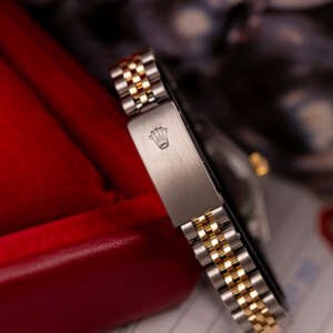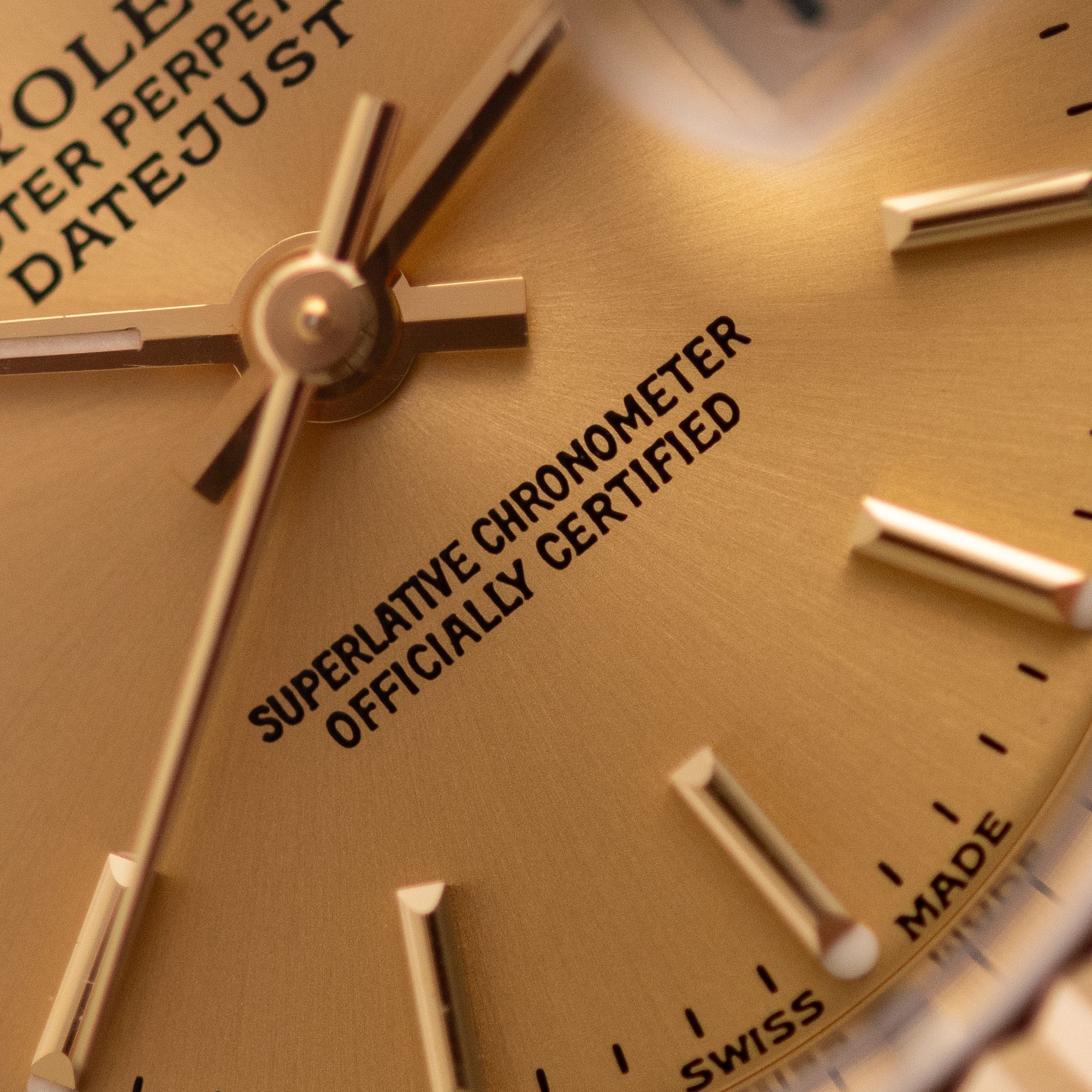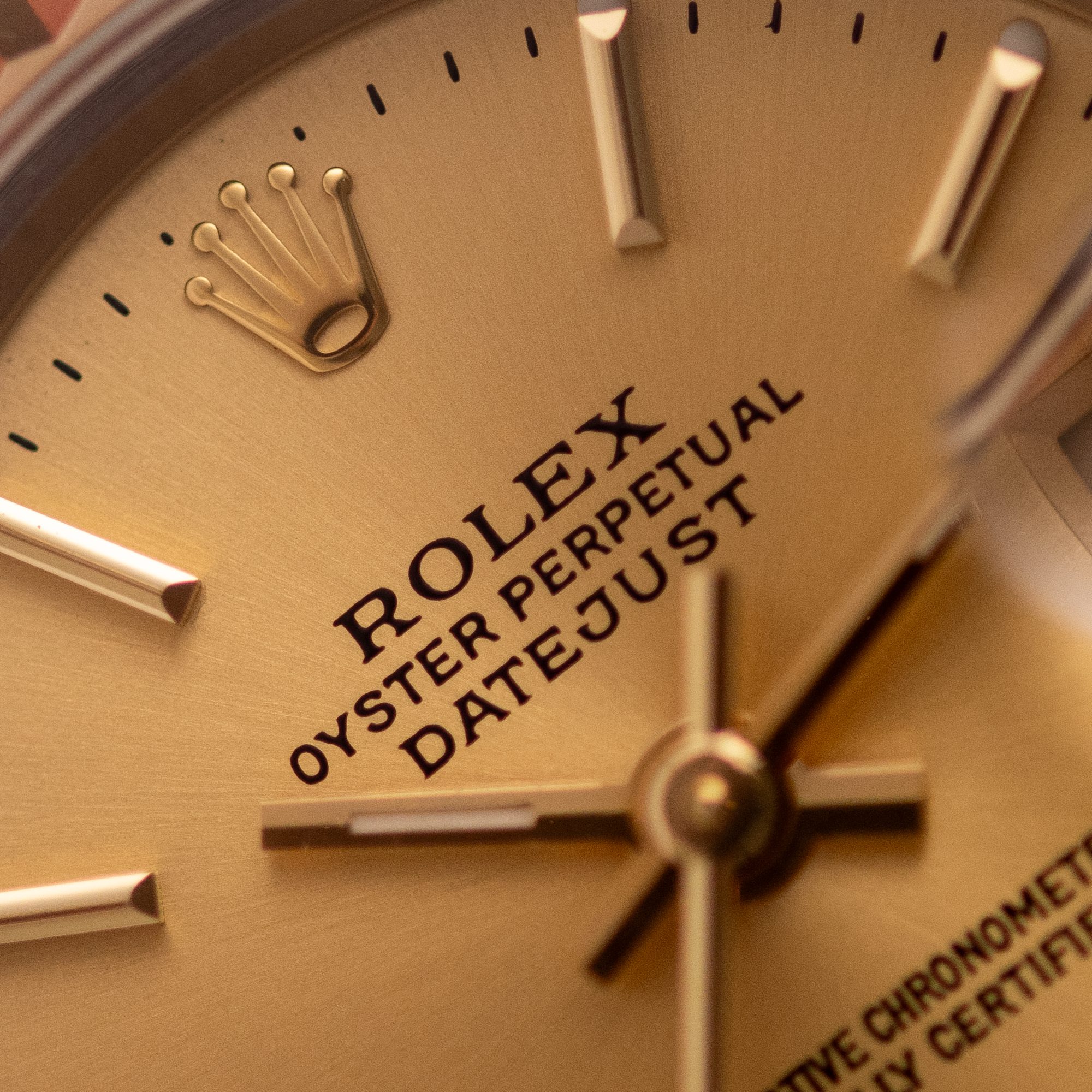 Originally sold in 2003, this example showcases a timeless Champagne dial, offering a warm, sophisticated appearance that enhances its classic appeal. The watch is in very good condition, with a fully functional automatic movement ensuring precise timekeeping. The Jubilee bracelet, sized for wrists up to 16 cm, shows minimal stretch, preserving its structural integrity. Presented as a full set with its original Rolex box and papers, this Datejust is an ideal choice for collectors or those seeking a well-maintained vintage timepiece.