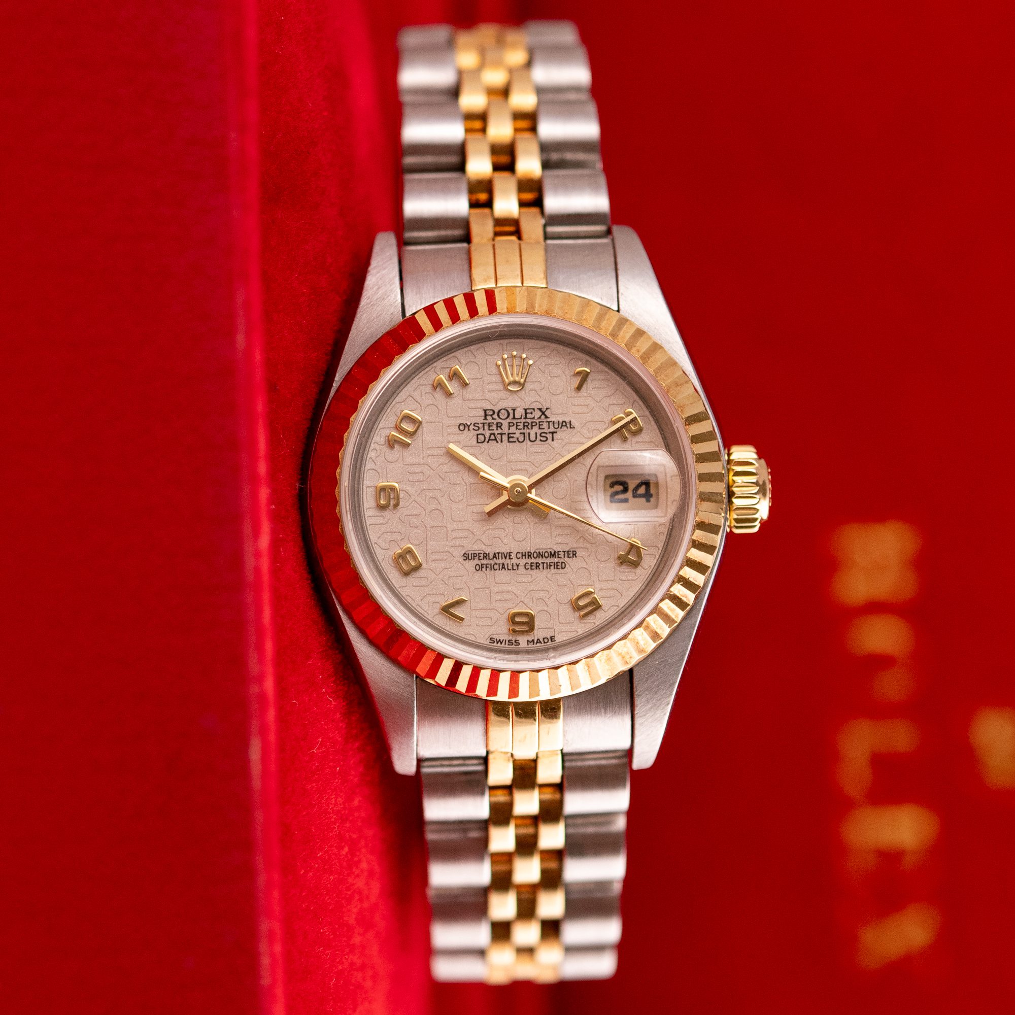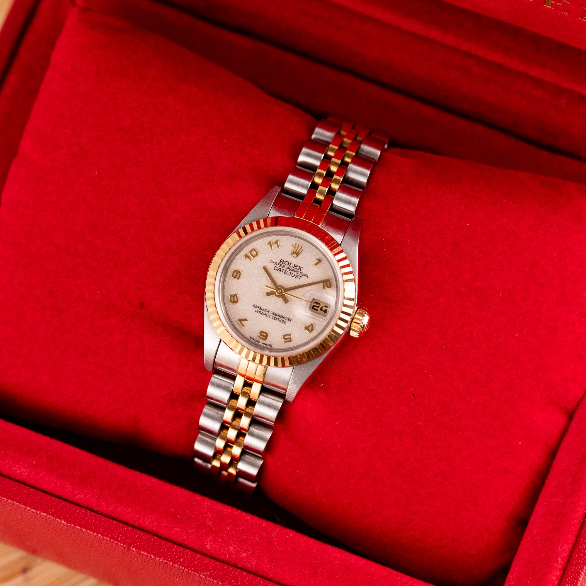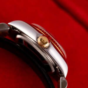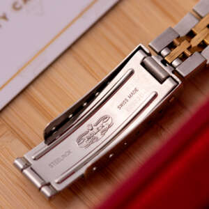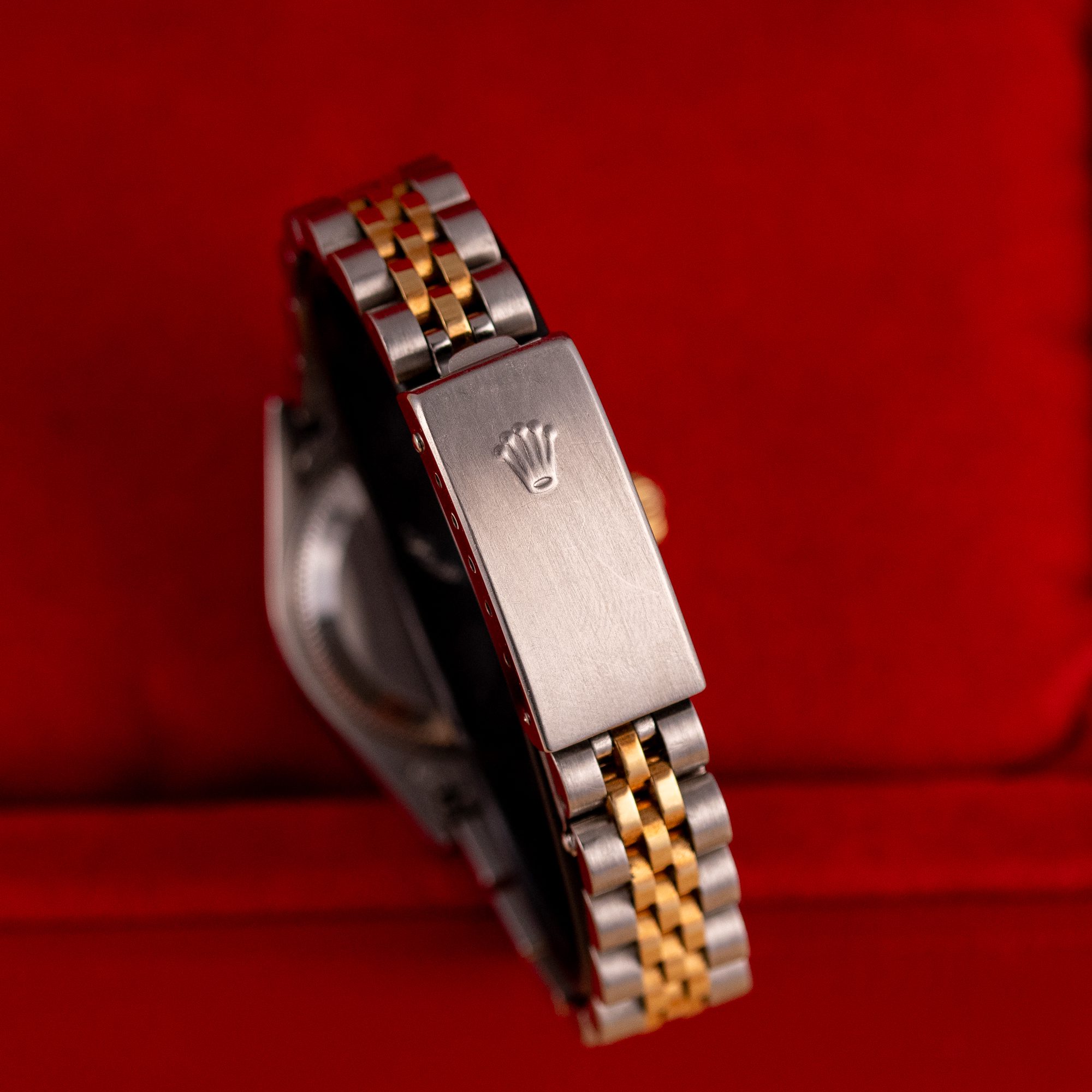 The Rolex Datejust 26, ref. 79173, merges stainless steel and yellow gold in a two-tone design, featuring a fluted bezel and a 26mm case that offers a balanced, versatile look suitable for both formal and casual settings.