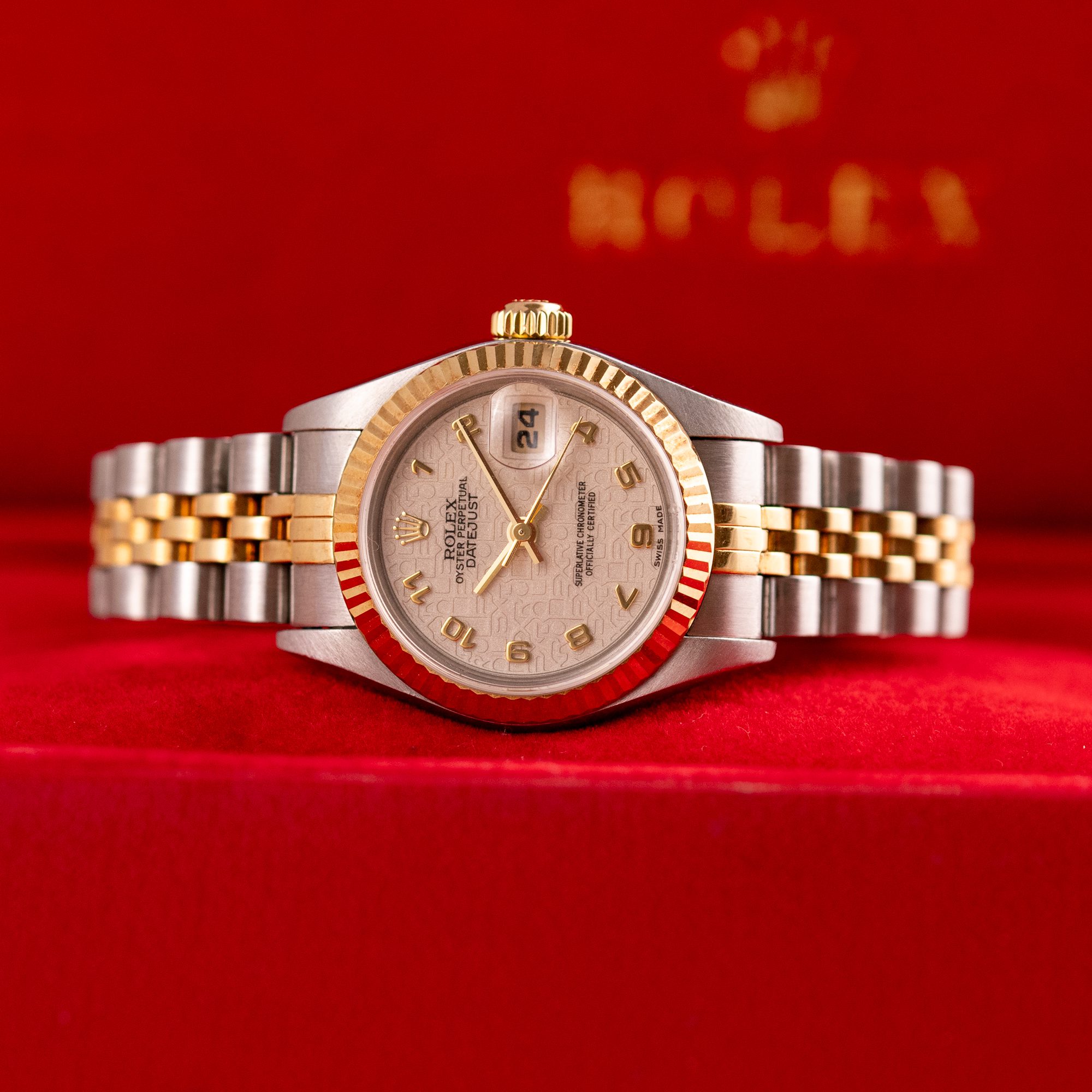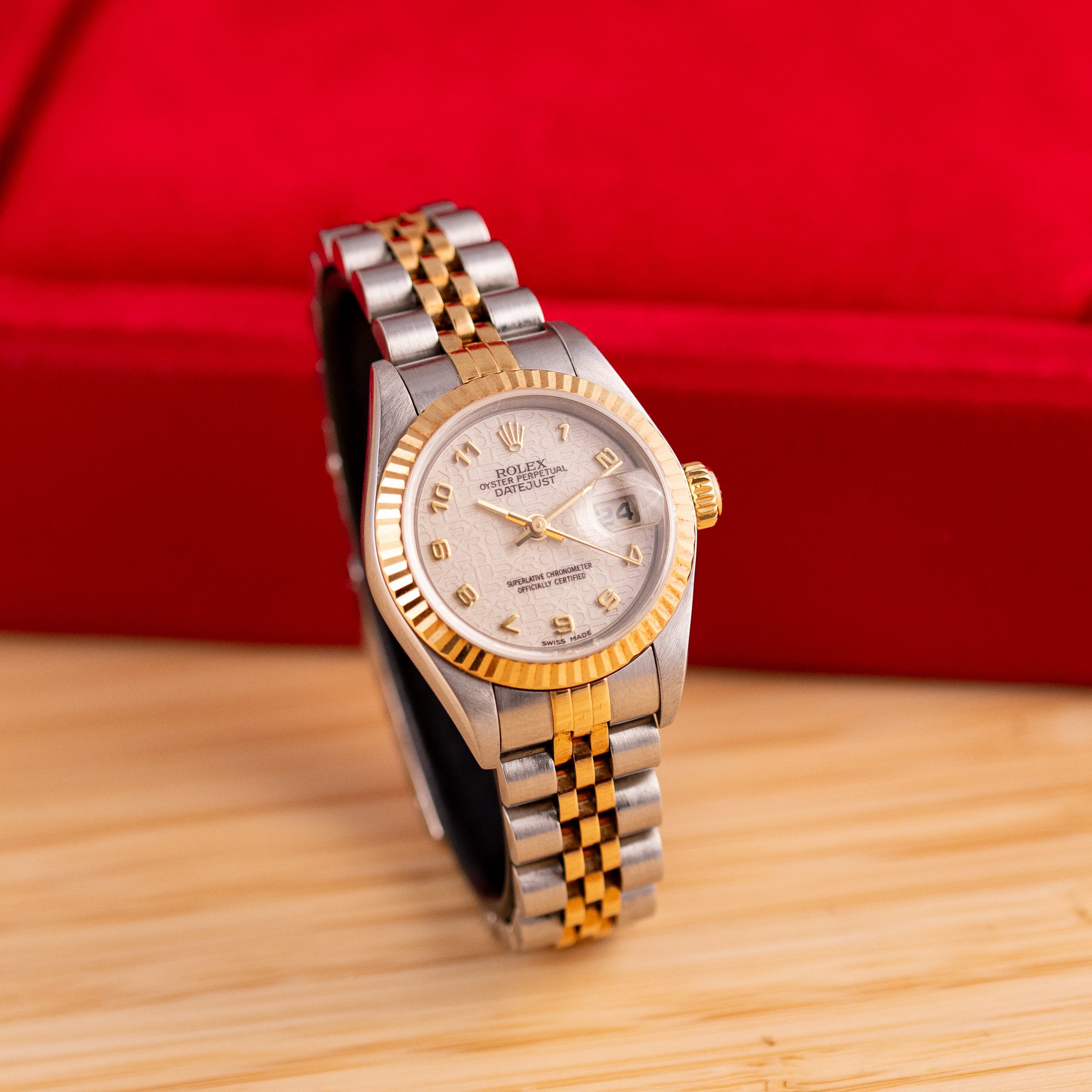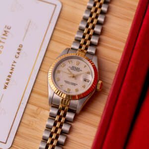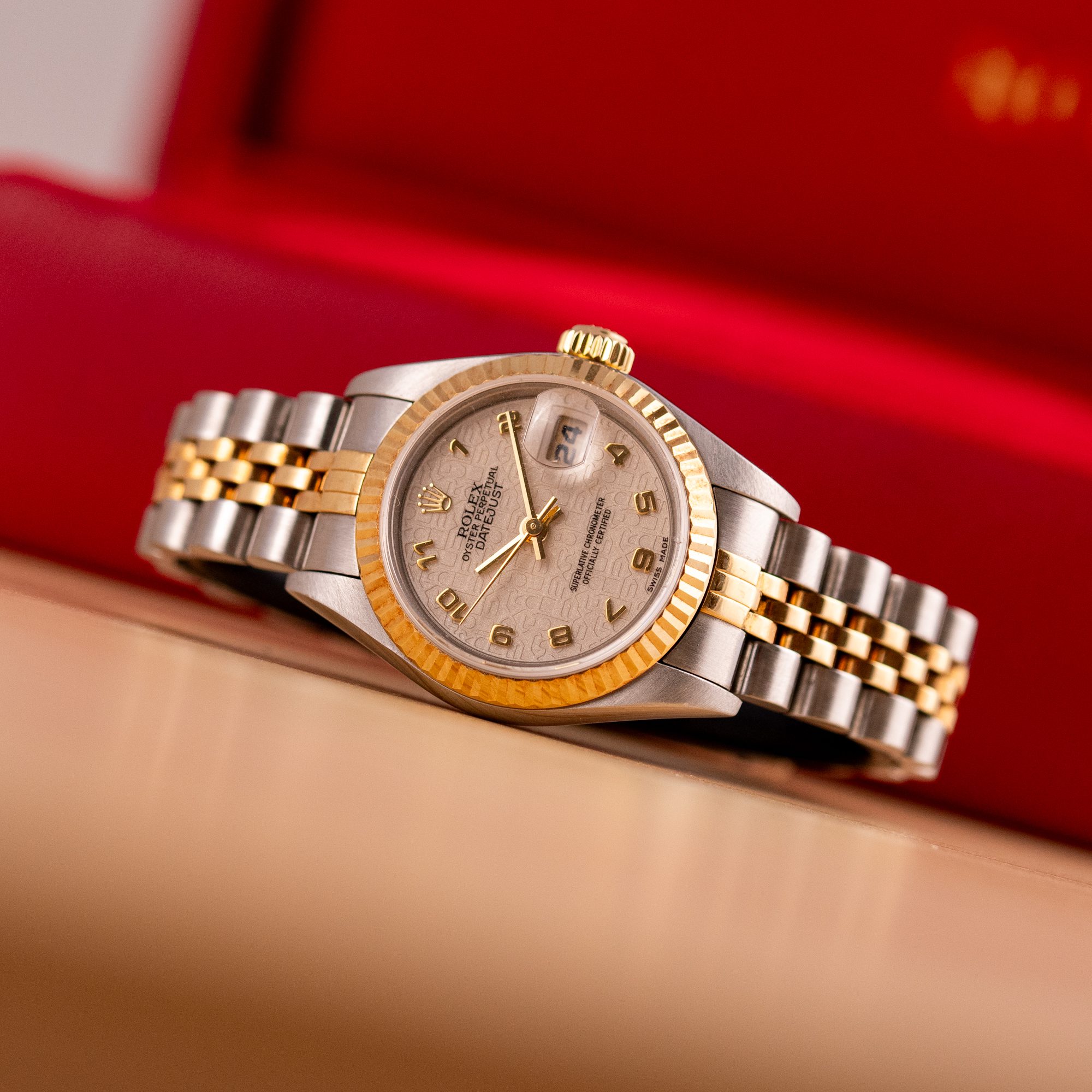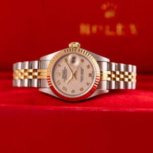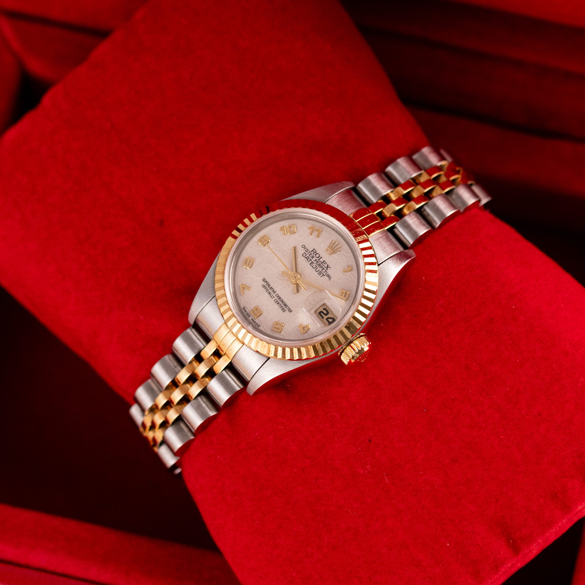 The Rolex Datejust 26, ref. 79173, merges stainless steel and yellow gold in a two-tone design, featuring a fluted bezel and a 26mm case that offers a balanced, versatile look suitable for both formal and casual settings.