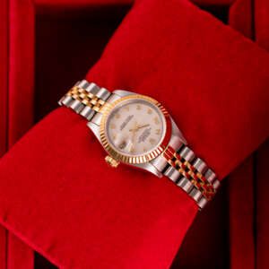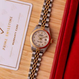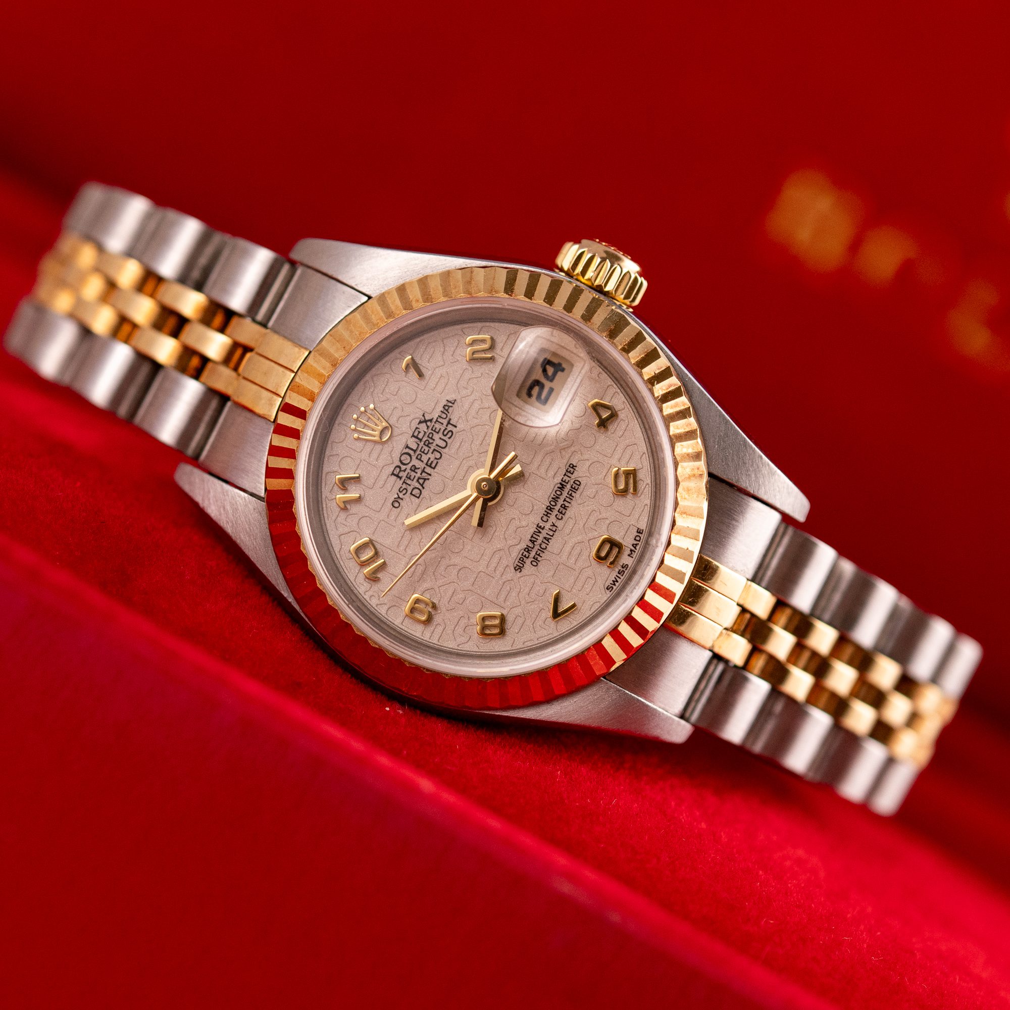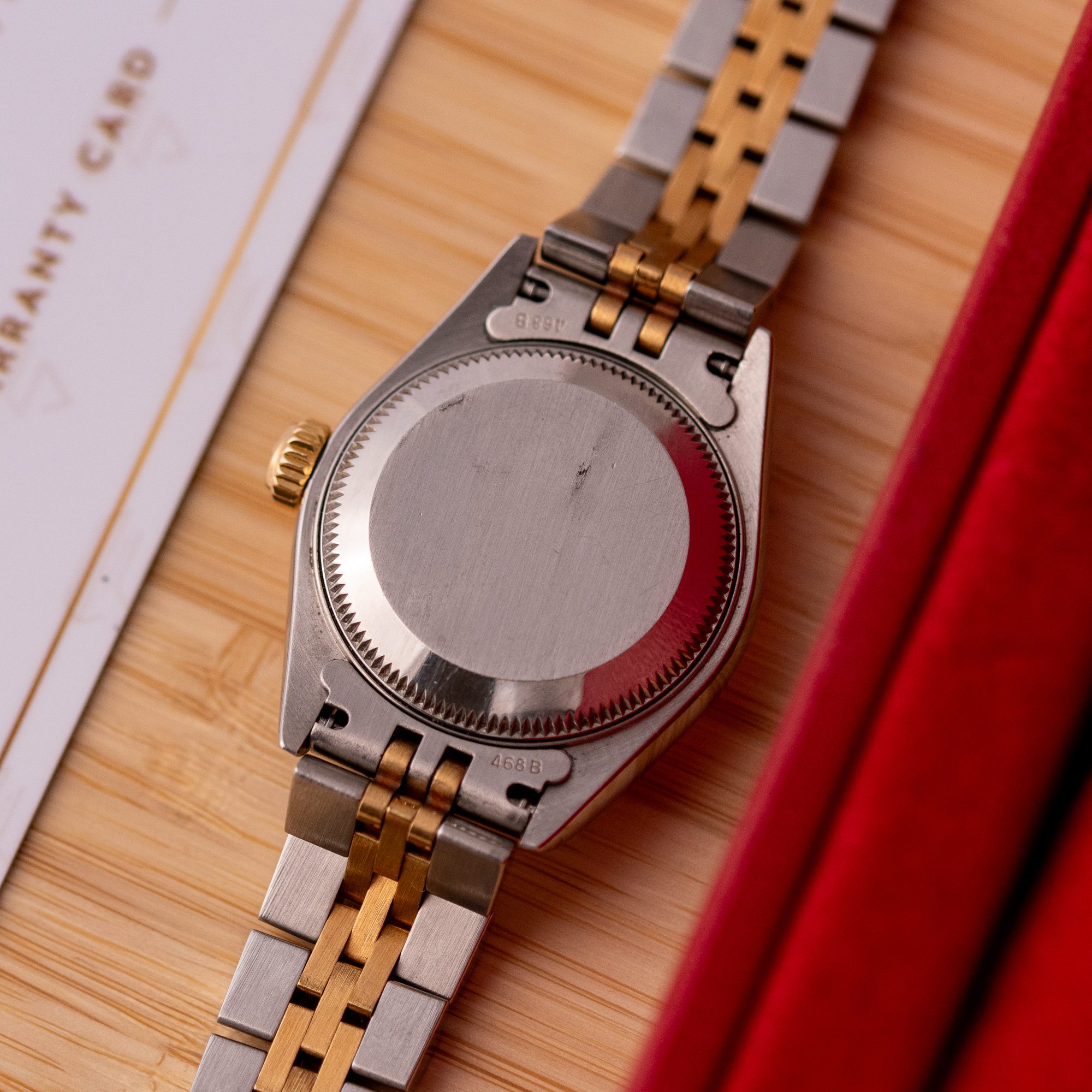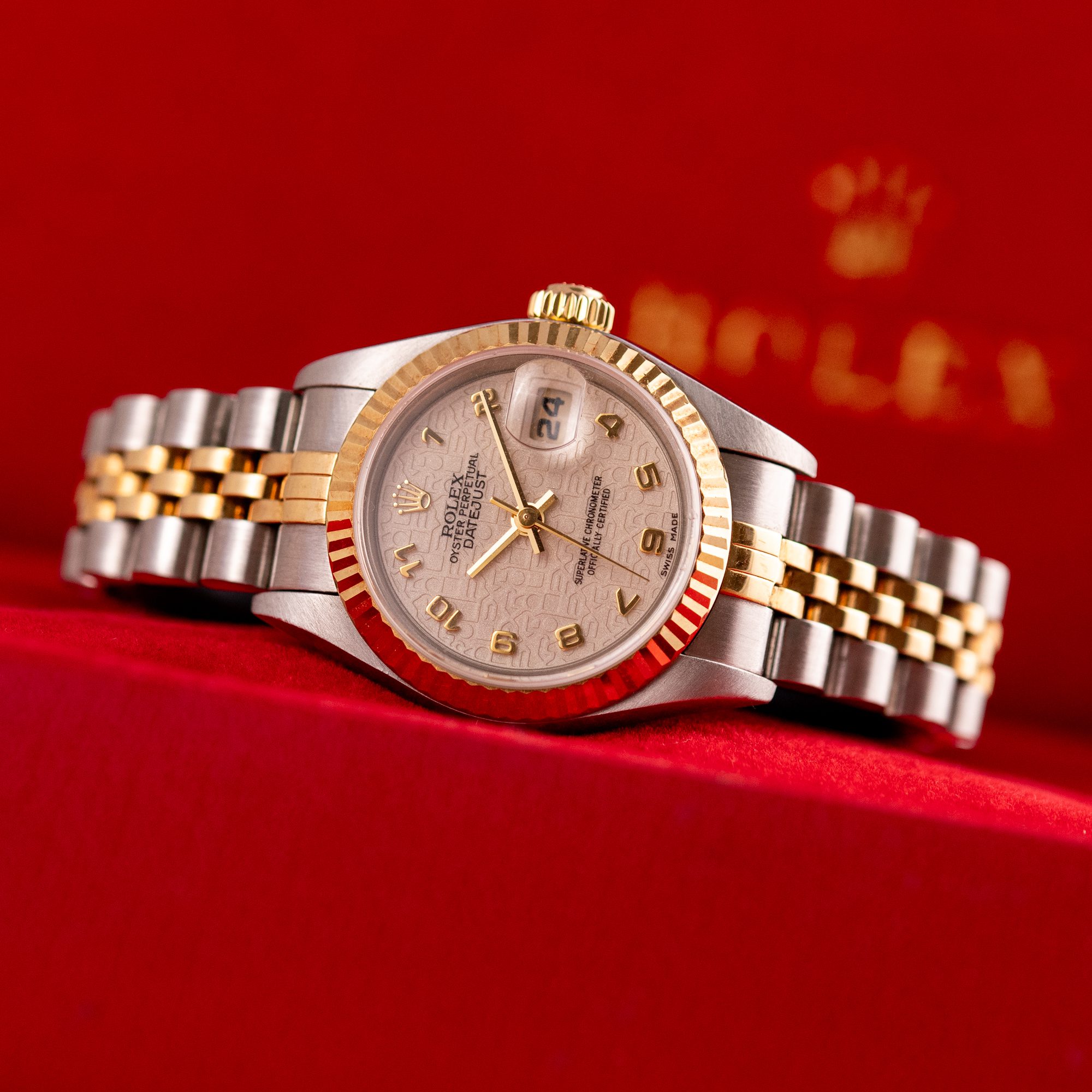 The Rolex Datejust 26, ref. 79173, merges stainless steel and yellow gold in a two-tone design, featuring a fluted bezel and a 26mm case that offers a balanced, versatile look suitable for both formal and casual settings.