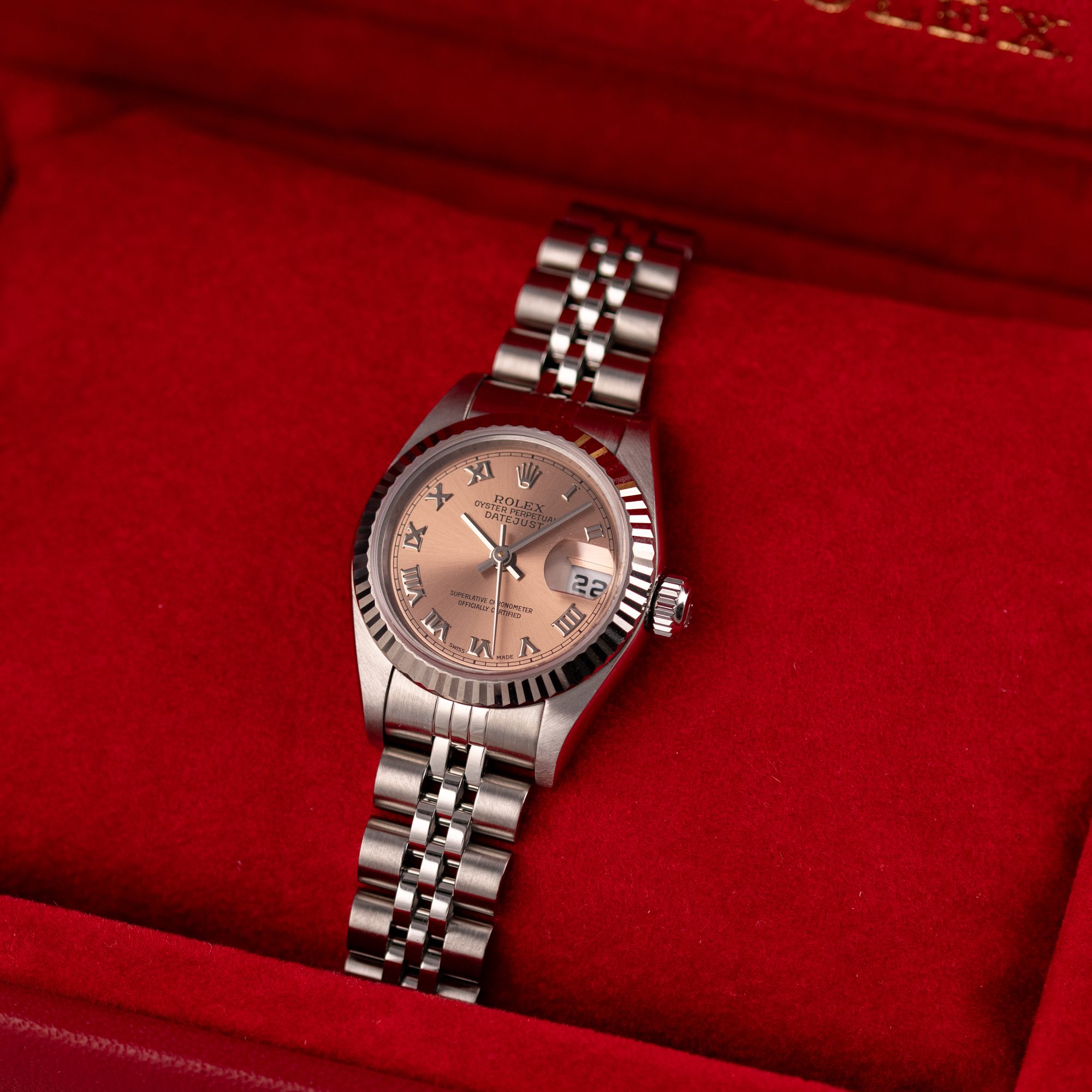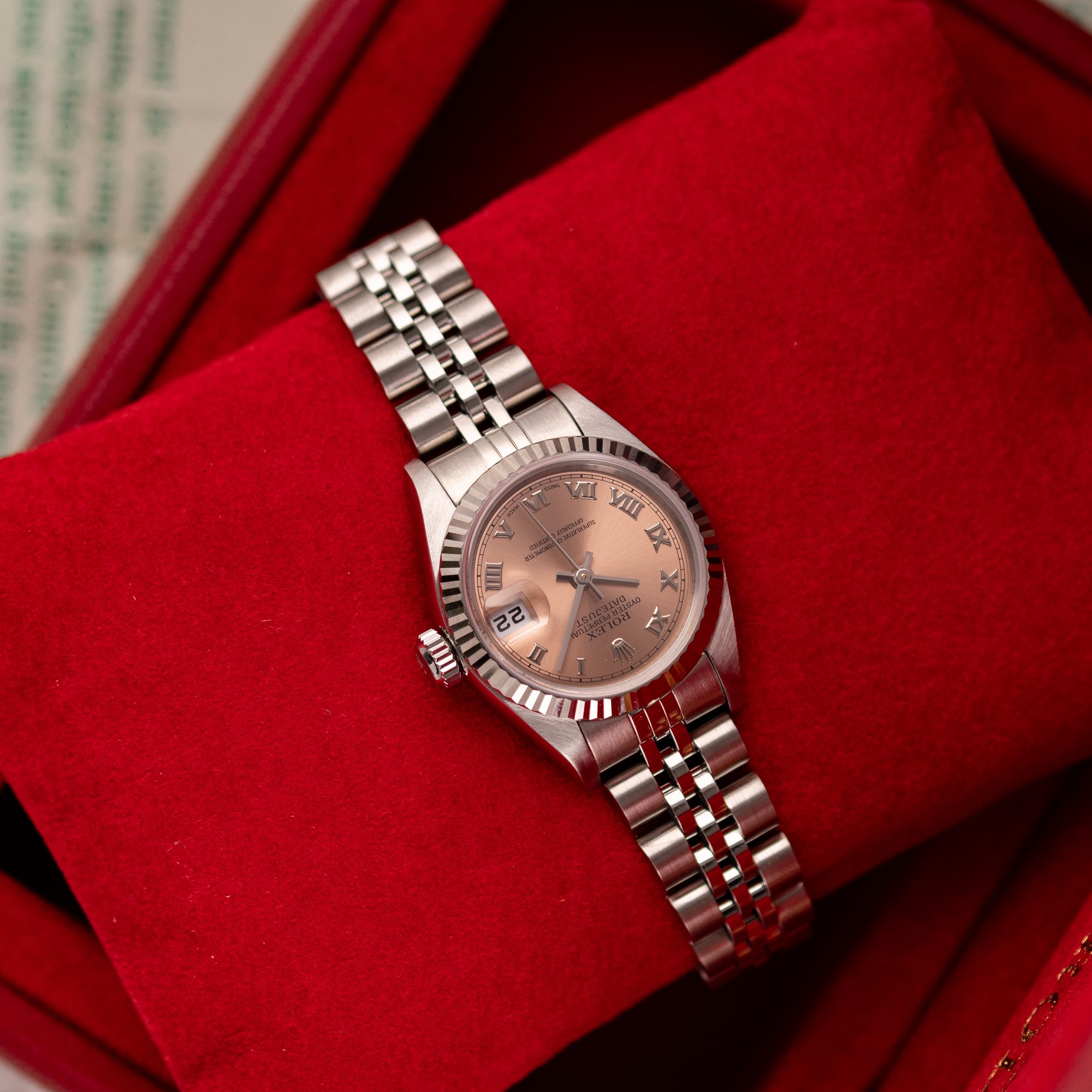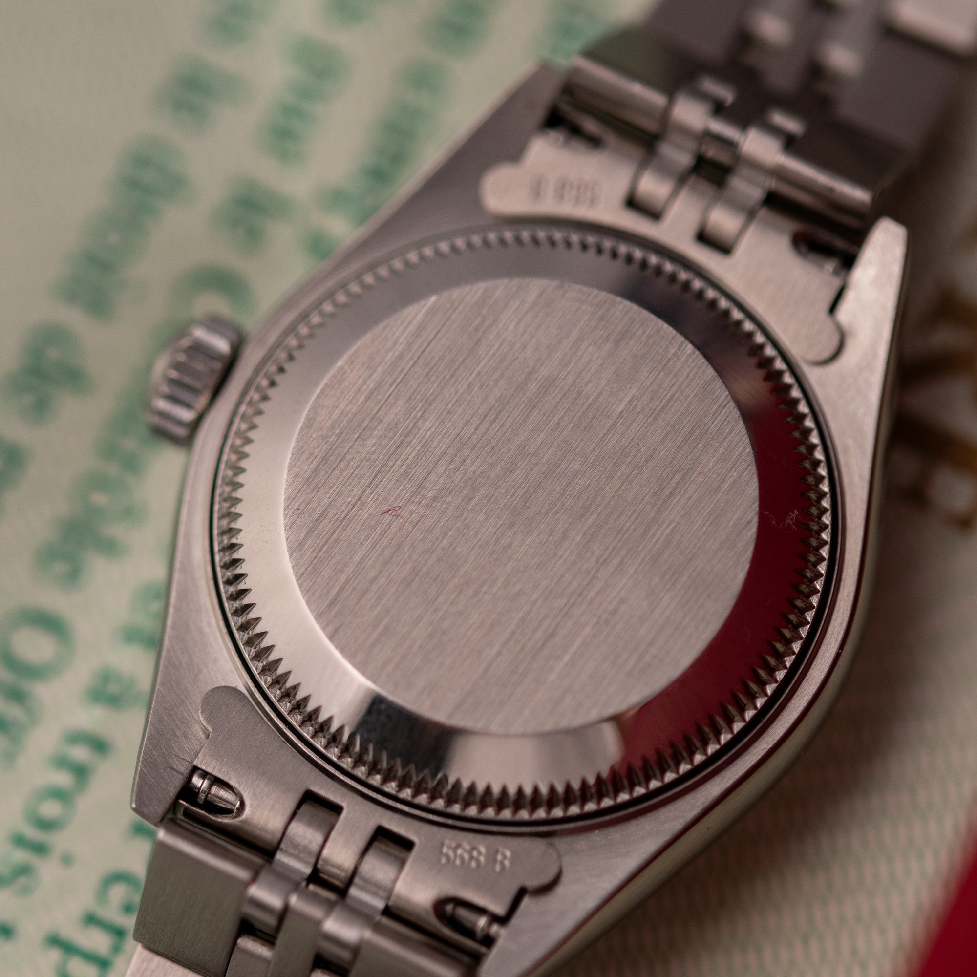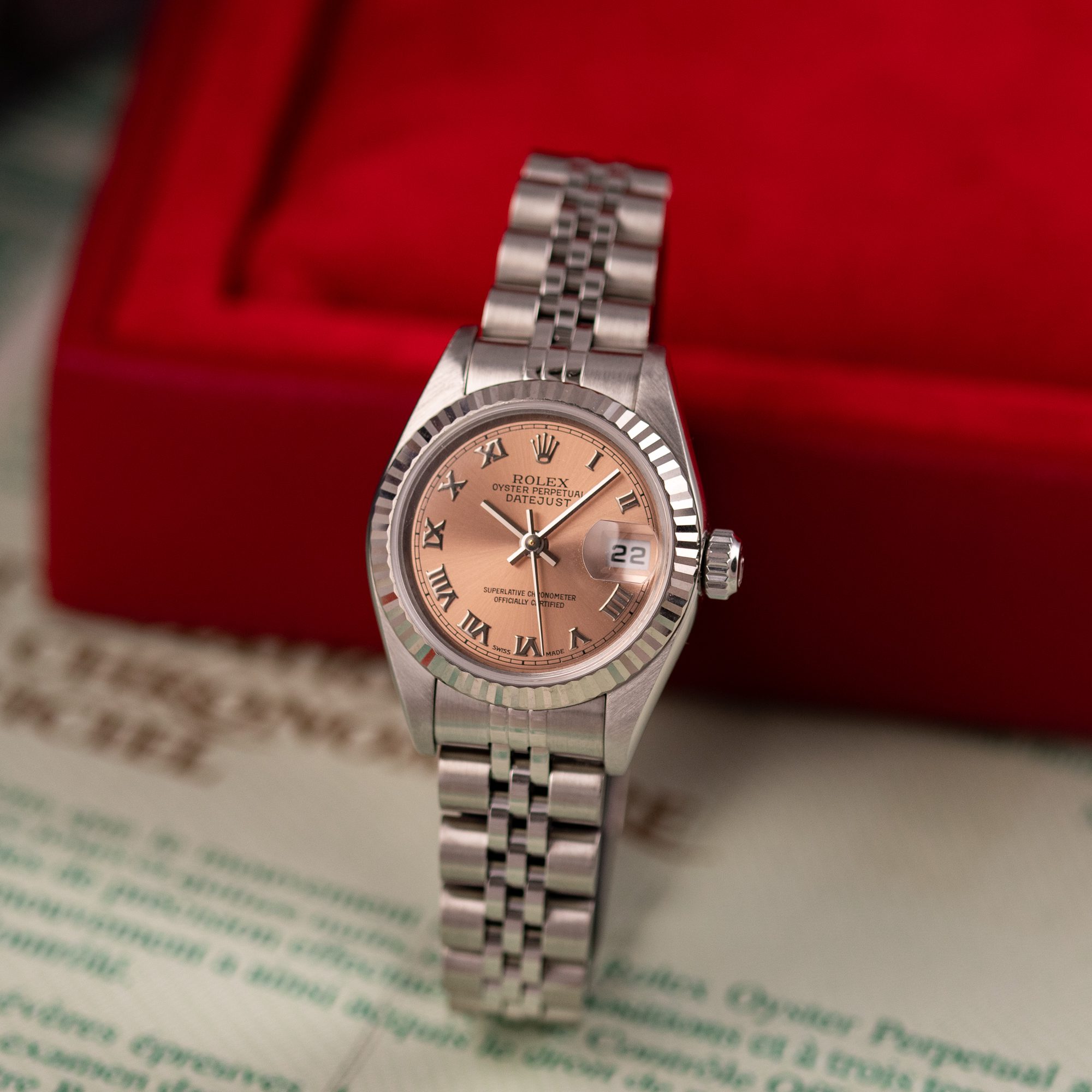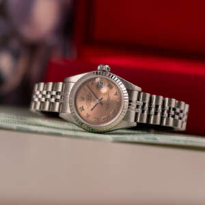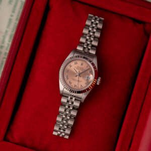 Originally sold in 2001, this example showcases a beautiful Salmon dial, offering a warm, distinctive hue that enhances its sophisticated aesthetic. The watch is in very good condition, with a recently completed full service ensuring the automatic movement’s full functionality and reliable performance. The Jubilee bracelet, sized for wrists up to 16 cm, shows minimal stretch, maintaining its structural integrity. Presented as a full set with its original Rolex box and papers, this Datejust is an excellent choice for collectors or those seeking a well-maintained vintage timepiece.