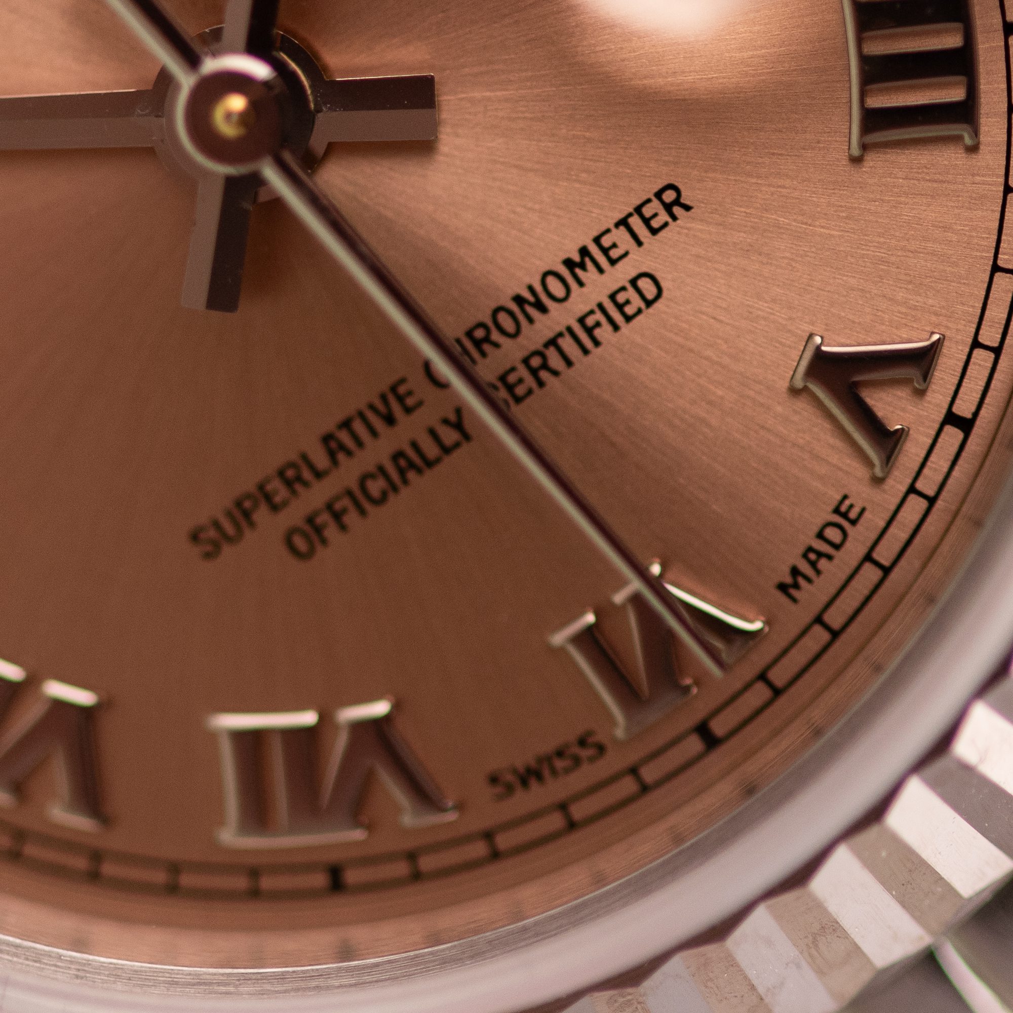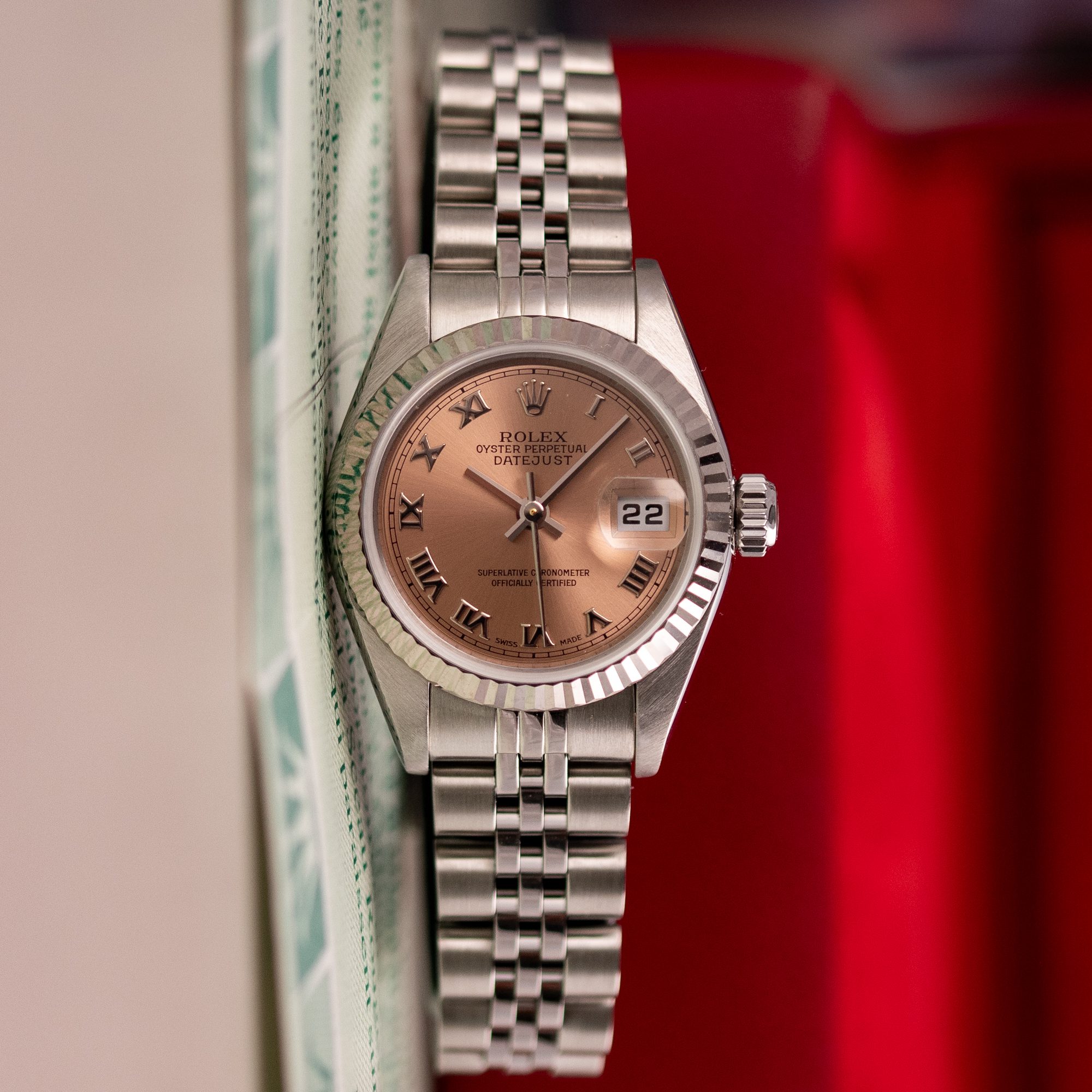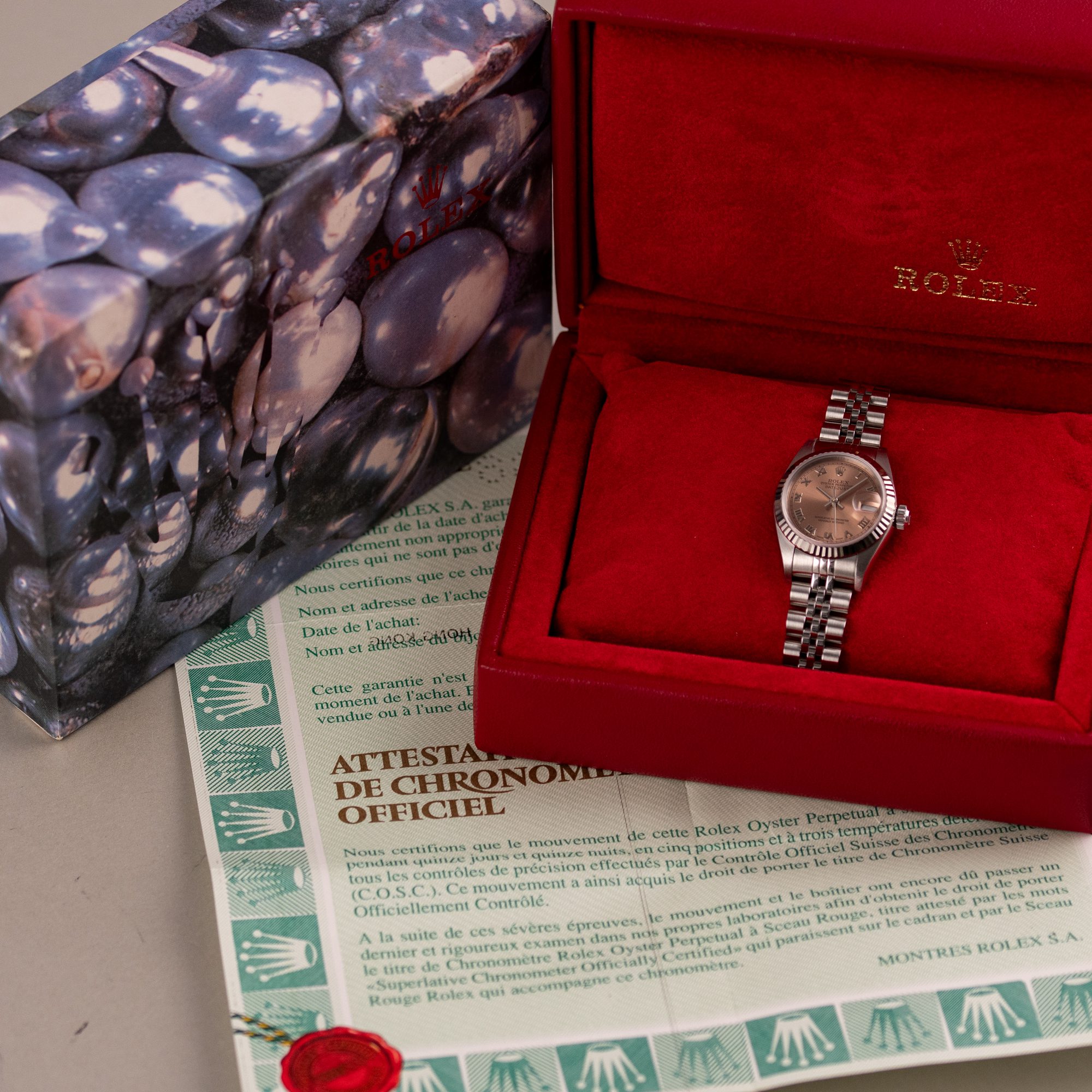 Originally sold in 2001, this example showcases a beautiful Salmon dial, offering a warm, distinctive hue that enhances its sophisticated aesthetic. The watch is in very good condition, with a recently completed full service ensuring the automatic movement’s full functionality and reliable performance. The Jubilee bracelet, sized for wrists up to 16 cm, shows minimal stretch, maintaining its structural integrity. Presented as a full set with its original Rolex box and papers, this Datejust is an excellent choice for collectors or those seeking a well-maintained vintage timepiece.