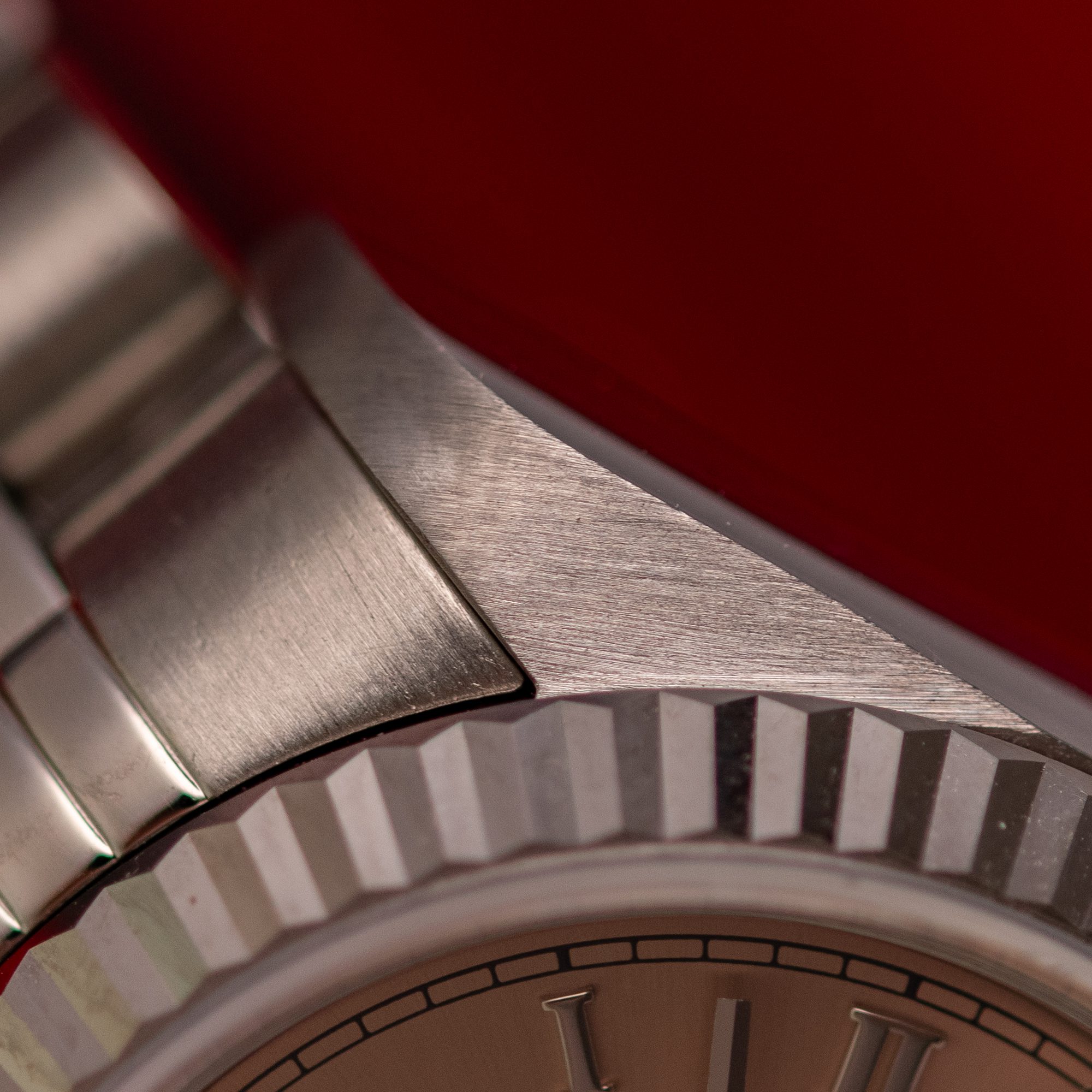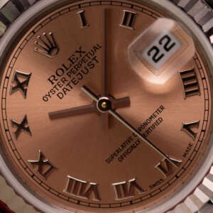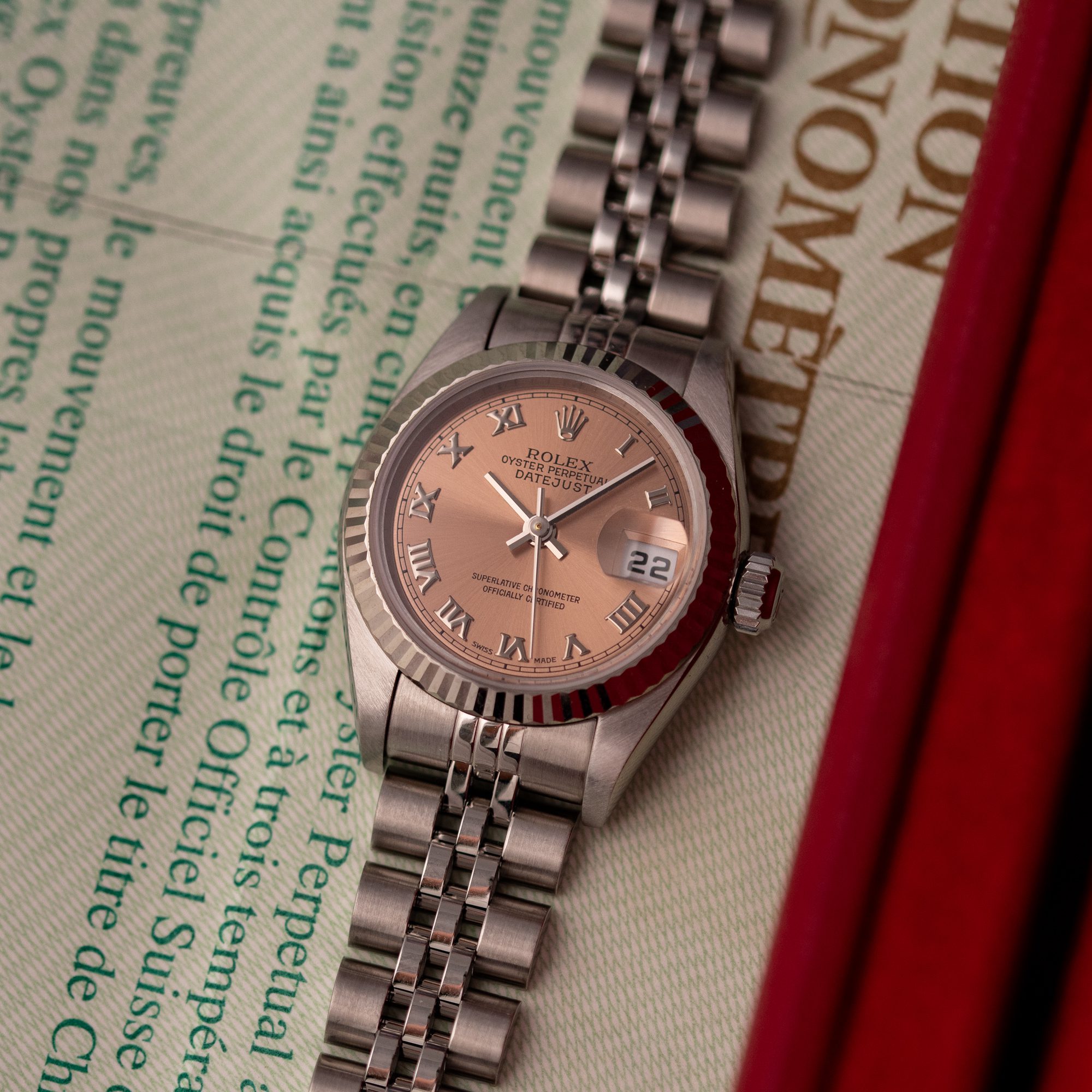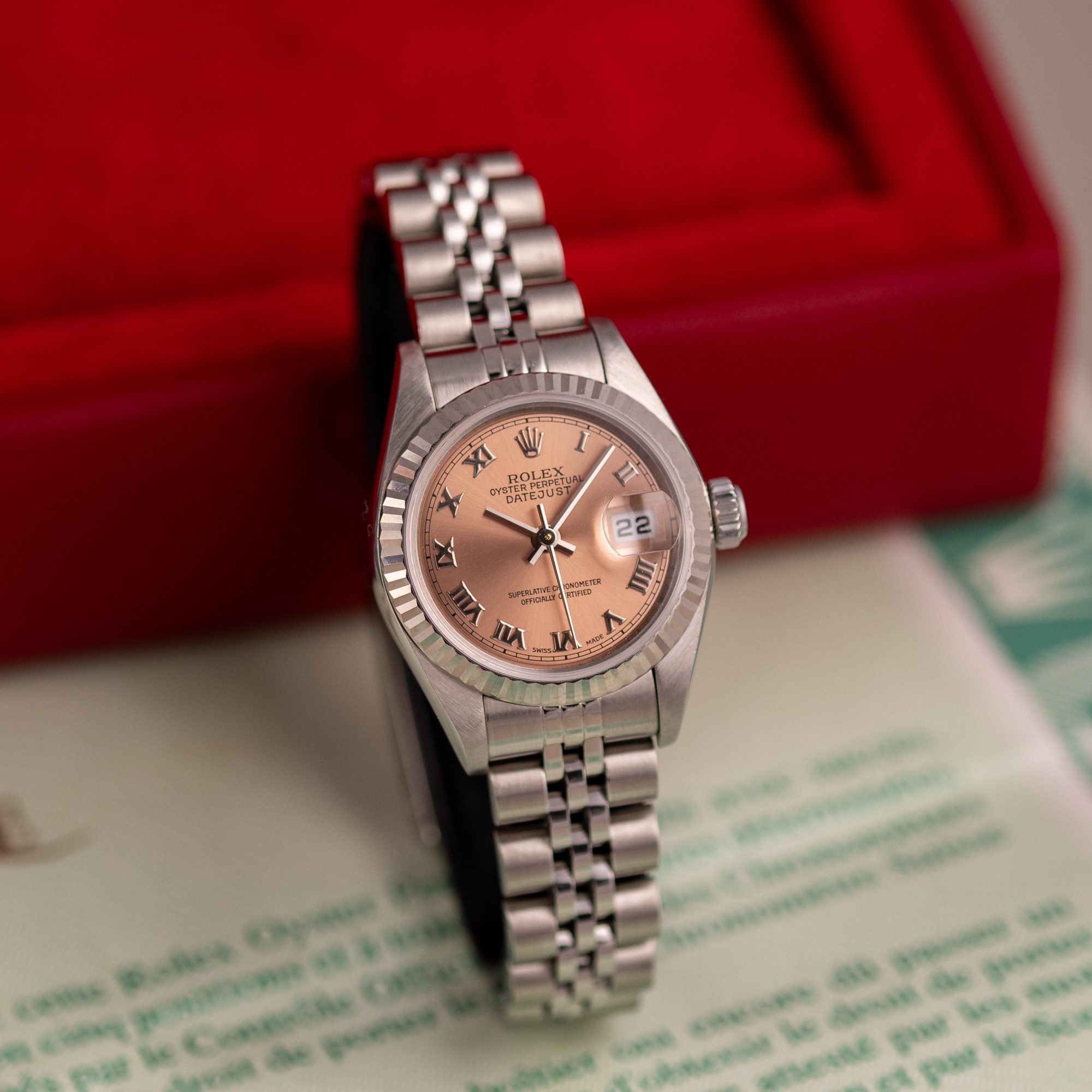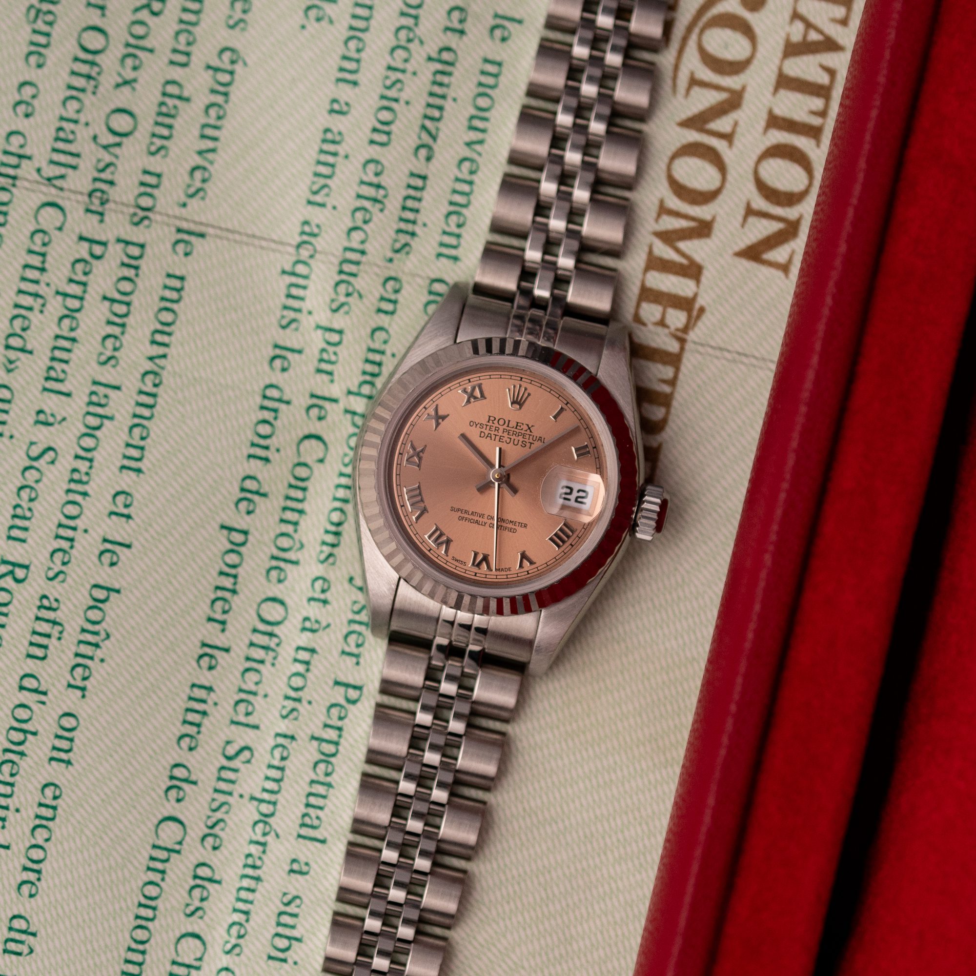 Originally sold in 2001, this example showcases a beautiful Salmon dial, offering a warm, distinctive hue that enhances its sophisticated aesthetic. The watch is in very good condition, with a recently completed full service ensuring the automatic movement’s full functionality and reliable performance. The Jubilee bracelet, sized for wrists up to 16 cm, shows minimal stretch, maintaining its structural integrity. Presented as a full set with its original Rolex box and papers, this Datejust is an excellent choice for collectors or those seeking a well-maintained vintage timepiece.