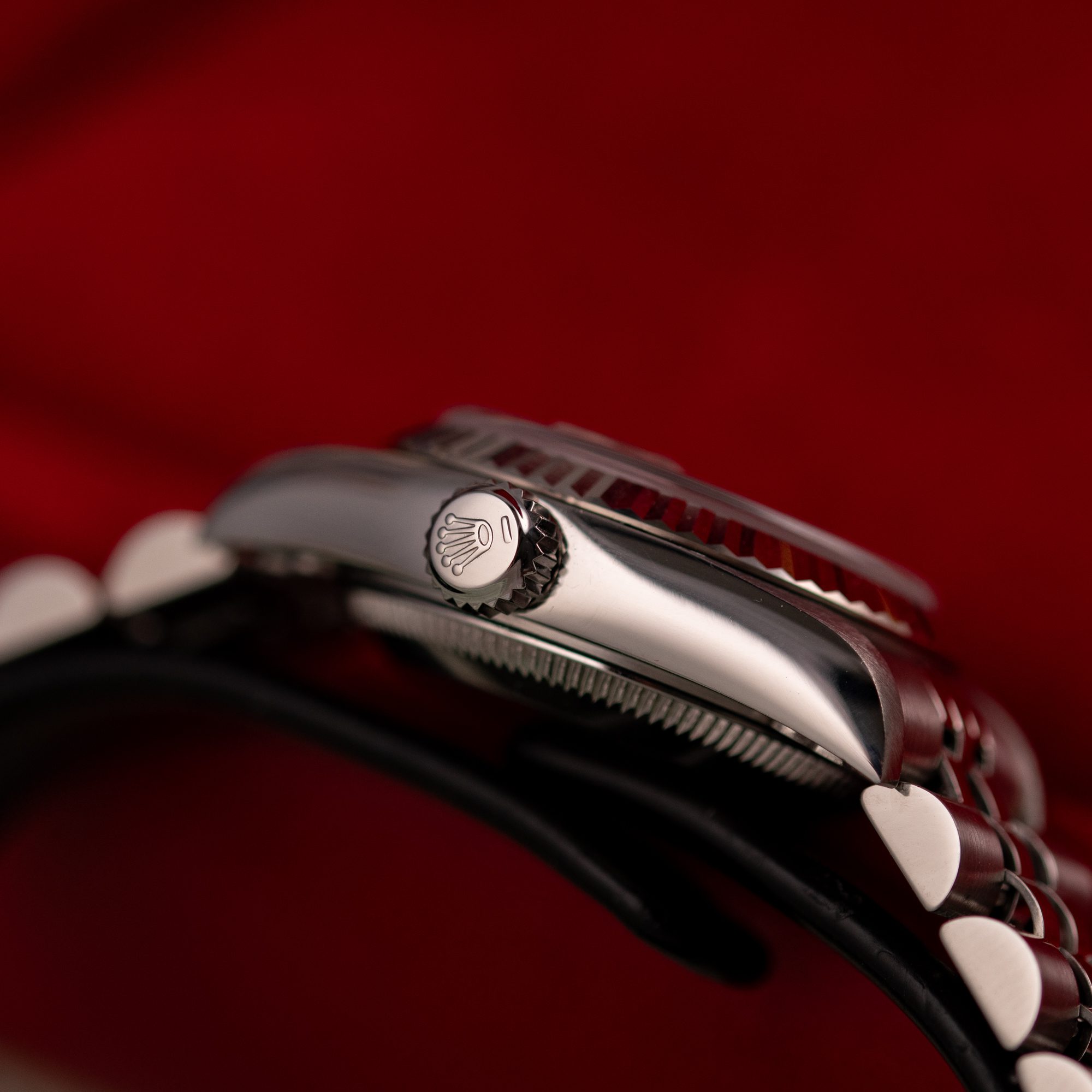 The Rolex Datejust 26, ref. 79174, crafted in stainless steel with a white gold fluted bezel, features a 26mm case, providing a refined two-tone design that balances classic elegance with compact versatility, suitable for both formal occasions and everyday wear.