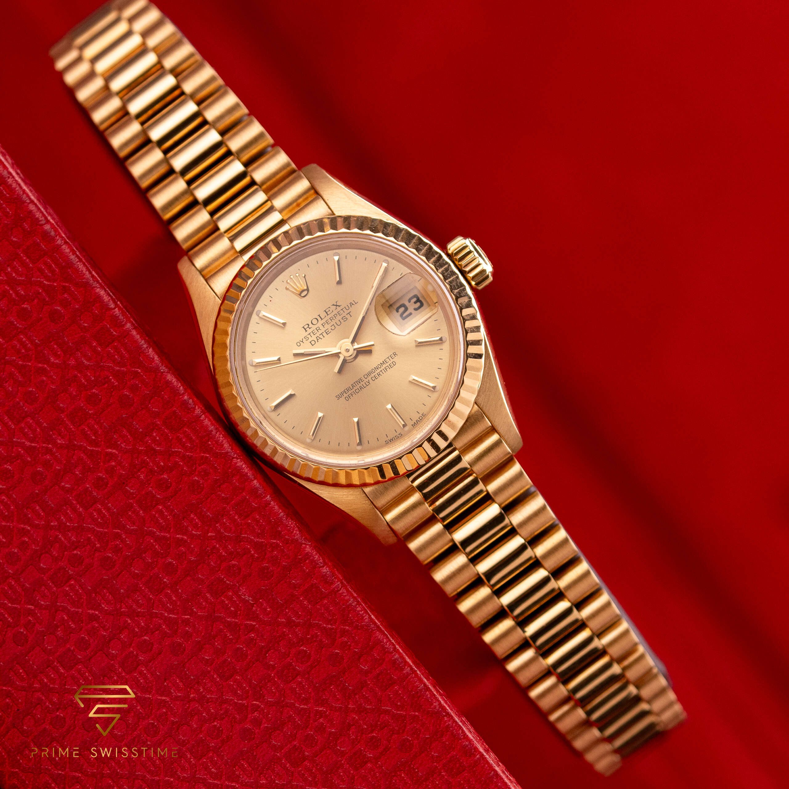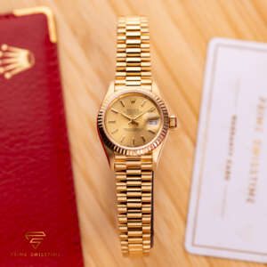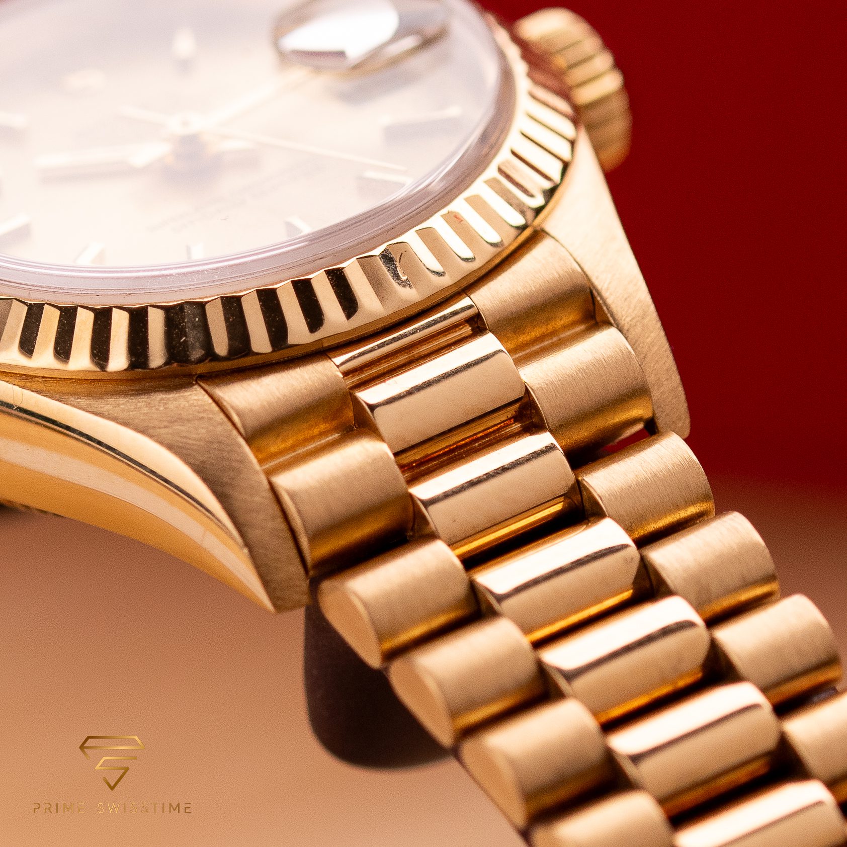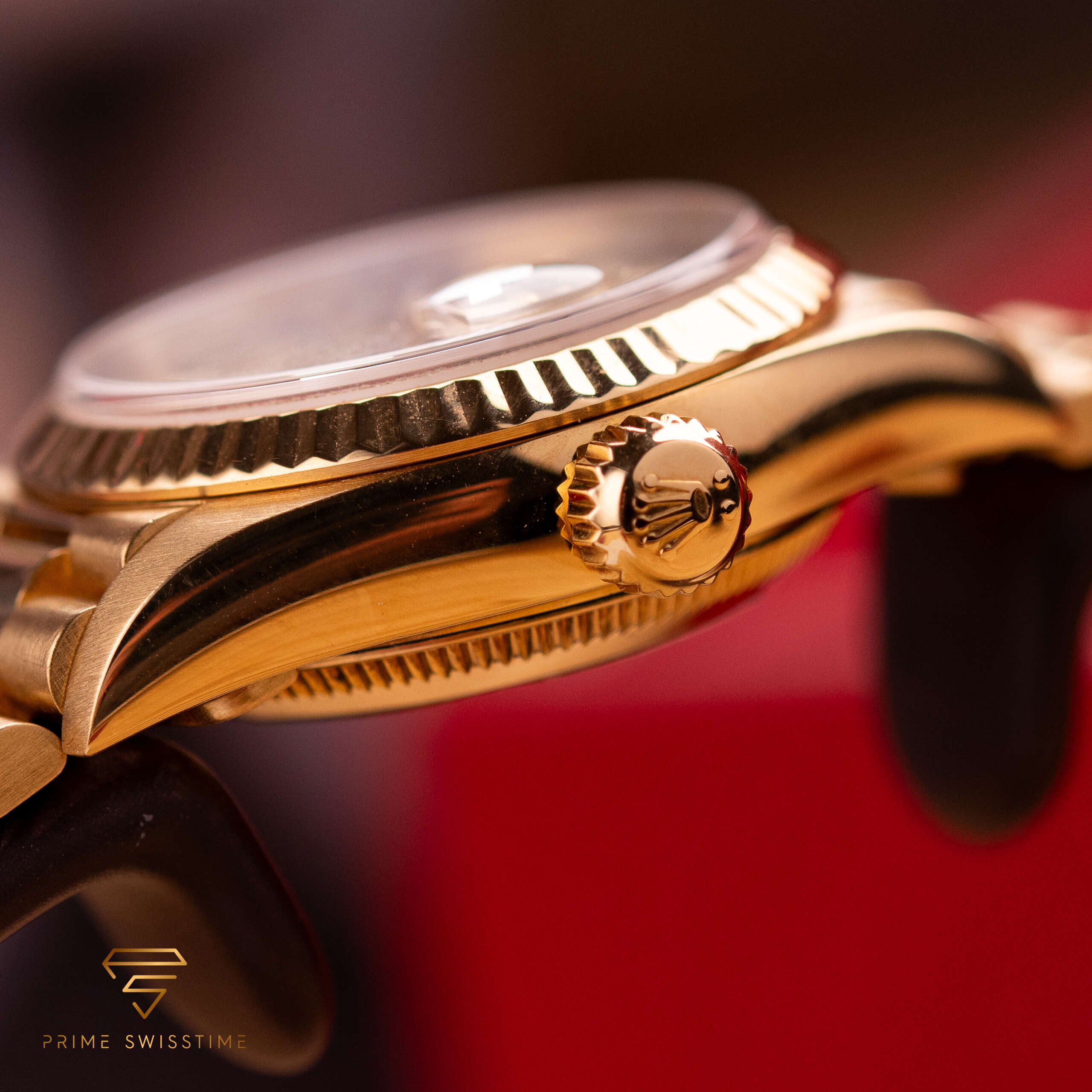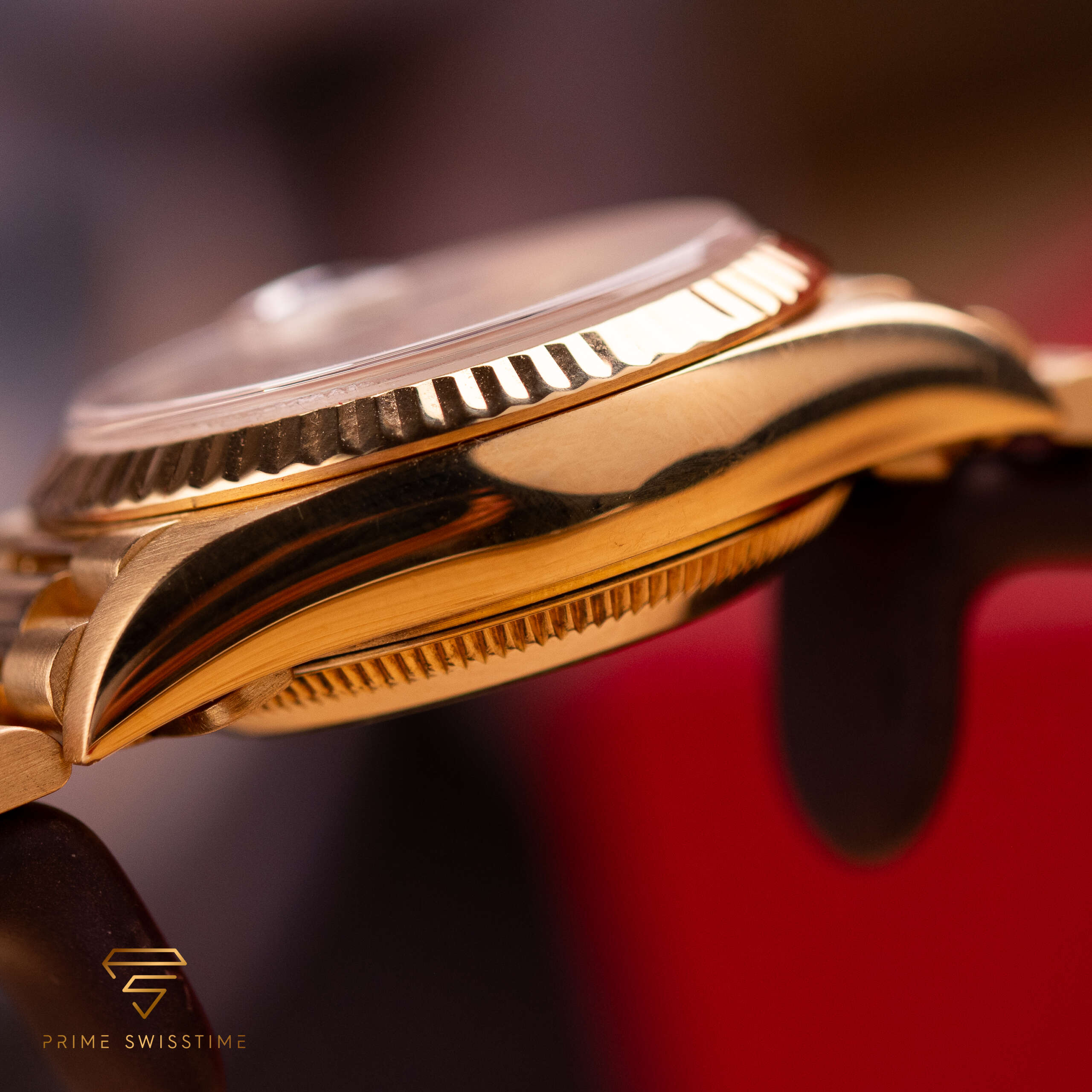 This particular piece, from 1999, features a champagne dial paired with the iconic President bracelet, exuding classic Rolex style. The watch is in excellent condition, freshly serviced, and comes with the original box, making it a standout addition to any collection.