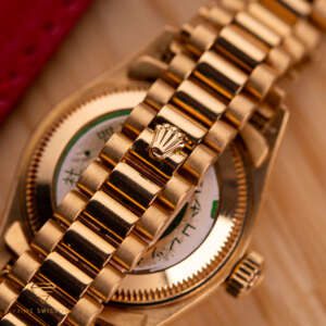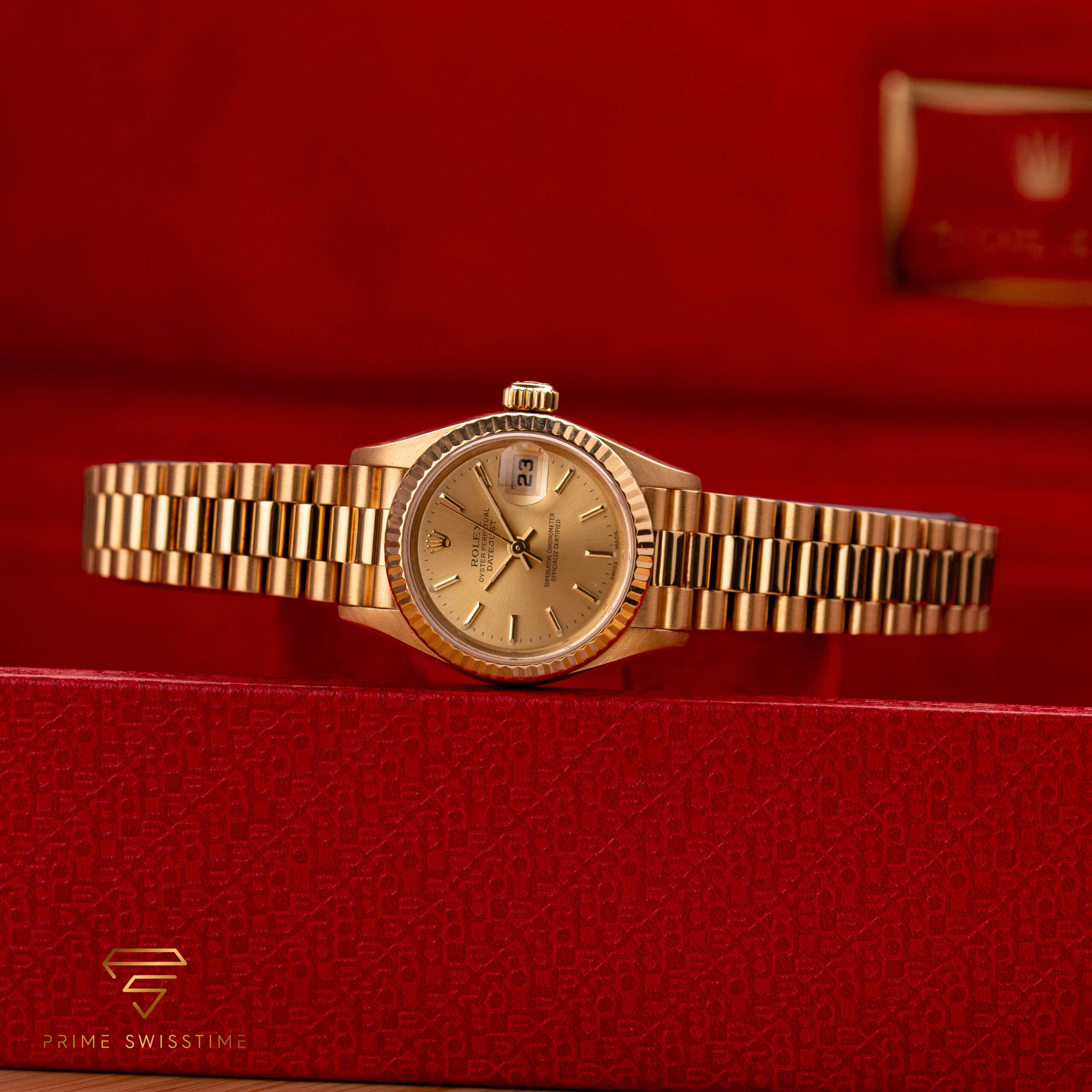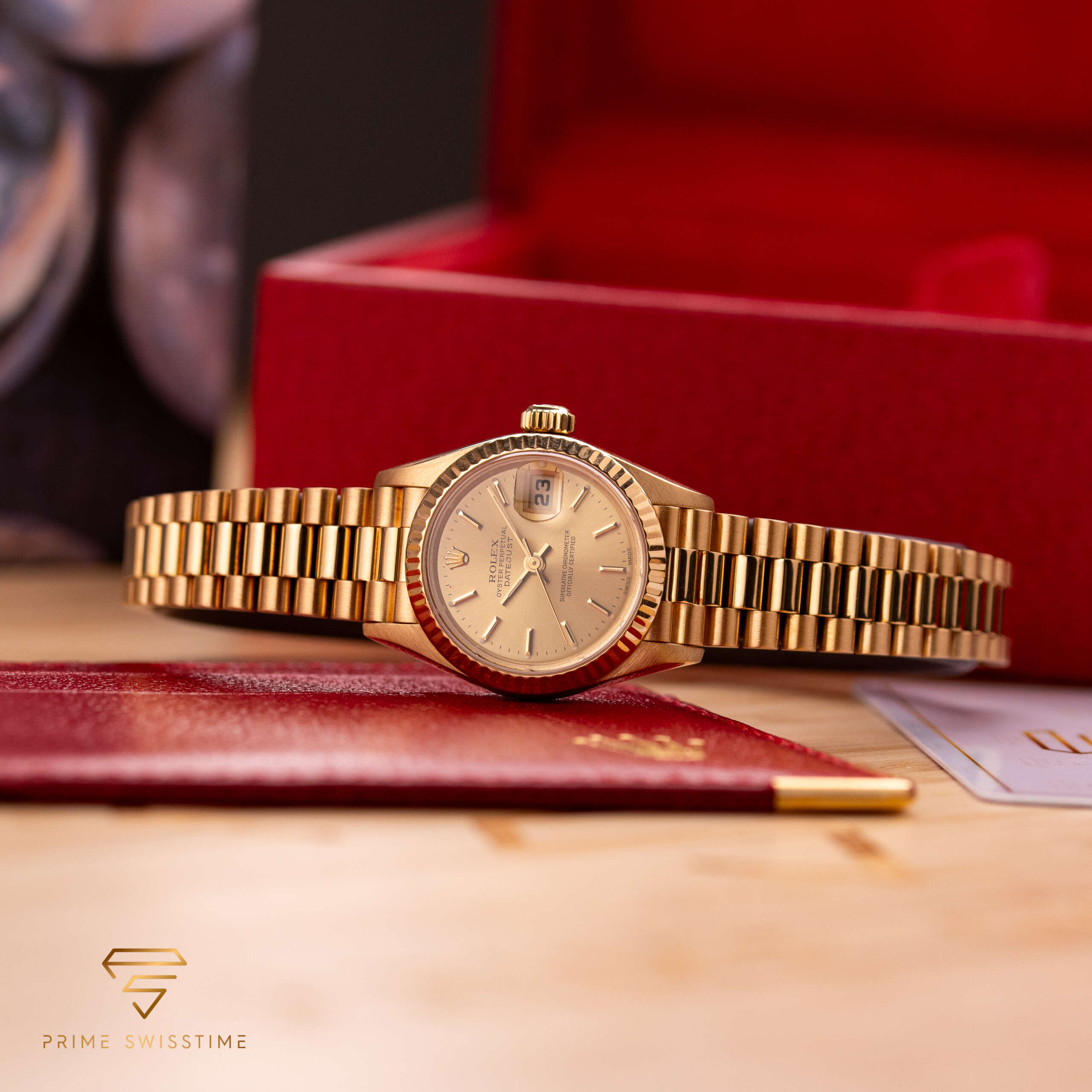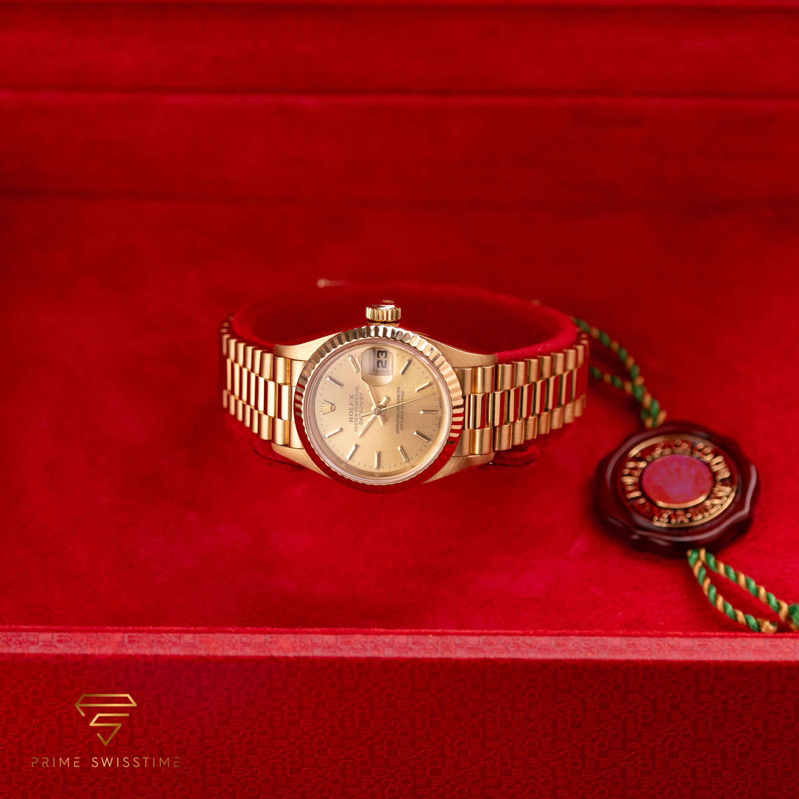 This particular piece, from 1999, features a champagne dial paired with the iconic President bracelet, exuding classic Rolex style. The watch is in excellent condition, freshly serviced, and comes with the original box, making it a standout addition to any collection.