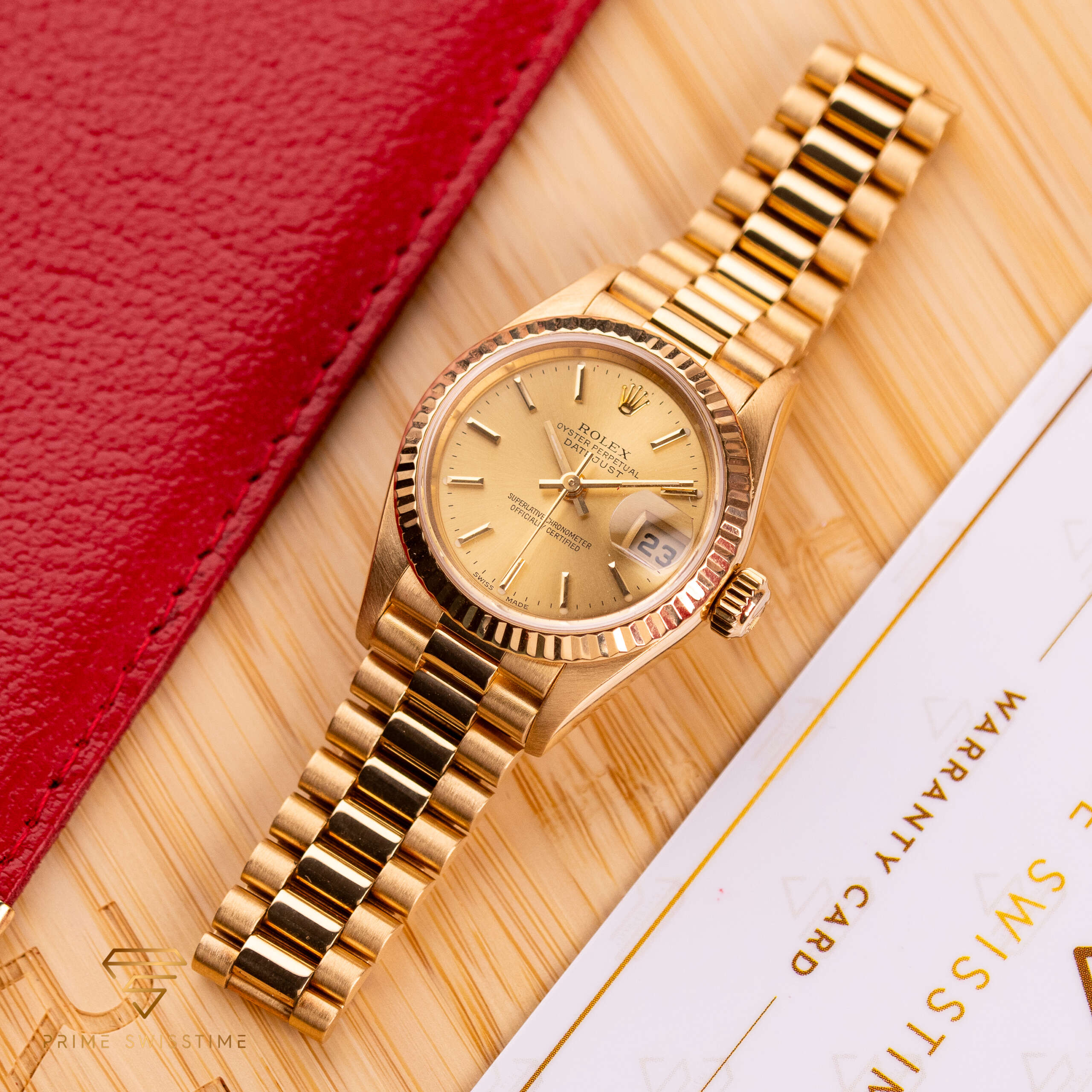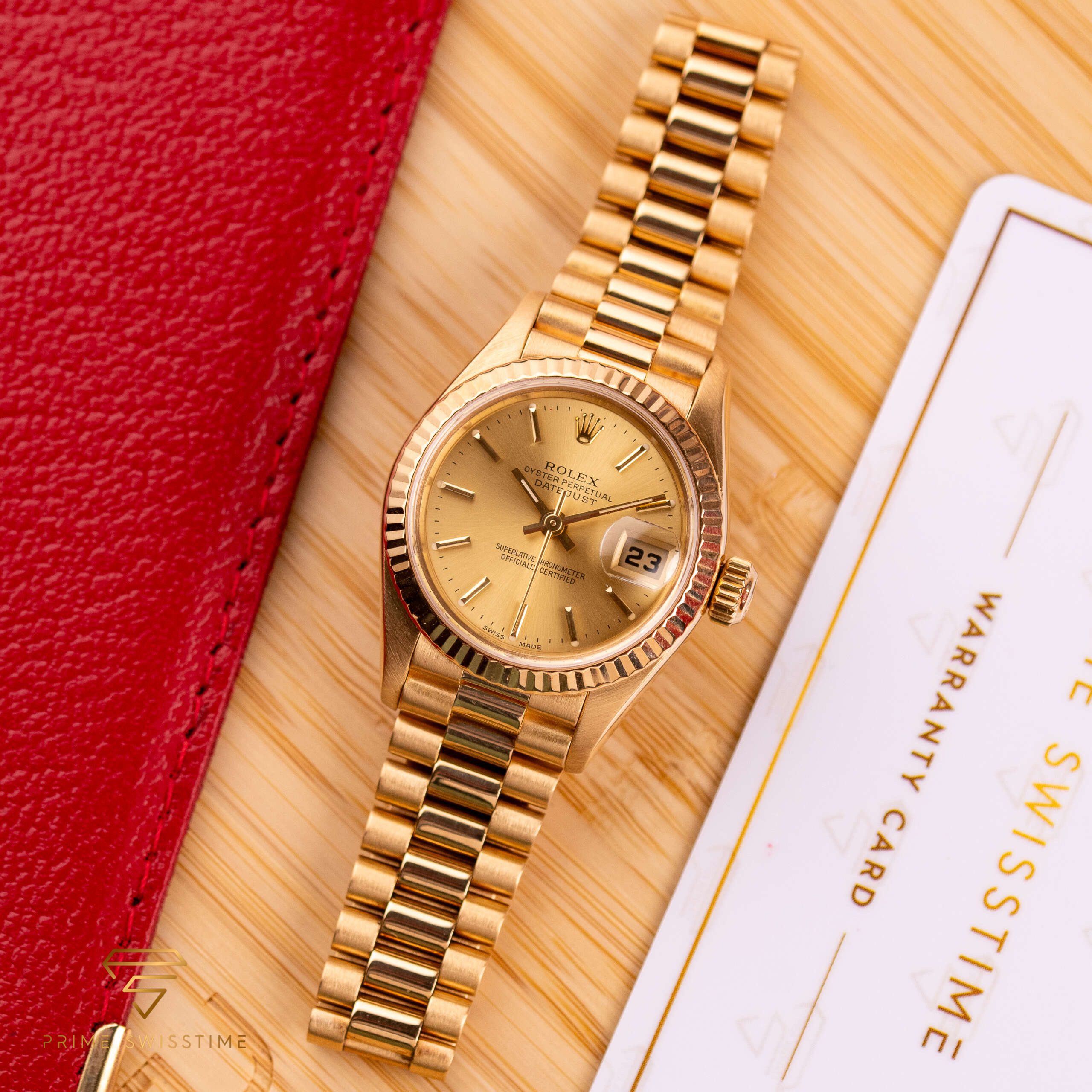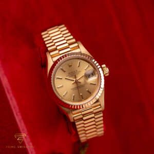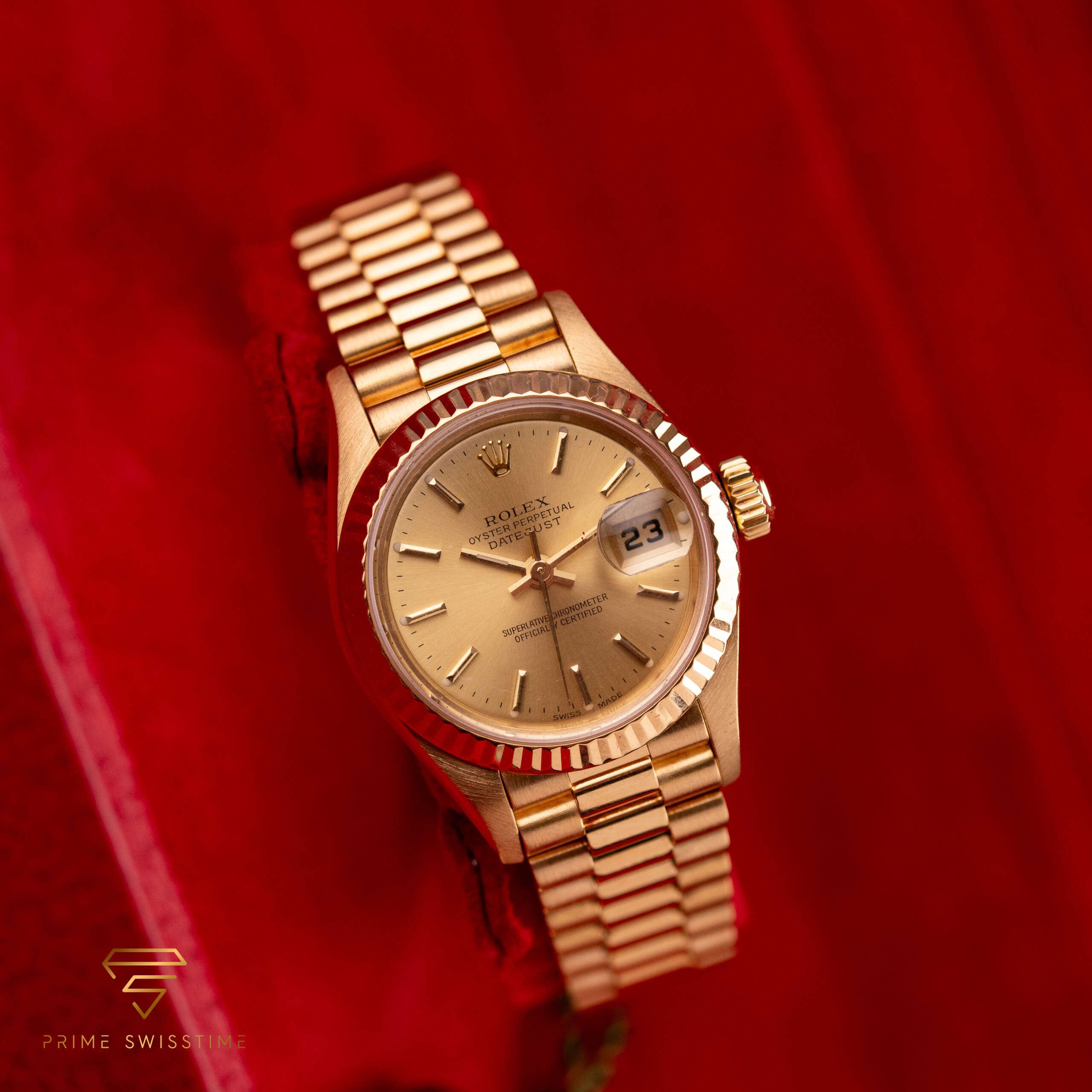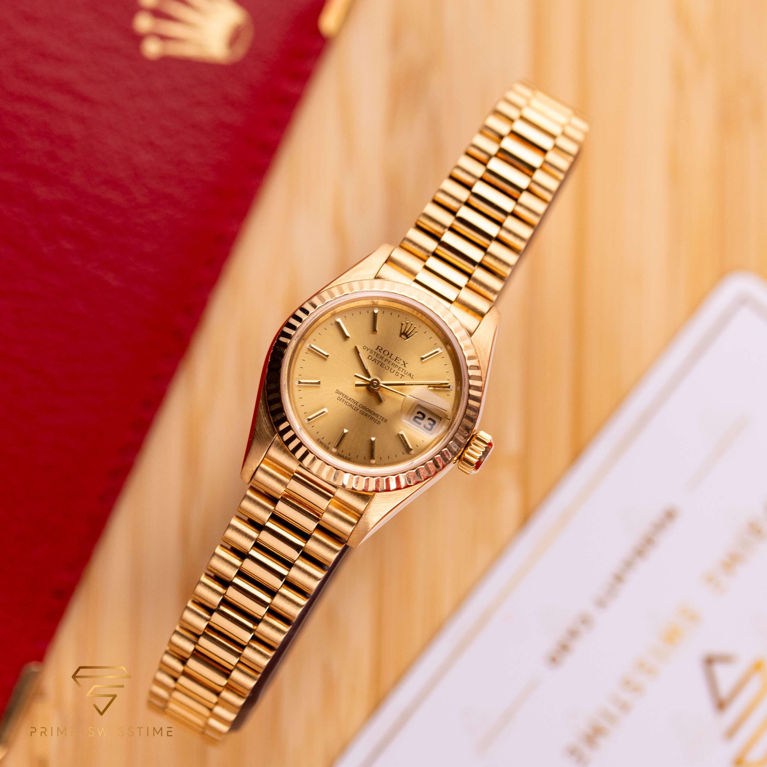 This particular piece, from 1999, features a champagne dial paired with the iconic President bracelet, exuding classic Rolex style. The watch is in excellent condition, freshly serviced, and comes with the original box, making it a standout addition to any collection.
