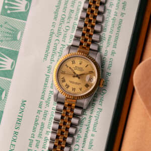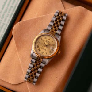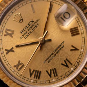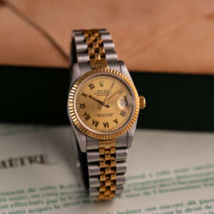 Originally sold in 1999, this example showcases a timeless Champagne Roman dial, with Roman numeral hour markers providing a sophisticated and readable aesthetic. The watch is in very good condition, with a fully functional automatic movement ensuring precise timekeeping. The Jubilee bracelet shows minimal stretch, sized for wrists up to 17 cm, maintaining its structural integrity. Presented as a full set with its original Rolex box and papers, this Datejust is an excellent choice for collectors or those seeking a well-preserved vintage timepiece.