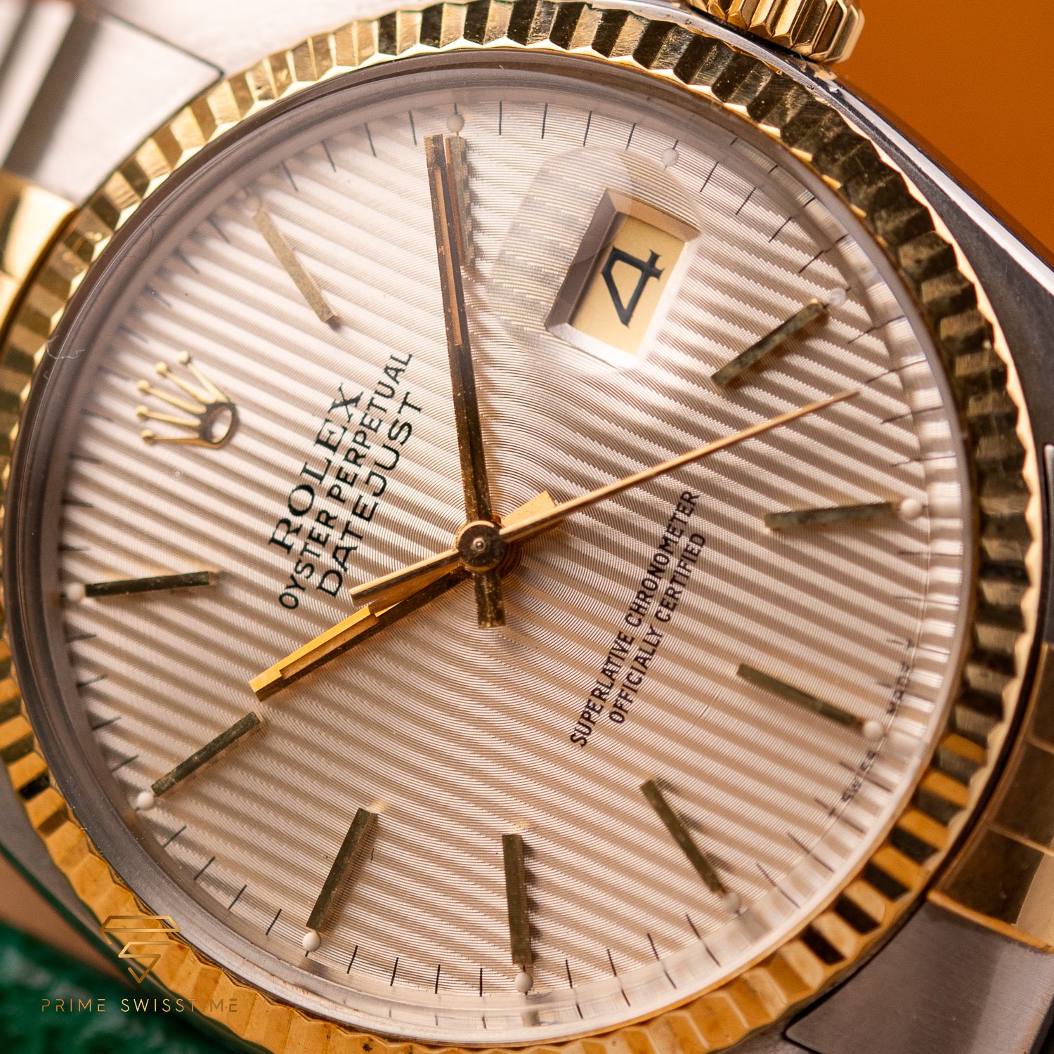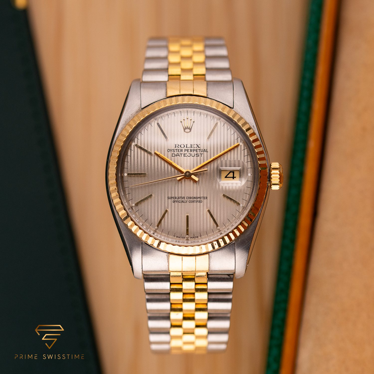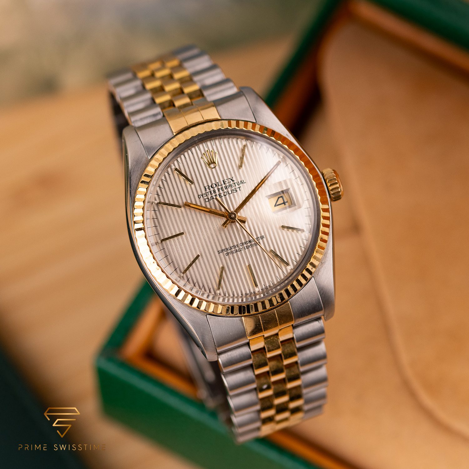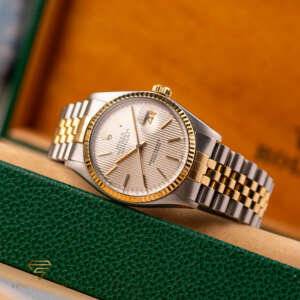 This particular piece, from 1978, features a beautiful Silver Tapestry dial, adding texture and character to the design. The watch has been freshly serviced and comes with the original box, making it a remarkable addition to any collection.