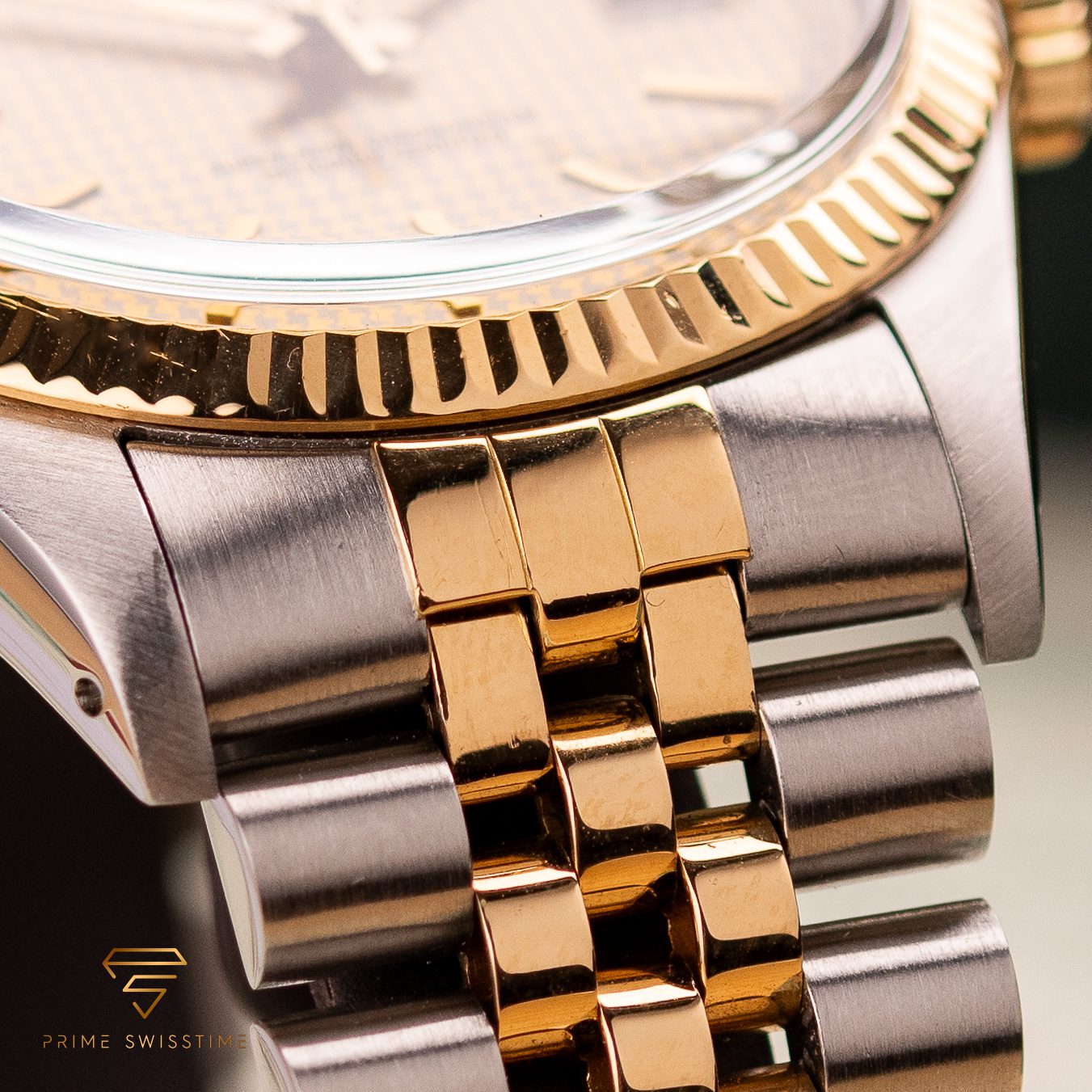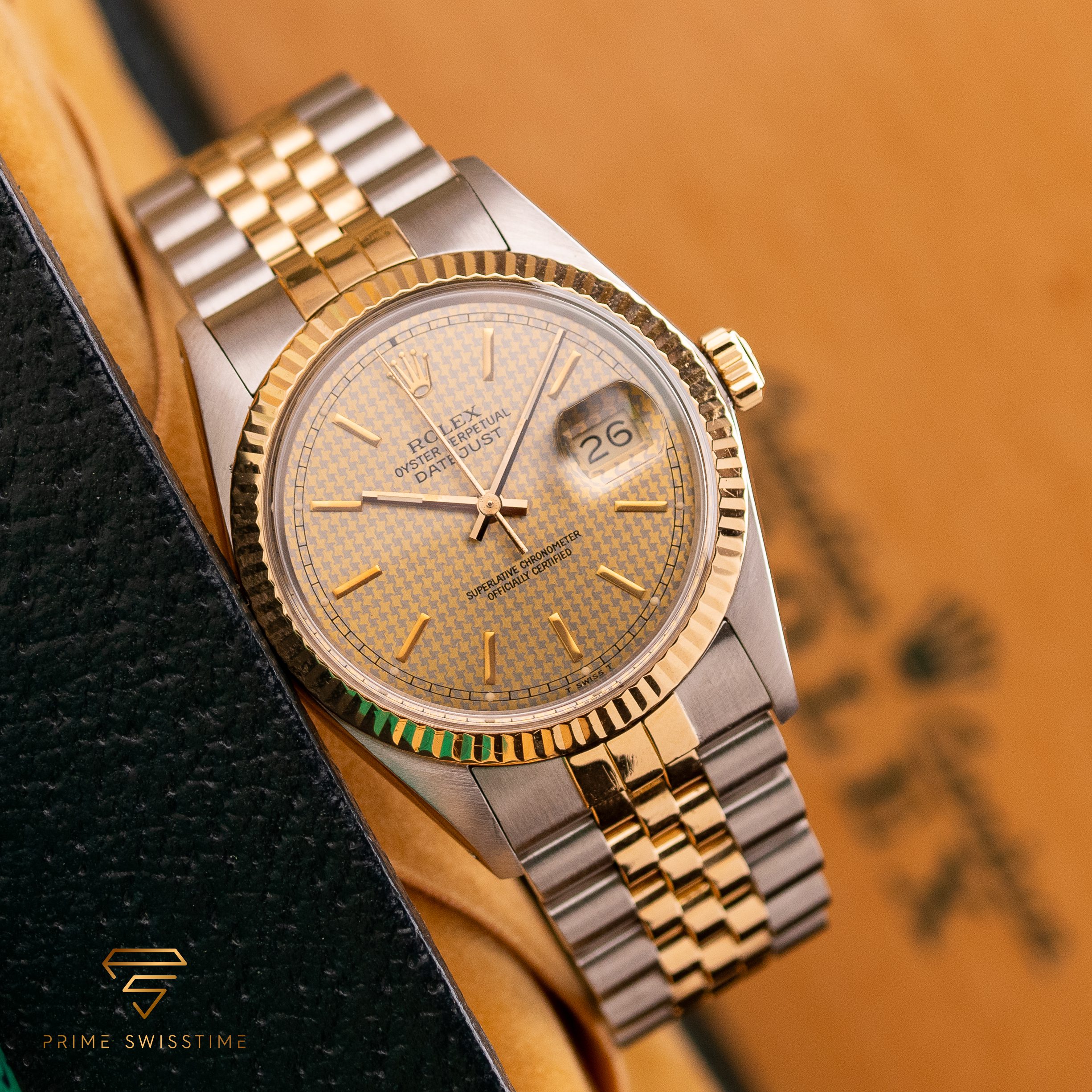 This particular piece, from 1988, features the exceptional Houndstooth dial, adding a unique texture to the watch’s refined look. The timepiece is in excellent condition, freshly serviced, and comes with the original box and papers, making it a great addition to any collection.