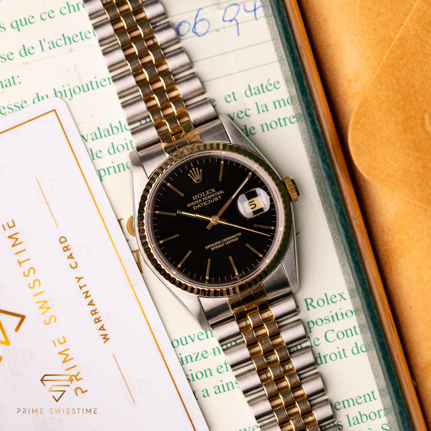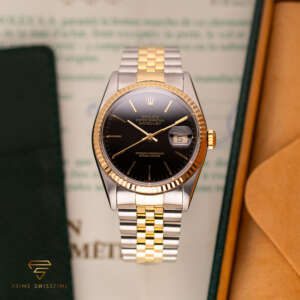 This particular piece, originally sold in 1994, features the sought-after black dial configuration, adding a bold touch to the design. The watch is in very good condition, has been freshly serviced, and comes as a full set with the original box and papers, making it an excellent choice for collectors.