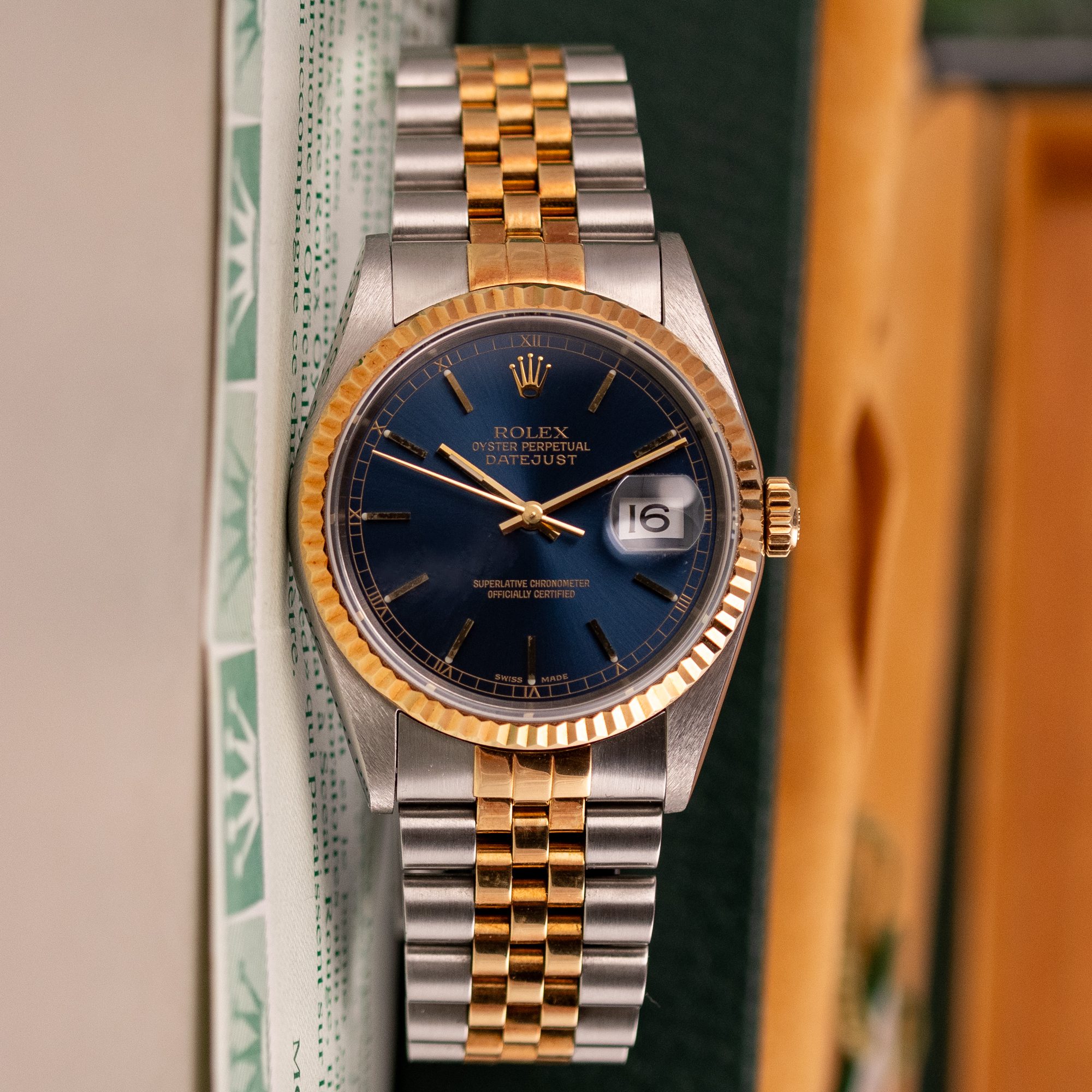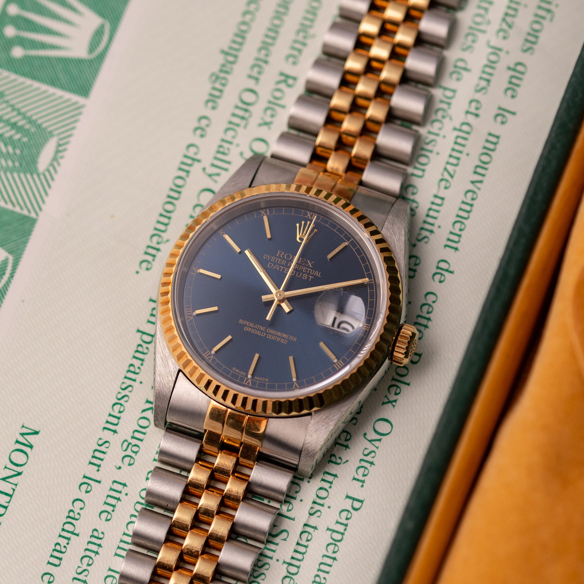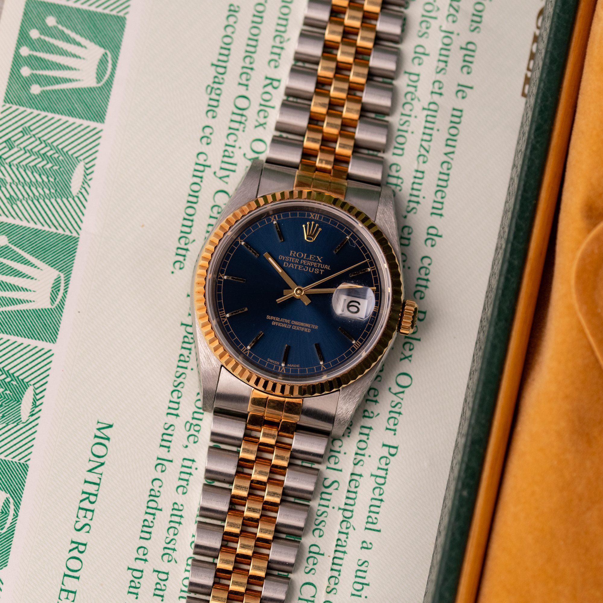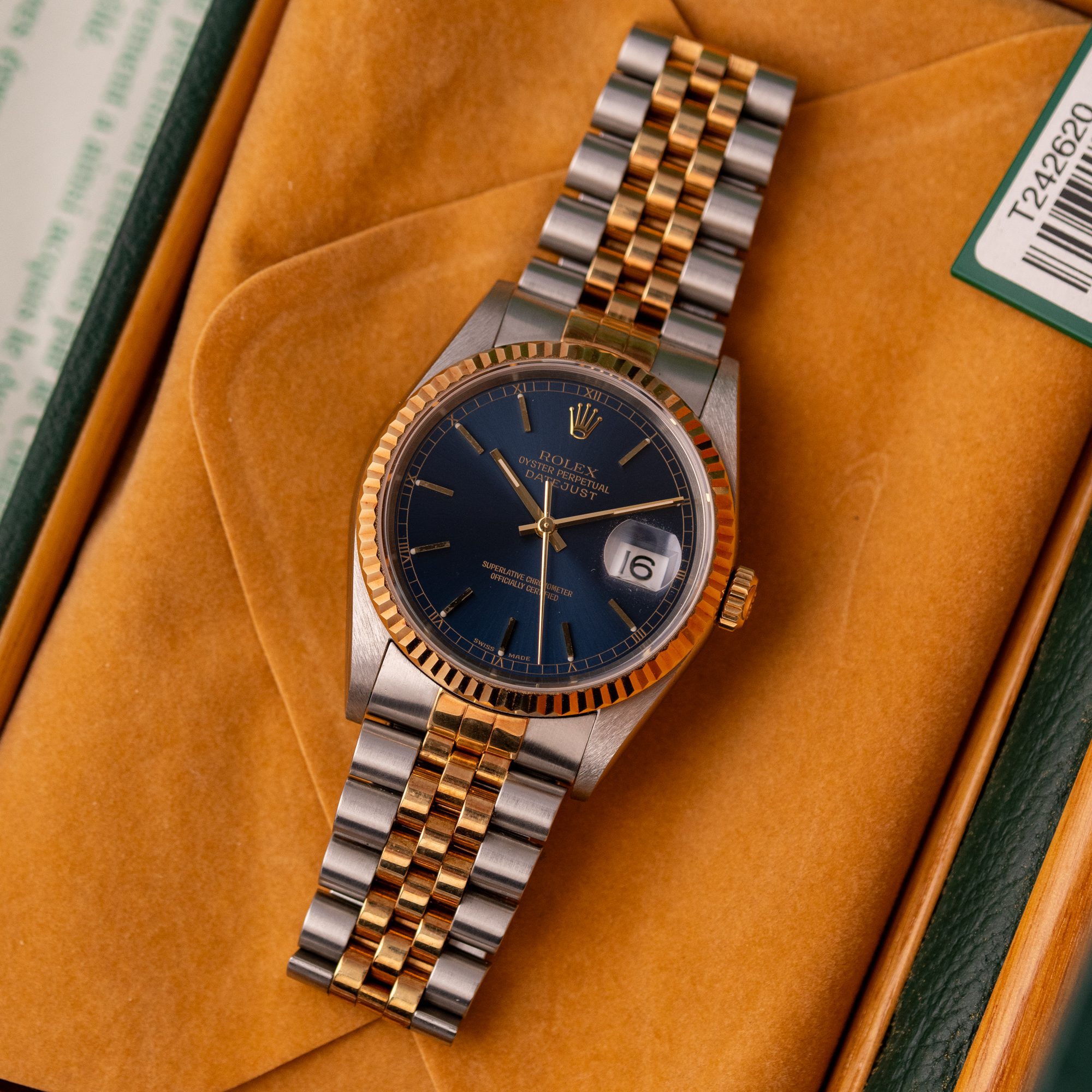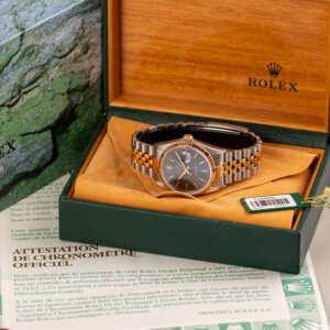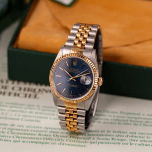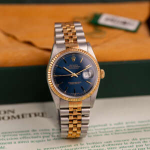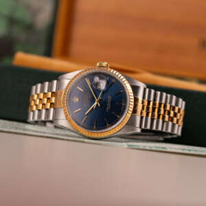 Originally sold in 1998, this example boasts a highly sought-after Blue dial, offering a vibrant and distinctive aesthetic that enhances its collectible appeal. The watch is in very good condition, freshly after a full service to ensure the automatic movement’s full functionality and precise timekeeping. The Jubilee bracelet, sized for wrists up to 18 cm, exhibits minimal stretch, preserving its structural integrity. Presented as a full set with its original Rolex box and papers, this Datejust is an excellent choice for collectors or those seeking a well-maintained vintage timepiece.