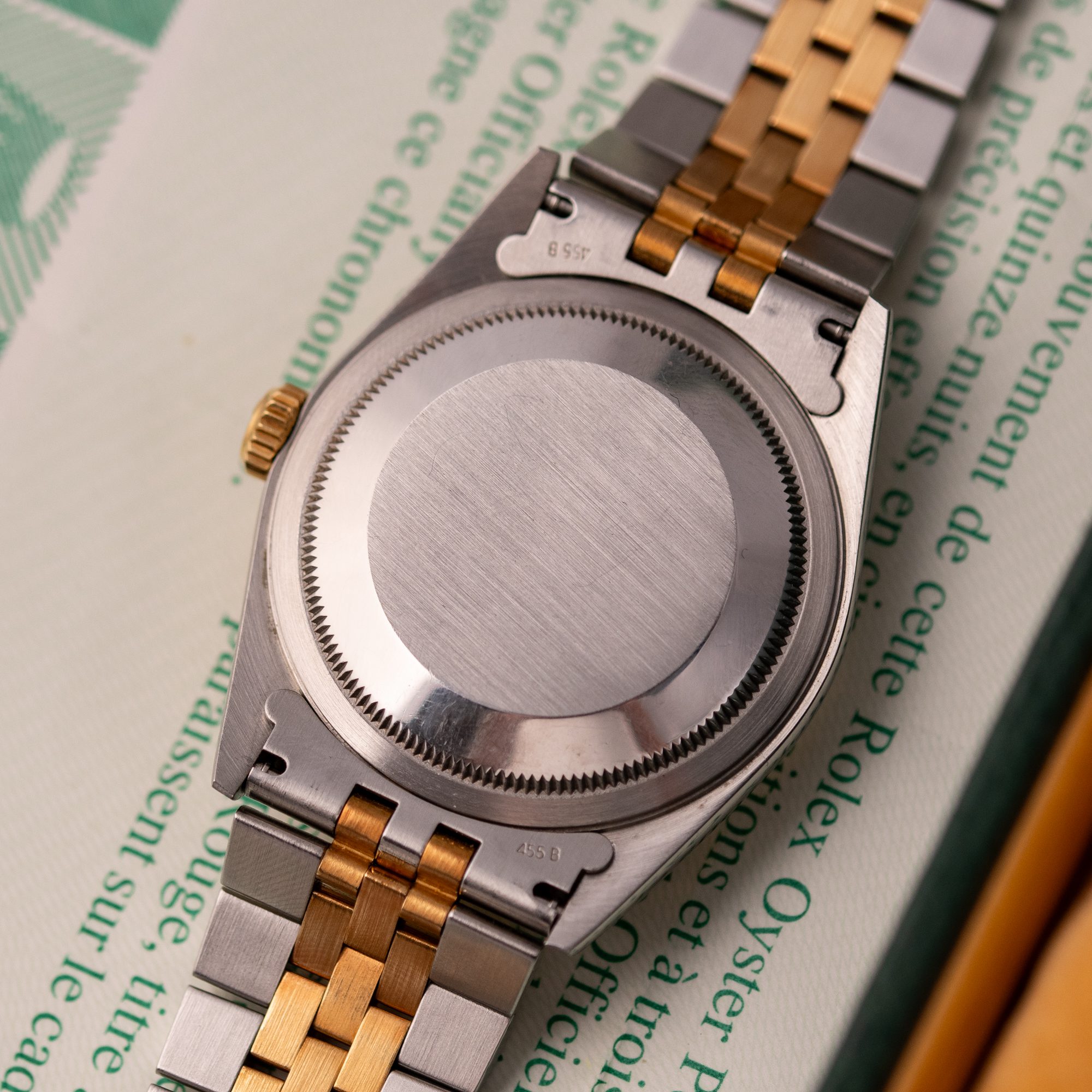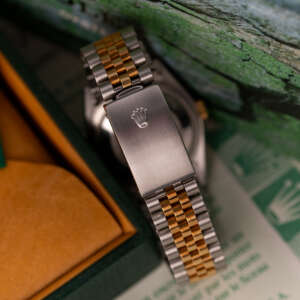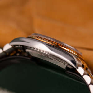 The Rolex Datejust 36, ref. 16233, crafted in stainless steel and yellow gold, features a 36mm case with a fluted bezel, representing a classic two-tone design that integrates timeless sophistication with practical versatility, including a date function at the 3 o’clock position magnified by a Cyclops lens, making it suitable for both formal environments and everyday wear.