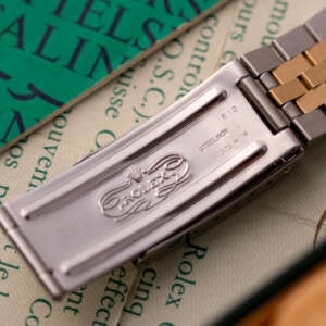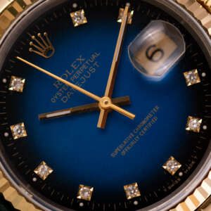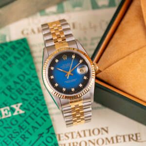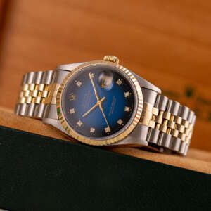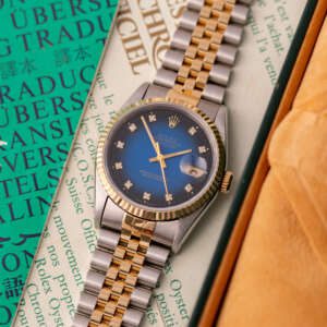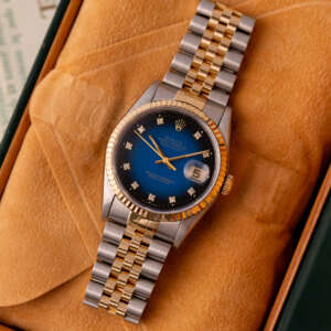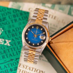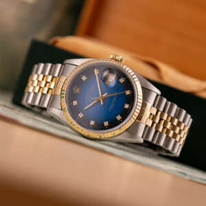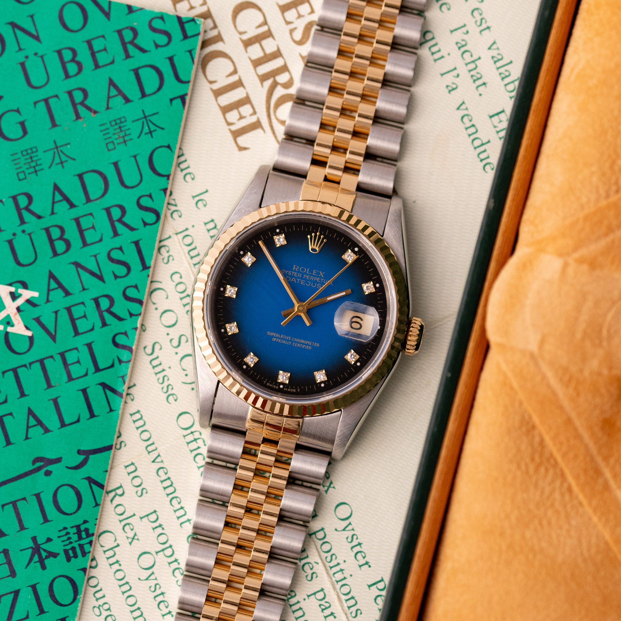 This particular piece, originally sold in 1992, features a stunning and very rare Blue Vignette Diamond dial that adds a captivating sparkle and depth to its refined aesthetic. The watch is in very good condition, with a mechanically fully functional movement and a stretch-free bracelet sized for wrists up to 18 cm. Presented as a full set with the original Rolex box and papers, this Datejust is an exceptional find for collectors or those seeking a distinctive vintage timepiece for everyday wear.