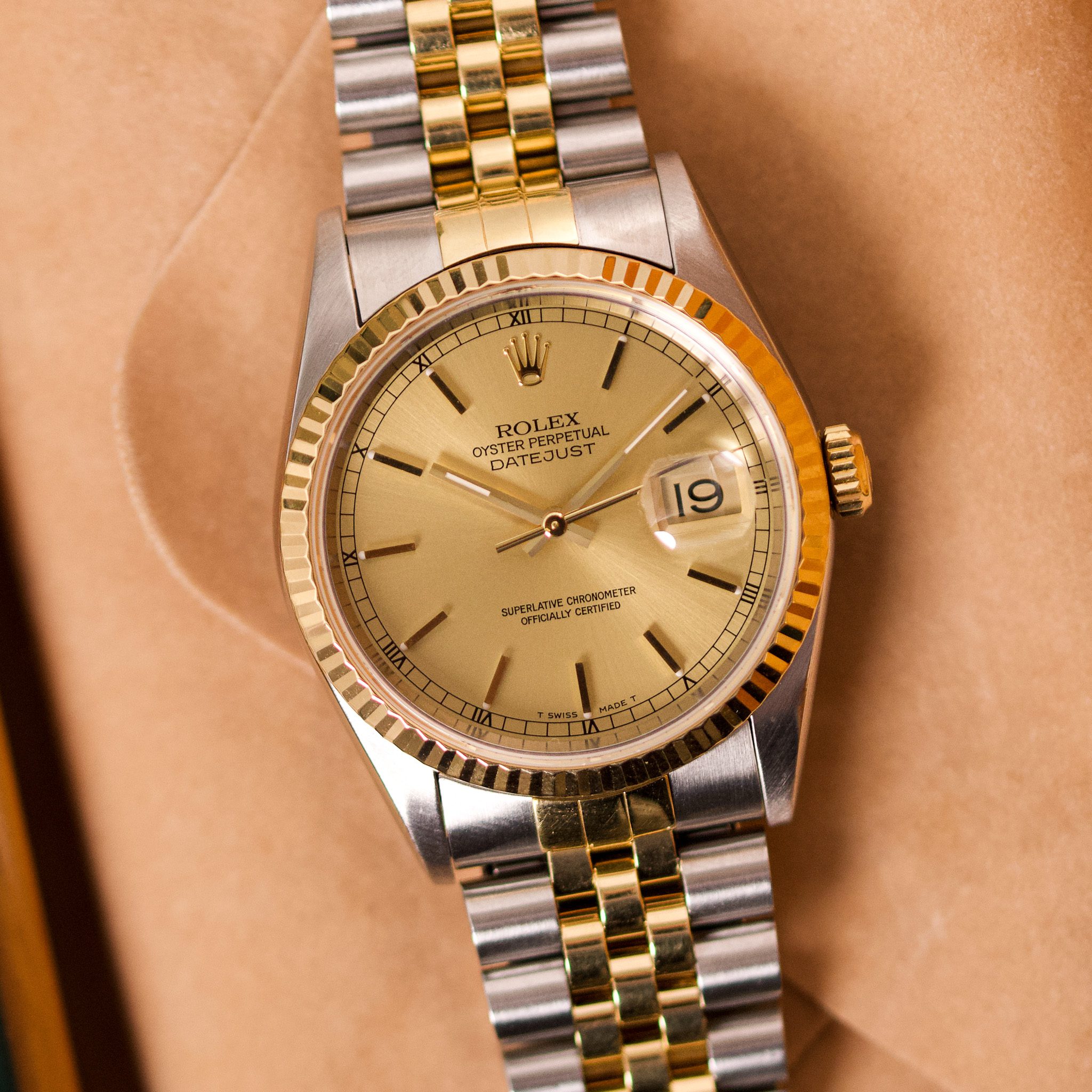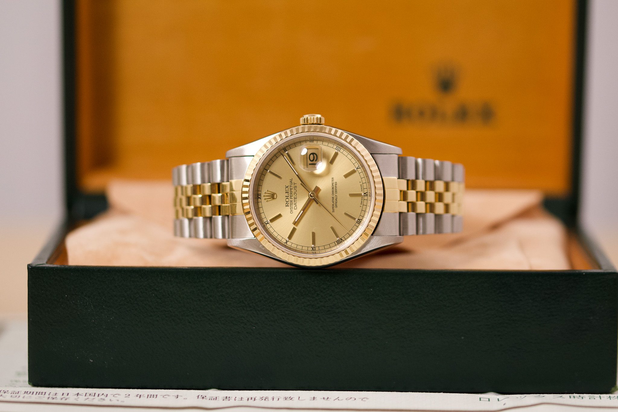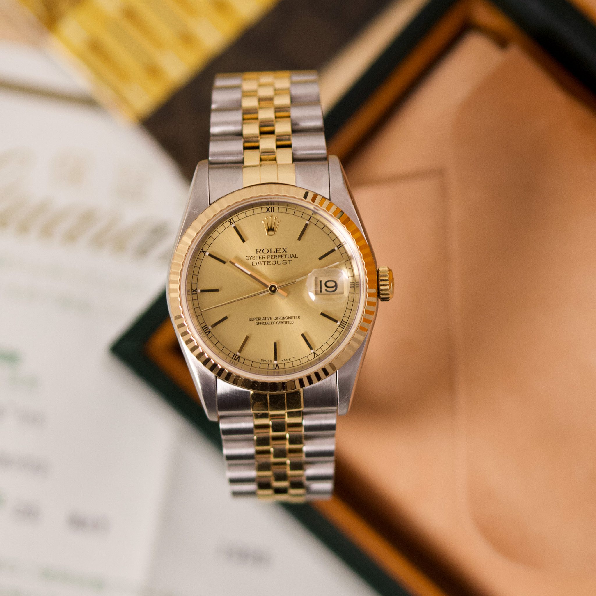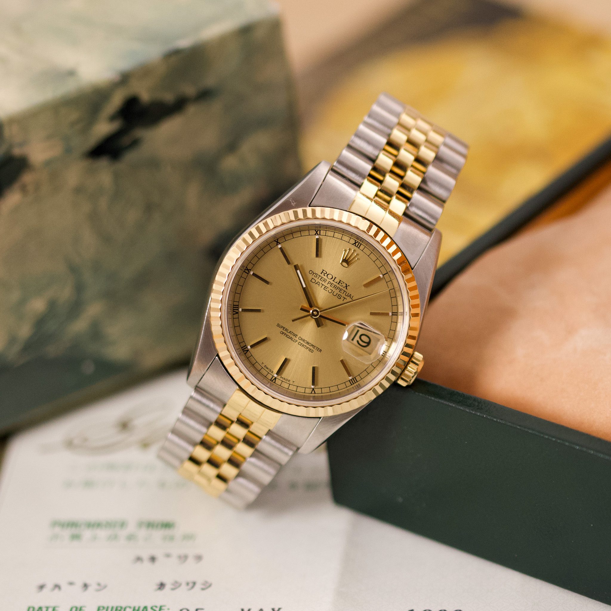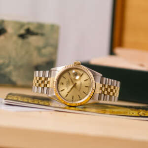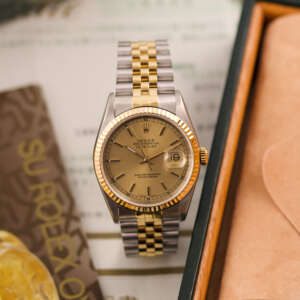 Originally sold in 1999, this example showcases a refined Champagne dial, providing a warm and elegant aesthetic that enhances its classic appeal. The watch was serviced in 2026 and it is in very good condition. The Jubilee bracelet, sized for wrists up to 18 cm, exhibits very light stretch, maintaining its structural integrity. Presented as a full set with its original Rolex box and papers, this Datejust is an excellent choice for collectors or those seeking a well-preserved vintage timepiece.