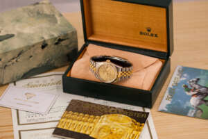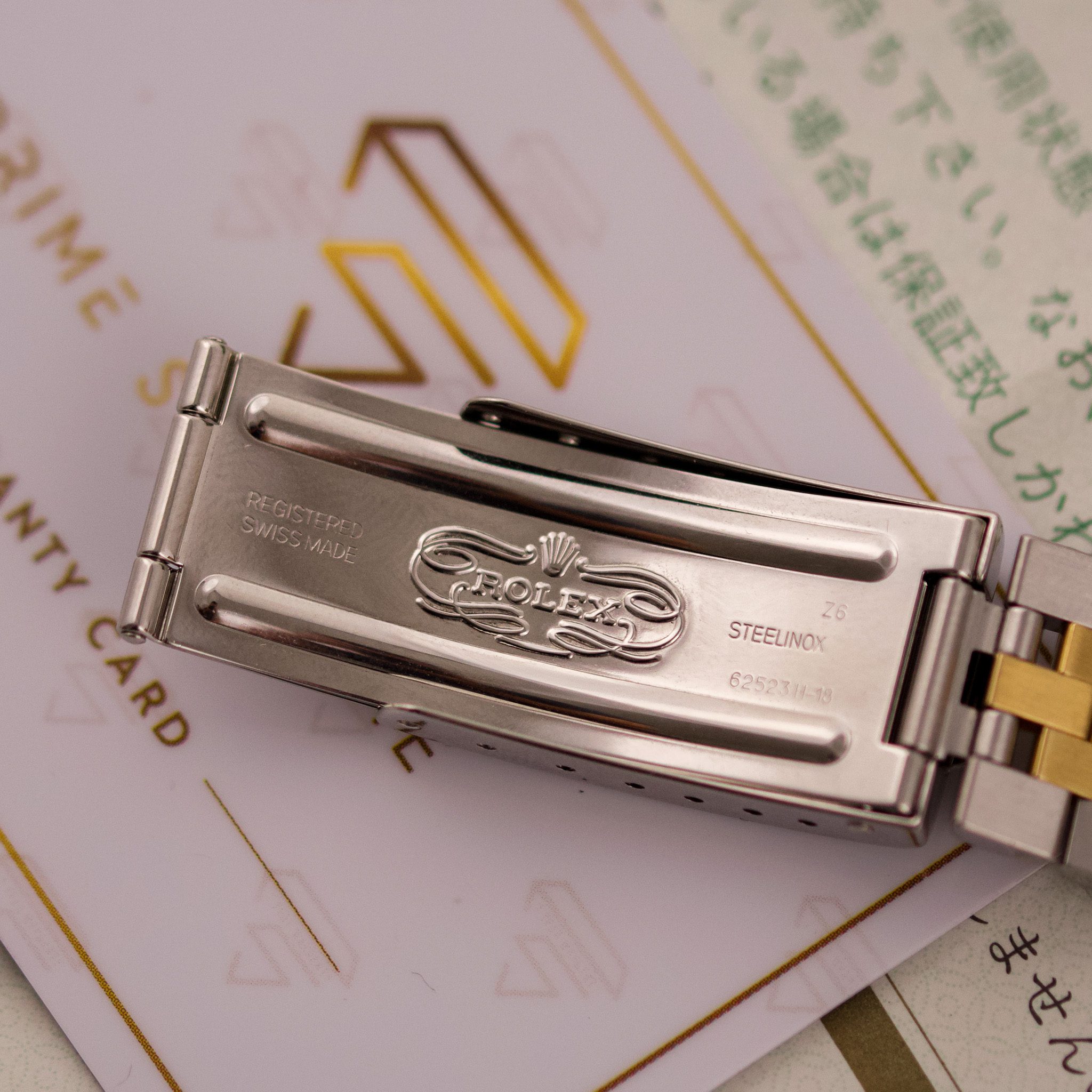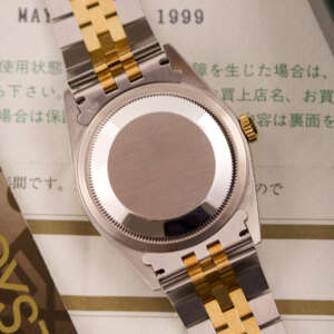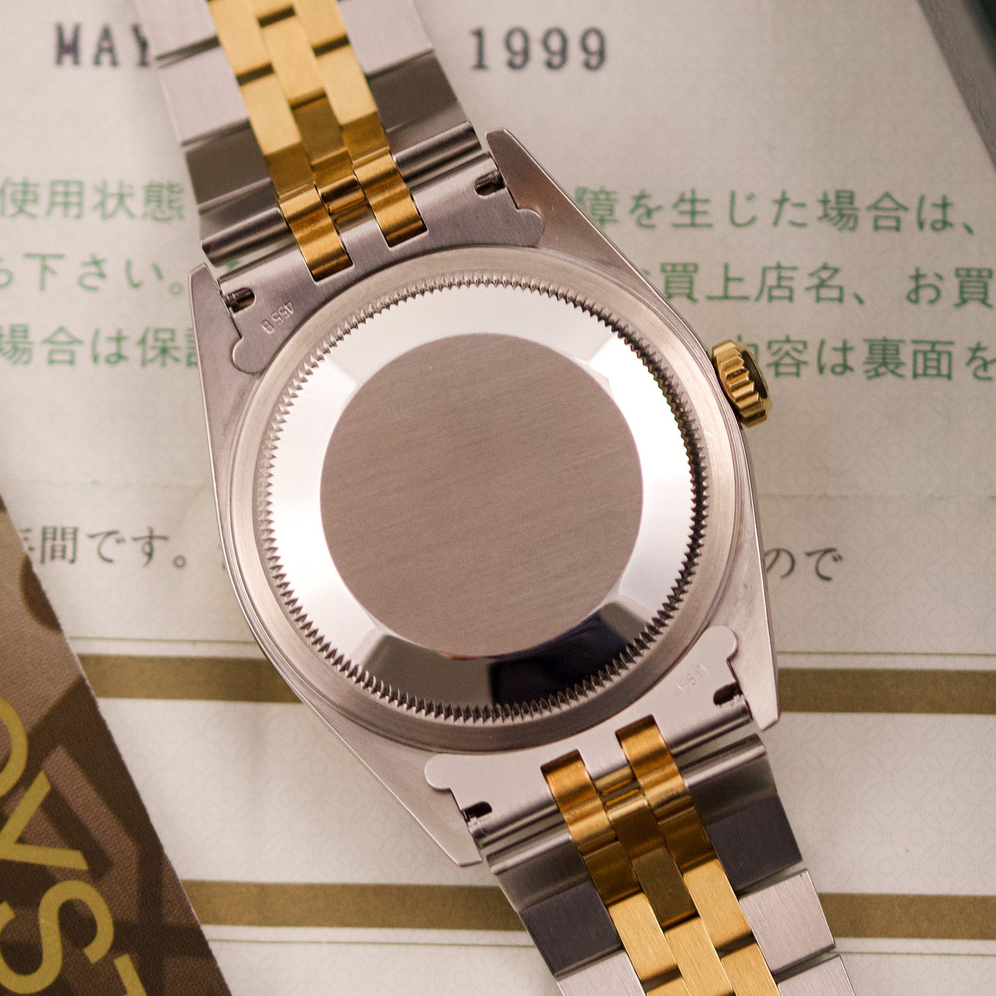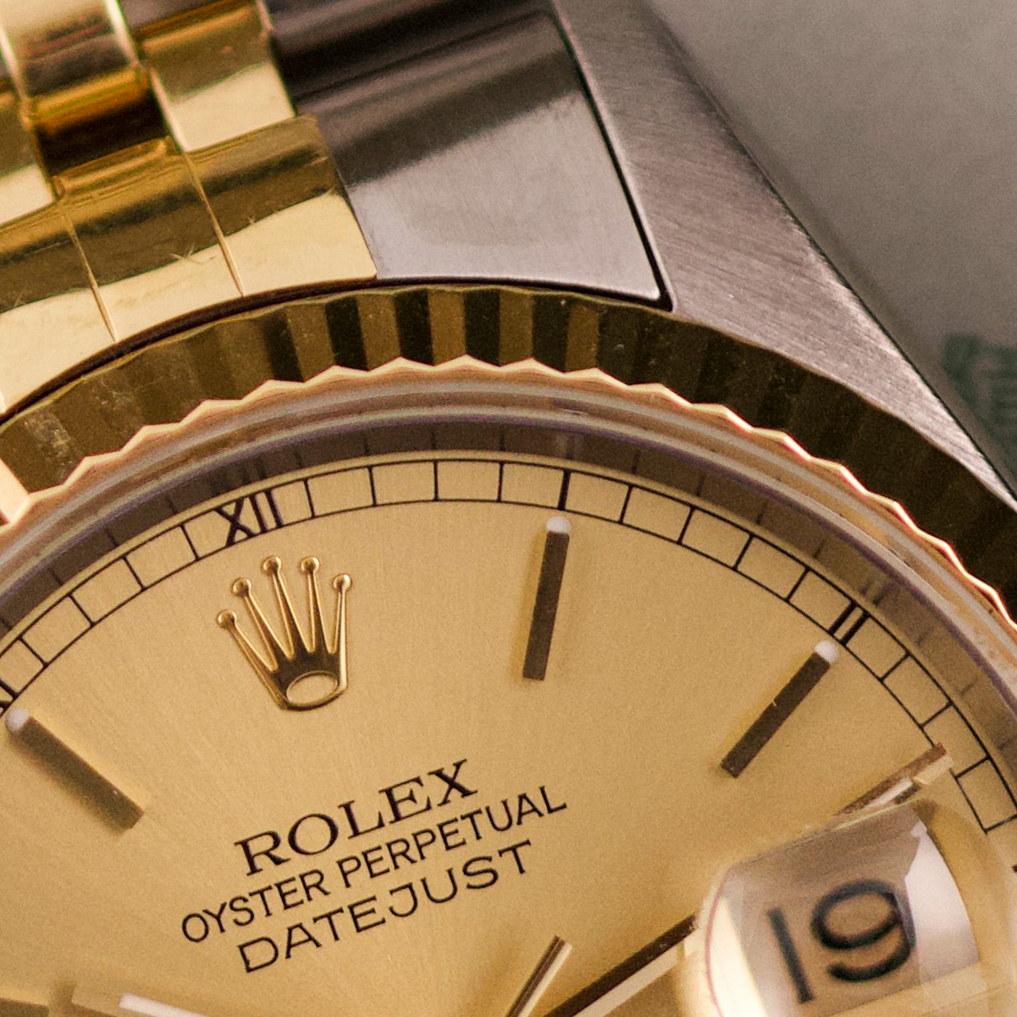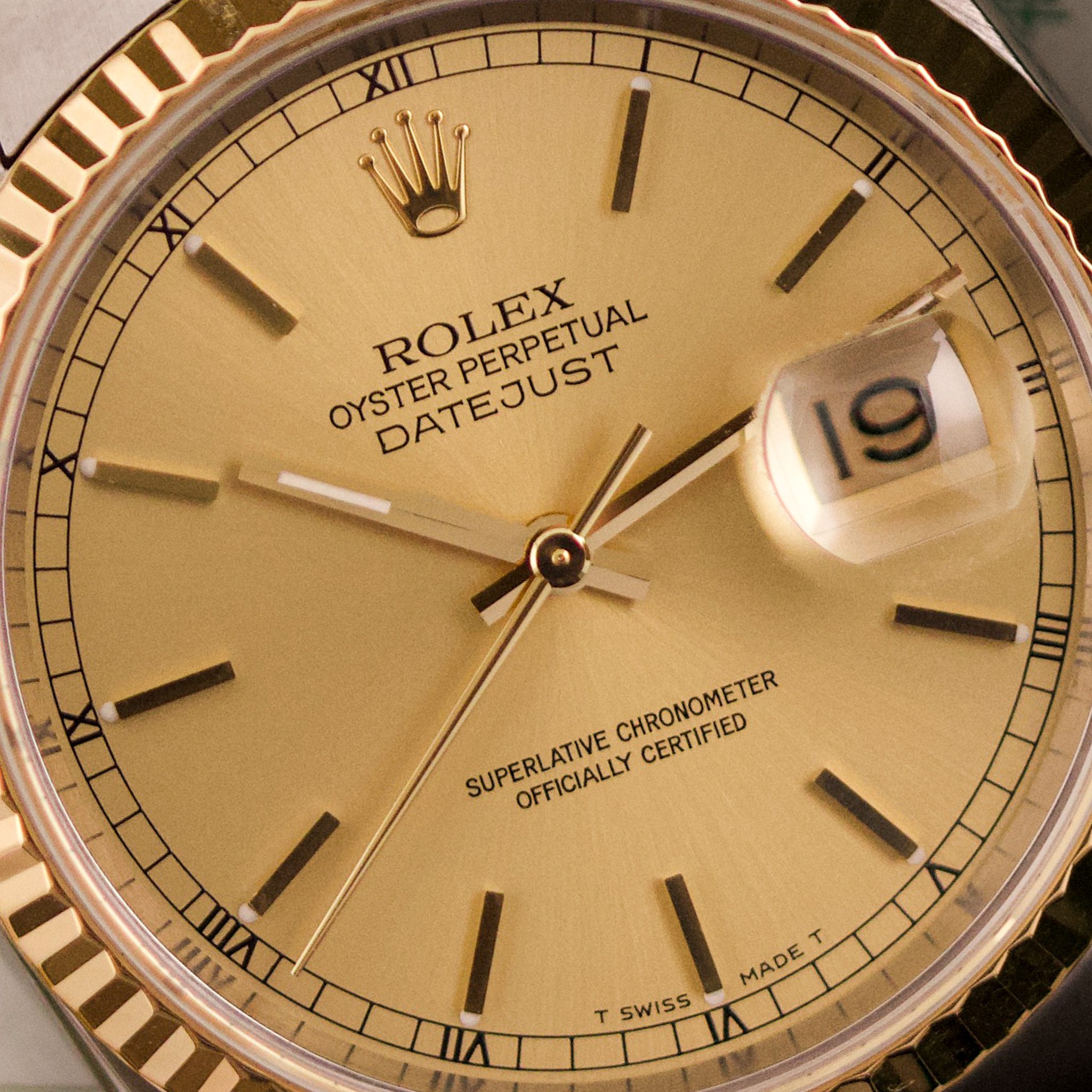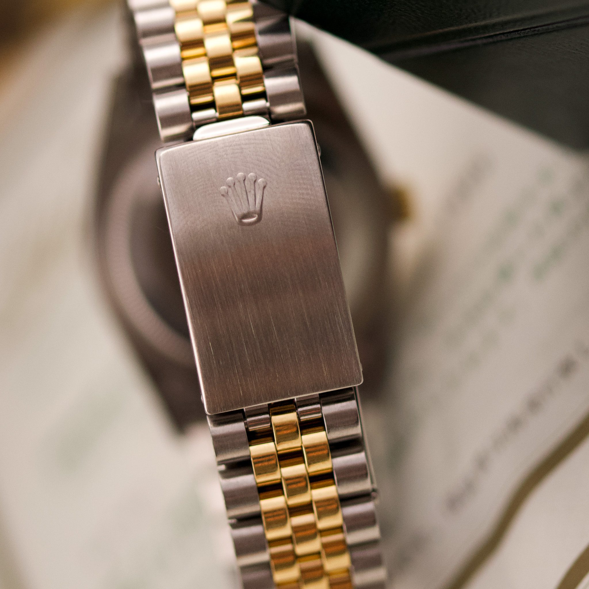 Originally sold in 1999, this example showcases a refined Champagne dial, providing a warm and elegant aesthetic that enhances its classic appeal. The watch was serviced in 2026 and it is in very good condition. The Jubilee bracelet, sized for wrists up to 18 cm, exhibits very light stretch, maintaining its structural integrity. Presented as a full set with its original Rolex box and papers, this Datejust is an excellent choice for collectors or those seeking a well-preserved vintage timepiece.
