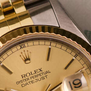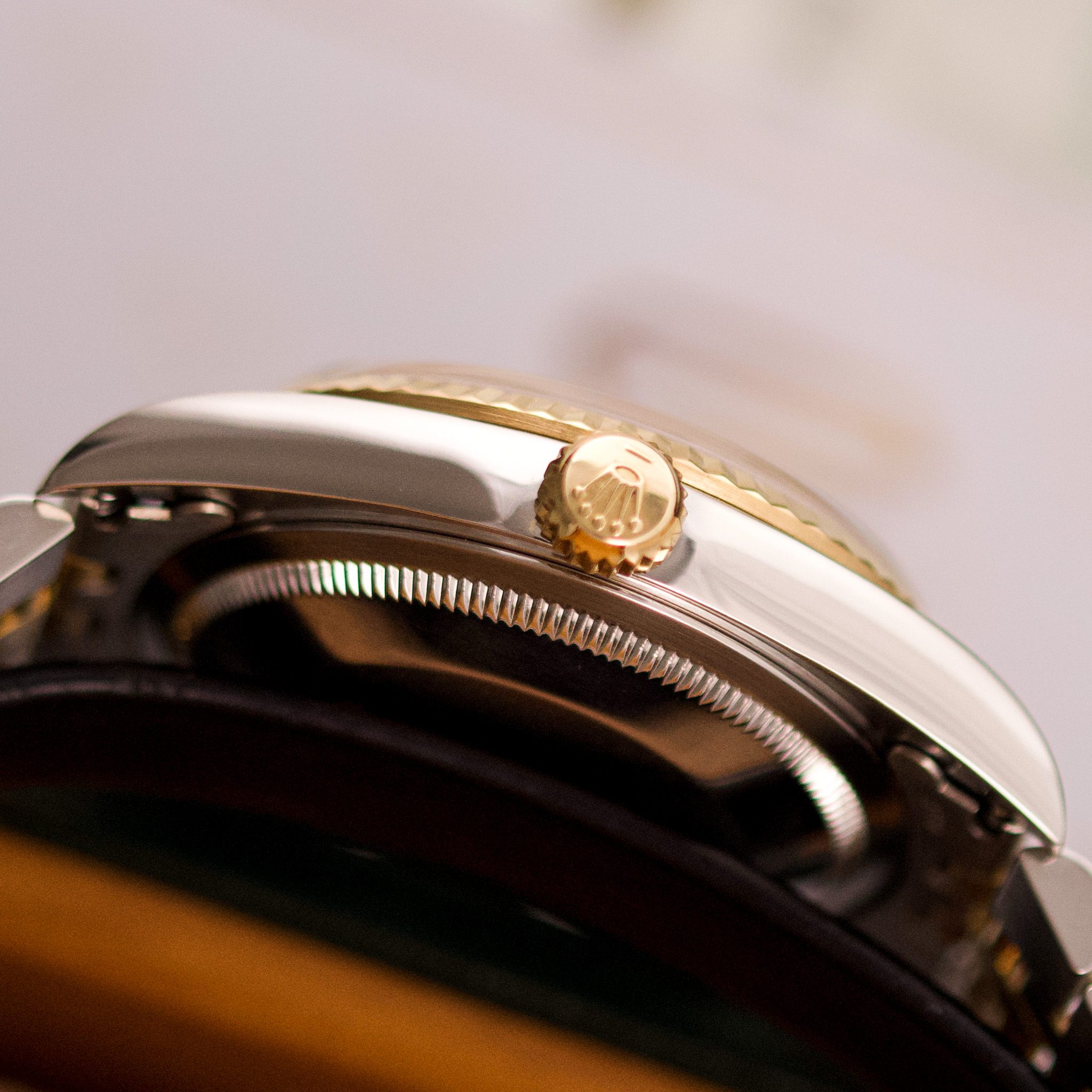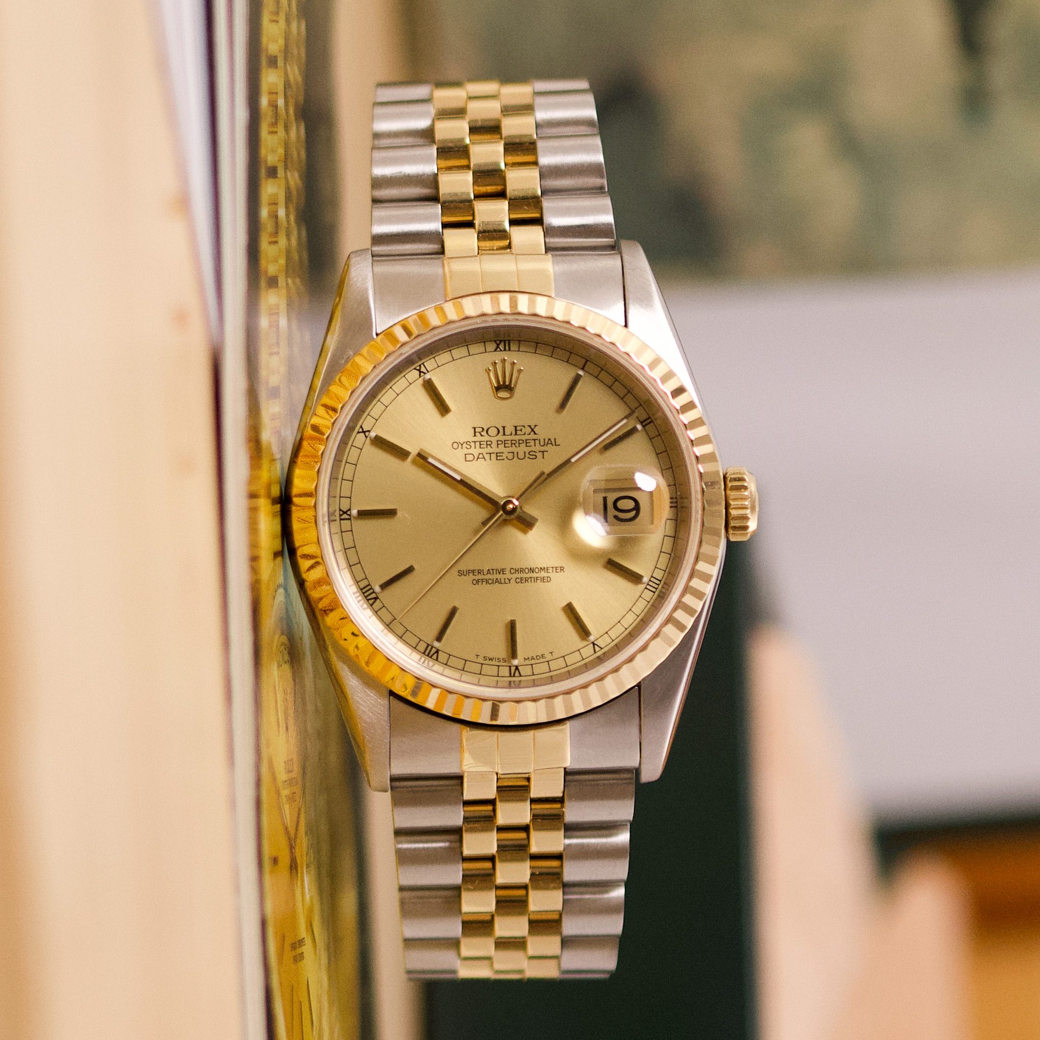 The Rolex Datejust 36, ref. 16233, crafted in stainless steel and yellow gold, features a 36mm case with a fluted bezel, offering a classic two-tone design that combines timeless sophistication with versatile wearability, suitable for both formal occasions and daily use.