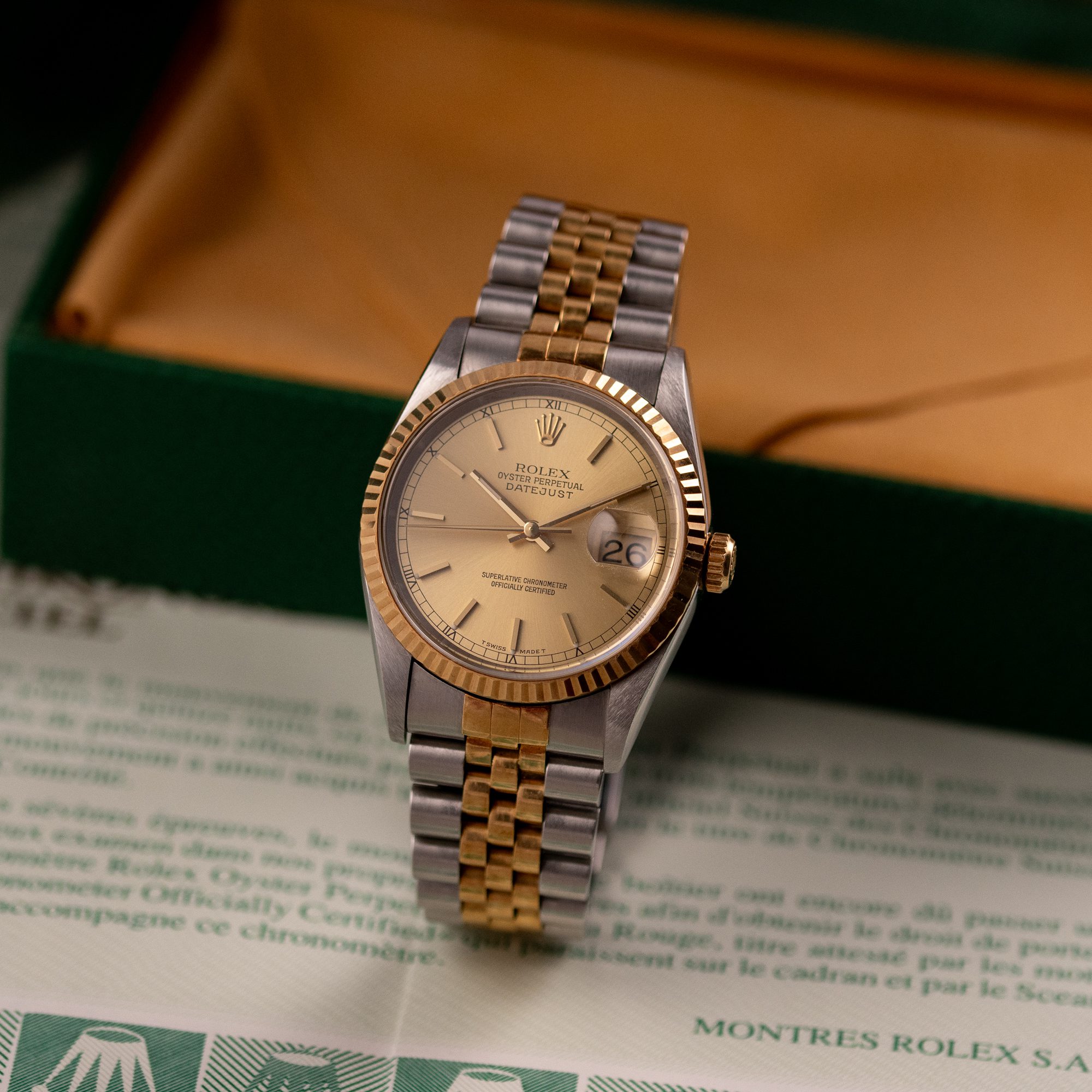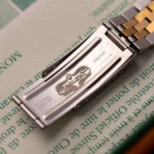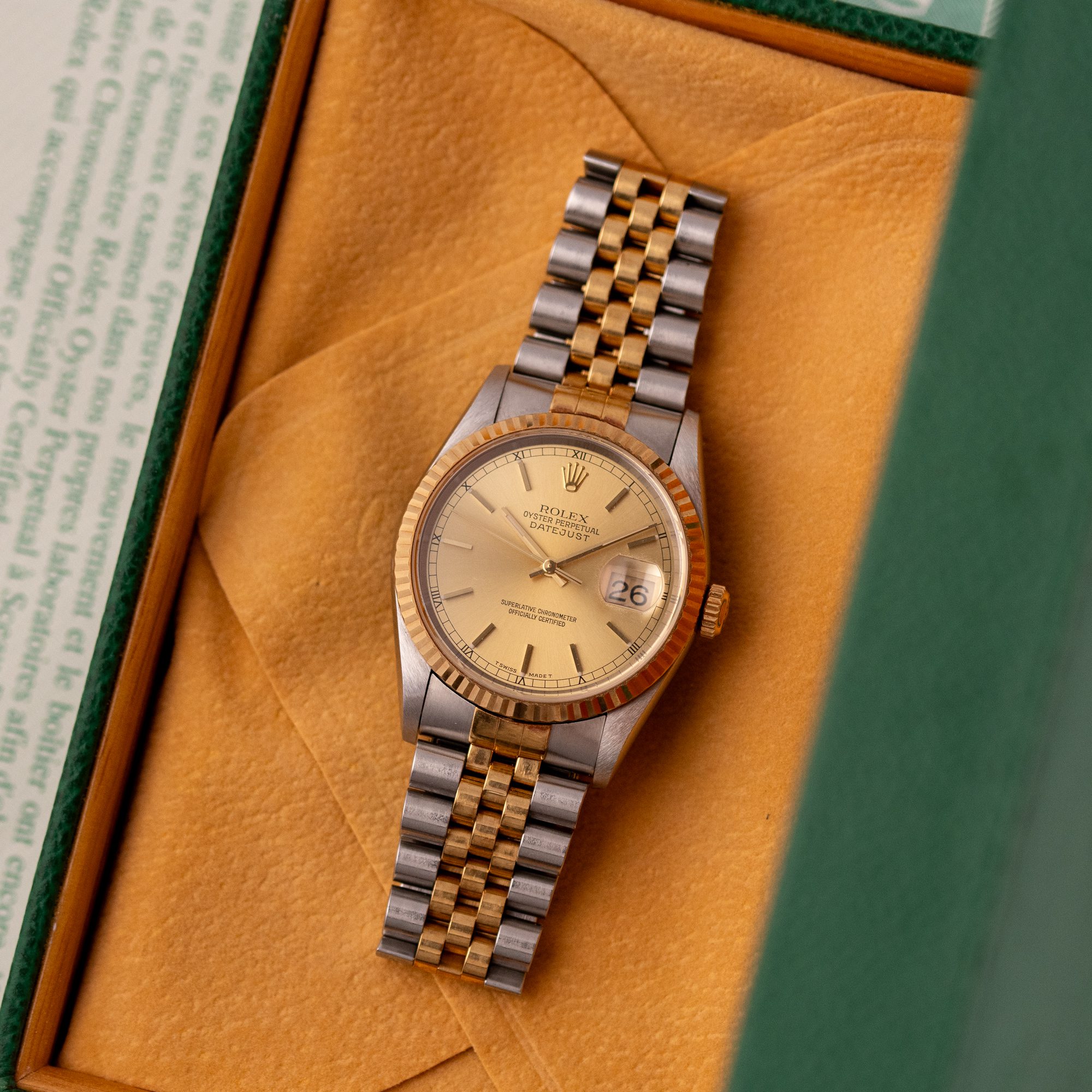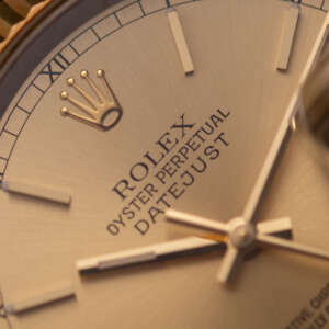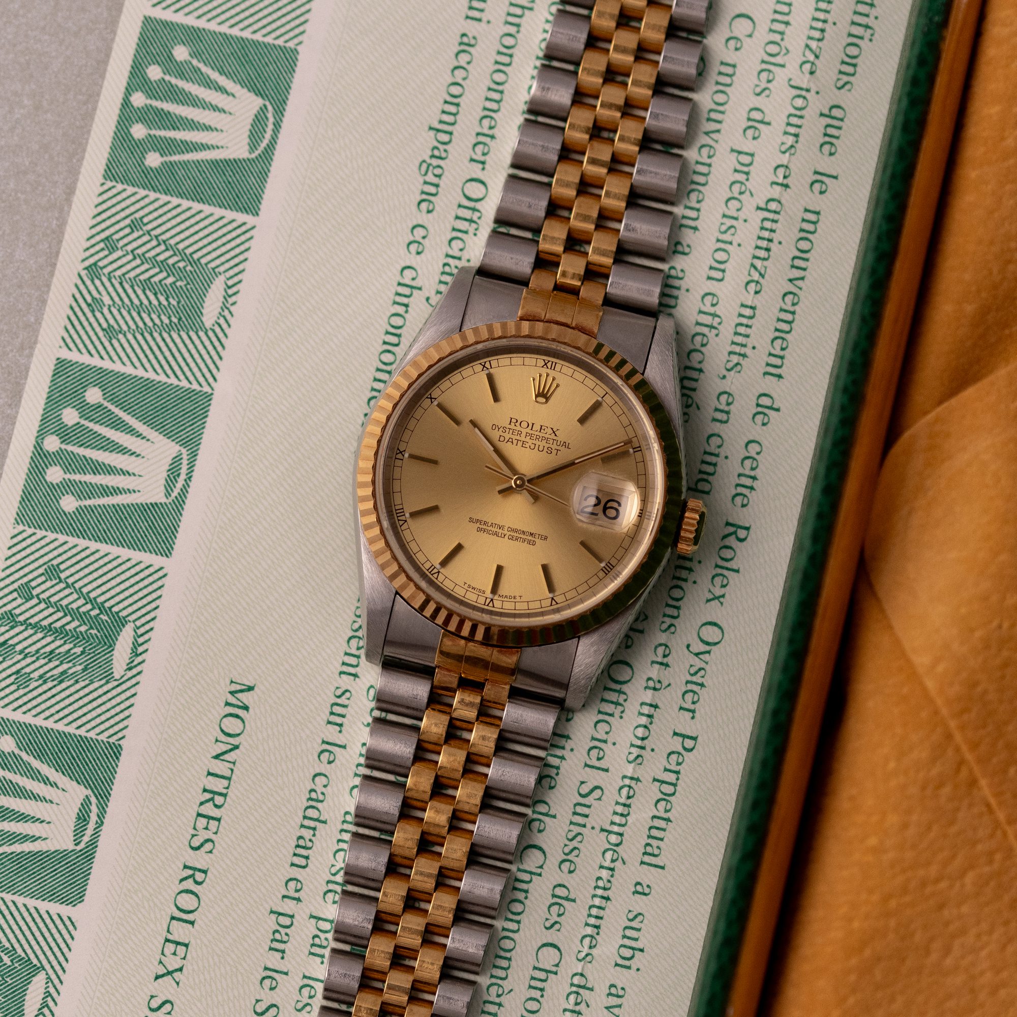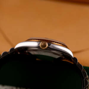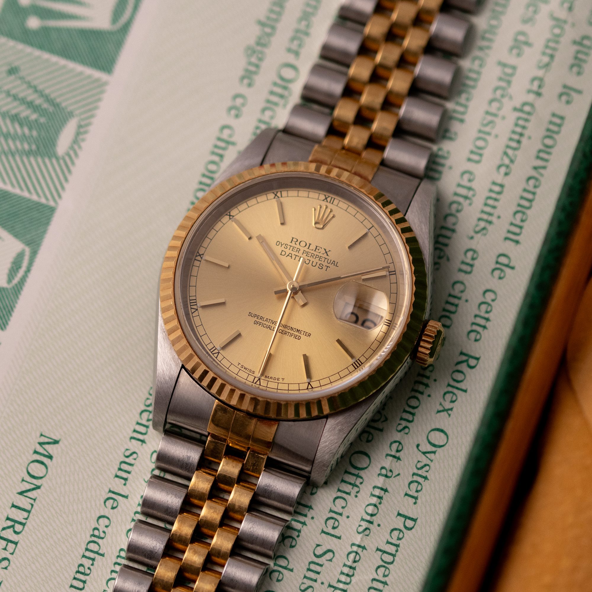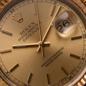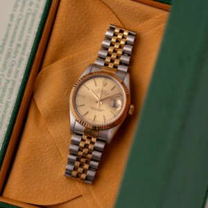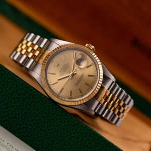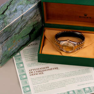 Originally sold in 1999 at Brunati Zurich, this example showcases a refined Champagne dial, providing a warm and sophisticated aesthetic. The watch is in very good condition, with a fully functional automatic movement ensuring reliable timekeeping. The Jubilee bracelet, sized for wrists up to 18 cm, exhibits minimal stretch, maintaining its structural integrity. Presented as a full set with its original Rolex box and papers, this Datejust is an excellent choice for collectors or those seeking a well-preserved vintage timepiece.