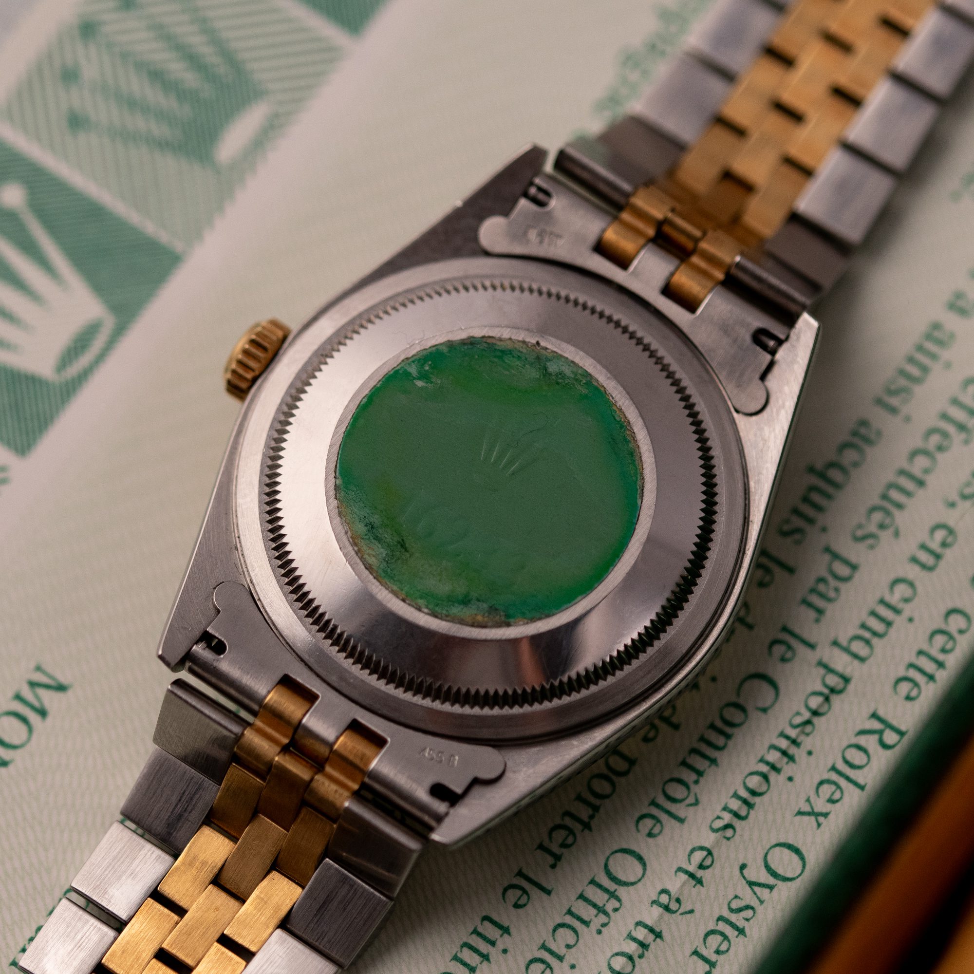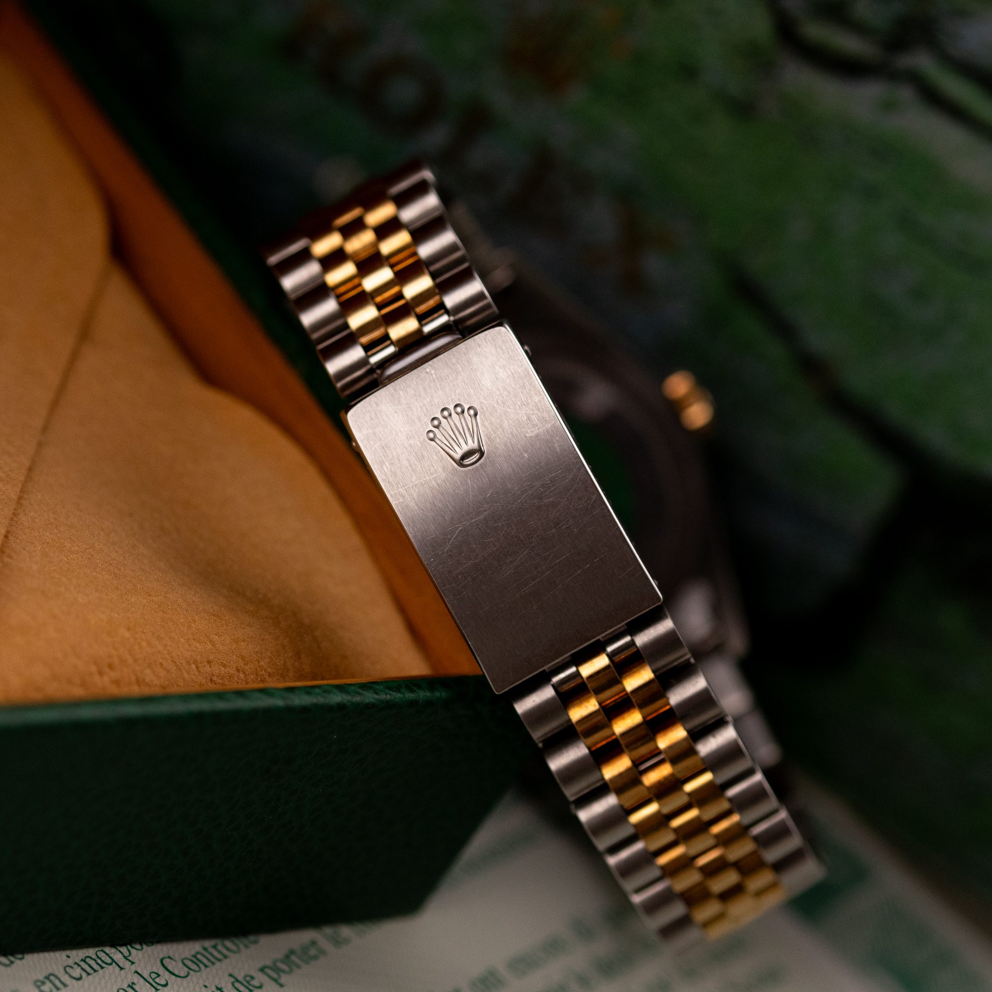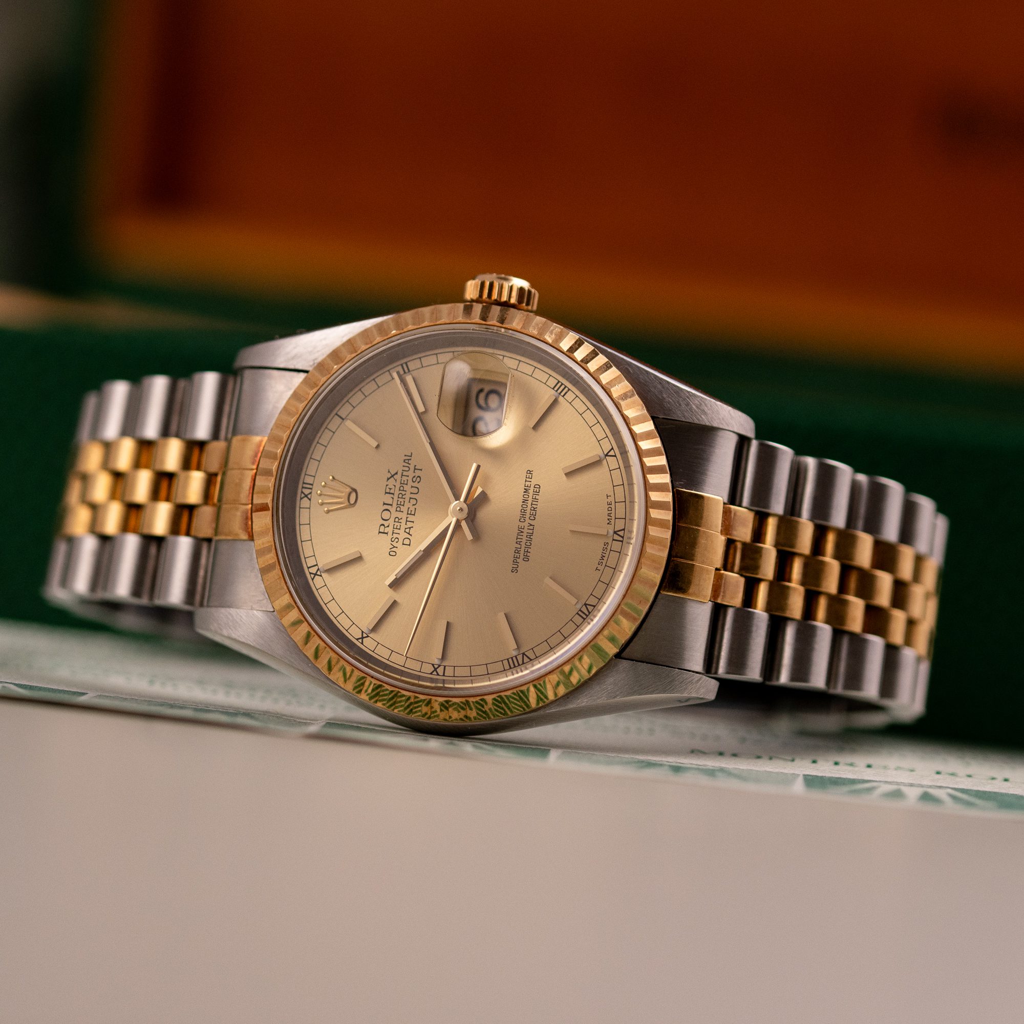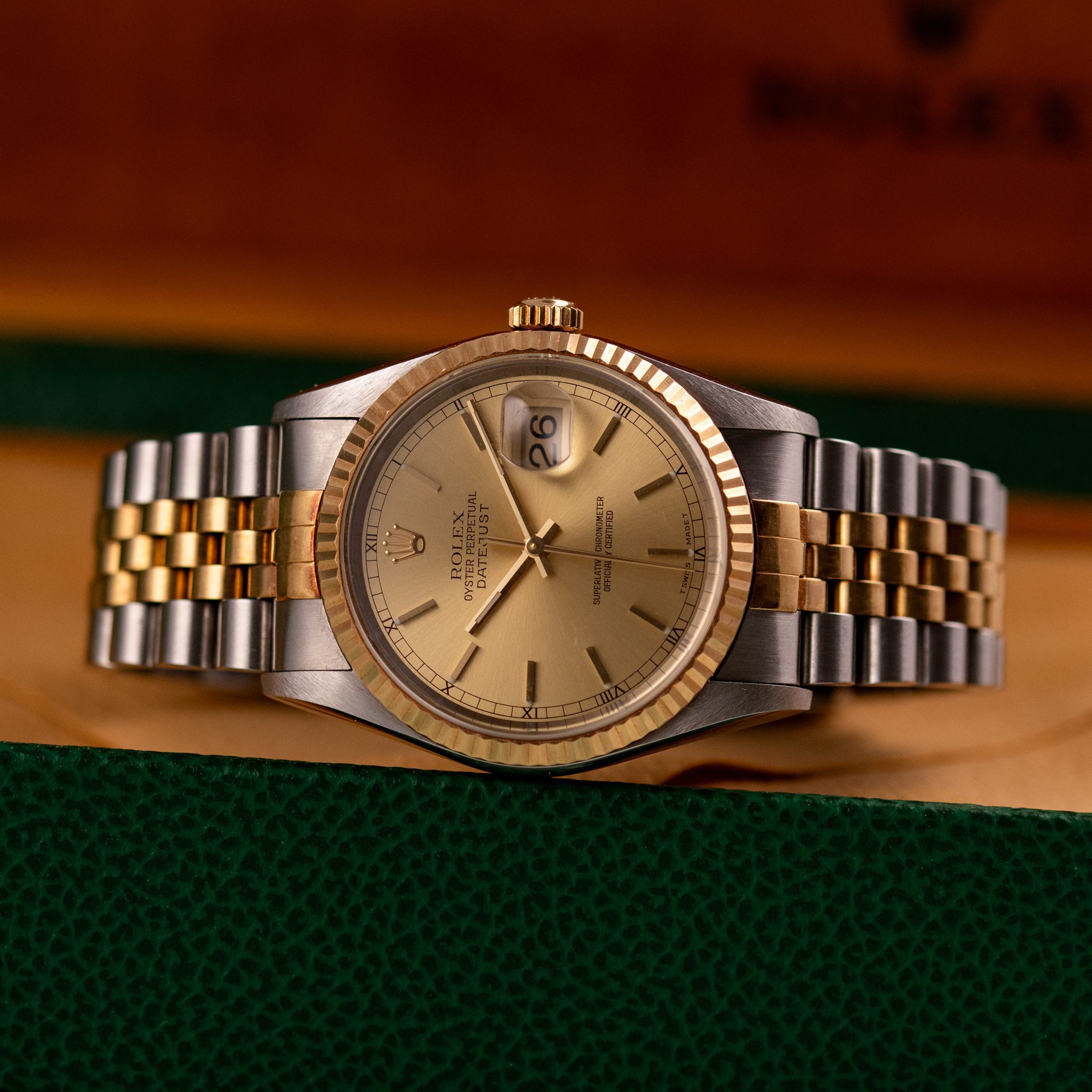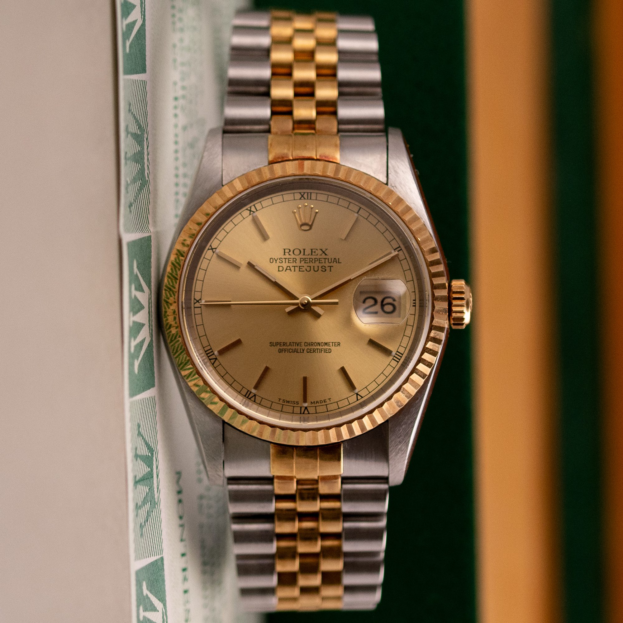 Originally sold in 1999 at Brunati Zurich, this example showcases a refined Champagne dial, providing a warm and sophisticated aesthetic. The watch is in very good condition, with a fully functional automatic movement ensuring reliable timekeeping. The Jubilee bracelet, sized for wrists up to 18 cm, exhibits minimal stretch, maintaining its structural integrity. Presented as a full set with its original Rolex box and papers, this Datejust is an excellent choice for collectors or those seeking a well-preserved vintage timepiece.