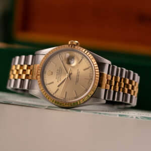 The Rolex Datejust 36, ref. 16233, crafted in stainless steel and yellow gold, features a 36mm case with a fluted bezel, offering a classic two-tone design that combines timeless elegance with versatile wearability, suitable for both formal occasions and everyday use.