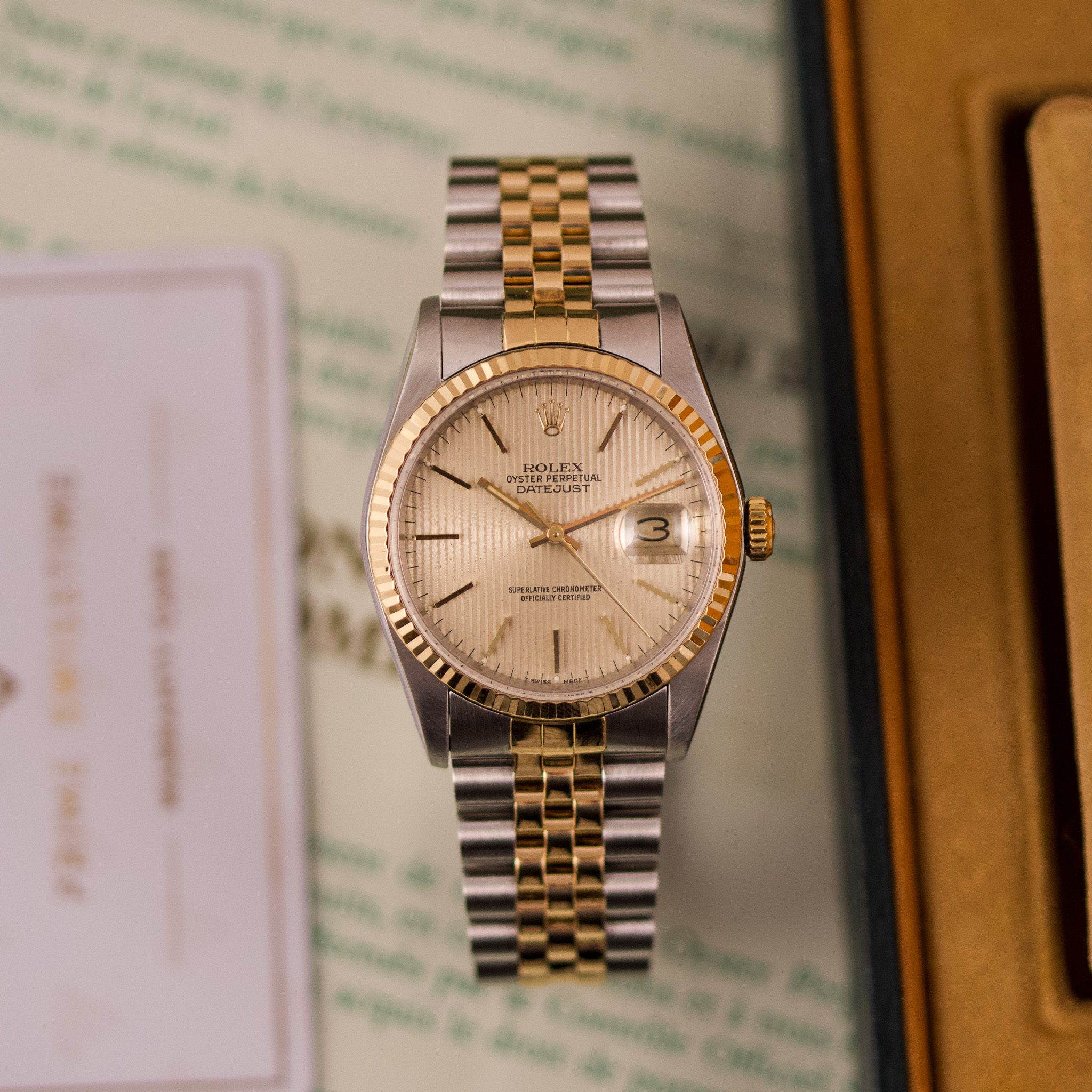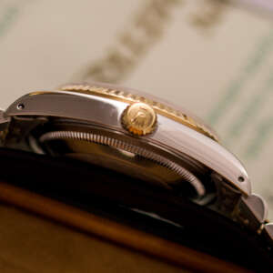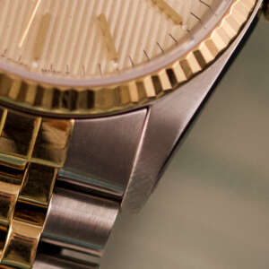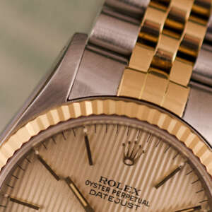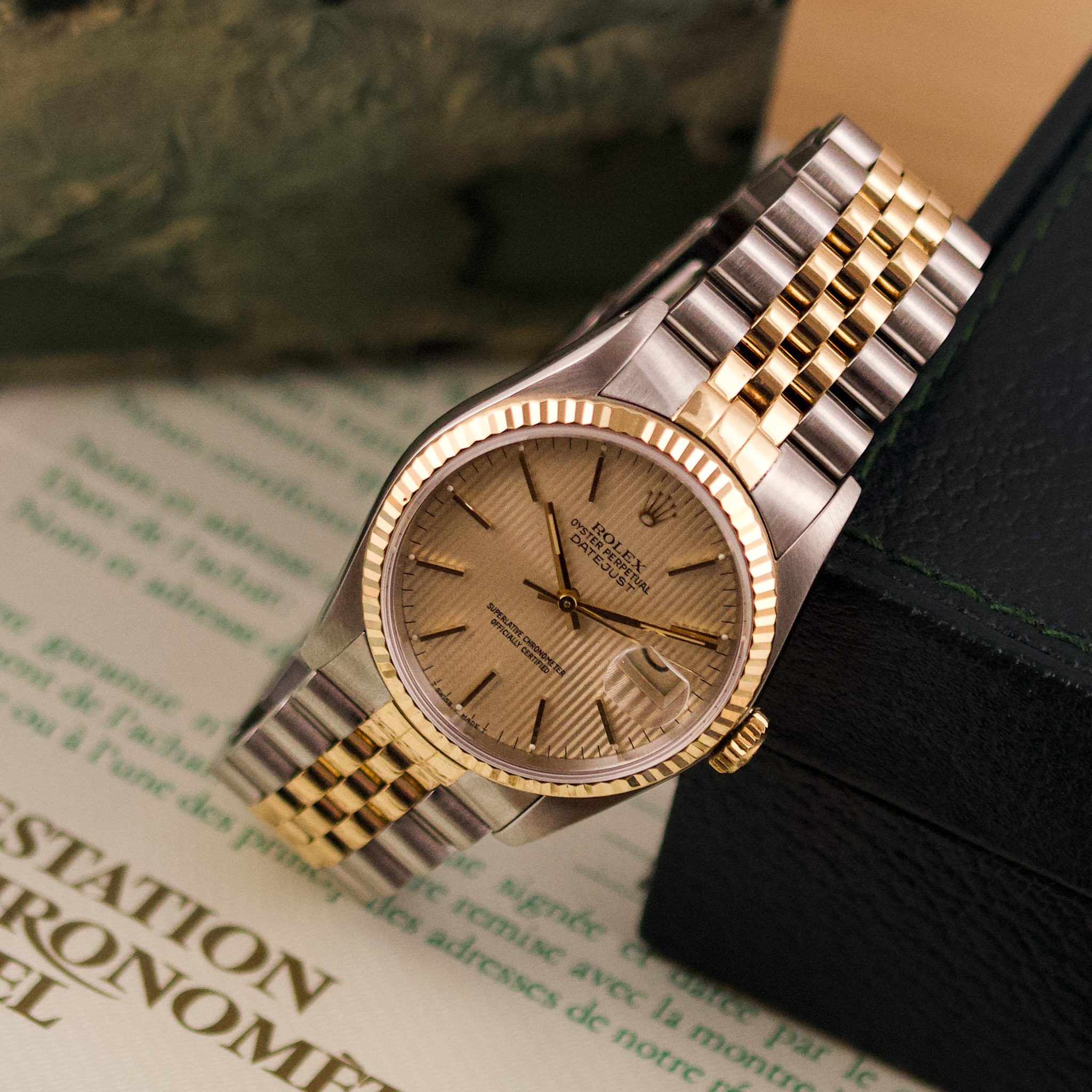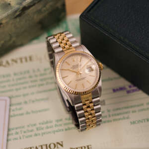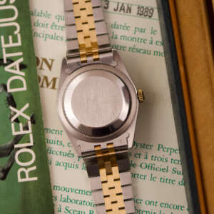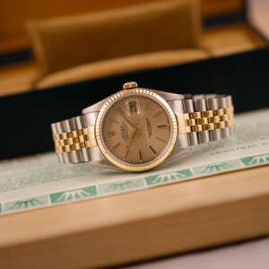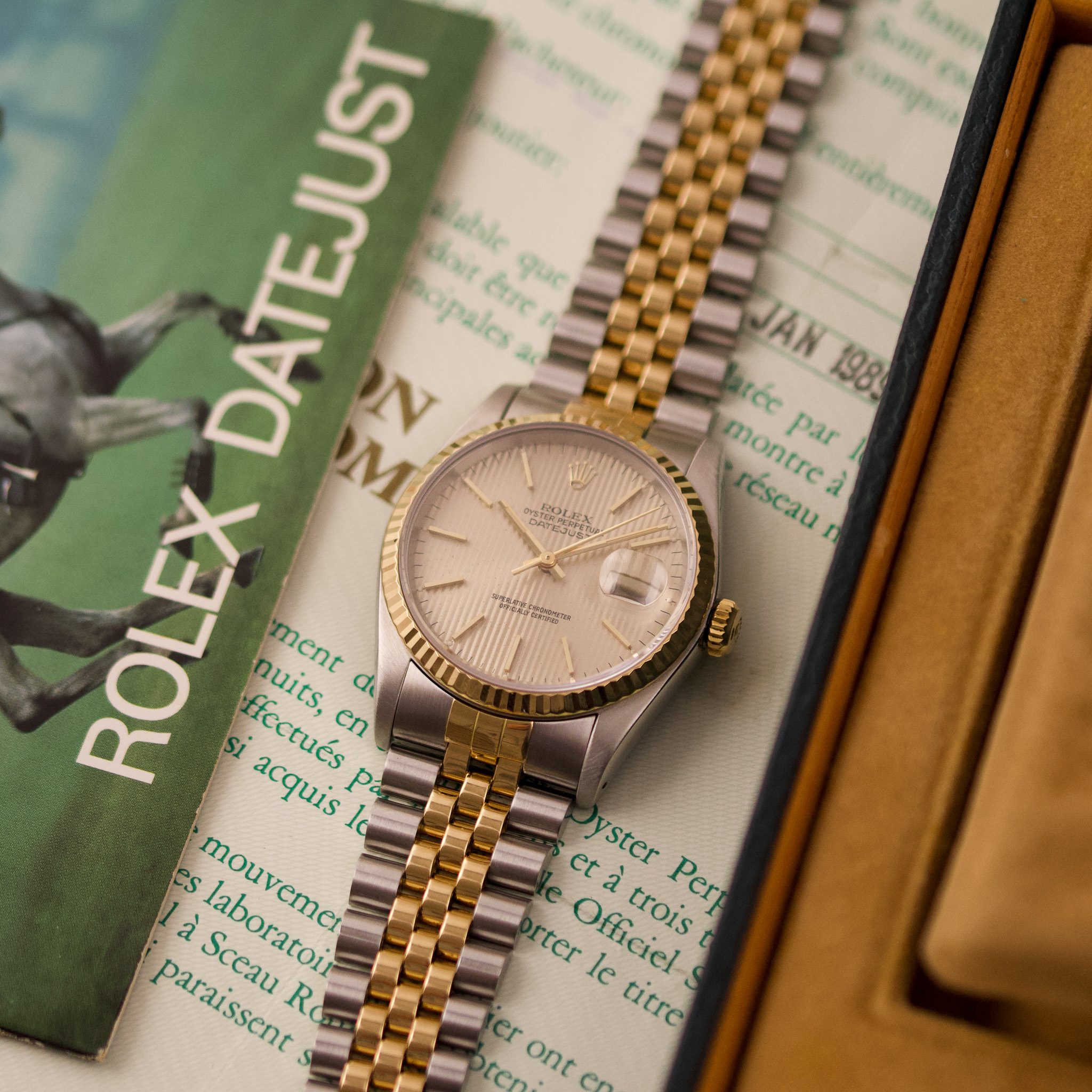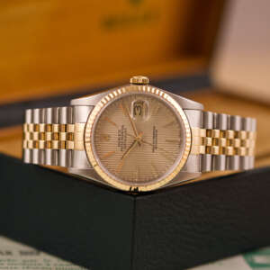 Originally sold in 1989, this example showcases a refined Champagne Tapestry dial, providing a warm and elegant aesthetic that enhances its classic appeal. The watch was serviced in 2026 and it is in very good condition. The Jubilee bracelet, sized for wrists up to 18 cm, exhibits very light stretch, maintaining its structural integrity. Presented as a full set with its original Rolex box and papers, this Datejust is an excellent choice for collectors or those seeking a well-preserved vintage timepiece.