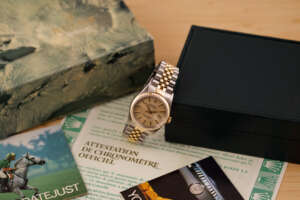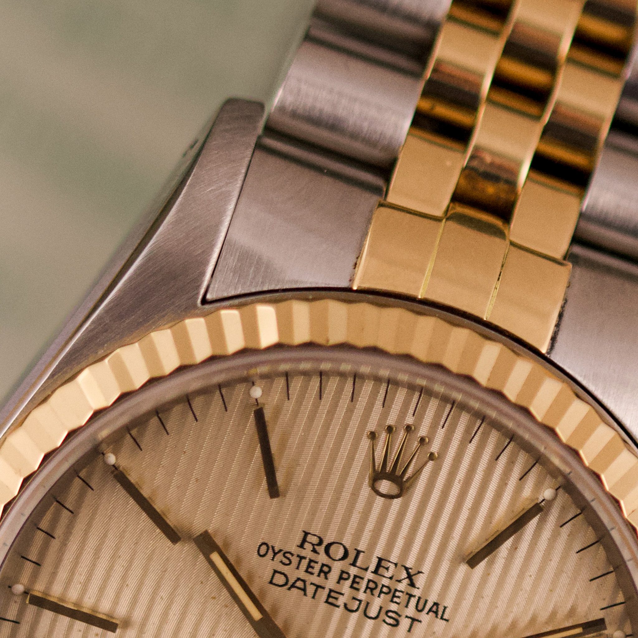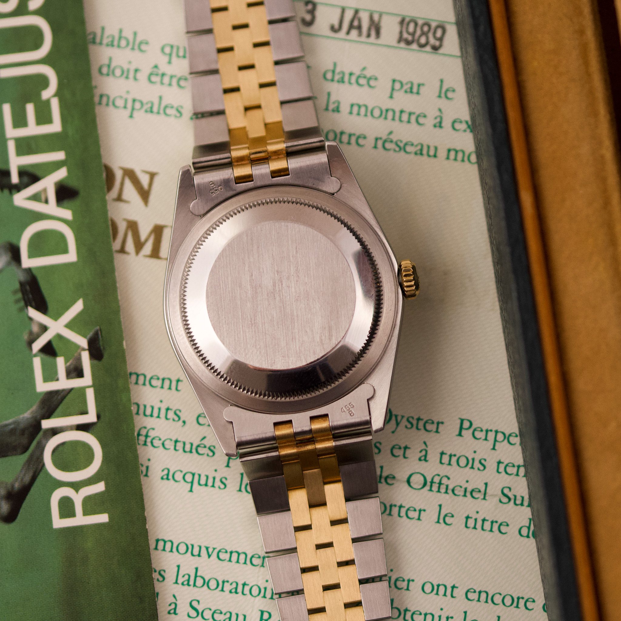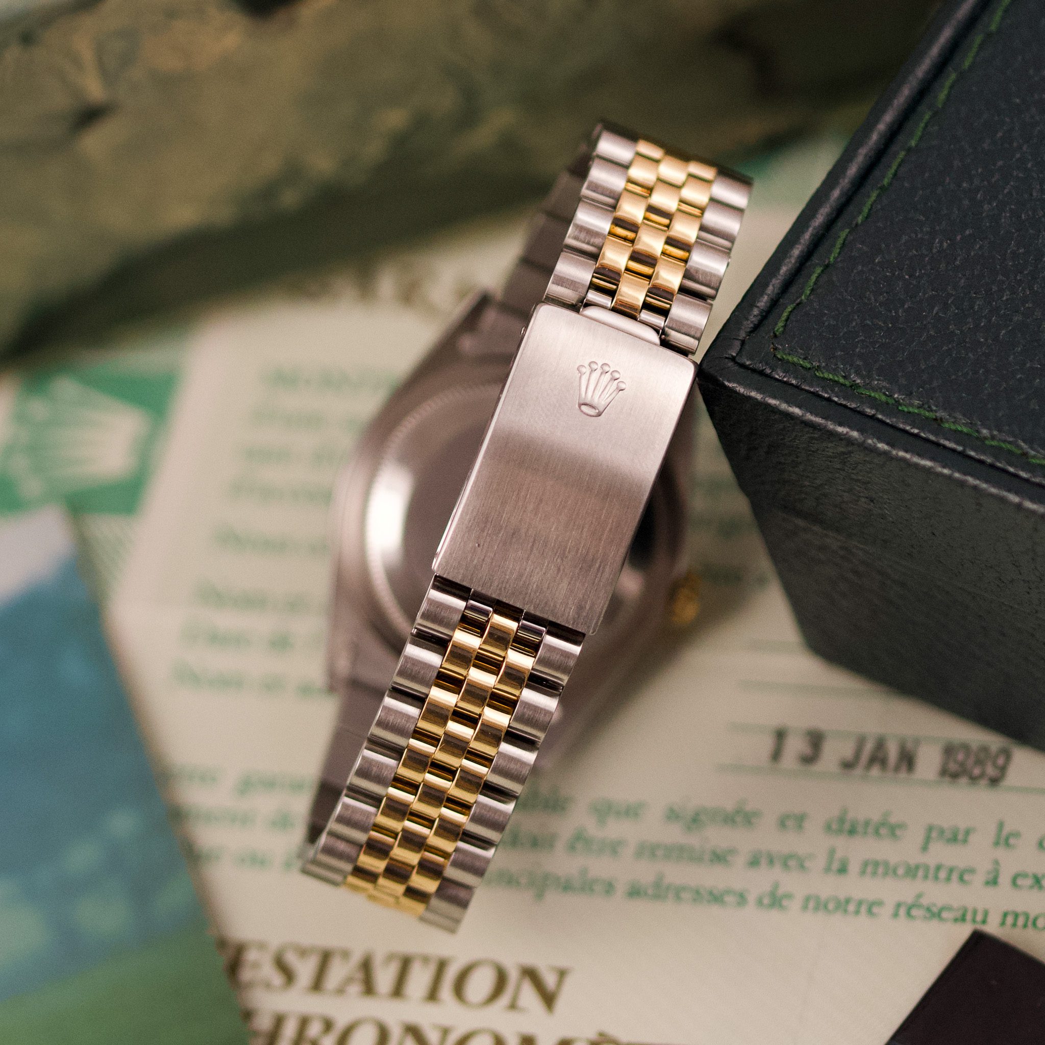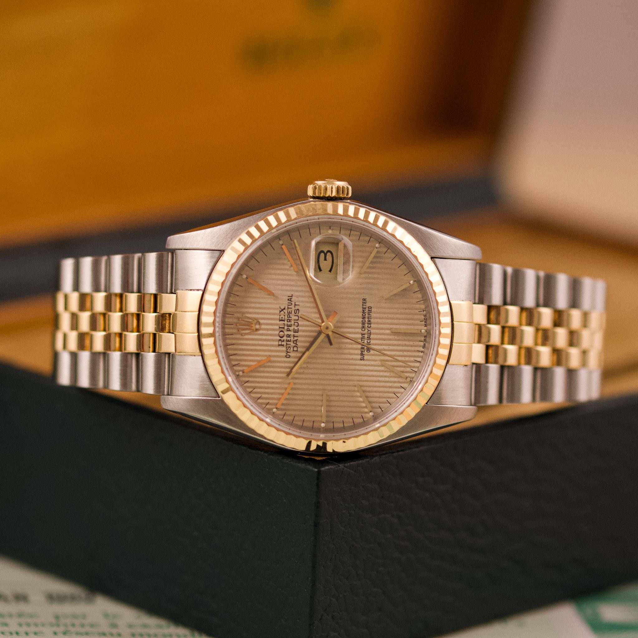 Originally sold in 1989, this example showcases a refined Champagne Tapestry dial, providing a warm and elegant aesthetic that enhances its classic appeal. The watch was serviced in 2026 and it is in very good condition. The Jubilee bracelet, sized for wrists up to 18 cm, exhibits very light stretch, maintaining its structural integrity. Presented as a full set with its original Rolex box and papers, this Datejust is an excellent choice for collectors or those seeking a well-preserved vintage timepiece.