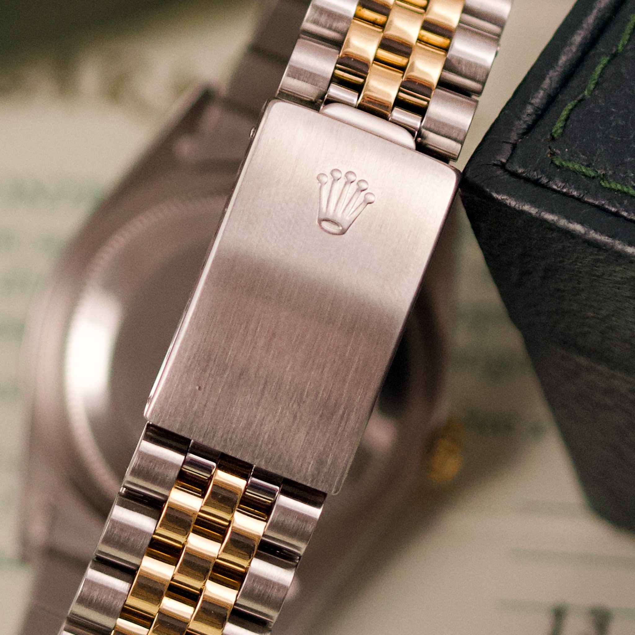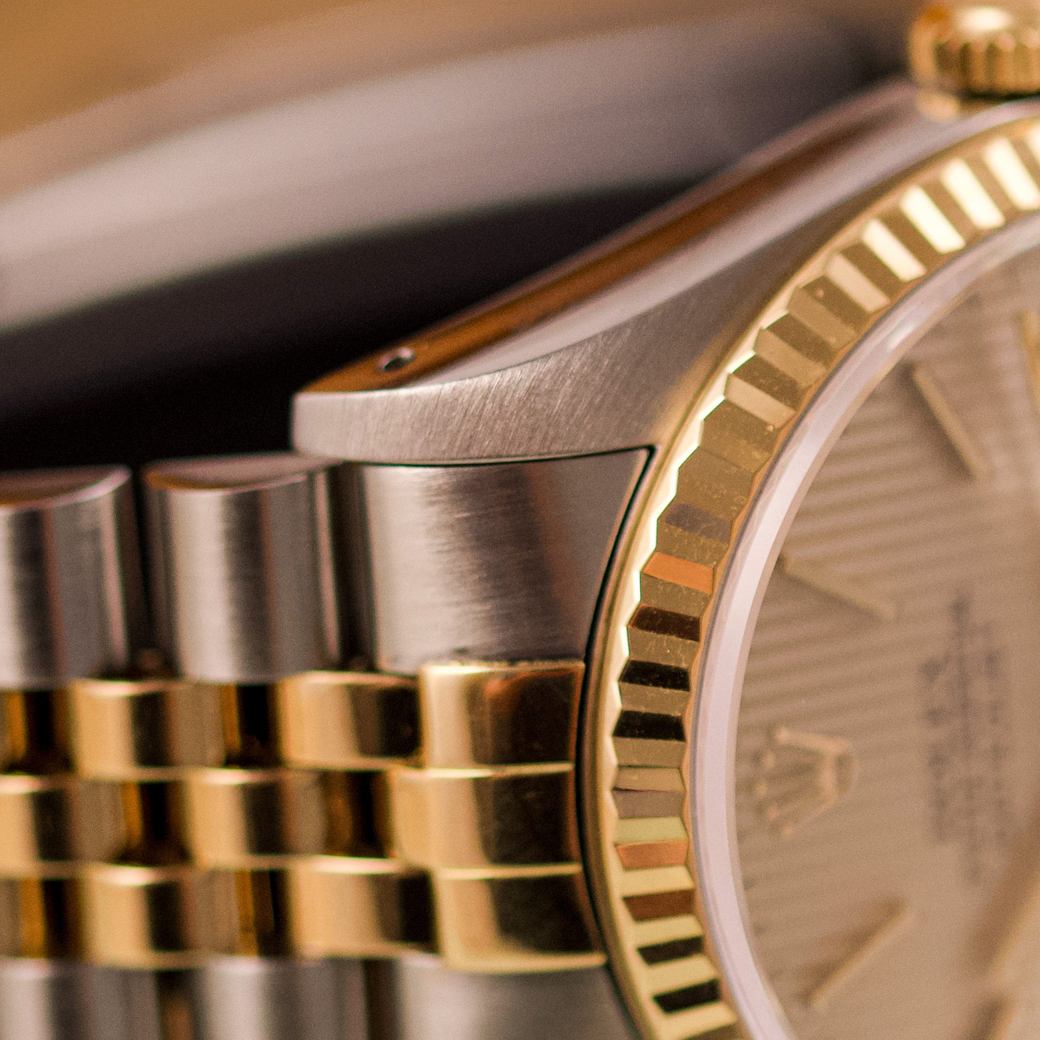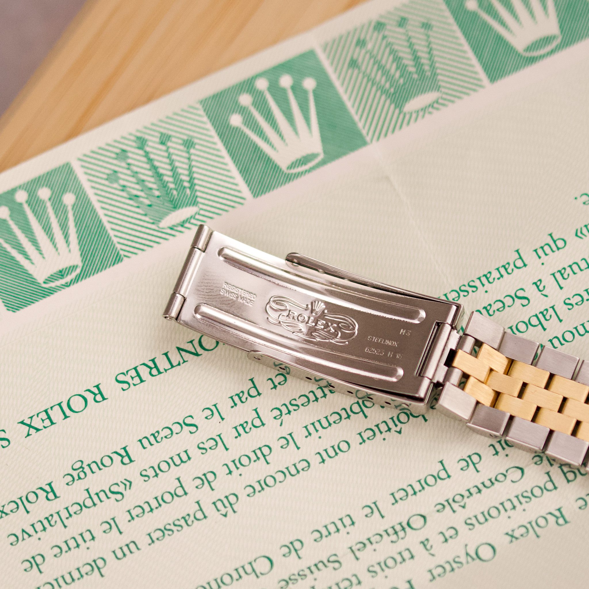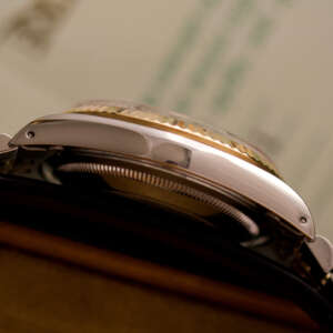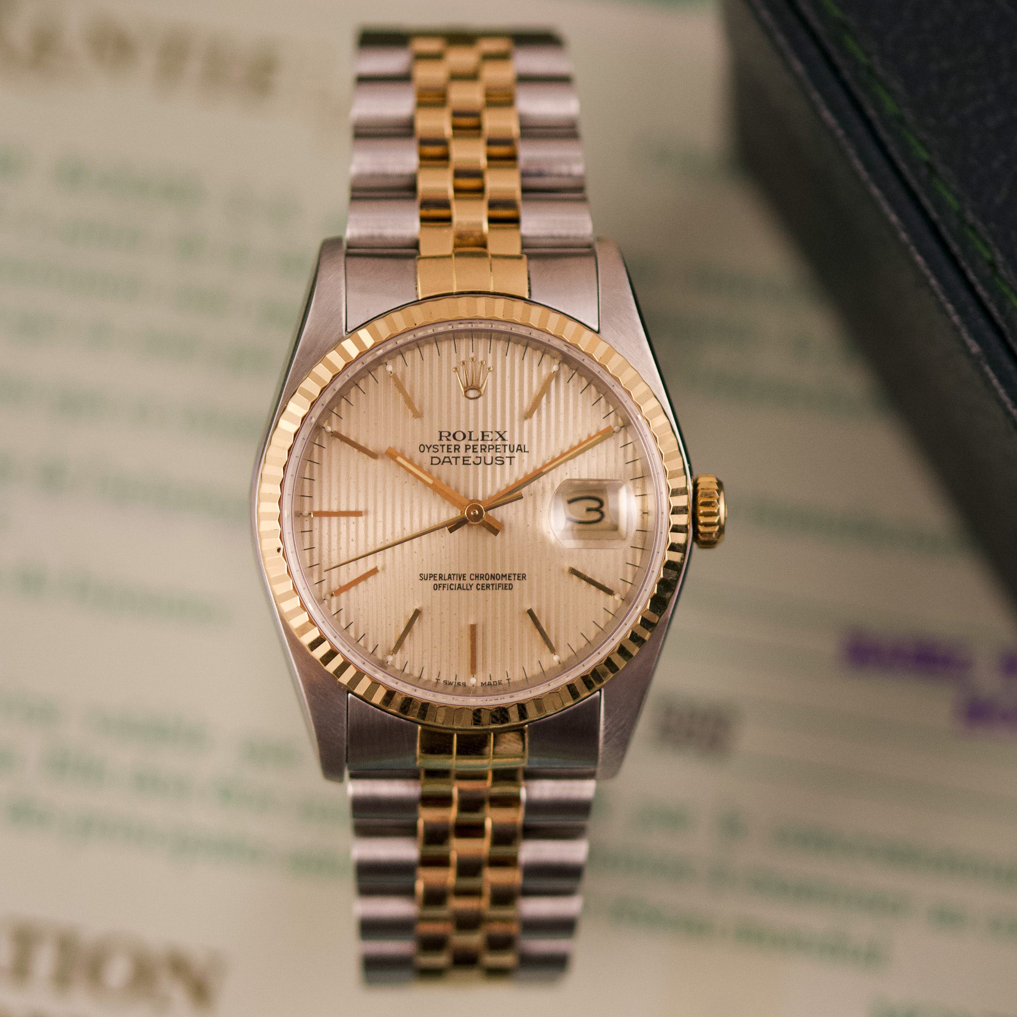 Originally sold in 1989, this example showcases a refined Champagne Tapestry dial, providing a warm and elegant aesthetic that enhances its classic appeal. The watch was serviced in 2026 and it is in very good condition. The Jubilee bracelet, sized for wrists up to 18 cm, exhibits very light stretch, maintaining its structural integrity. Presented as a full set with its original Rolex box and papers, this Datejust is an excellent choice for collectors or those seeking a well-preserved vintage timepiece.