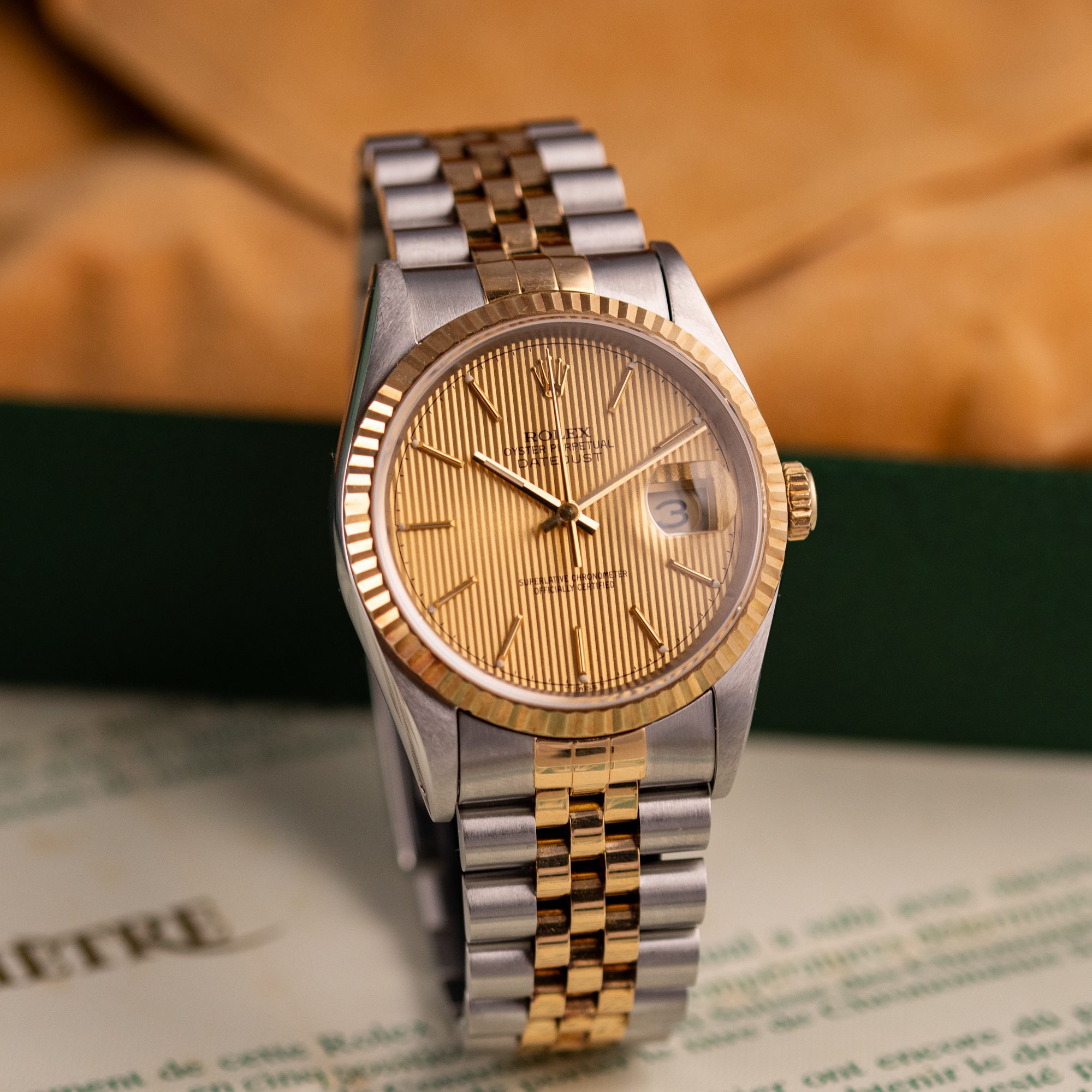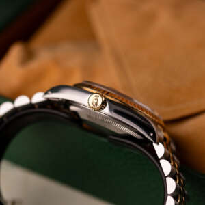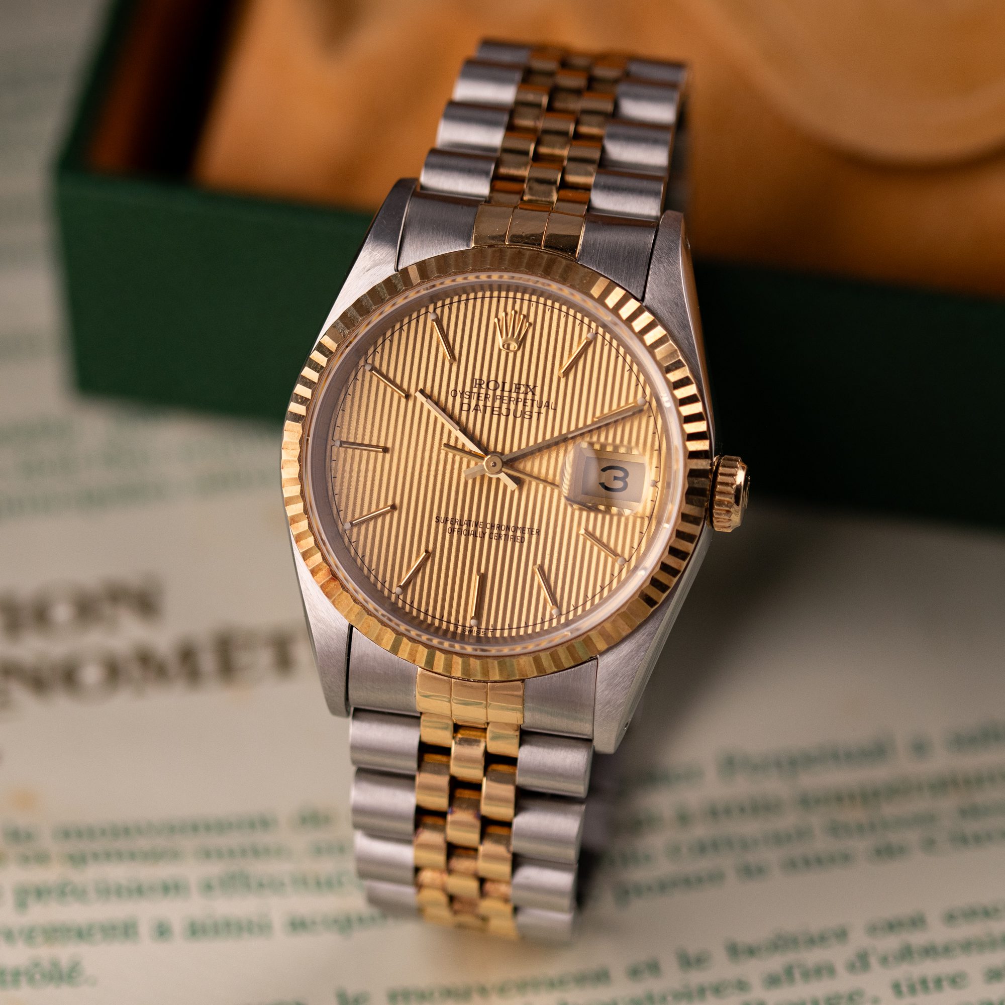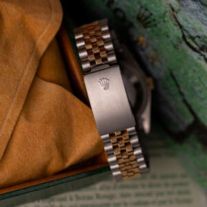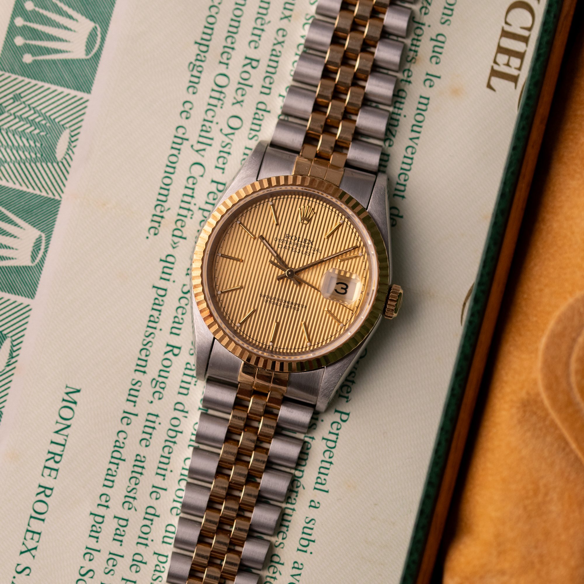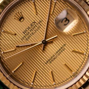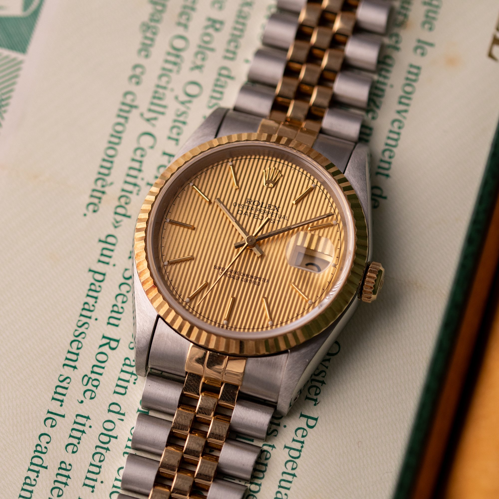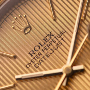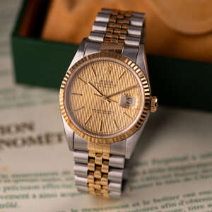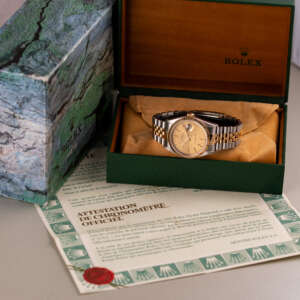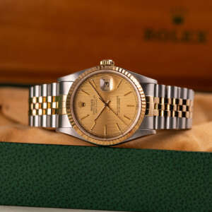 Originally sold in 1994, this example showcases a distinctive Champagne Tapestry dial with a textured pattern, providing a refined and unique aesthetic. The watch is in very good condition, freshly serviced by a watchmaker to ensure fully functional automatic movement and precise timekeeping. The Jubilee bracelet, sized for wrists up to 18 cm, exhibits minimal stretch, preserving its structural integrity. Presented as a full set with its original Rolex box and papers, this Datejust is an excellent choice for collectors or those seeking a well-maintained vintage timepiece.