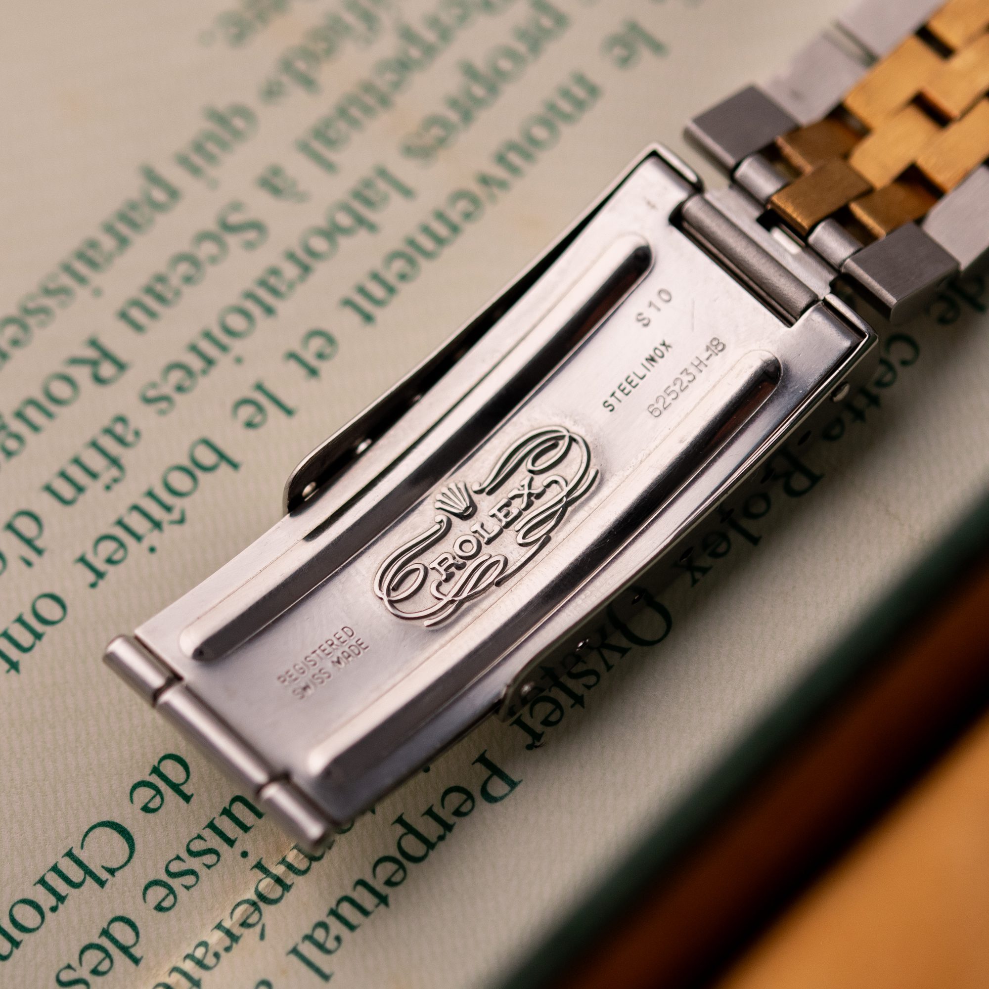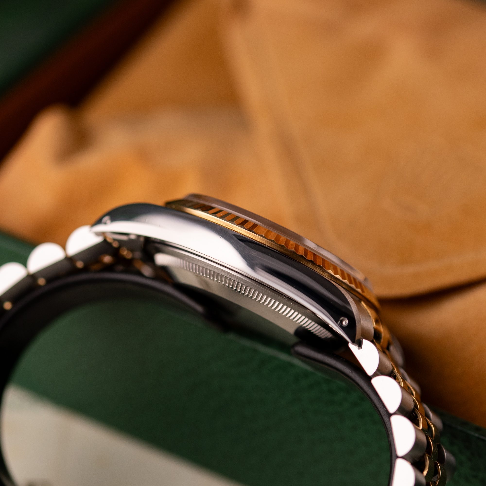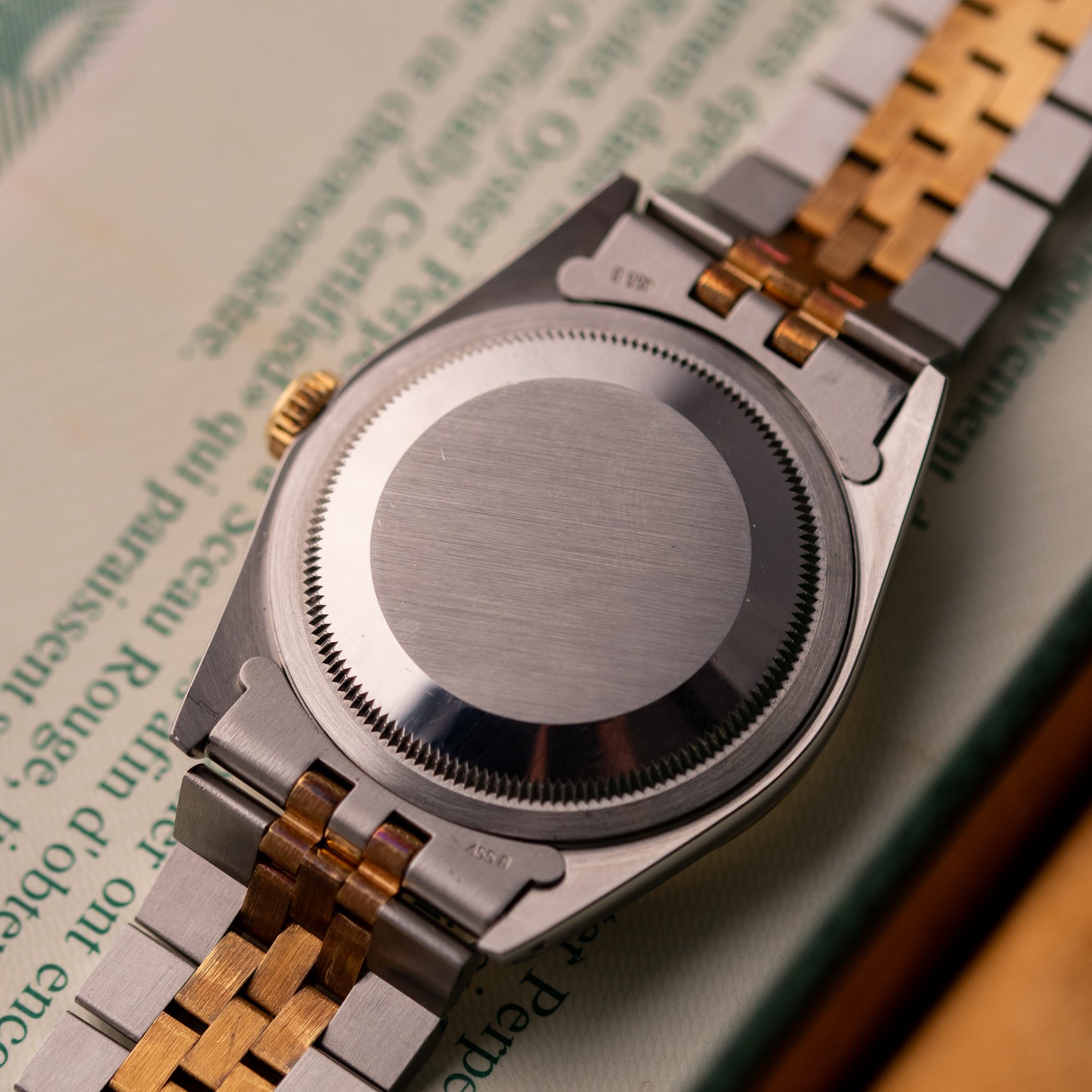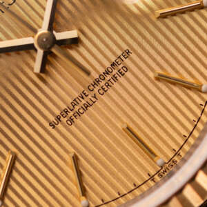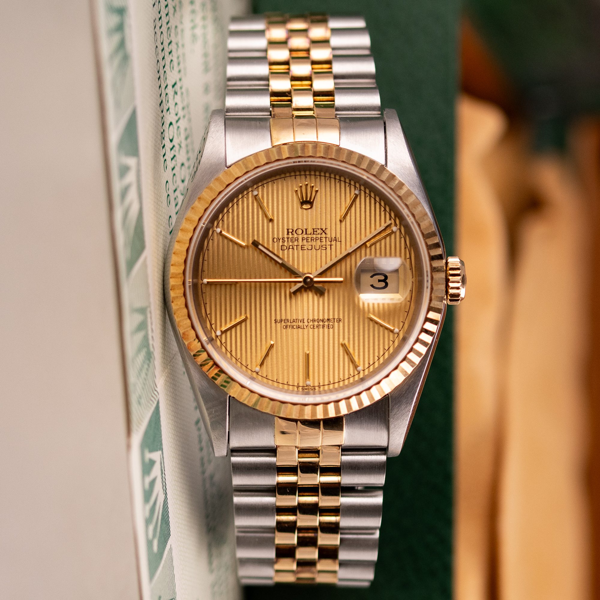 Originally sold in 1994, this example showcases a distinctive Champagne Tapestry dial with a textured pattern, providing a refined and unique aesthetic. The watch is in very good condition, freshly serviced by a watchmaker to ensure fully functional automatic movement and precise timekeeping. The Jubilee bracelet, sized for wrists up to 18 cm, exhibits minimal stretch, preserving its structural integrity. Presented as a full set with its original Rolex box and papers, this Datejust is an excellent choice for collectors or those seeking a well-maintained vintage timepiece.
