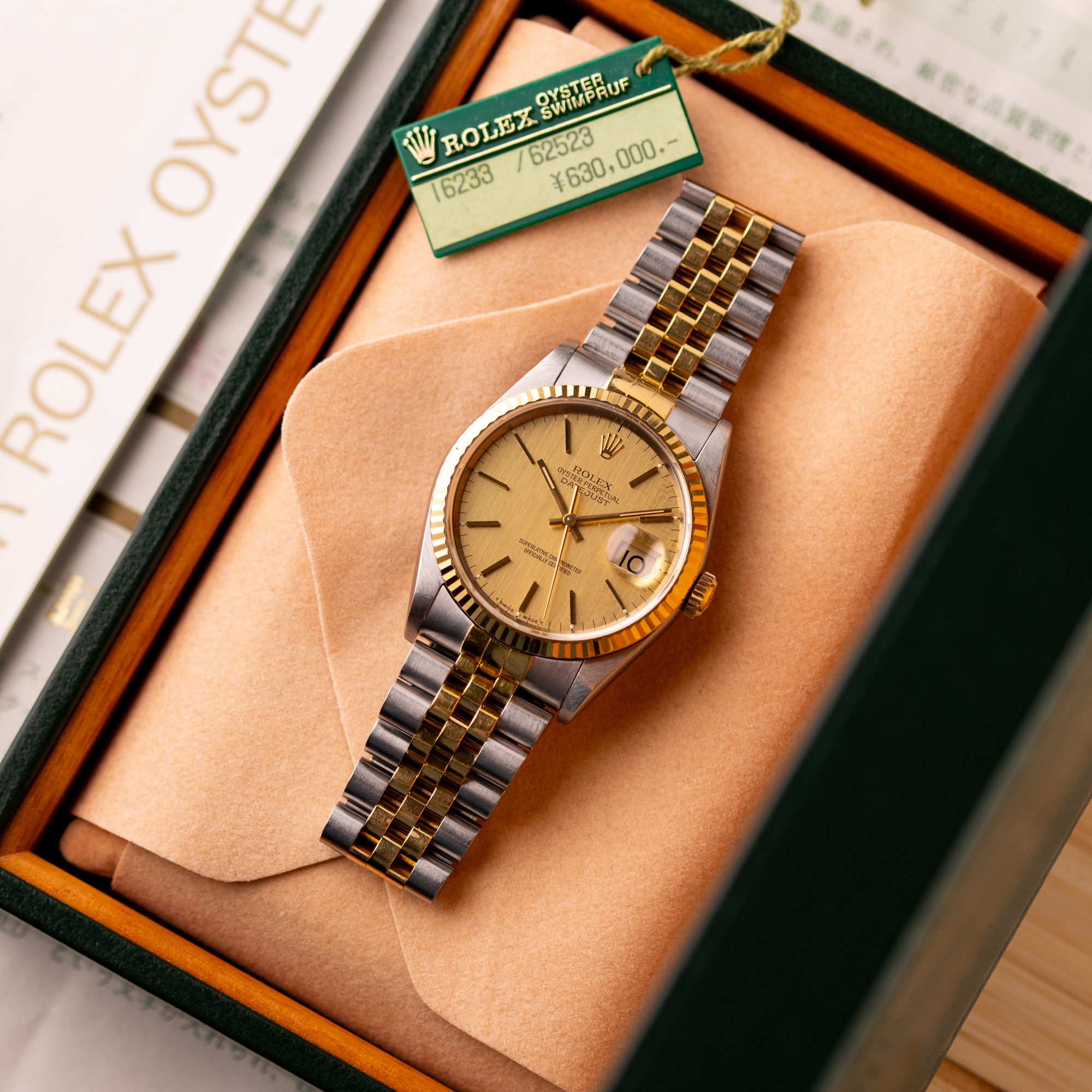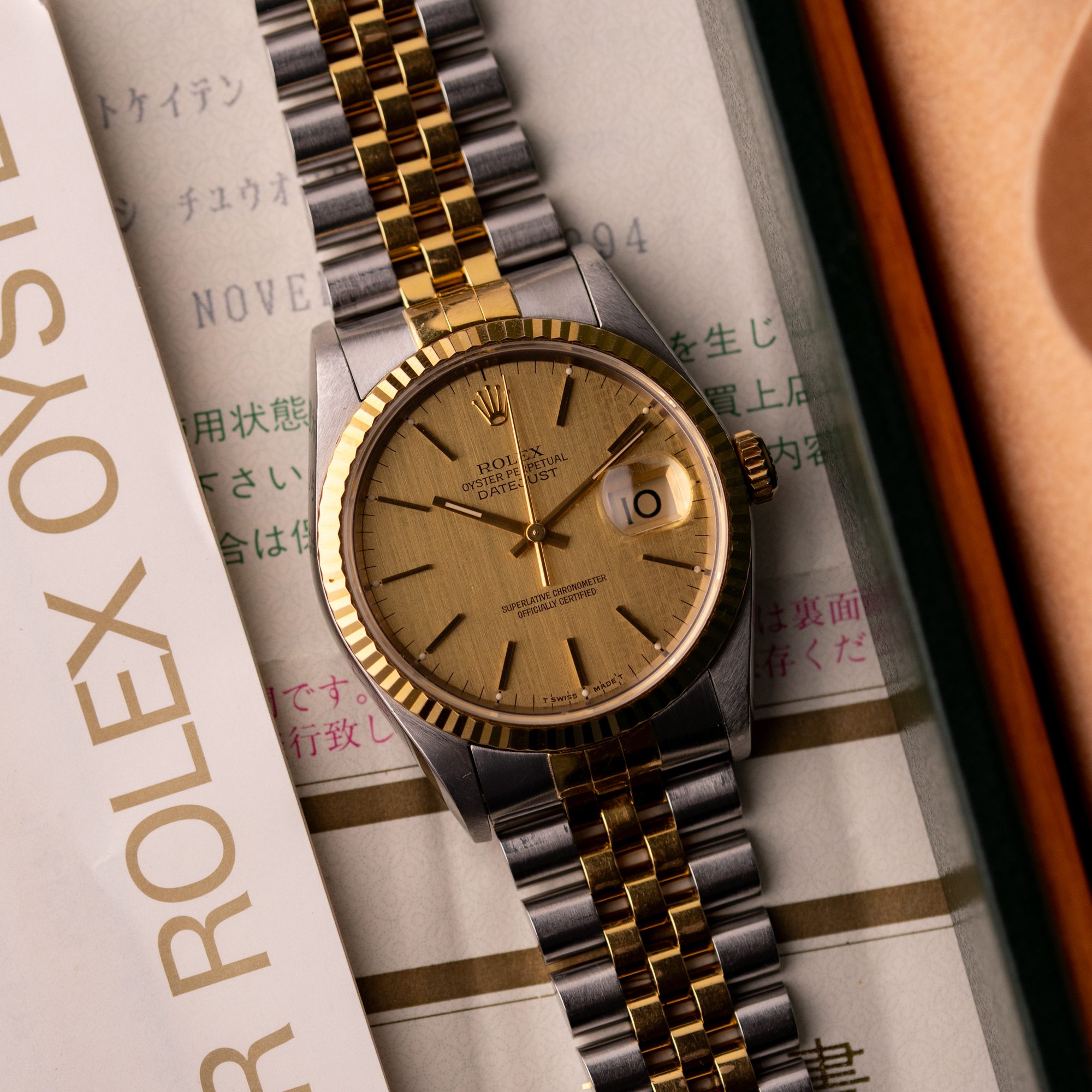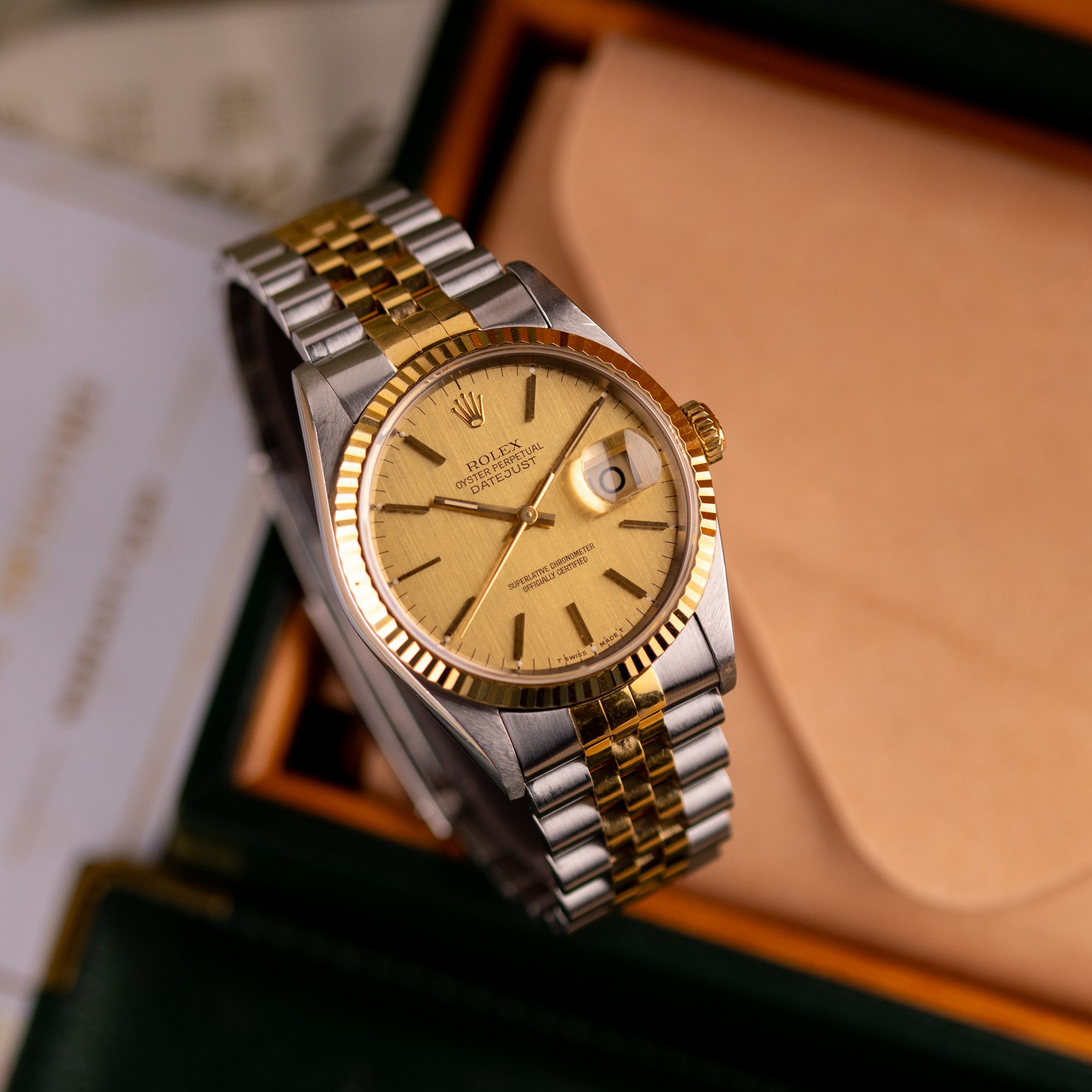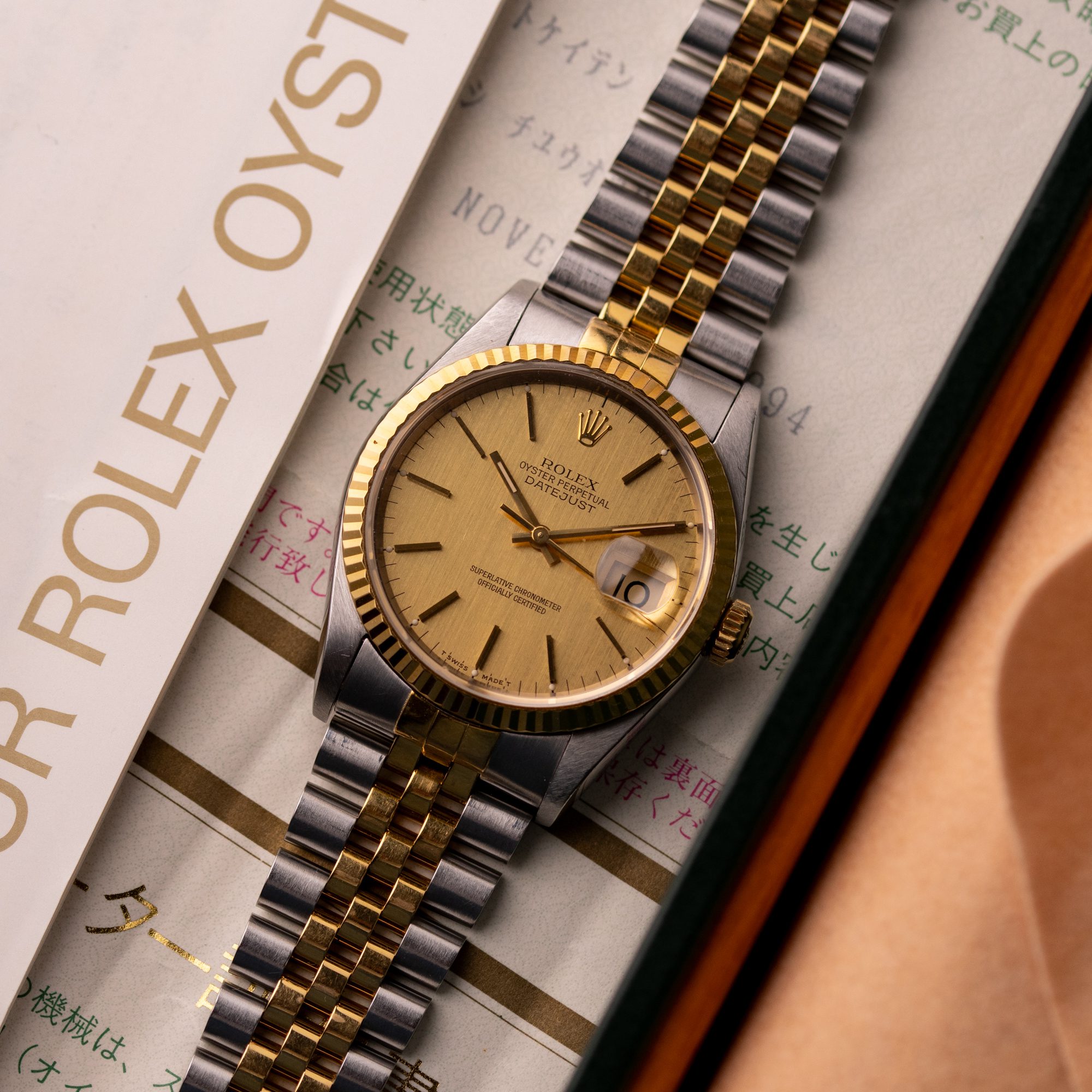 This particular piece, originally sold in 1994, features a stunning Champagne Jubilee dial, adding a touch of refinement to the design. The watch is in very good visual and mechanical condition and comes as a full set with the original box and papers, making it an excellent choice for collectors and enthusiasts alike.