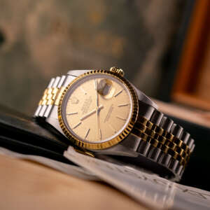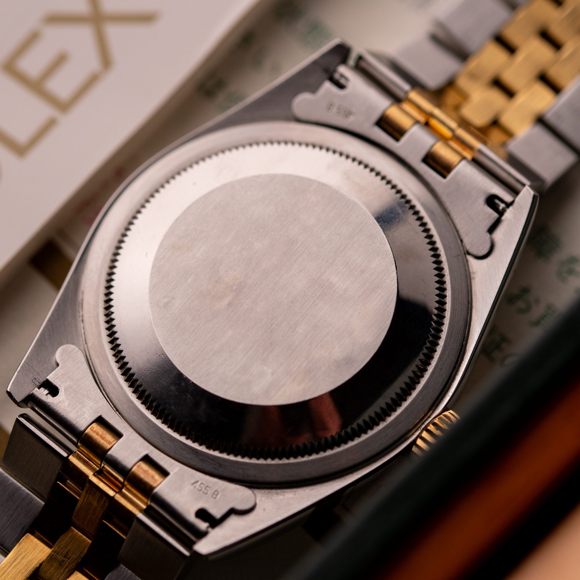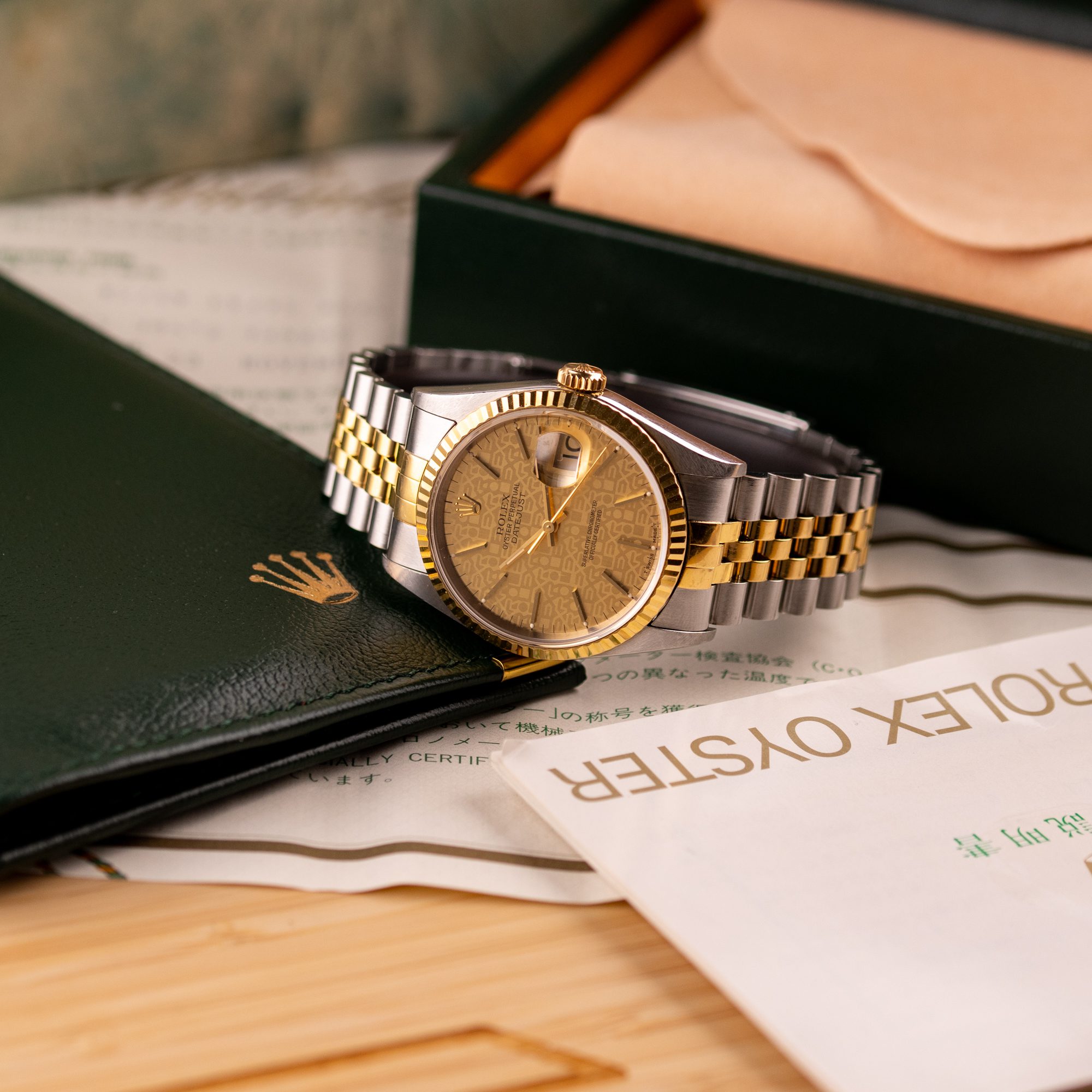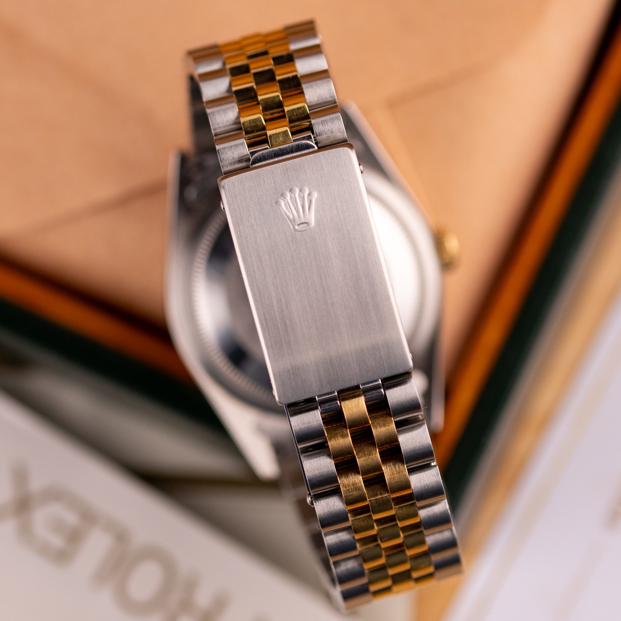 This particular piece, originally sold in 1994, features a stunning Champagne Jubilee dial, adding a touch of refinement to the design. The watch is in very good visual and mechanical condition and comes as a full set with the original box and papers, making it an excellent choice for collectors and enthusiasts alike.