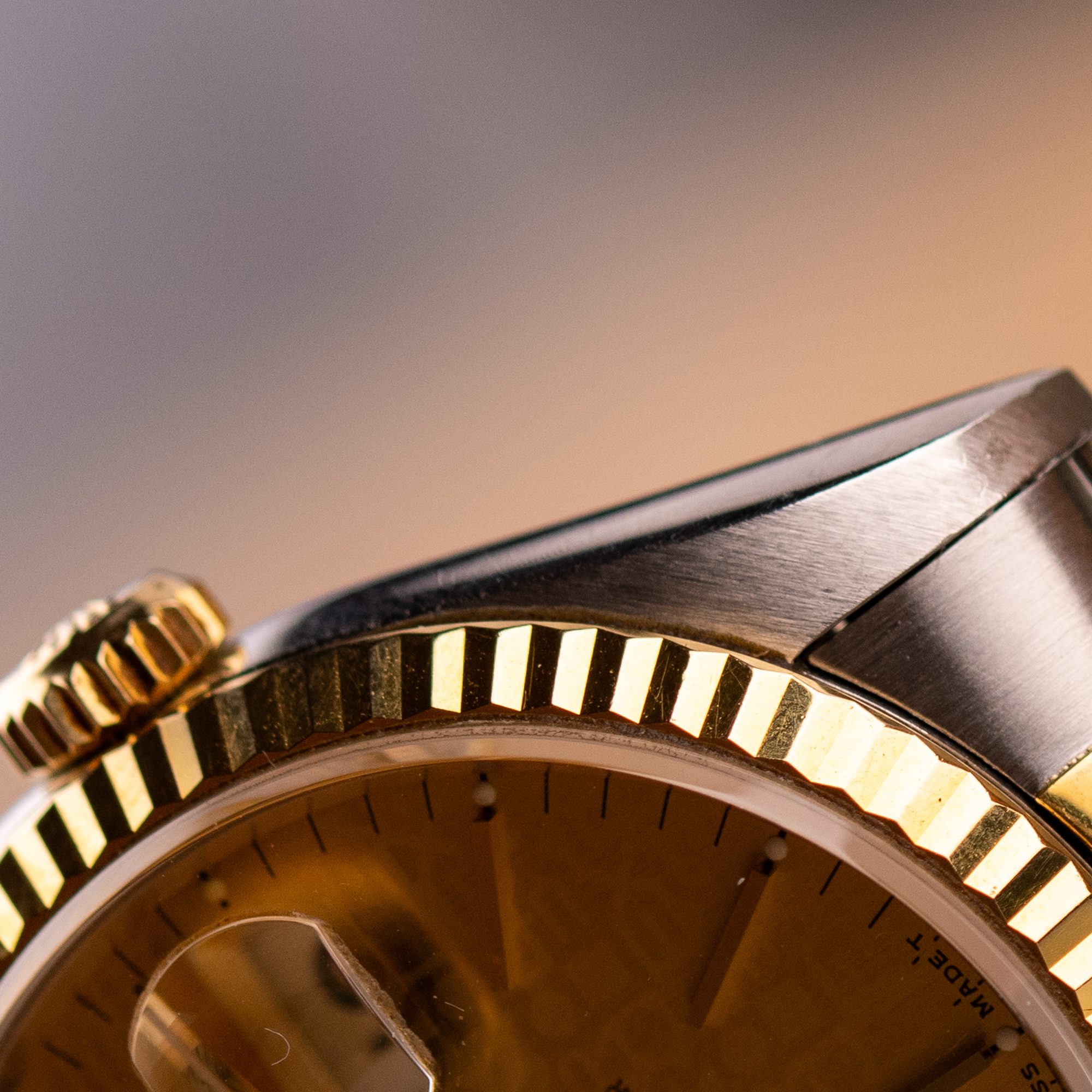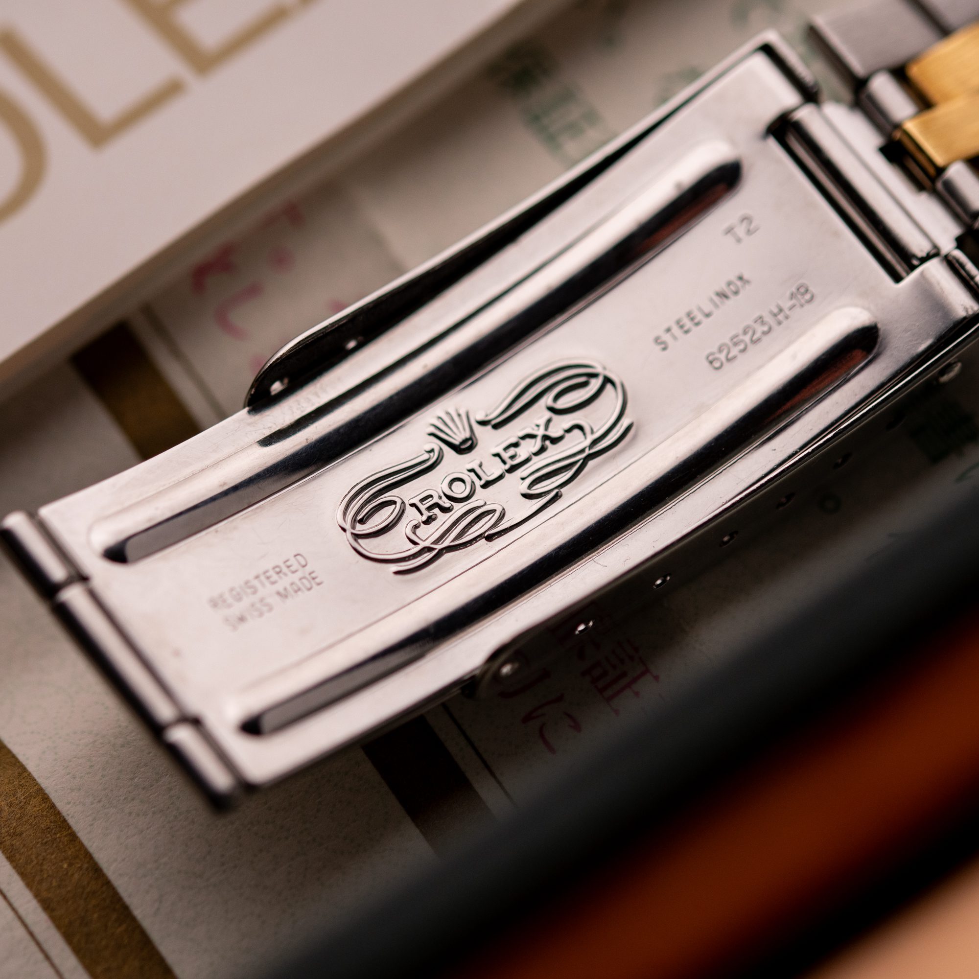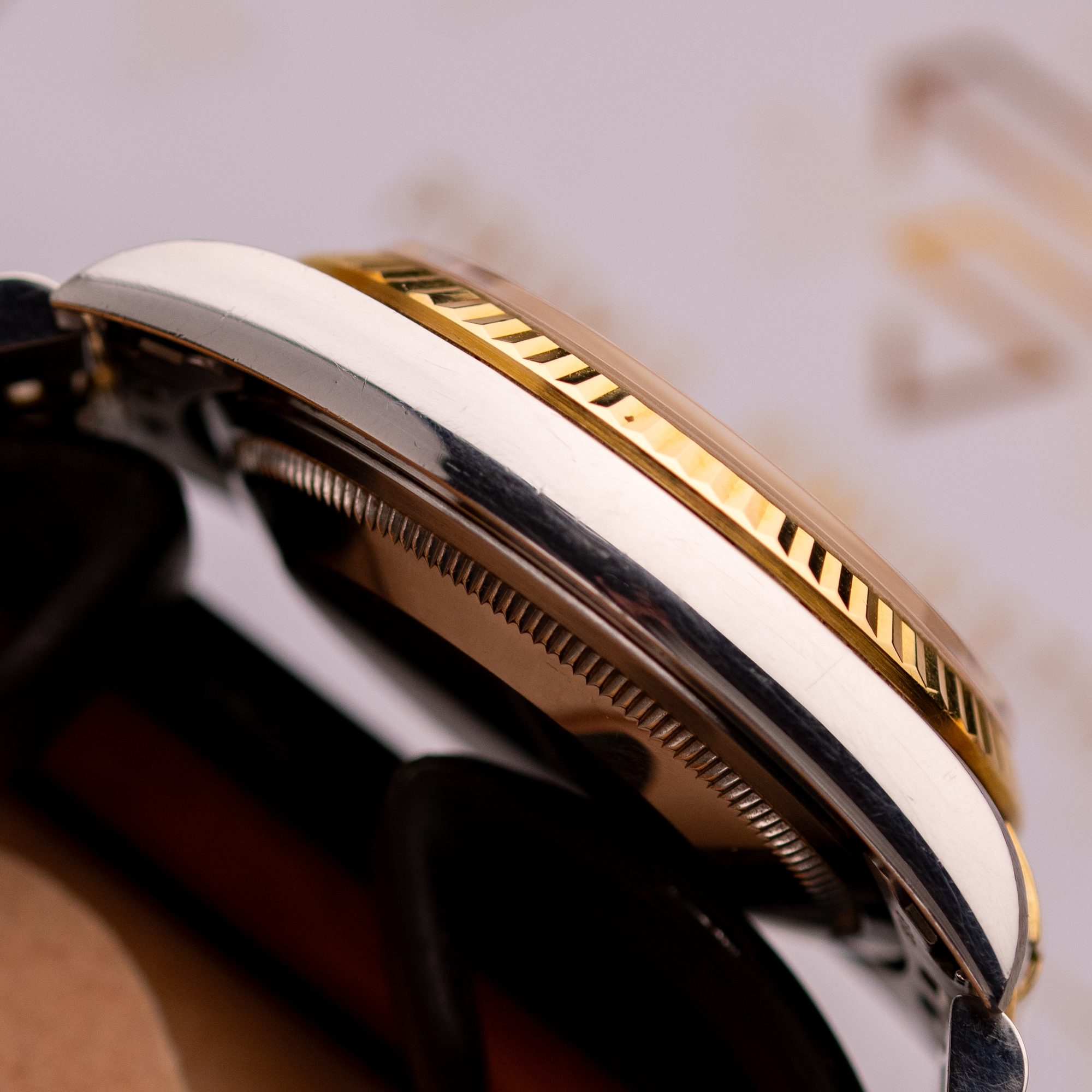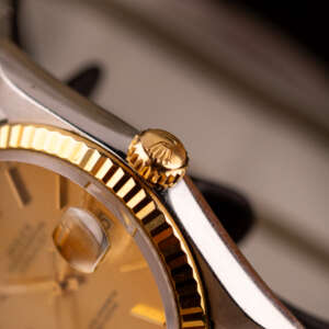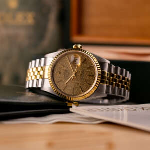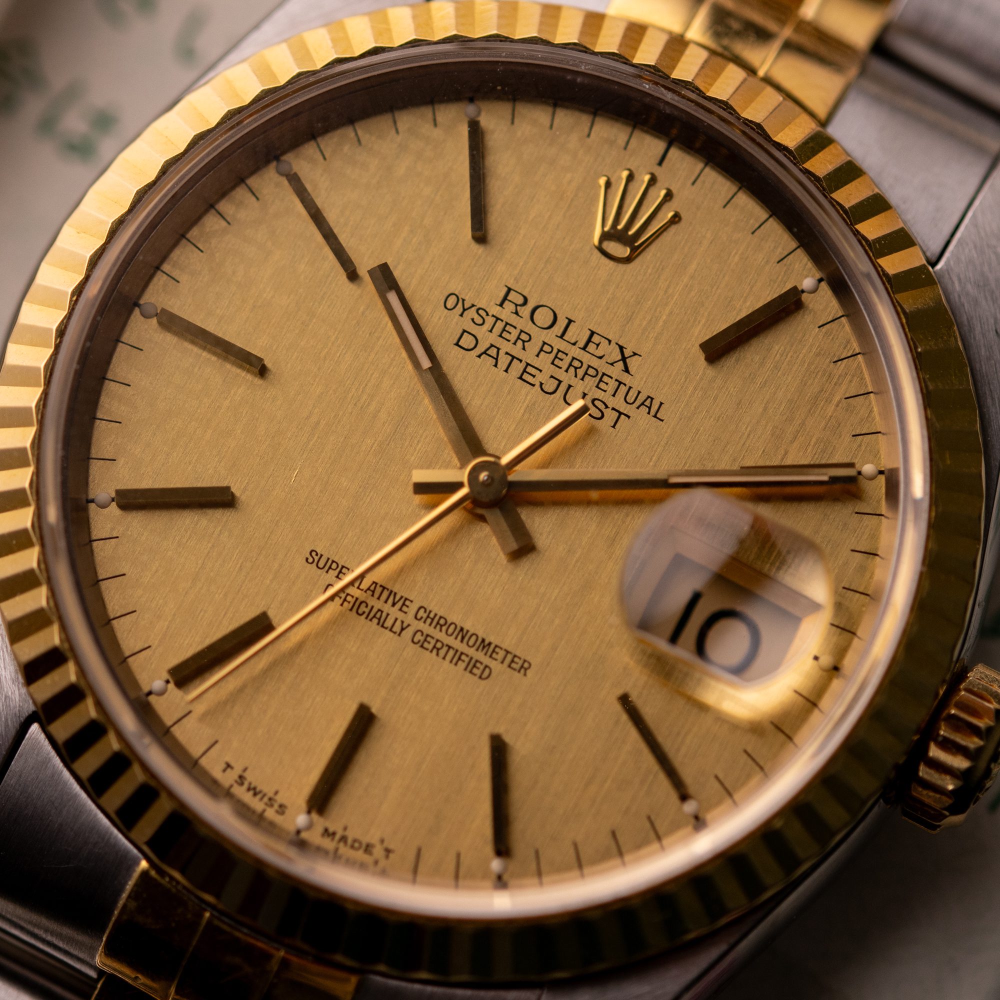 This particular piece, originally sold in 1994, features a stunning Champagne Jubilee dial, adding a touch of refinement to the design. The watch is in very good visual and mechanical condition and comes as a full set with the original box and papers, making it an excellent choice for collectors and enthusiasts alike.