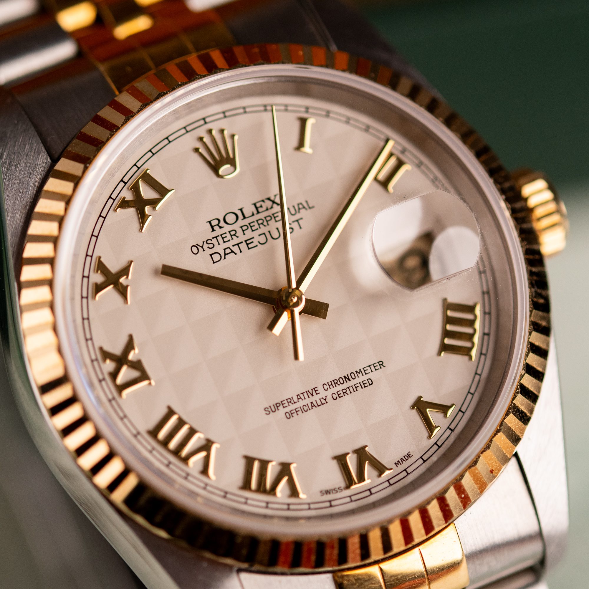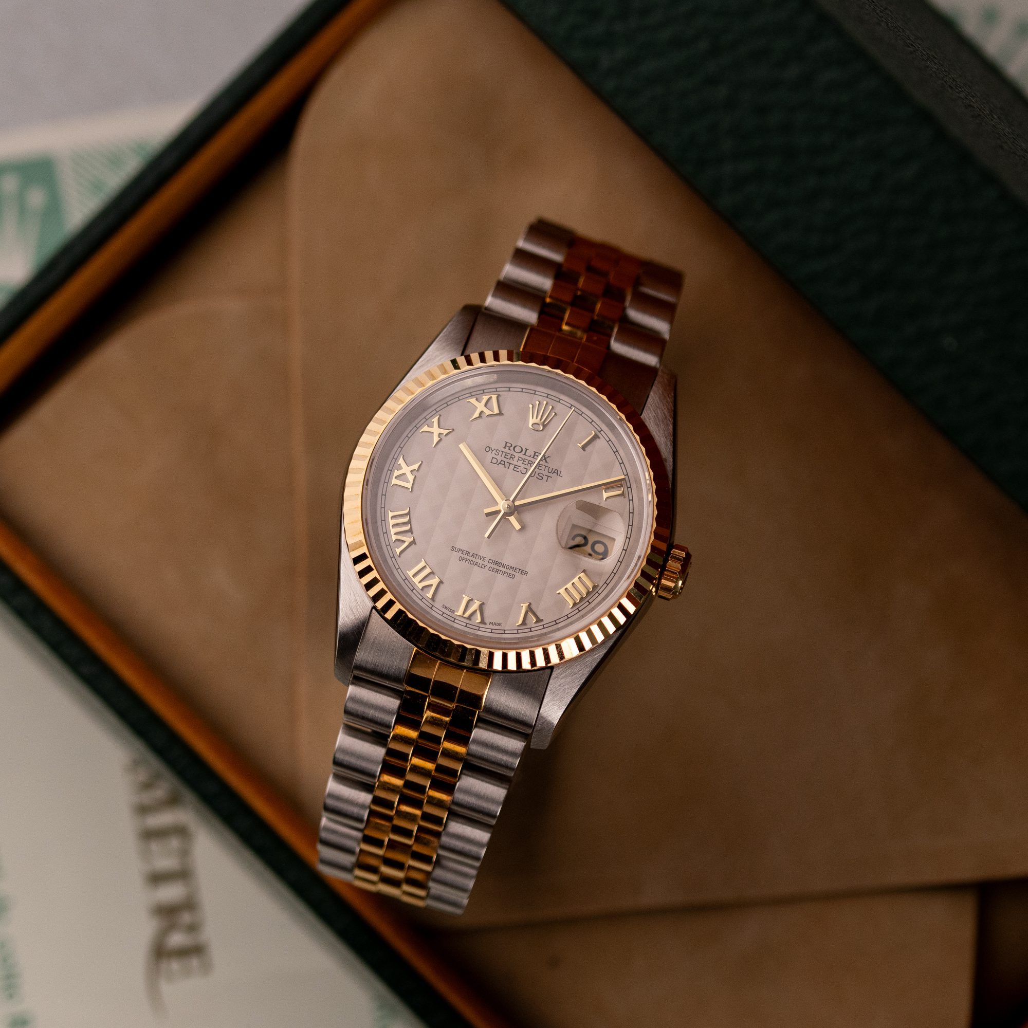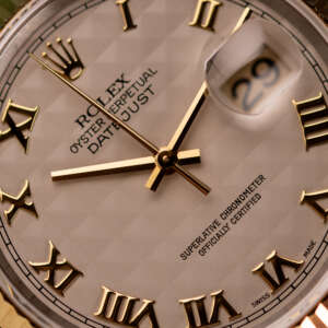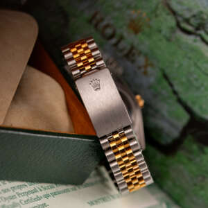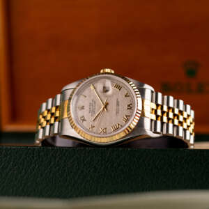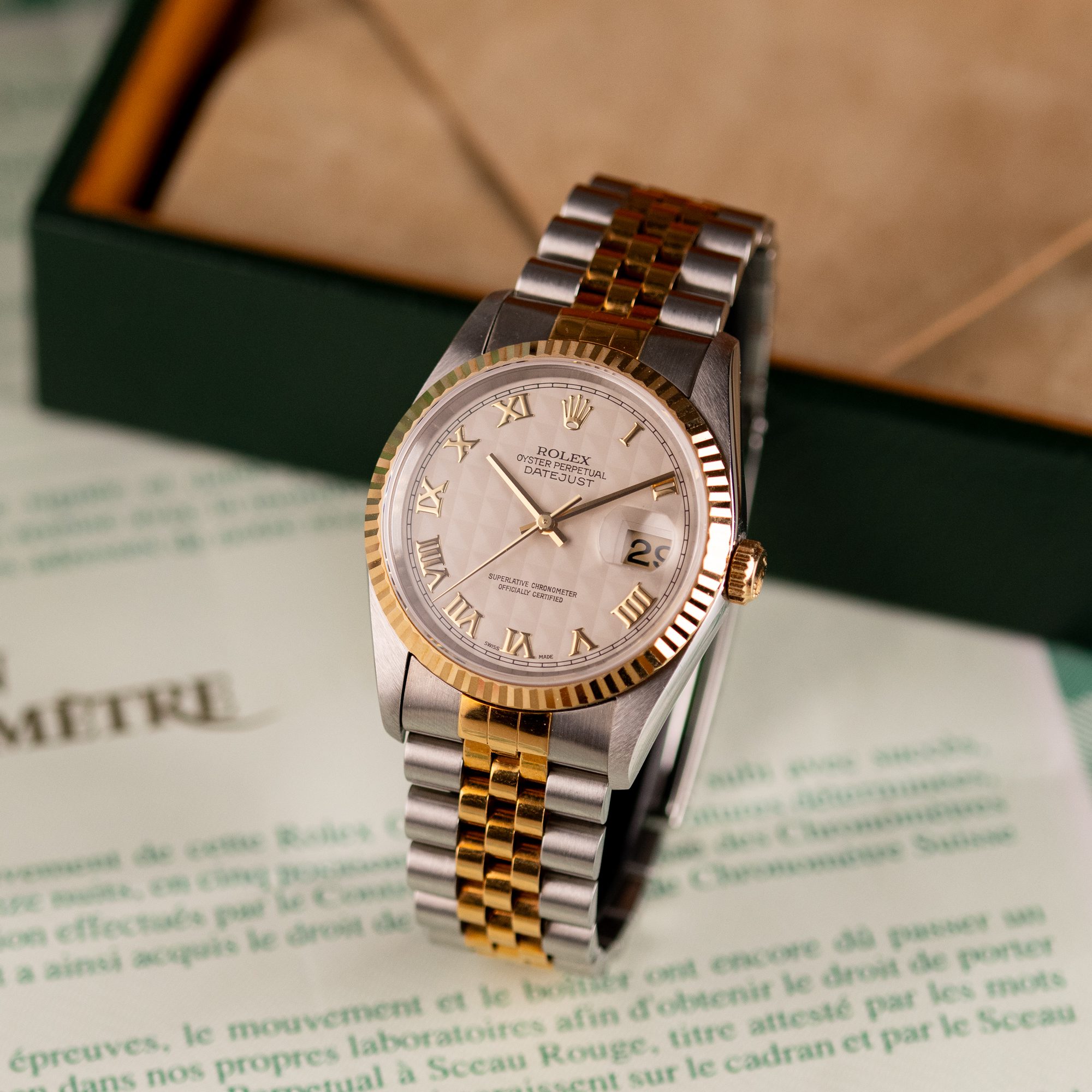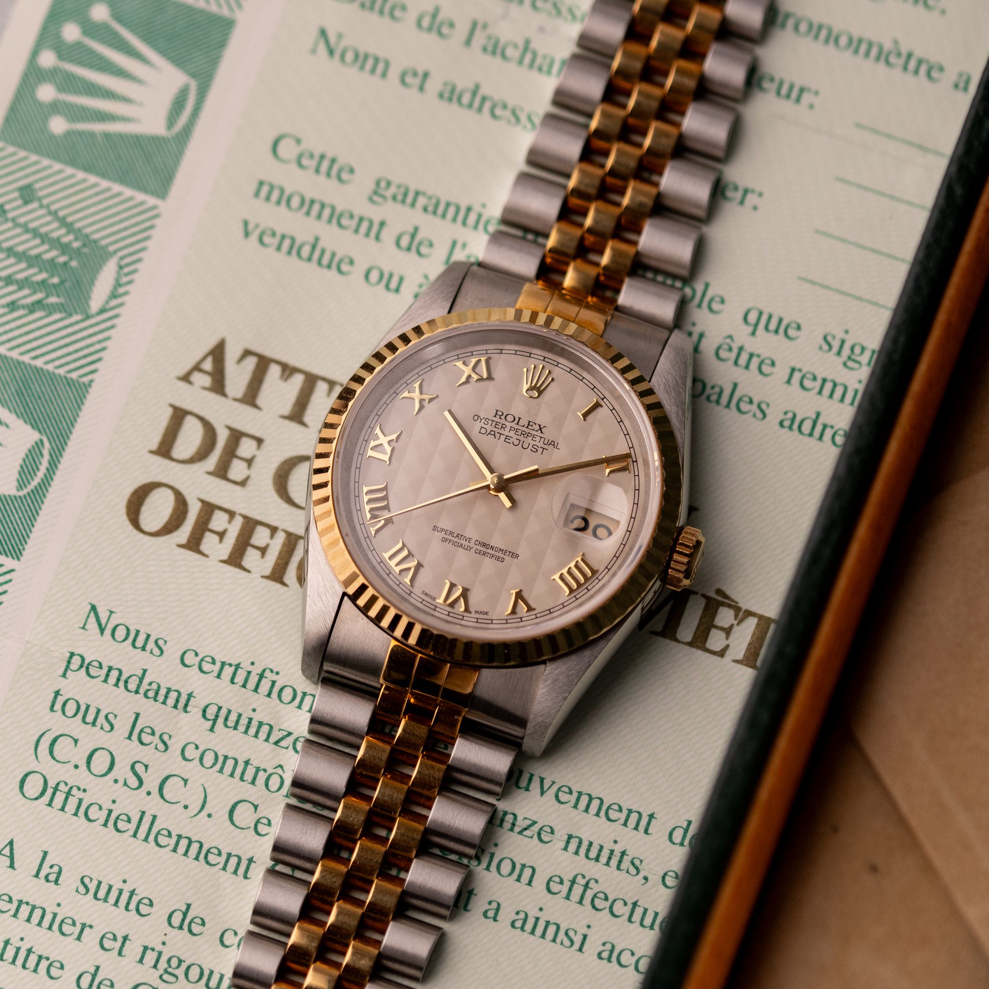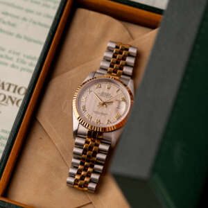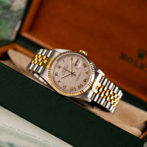 Originally sold in 1997, this example showcases a rare and striking Ivory Pyramid dial, distinguished by its unique textured pattern, and retains its original caseback sticker, highlighting its excellent condition. The fully functional automatic movement ensures precise timekeeping, while the Jubilee bracelet, sized for wrists up to 18 cm, shows no stretch, preserving its structural integrity. Presented as a full set with its original Rolex box and papers, this Datejust is an exceptional choice for collectors or those seeking a pristine vintage timepiece.