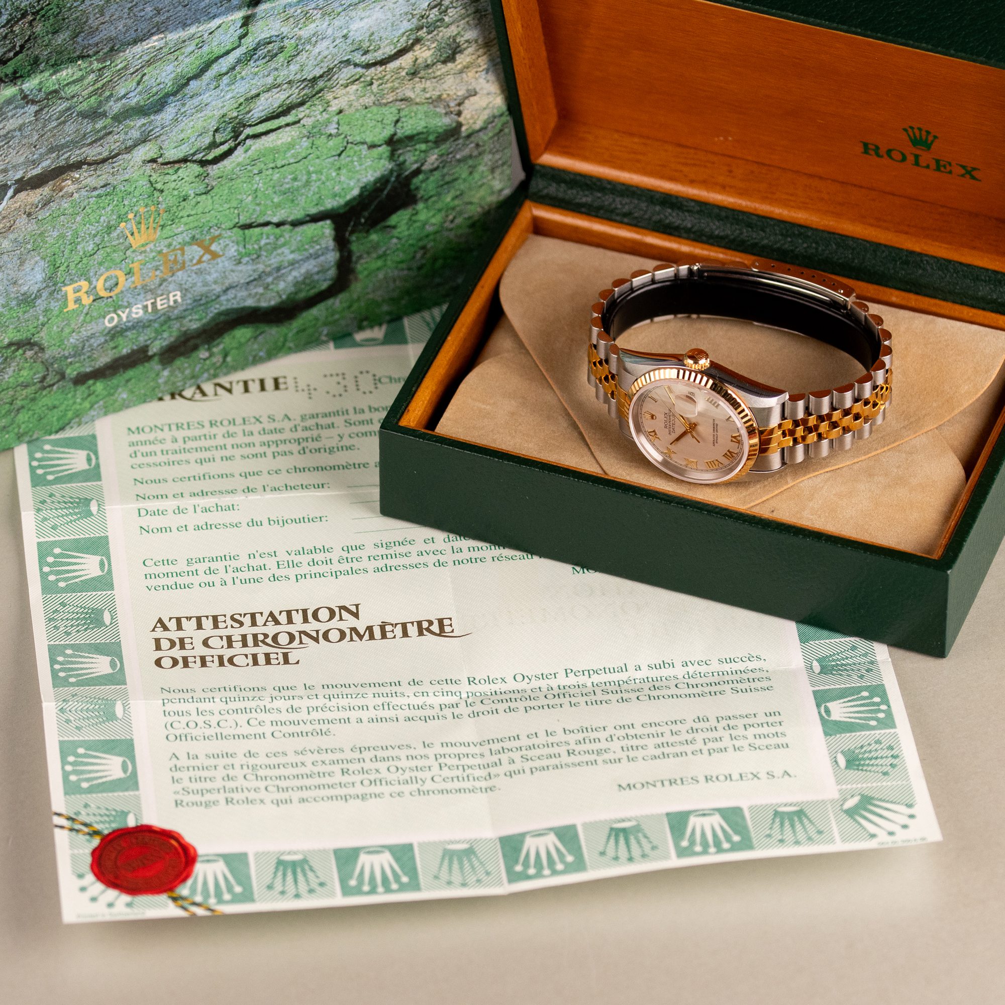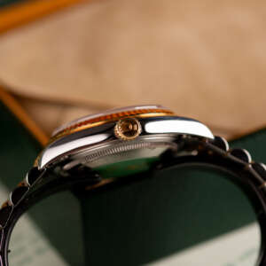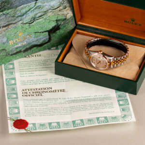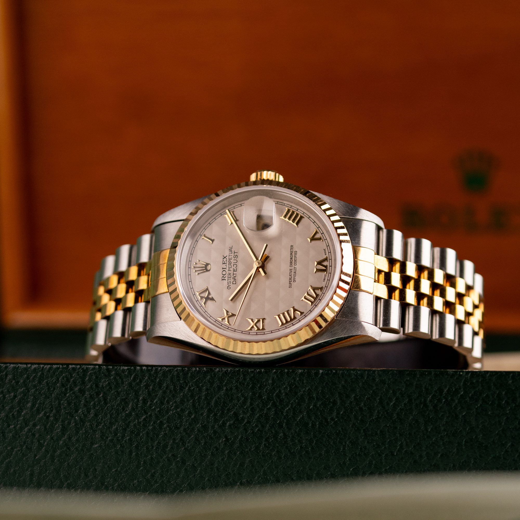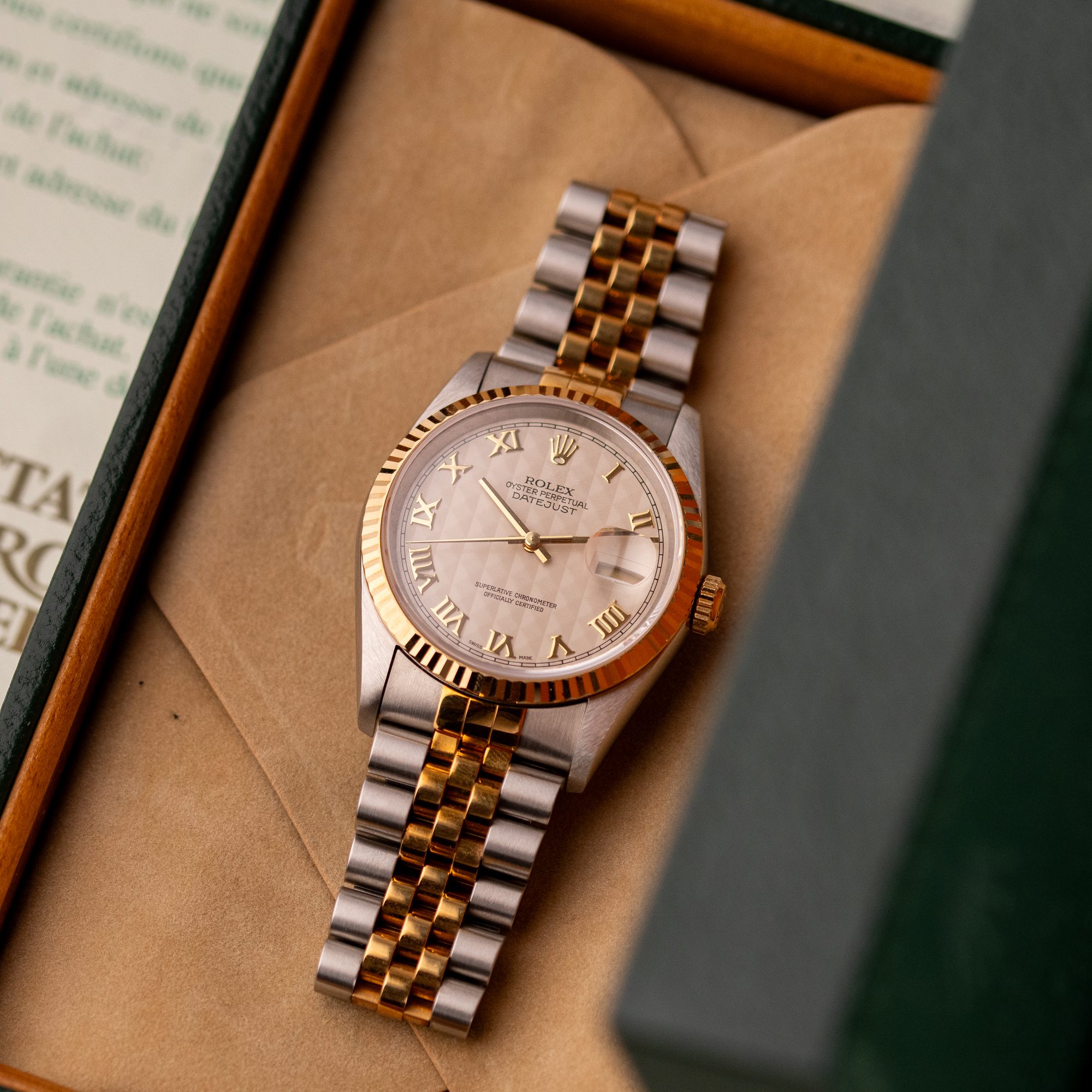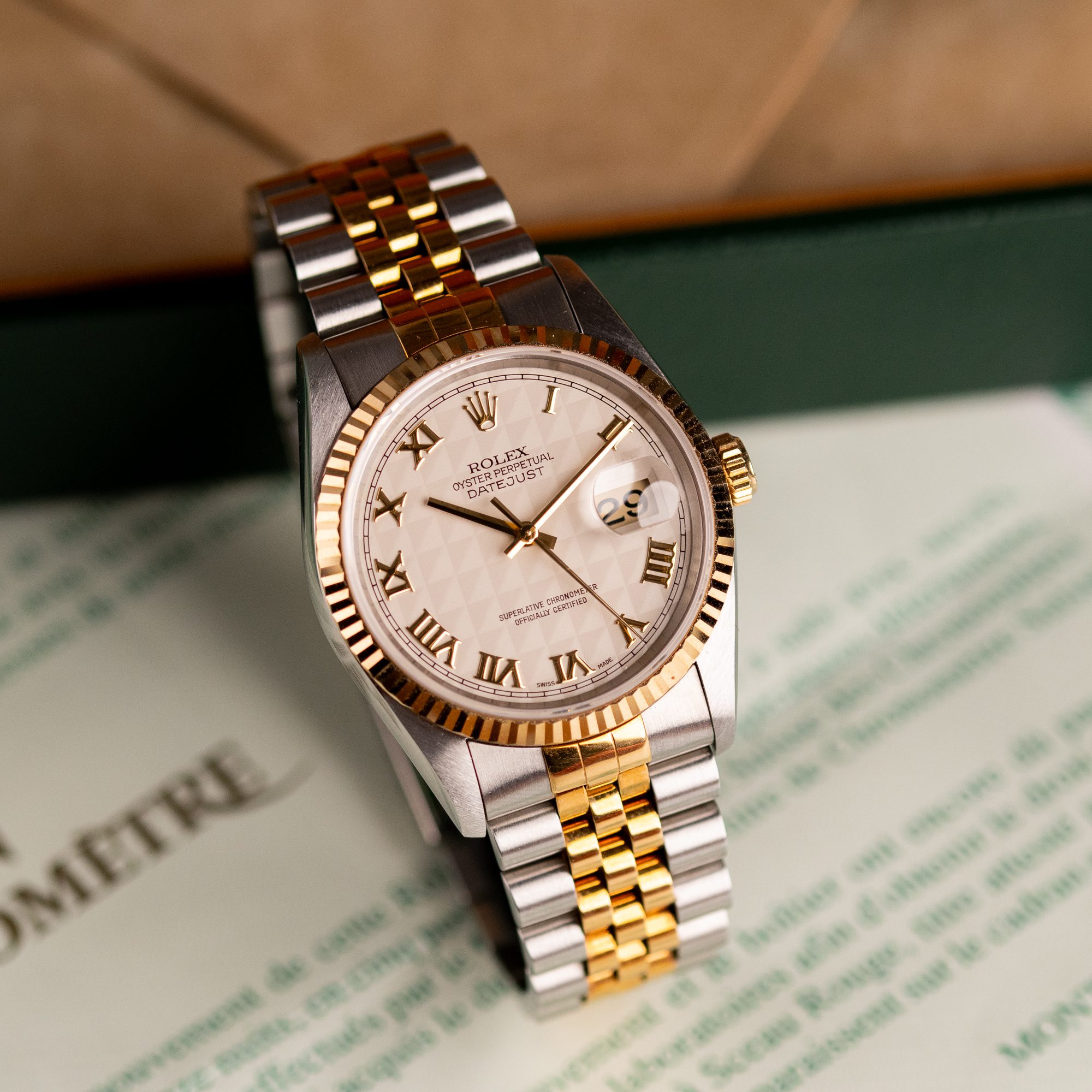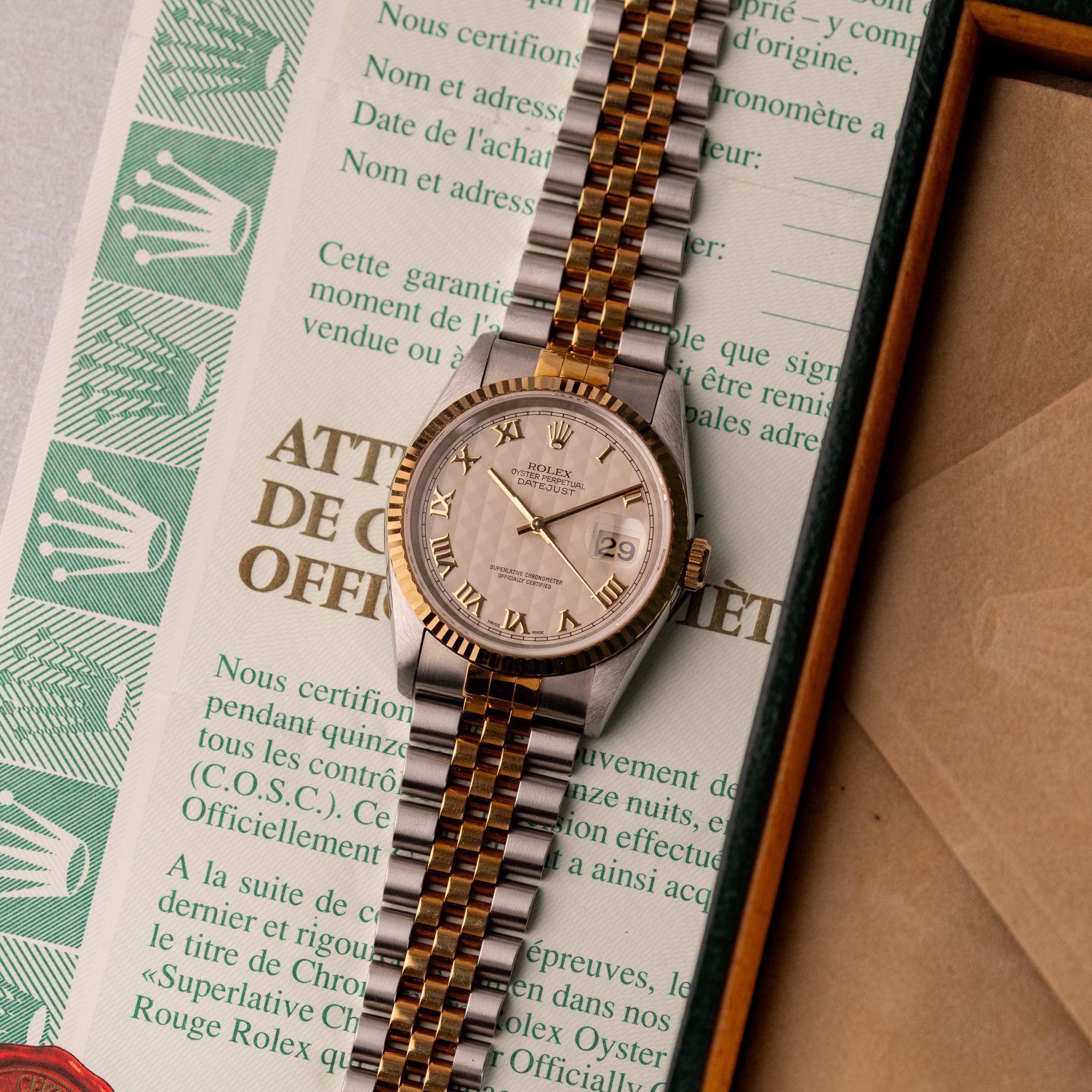 Originally sold in 1997, this example showcases a rare and striking Ivory Pyramid dial, distinguished by its unique textured pattern, and retains its original caseback sticker, highlighting its excellent condition. The fully functional automatic movement ensures precise timekeeping, while the Jubilee bracelet, sized for wrists up to 18 cm, shows no stretch, preserving its structural integrity. Presented as a full set with its original Rolex box and papers, this Datejust is an exceptional choice for collectors or those seeking a pristine vintage timepiece.