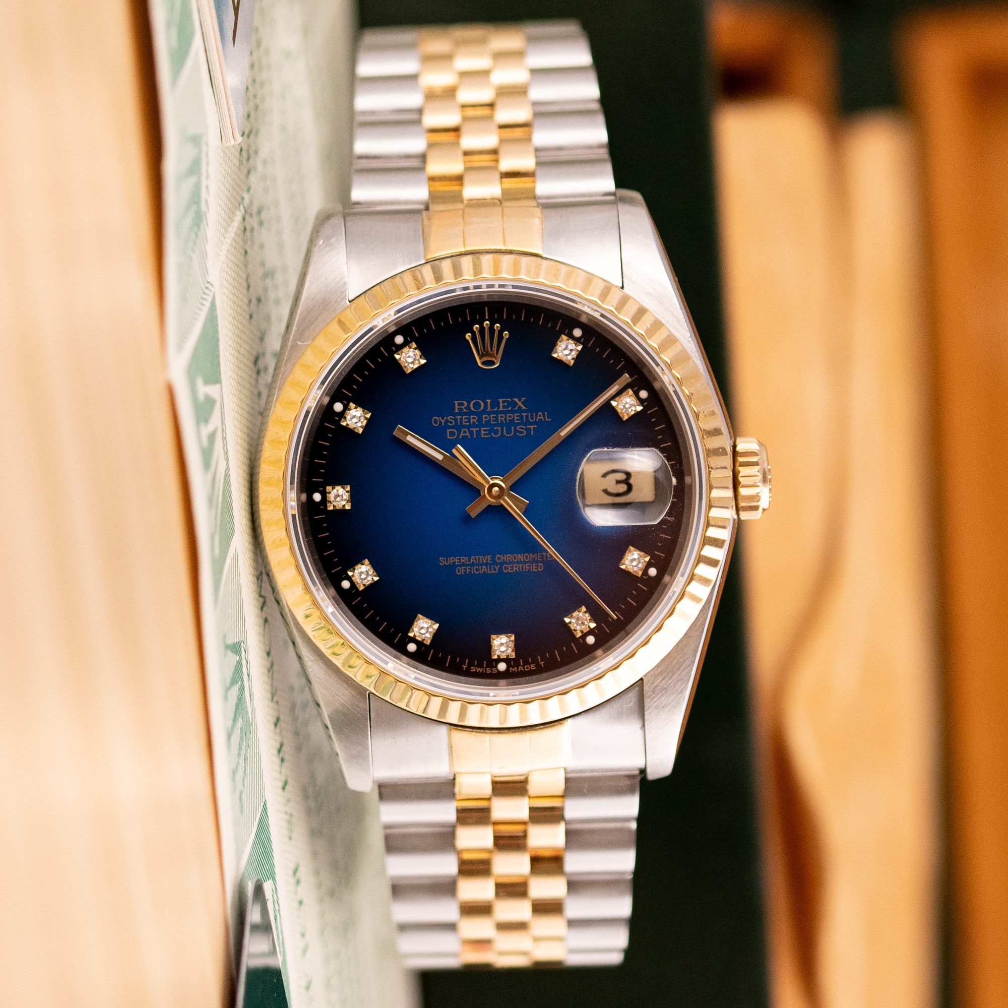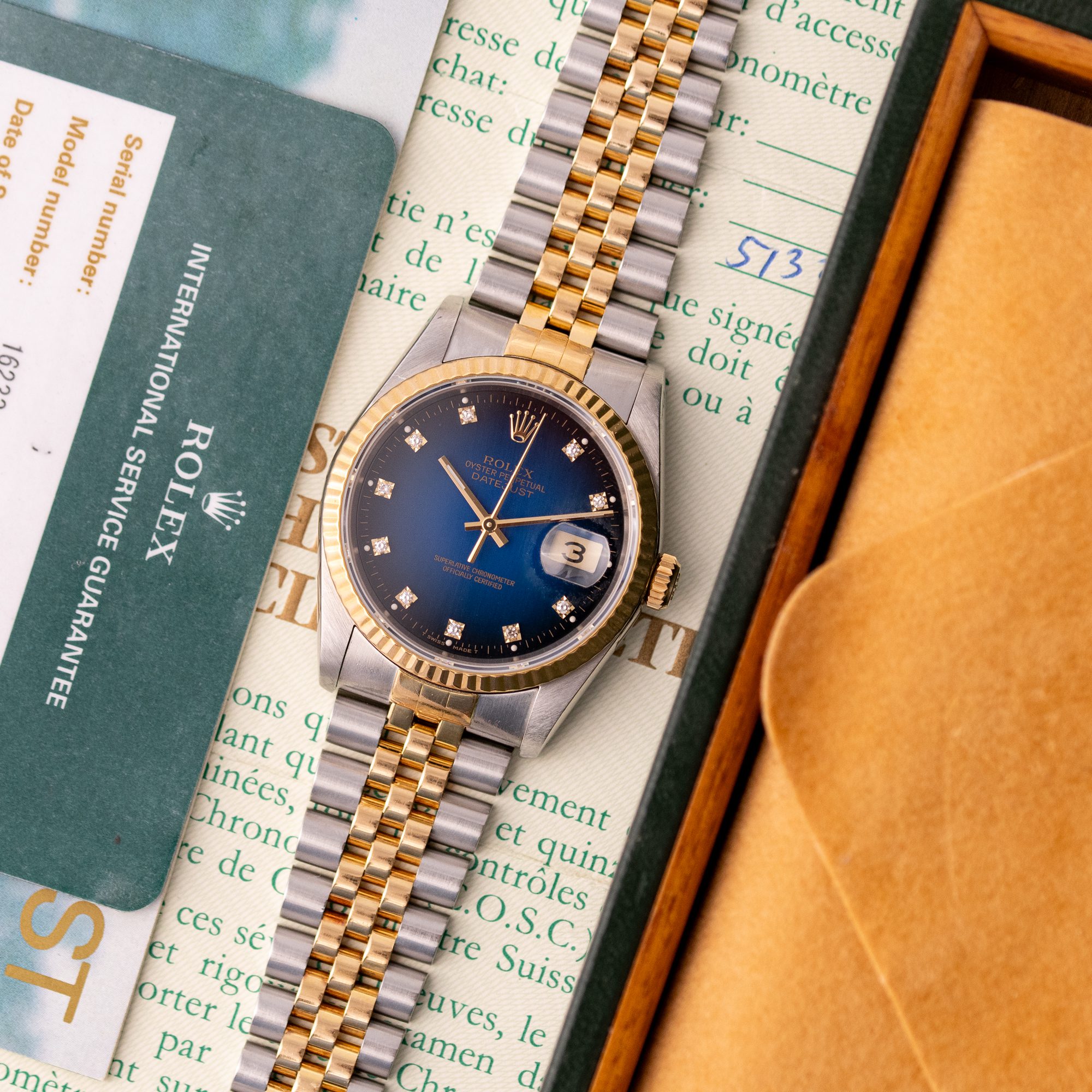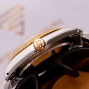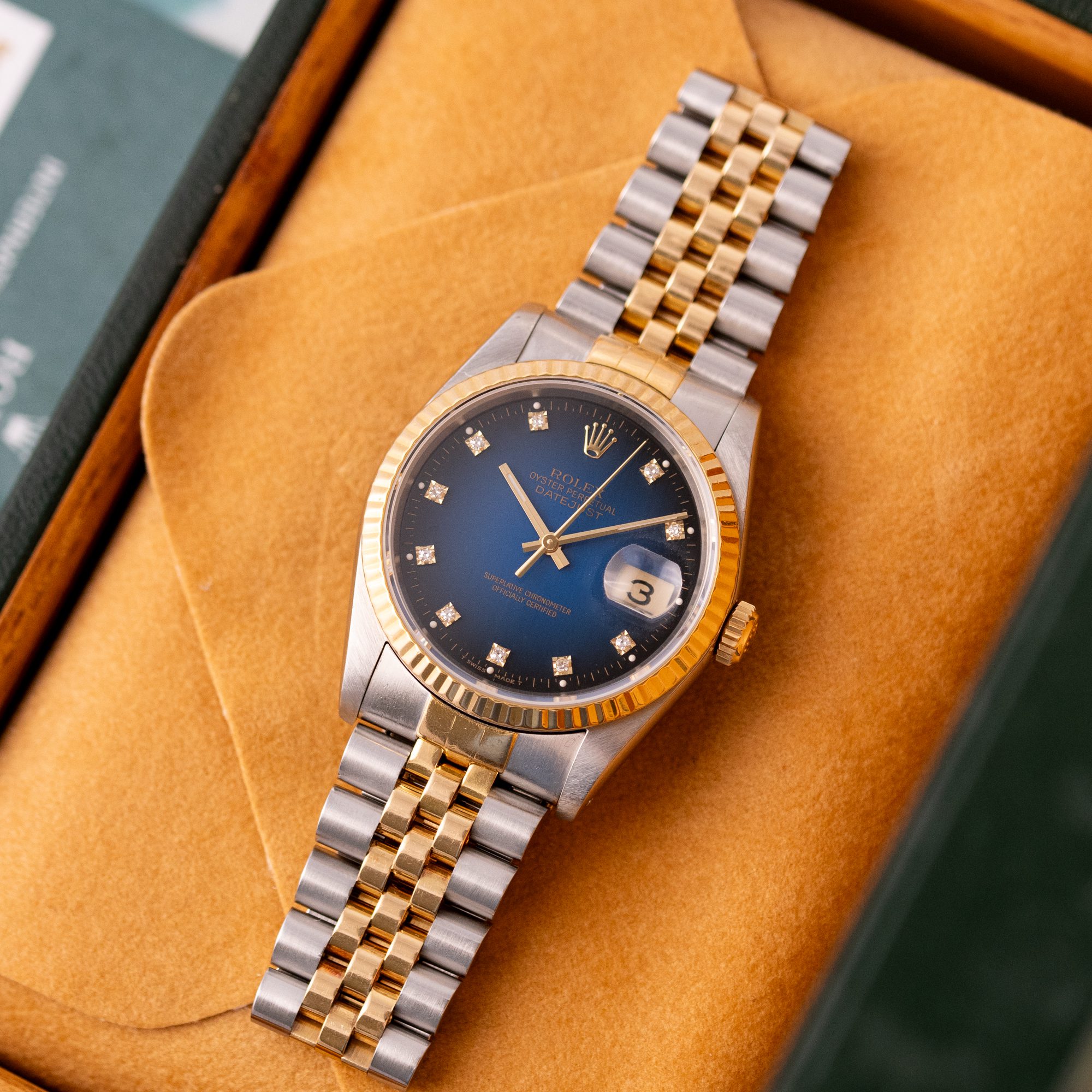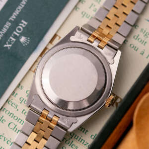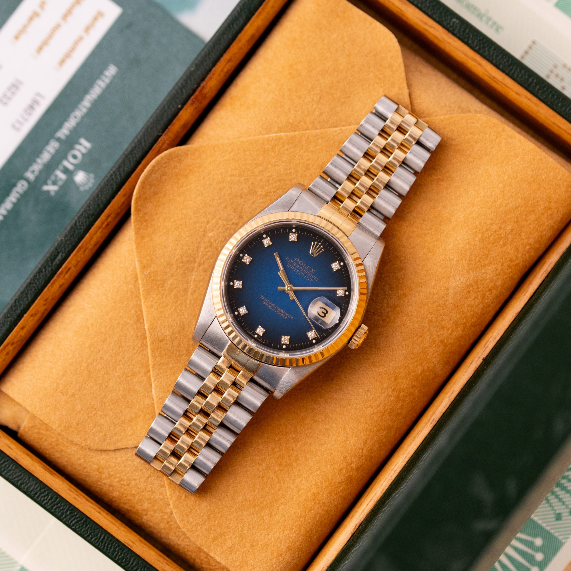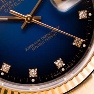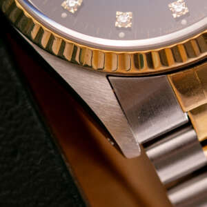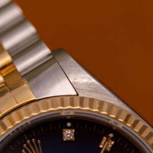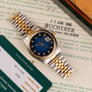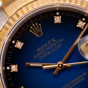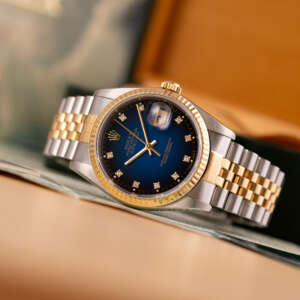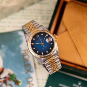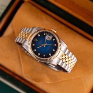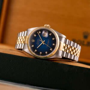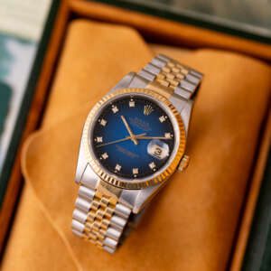 The Rolex Datejust 36 ref. 16233G is a timeless classic that combines elegance with everyday versatility. What makes this model truly stand out is the rare and highly sought-after Blue Vignette dial, beautifully complemented by diamond hour markers and a two-tone stainless steel and yellow gold case and bracelet.