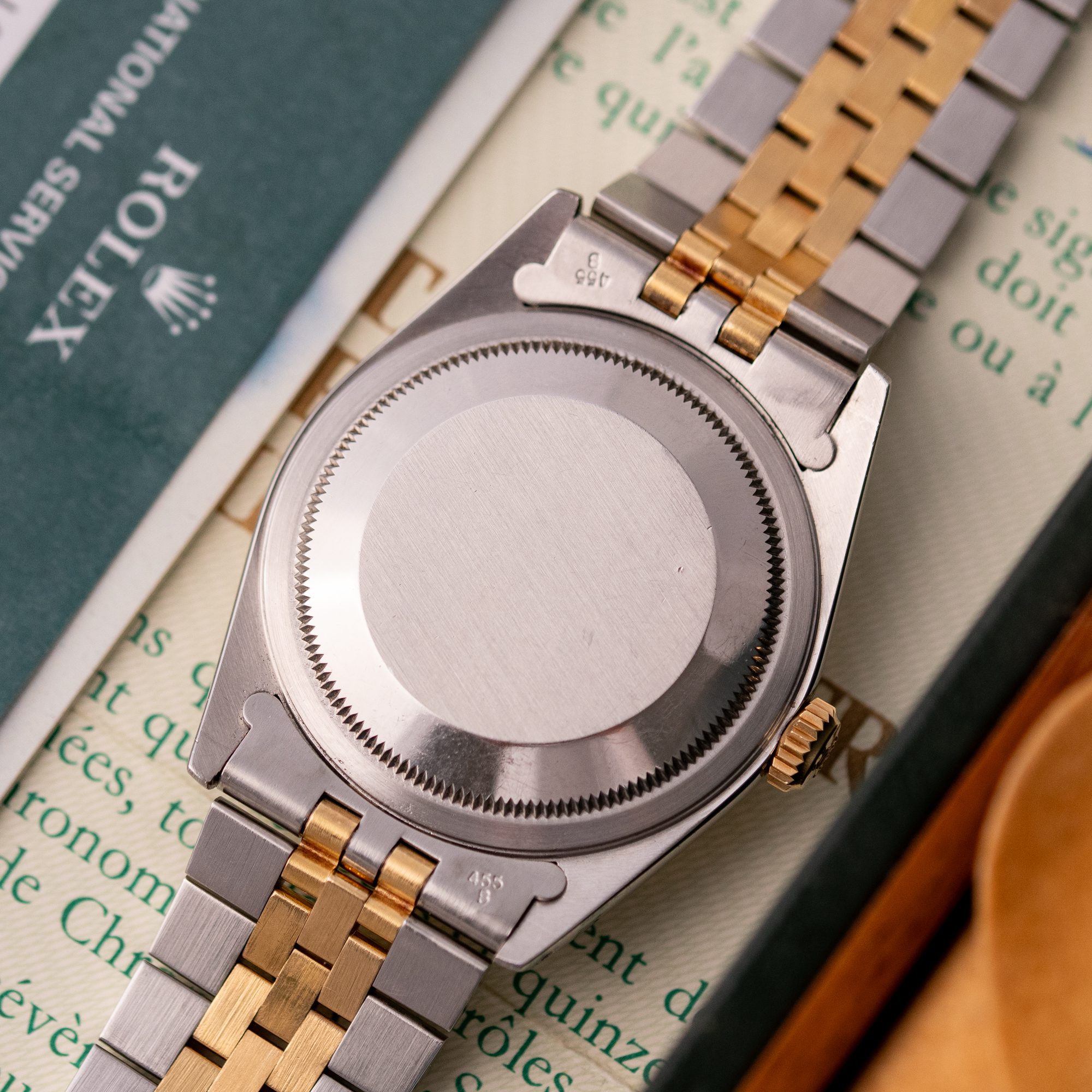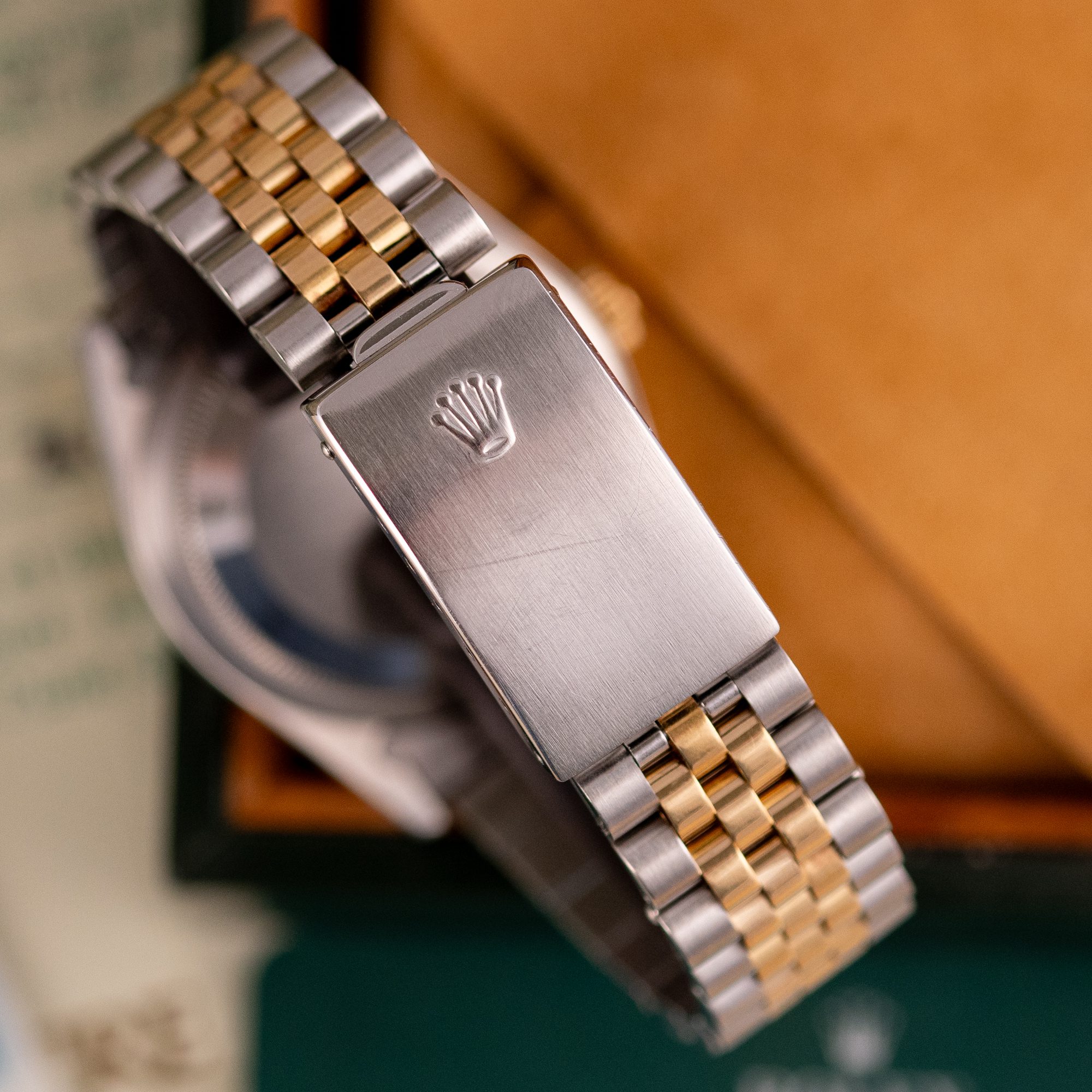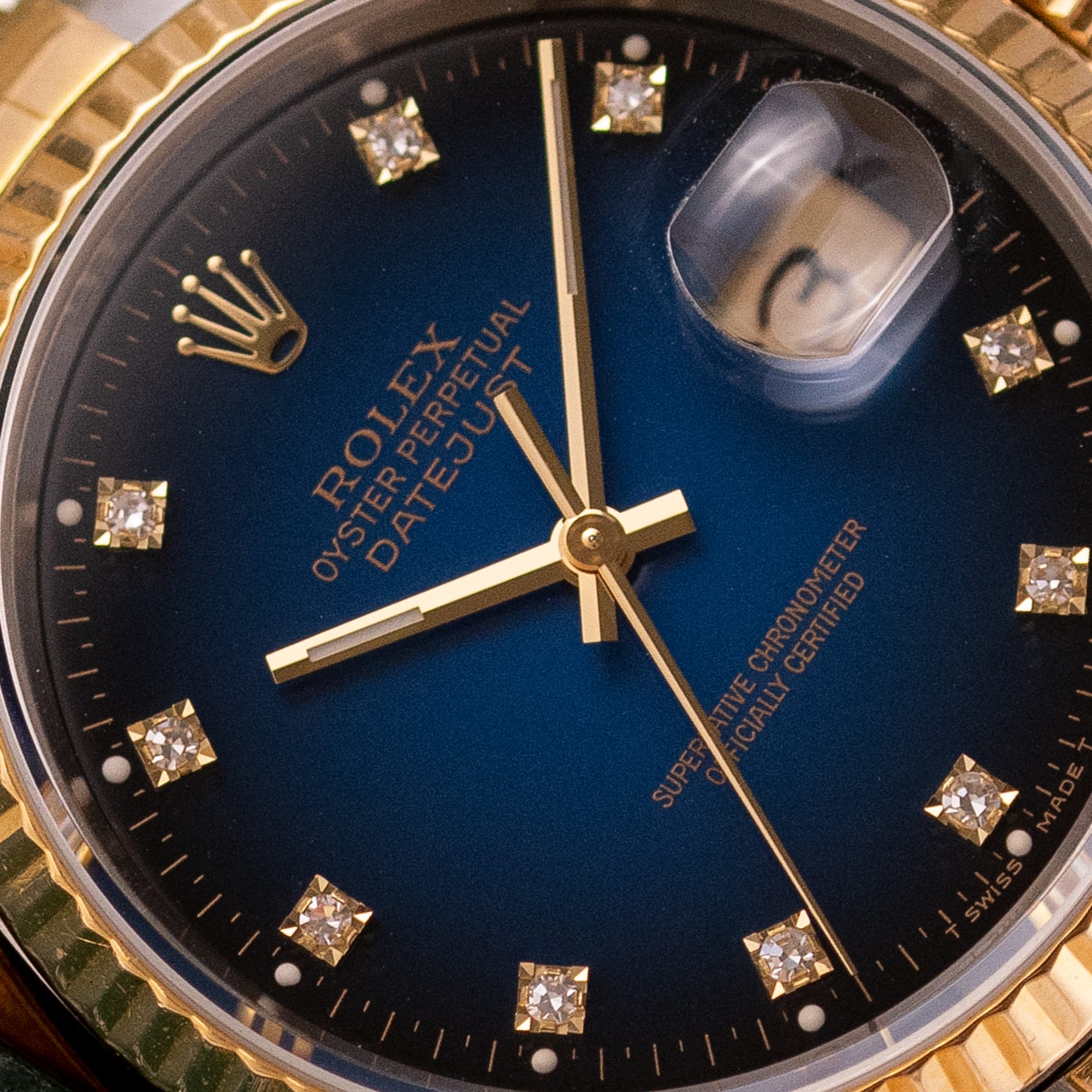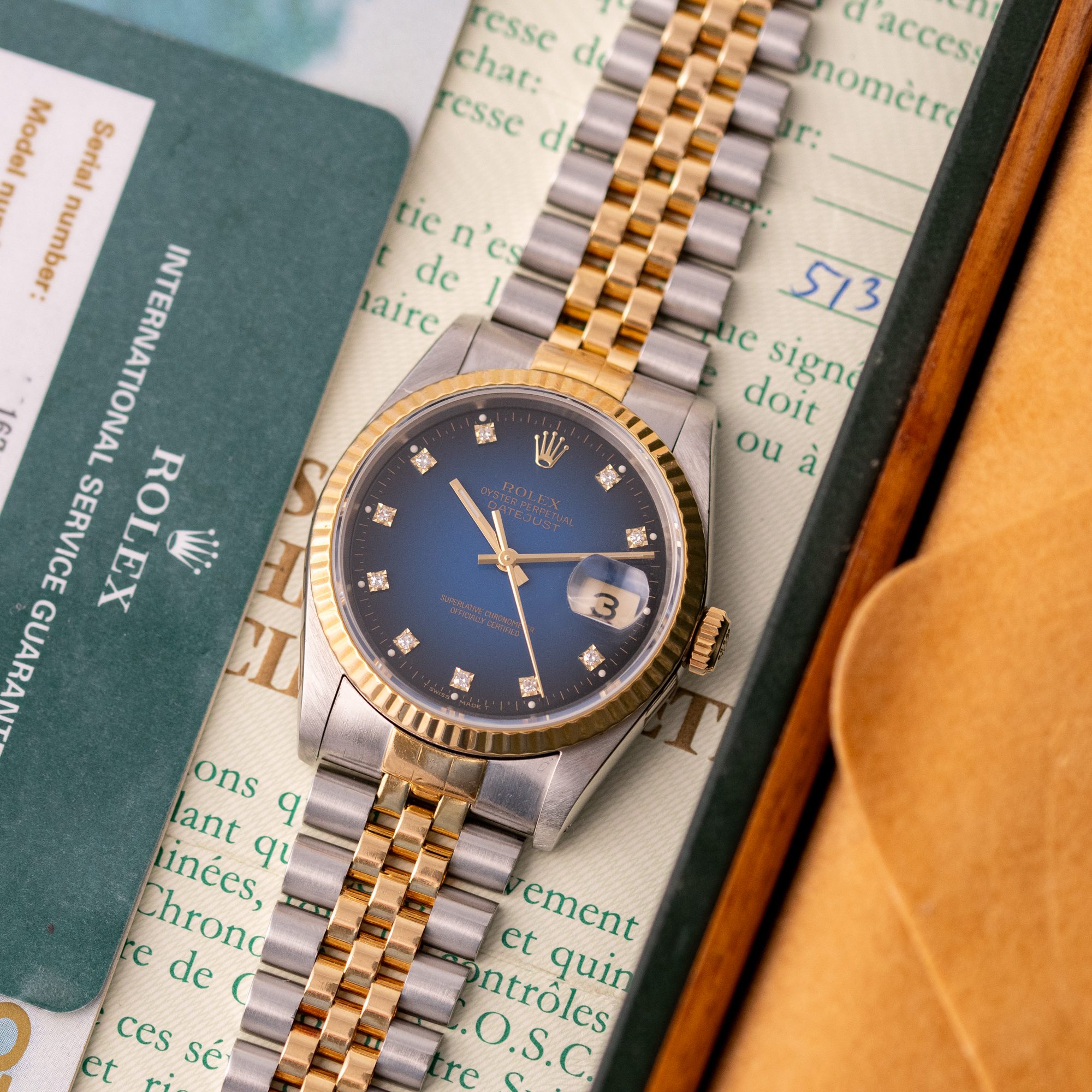 The Rolex Datejust 36 ref. 16233G is a timeless classic that combines elegance with everyday versatility. What makes this model truly stand out is the rare and highly sought-after Blue Vignette dial, beautifully complemented by diamond hour markers and a two-tone stainless steel and yellow gold case and bracelet.