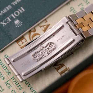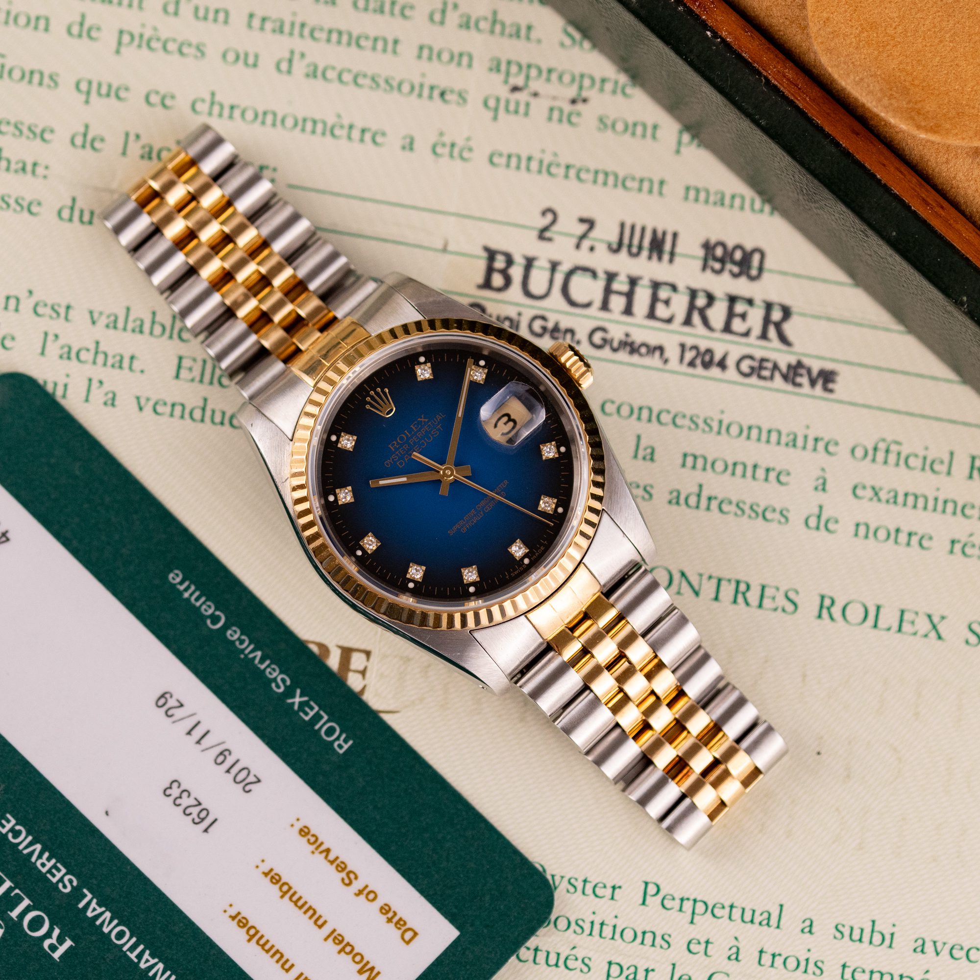 This particular example was originally sold in 1990 at Bucherer in Geneva. It is in great condition, featuring a stretch-free bracelet that fits wrists up to 18 cm. Mechanically, the watch is fully functional. It comes as a full set with the original box and papers, making it a rare and collectible piece for any serious enthusiast.