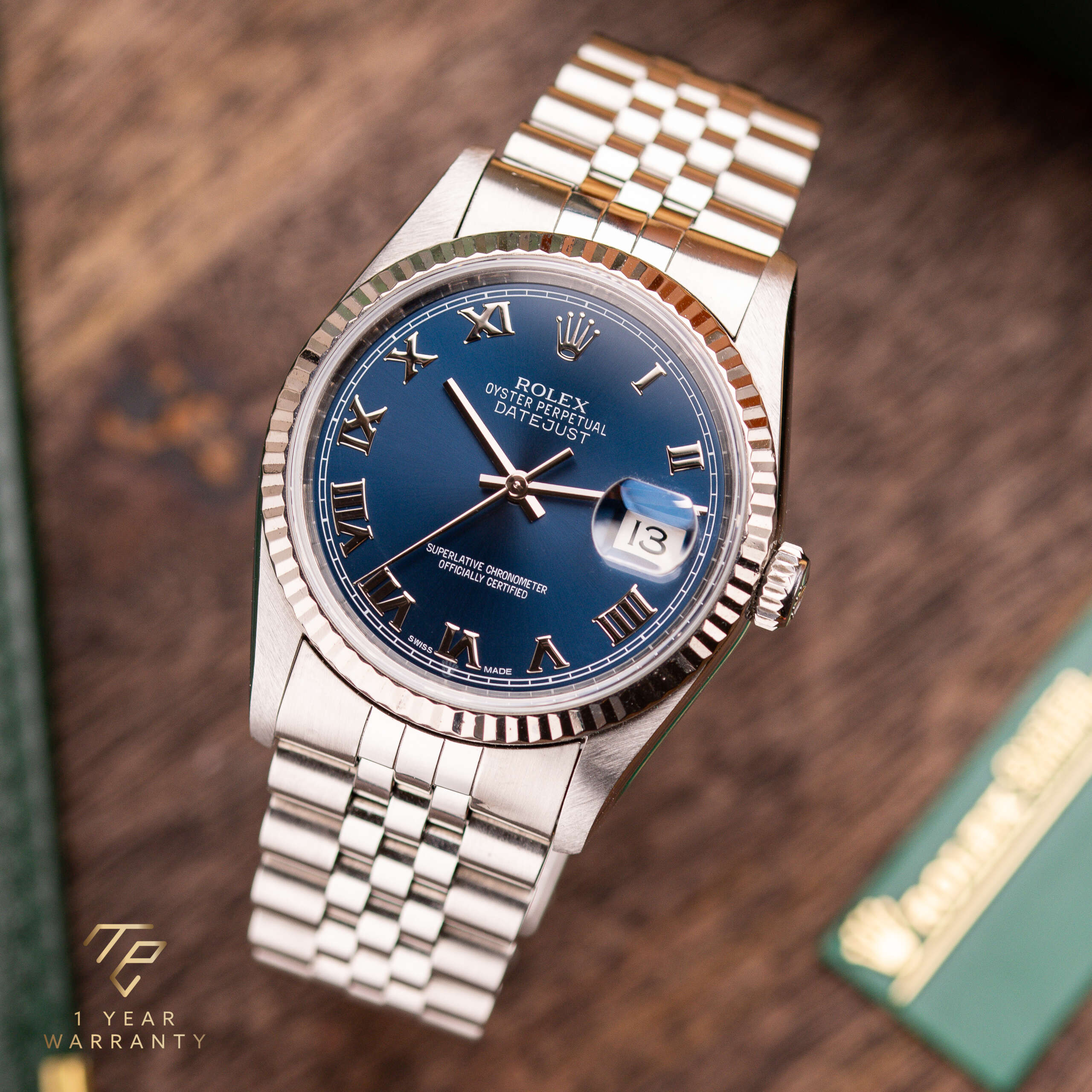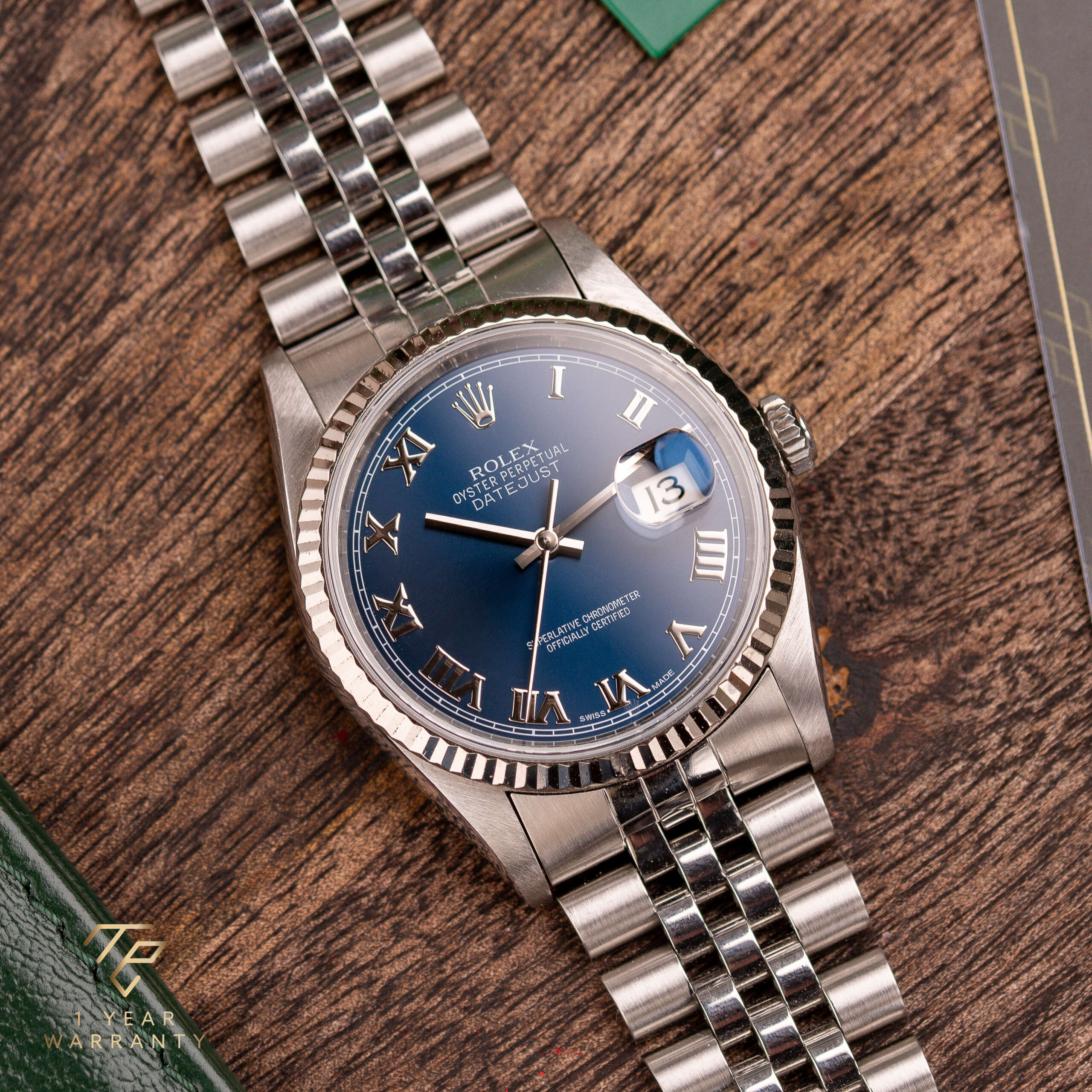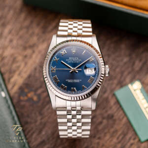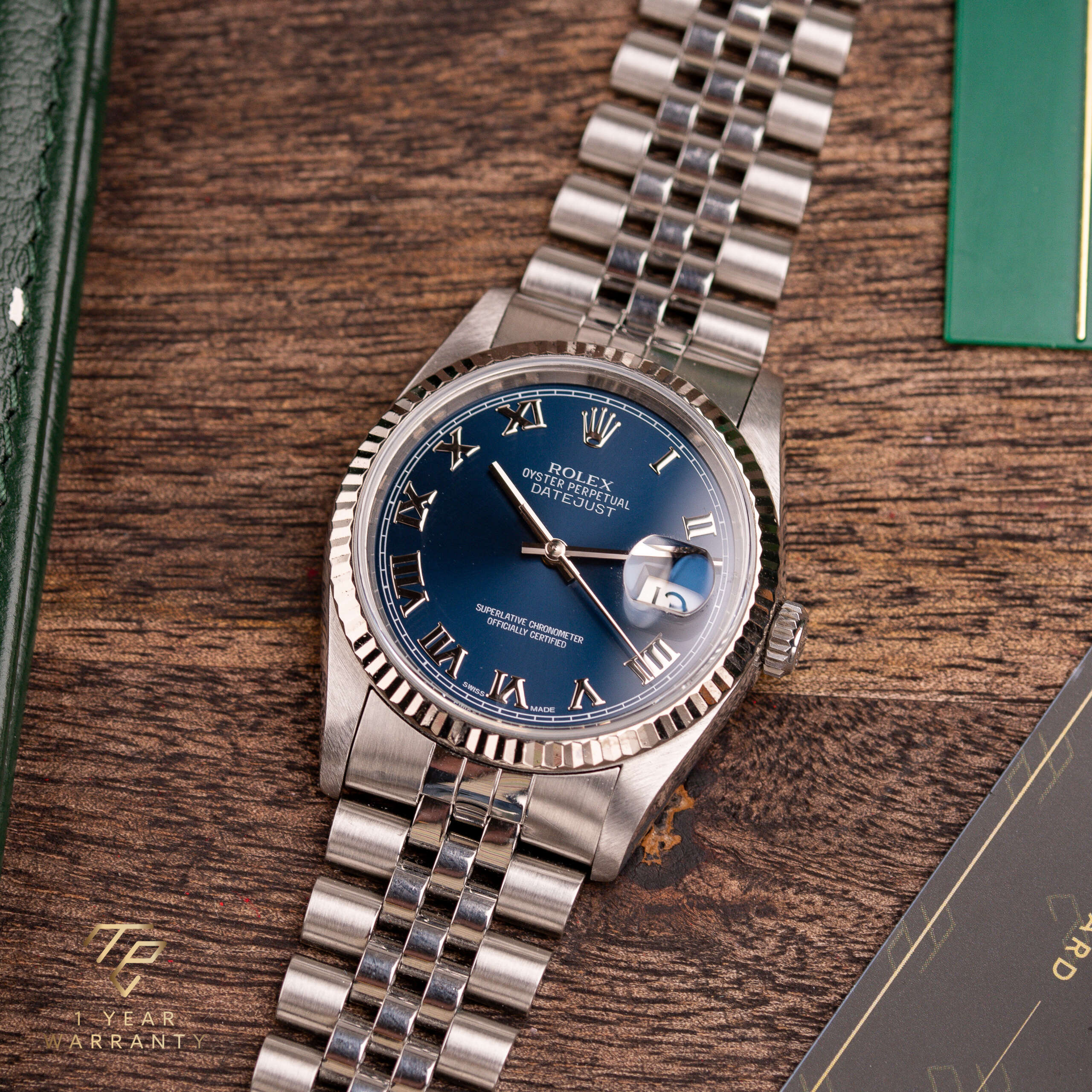 This particular piece, from 1993, features a stunning Blue Roman dial, adding a sophisticated touch to the design. The watch comes with the original box, making it an excellent addition to any collection.