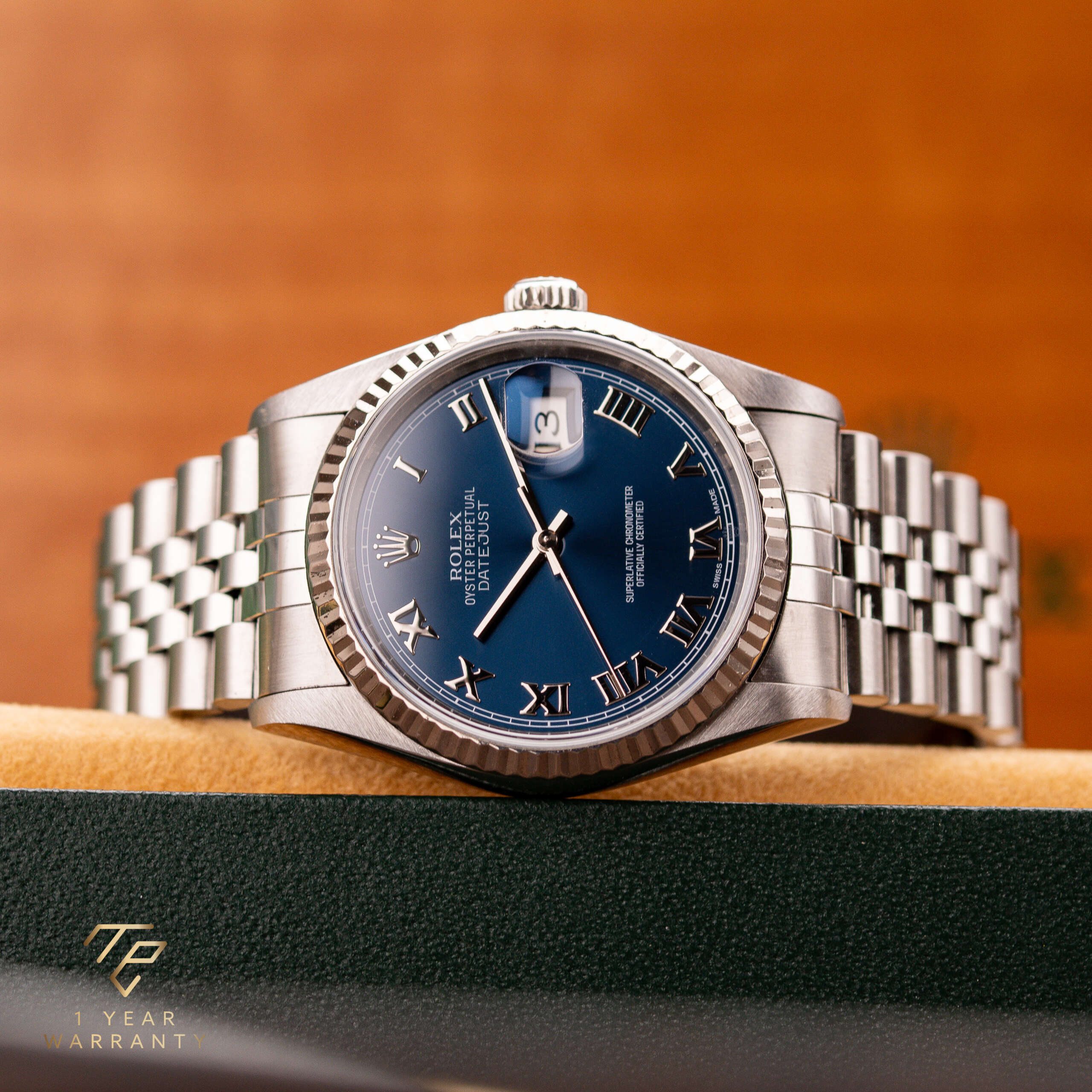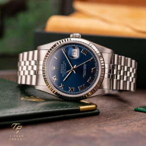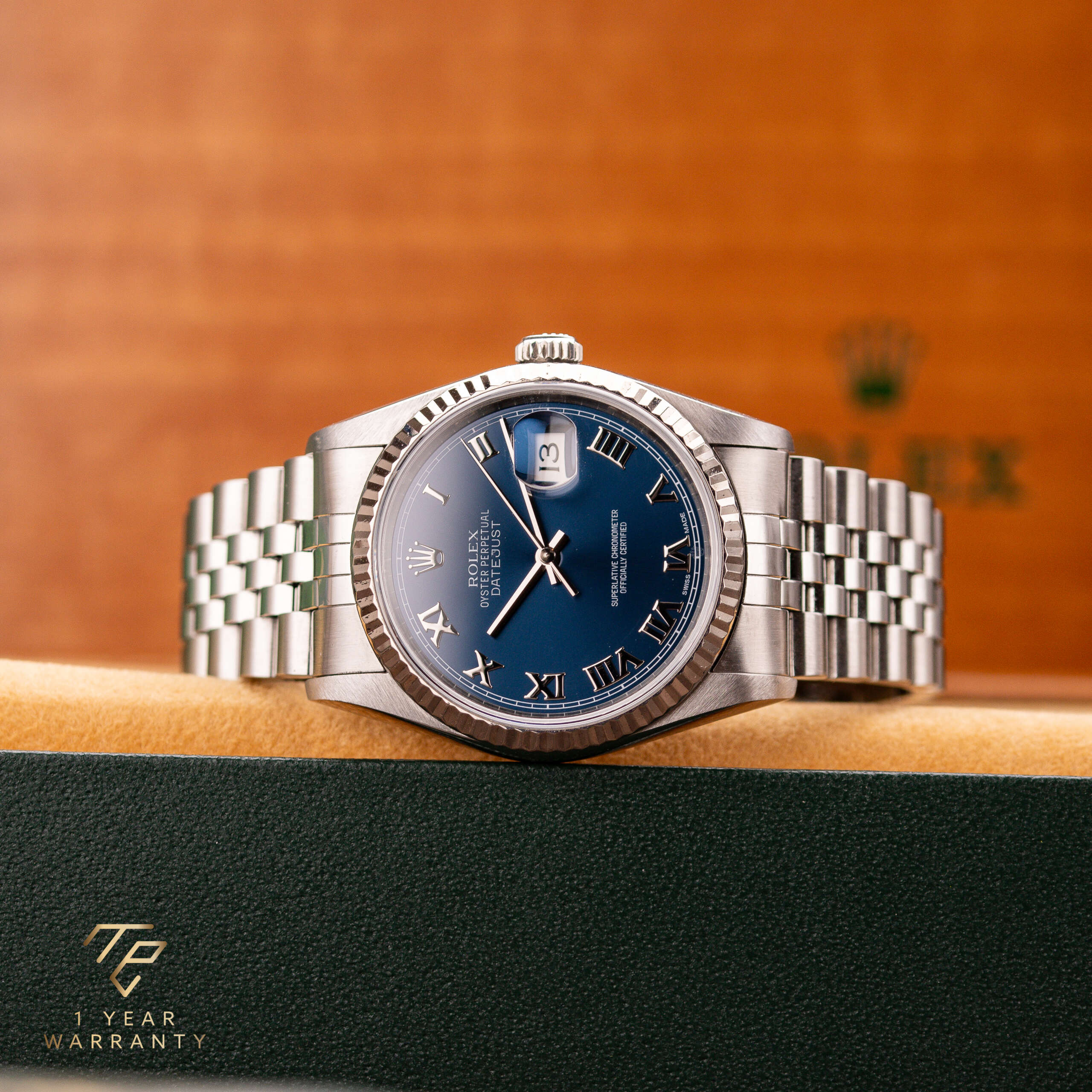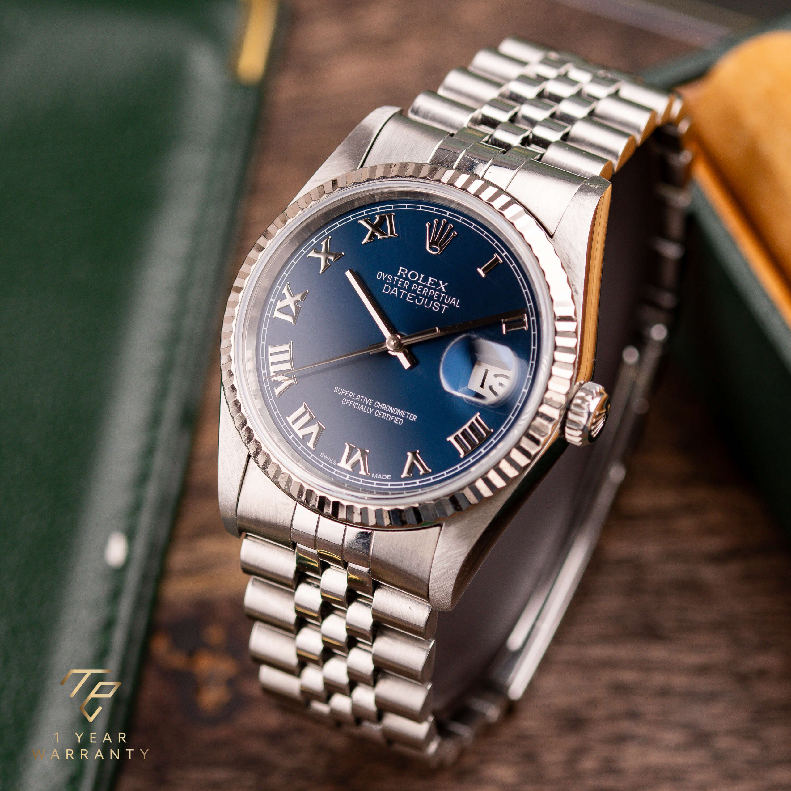 This particular piece, from 1993, features a stunning Blue Roman dial, adding a sophisticated touch to the design. The watch comes with the original box, making it an excellent addition to any collection.