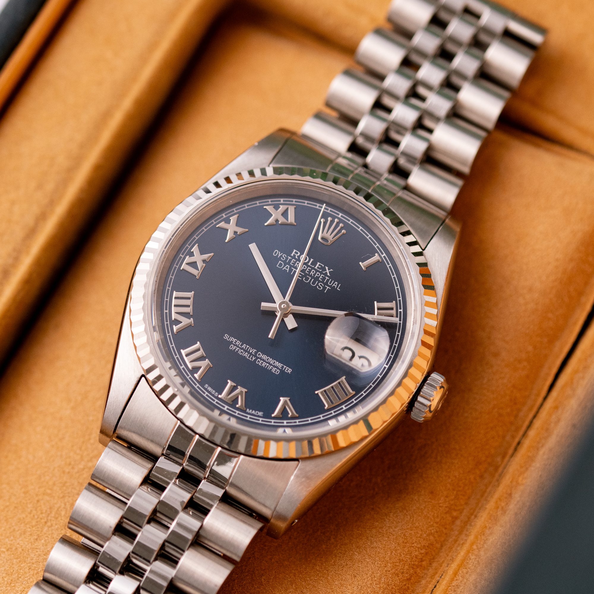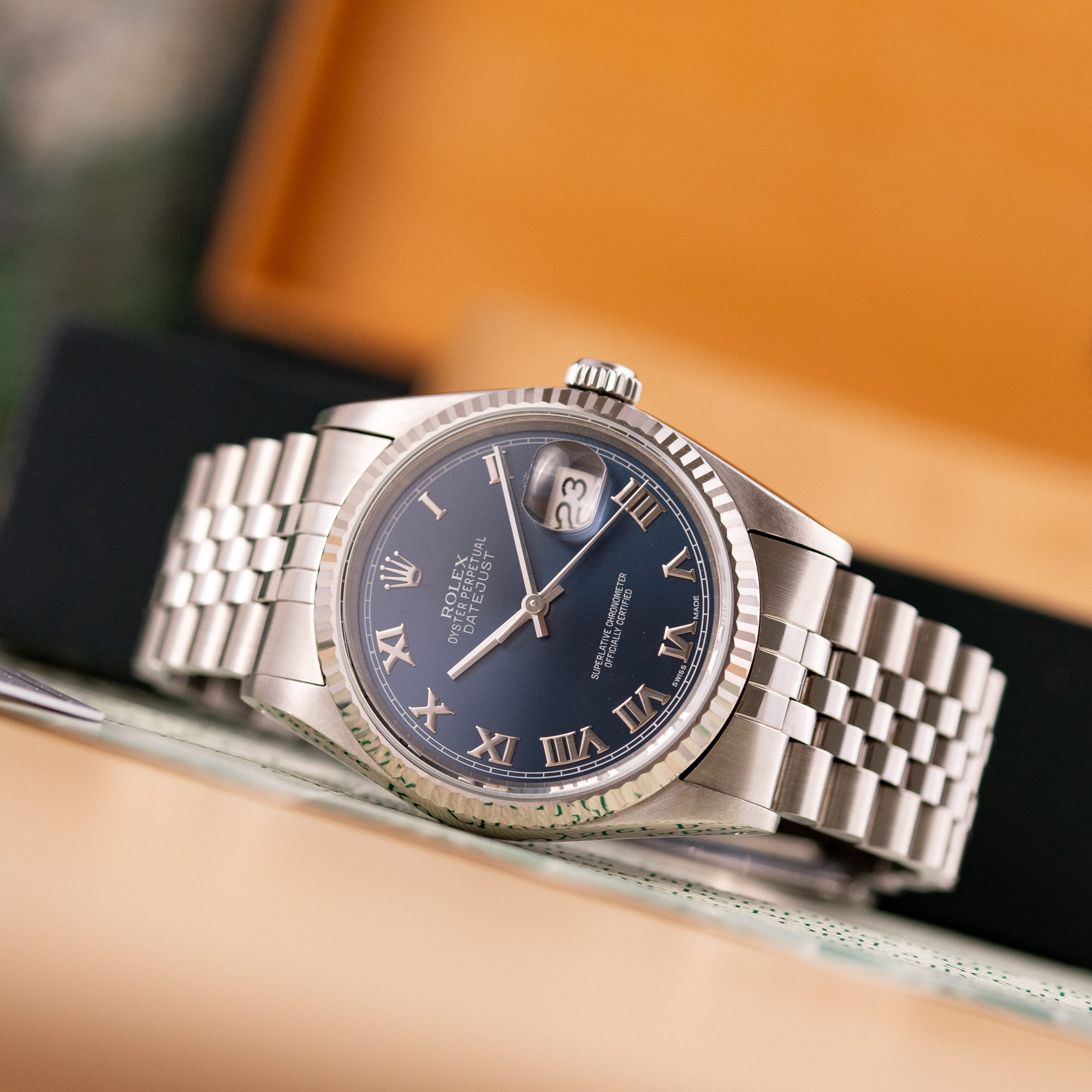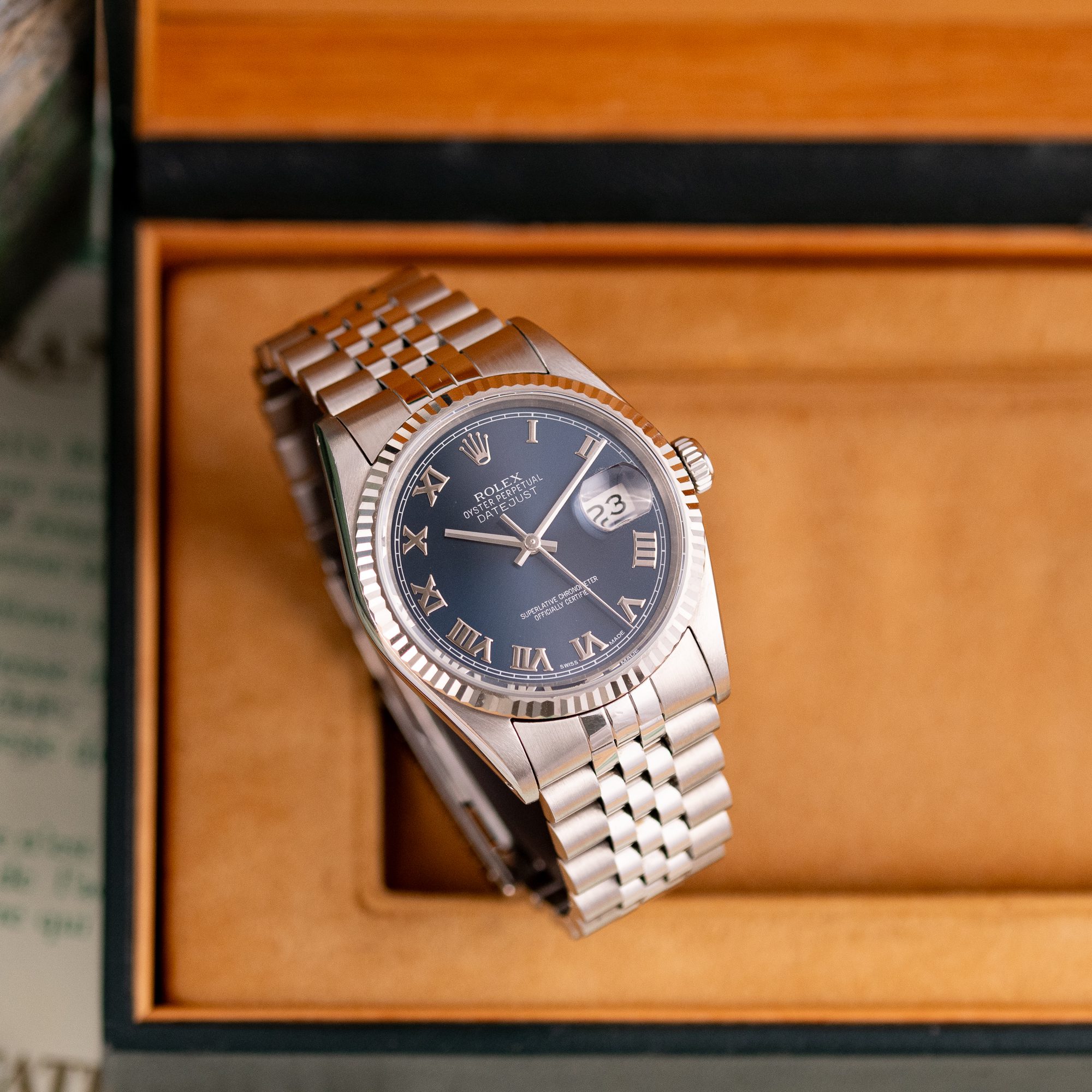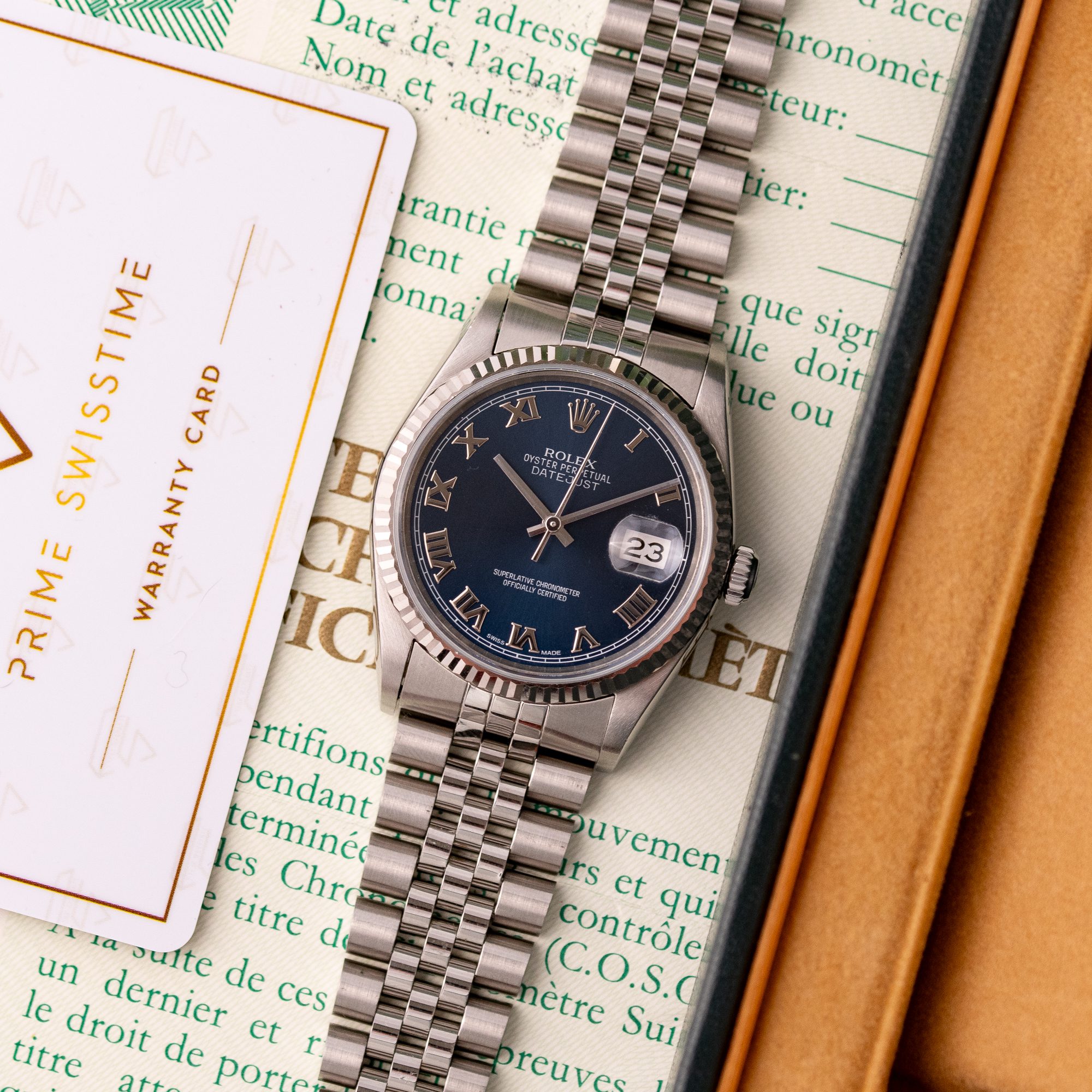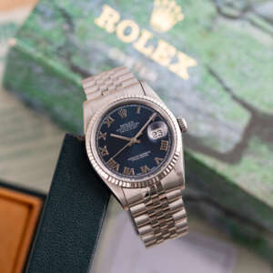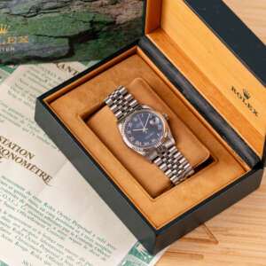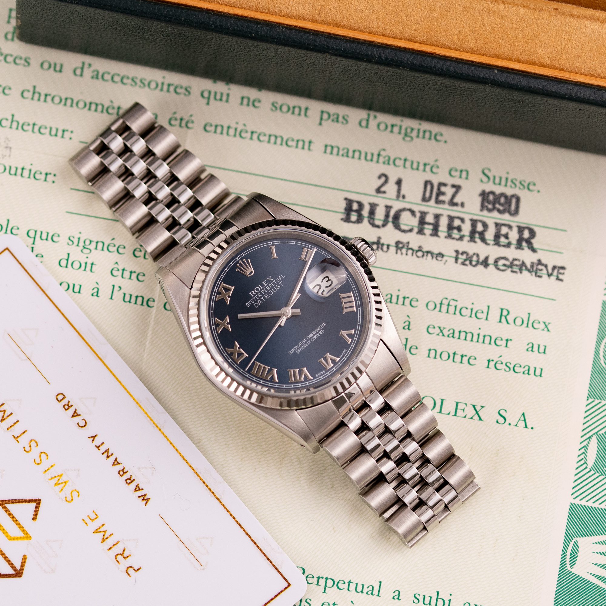 This particular piece, originally sold in 1990 at Bucherer in Geneva, features a beautiful Blue Roman dial that adds a refined and classic touch. The watch is in very good condition, mechanically fully functional, with a bracelet showing minimal stretch. It comes as a full set with the original box and papers, making it a fantastic choice for collectors seeking a well-preserved and elegant Datejust.
